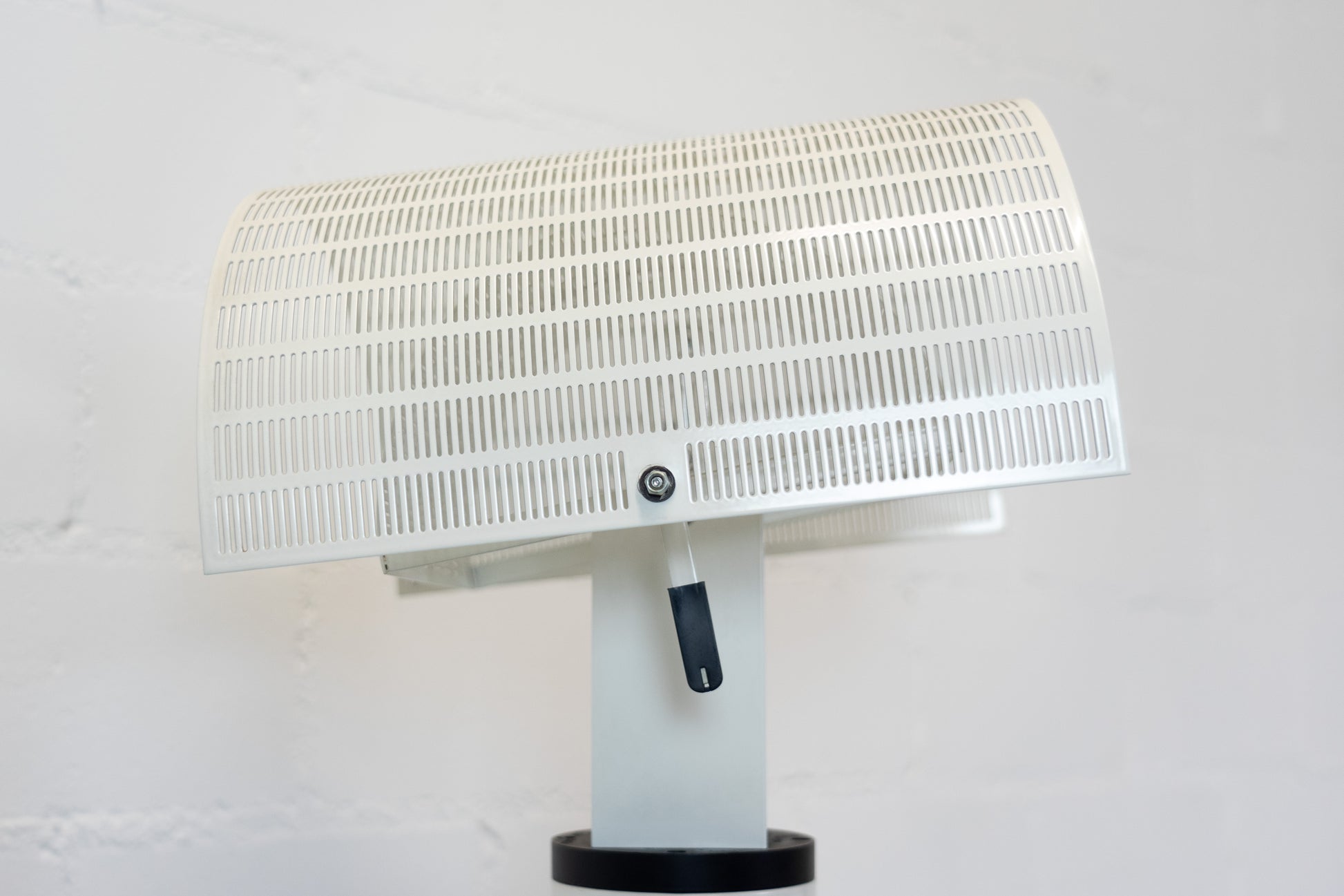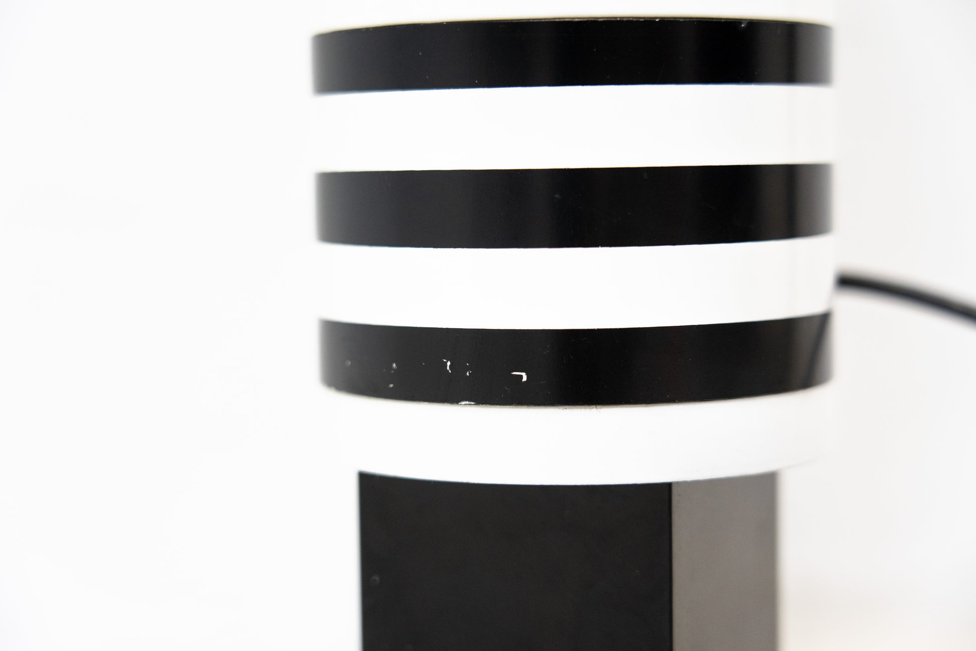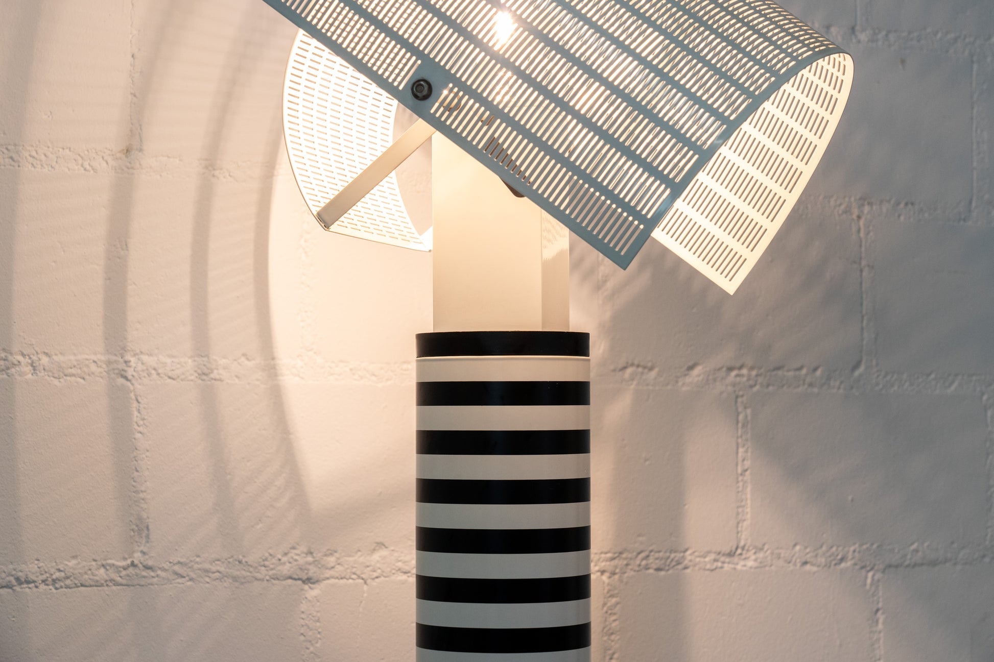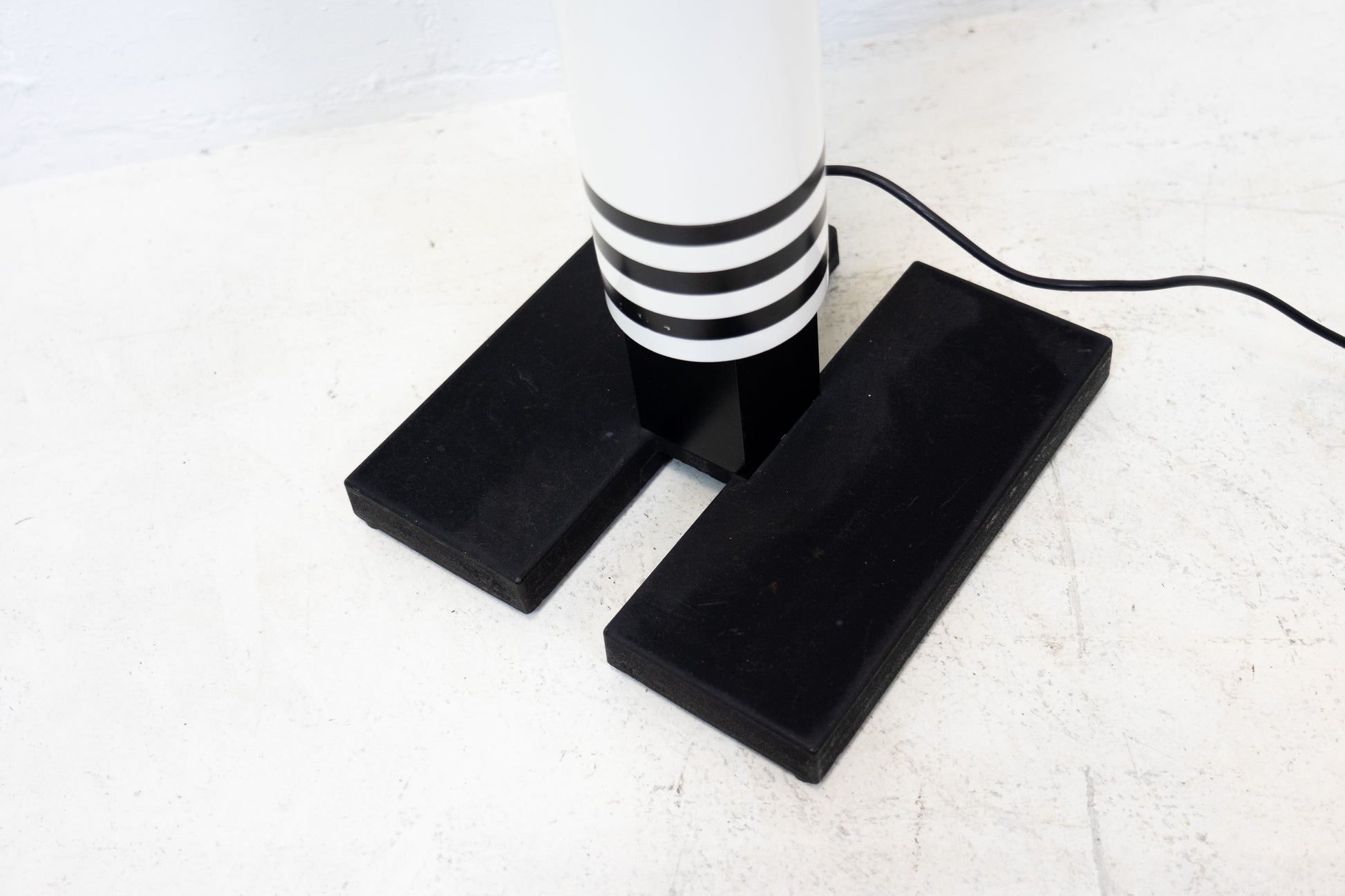 Die Lampe ist dem Alter entsprechend gut erhalten. Es hat leichte Gebrauchsspuren in Form von Kratzern und Abschürfungen. Das Design stammt von Mario Botta. Das passende Leuchtmittel ist inklusive. Der Schalter funktioniert nicht, aber wenn man das Kabel in die Steckdose steckt geht die Leuchte problemlos an. Für einen Elektriker vermutlich eine kleine Sache. Diese Leuchte wird nicht mehr produziert und ist entsprechend selten geworden.