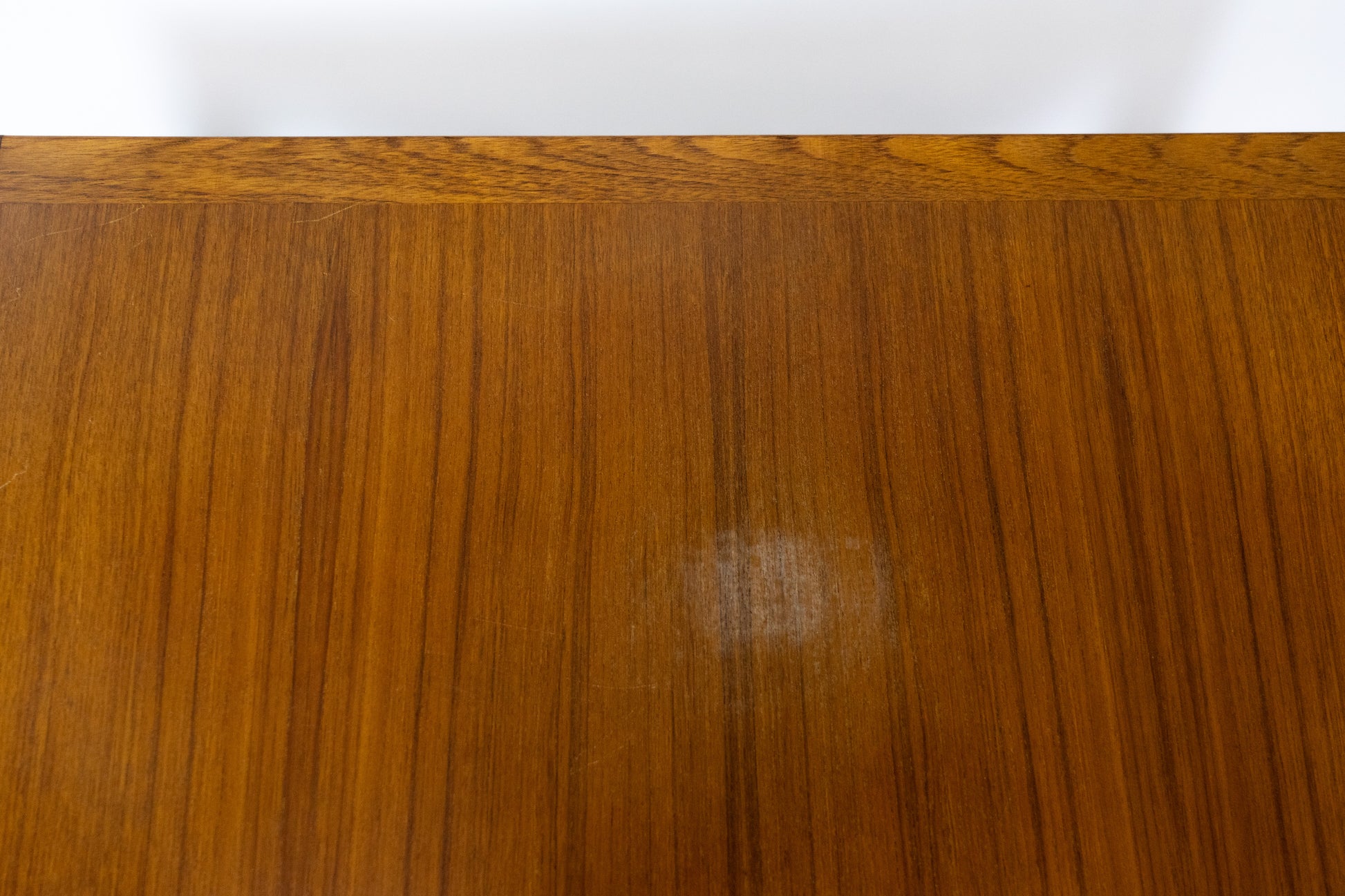 Der Tisch ist gut erhalten mit leichten Gebrauchsspuren in Form von Kratzern, Abschürfungen und Verfärbungen. Es hat mittig eine stärkere Verfärbung sowie einen starken Kratzer im Tischblatt. Wir haben davon ein Detailfoto gemacht. Der Tisch ist hochwertig verarbeitet und sehr stabil. Wir haben vom gleichen Modell noch 2 Tische in anderen Abmessungen.