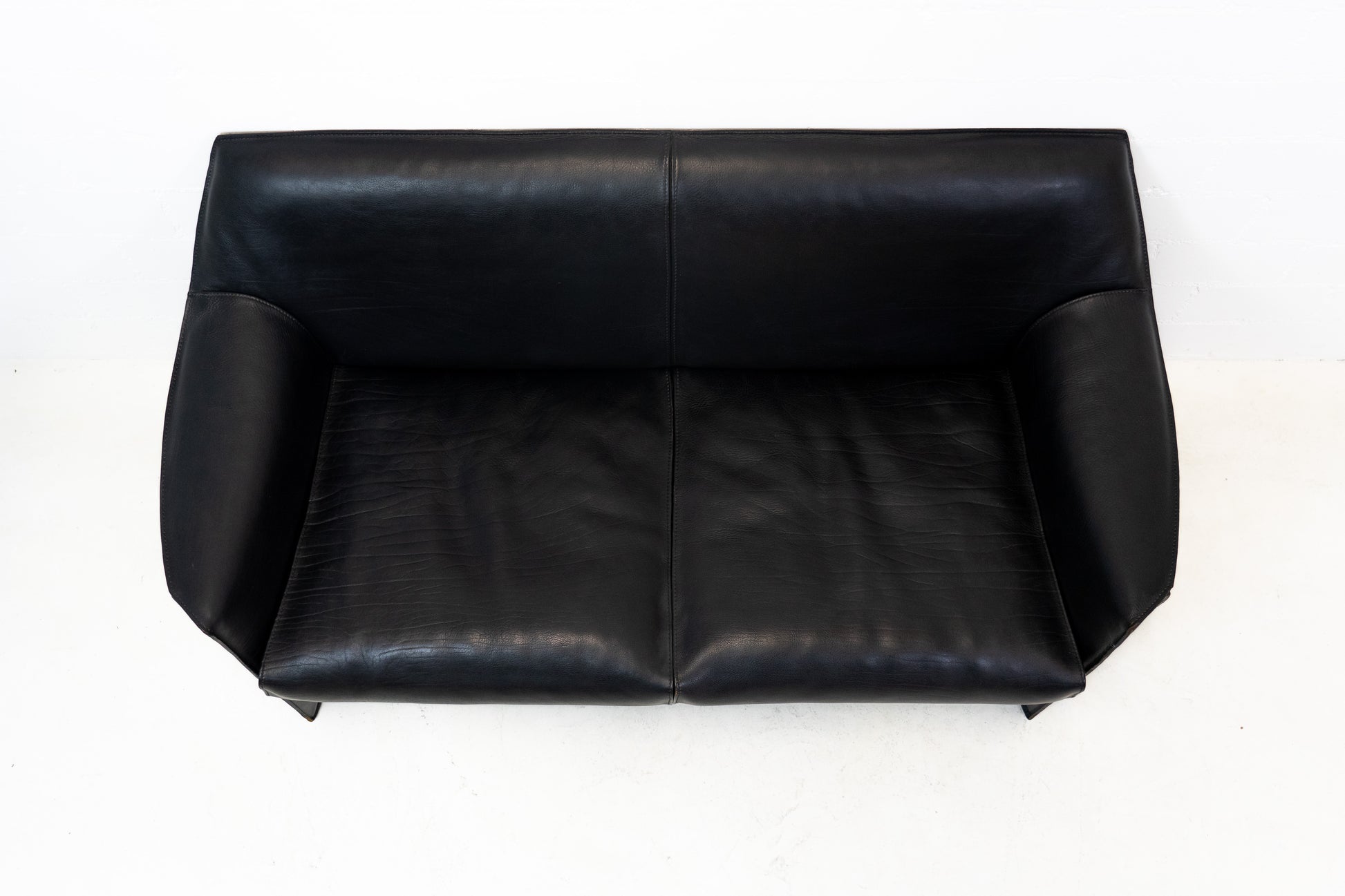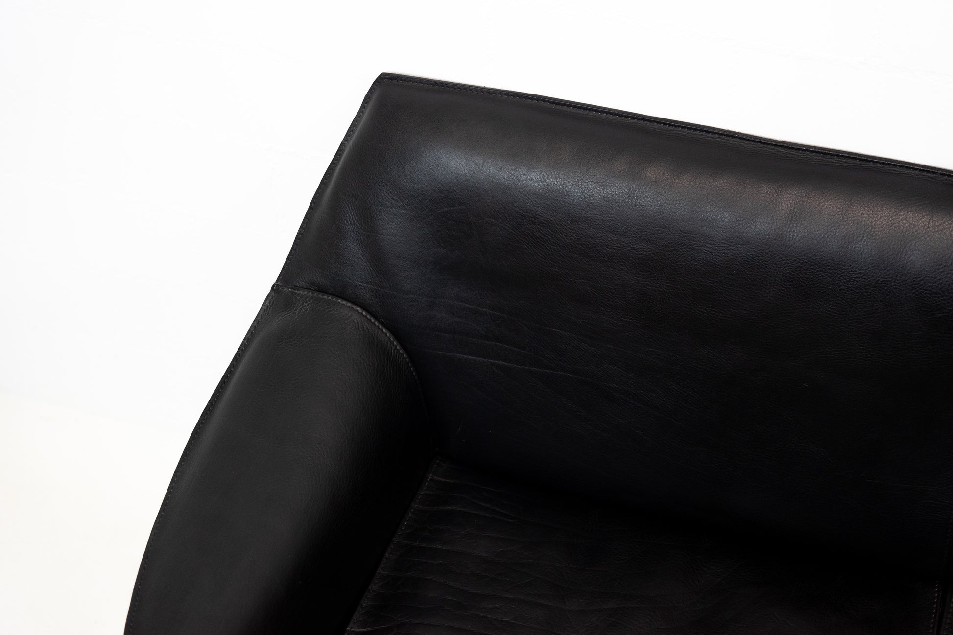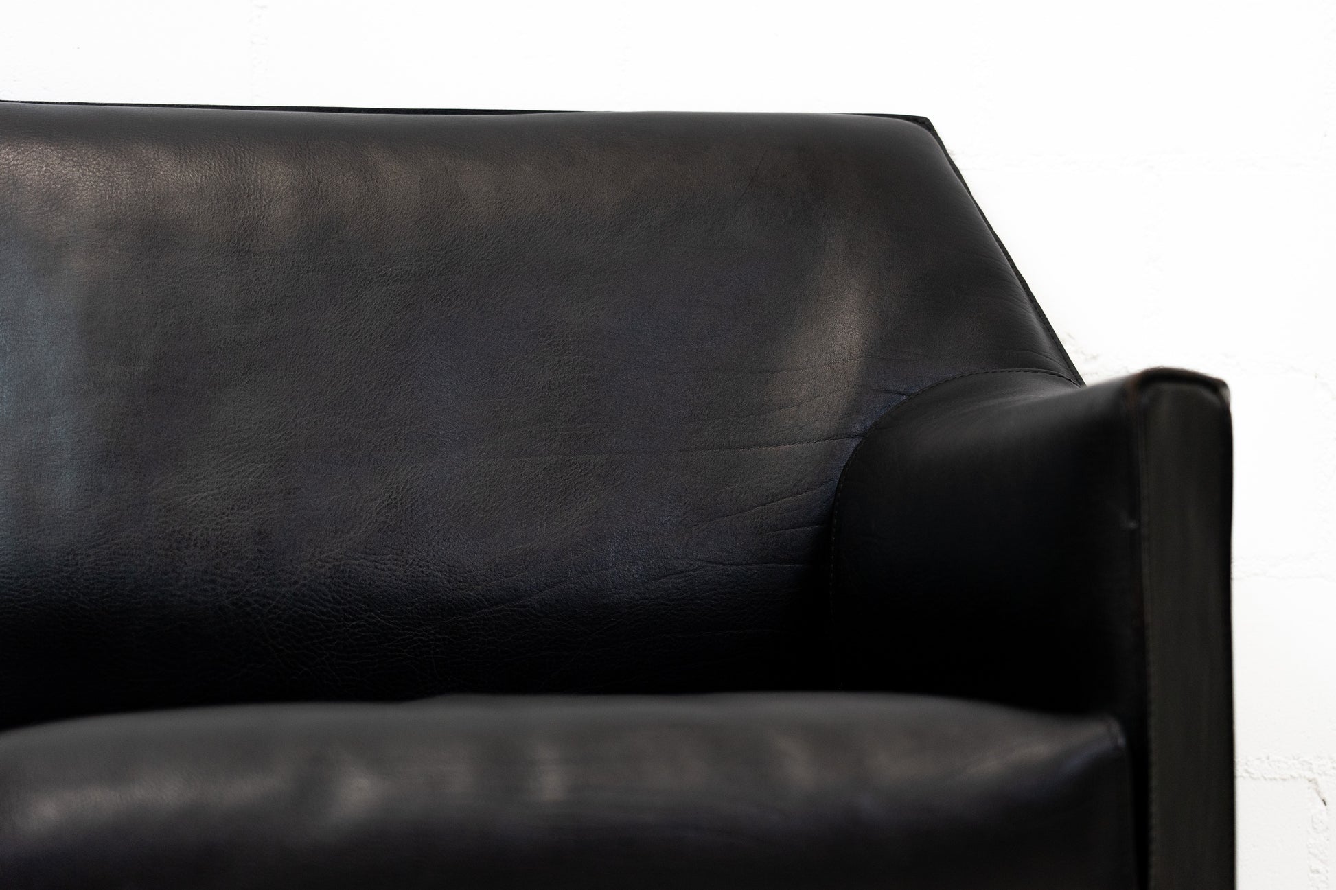 Der Bezug ist Leder in Schwarz. Das Leder ist durch die Stärke nahezu unzerstörbar. Es ist schön erhalten und hat leichte Gebrauchsspuren in Form von Kratzern und Abschürfungen. Der Sitzkomfort ist nach wie vor super. Das Modell wurde von Mario Bellini entworfen.