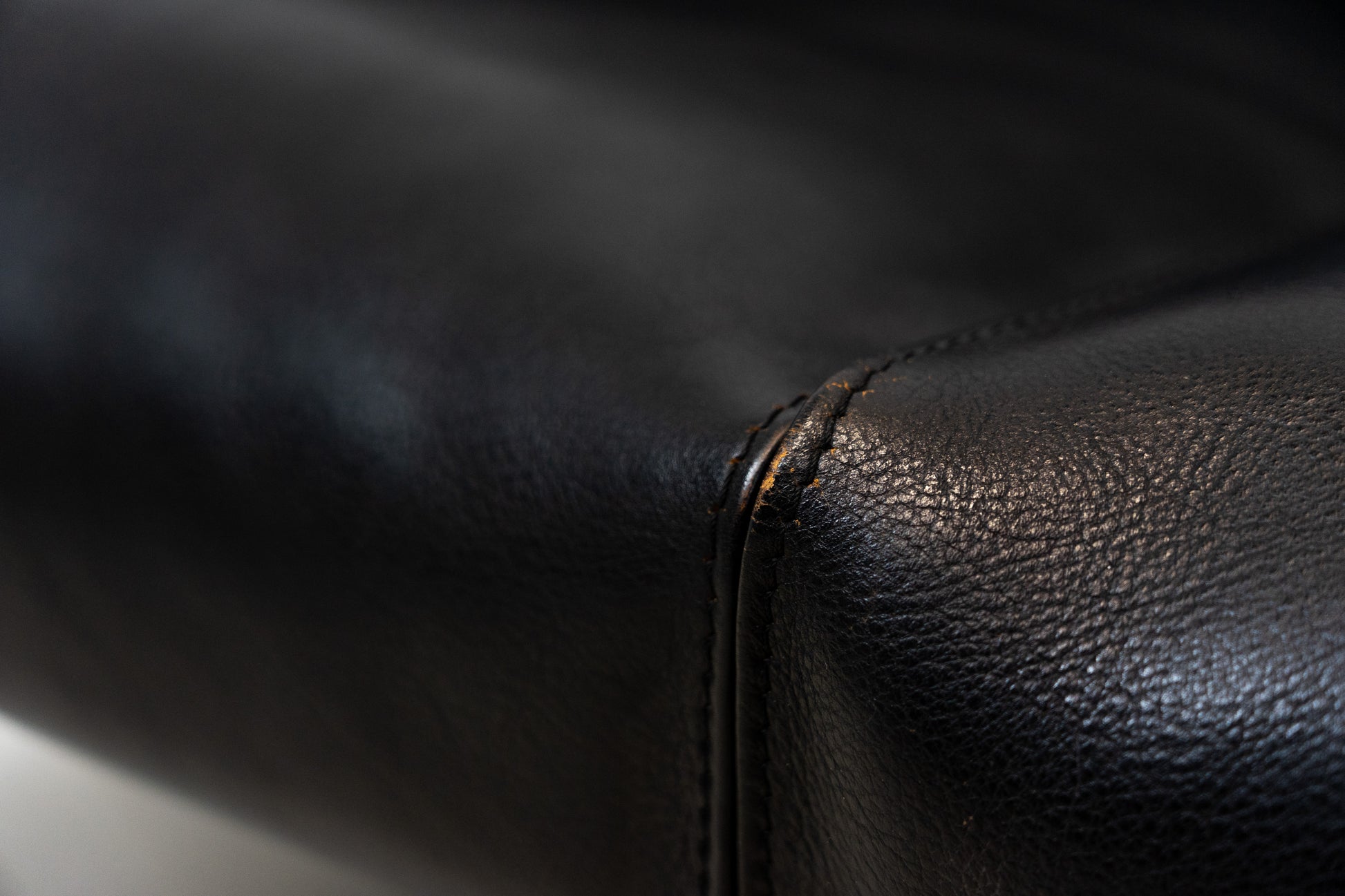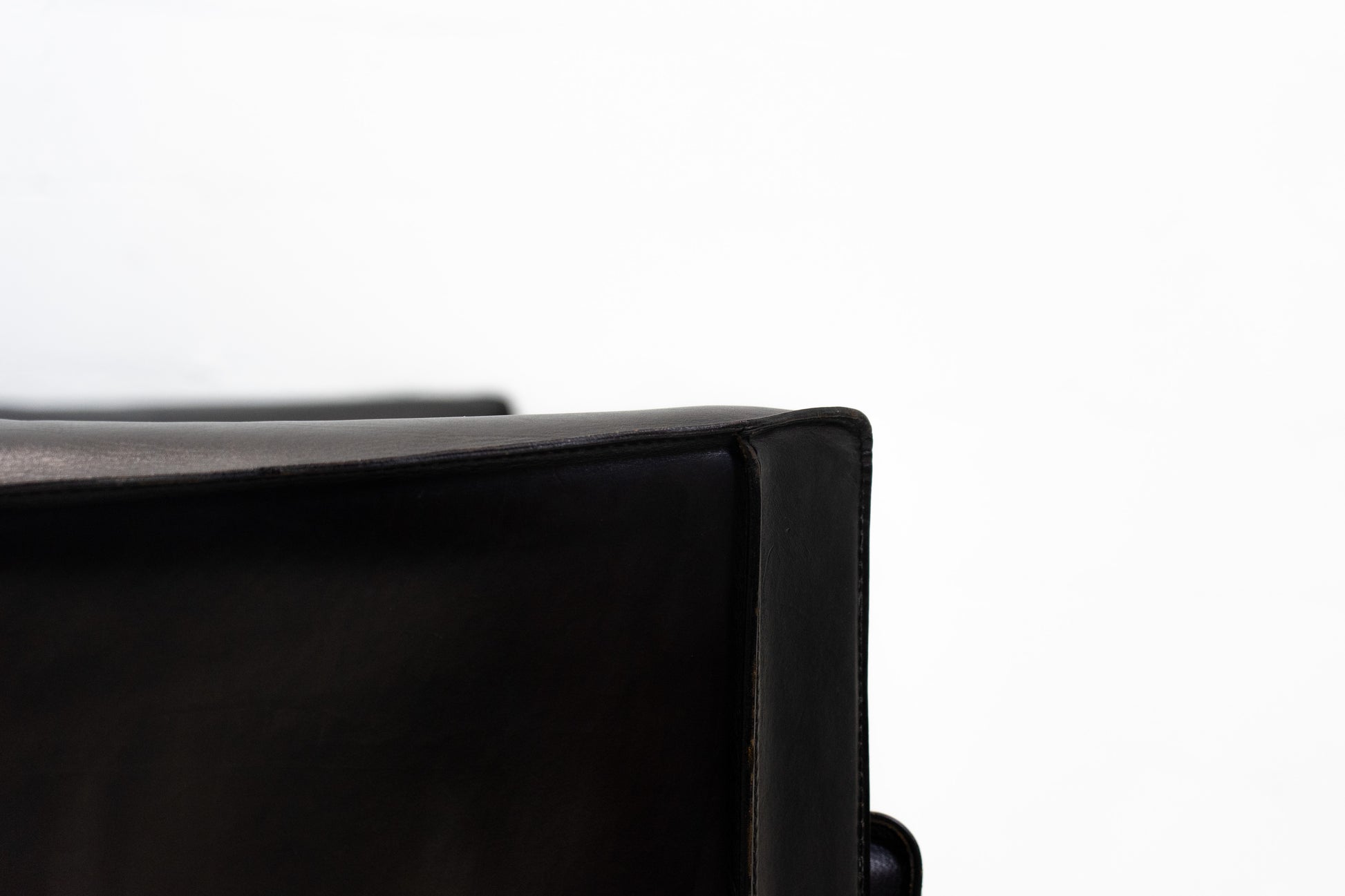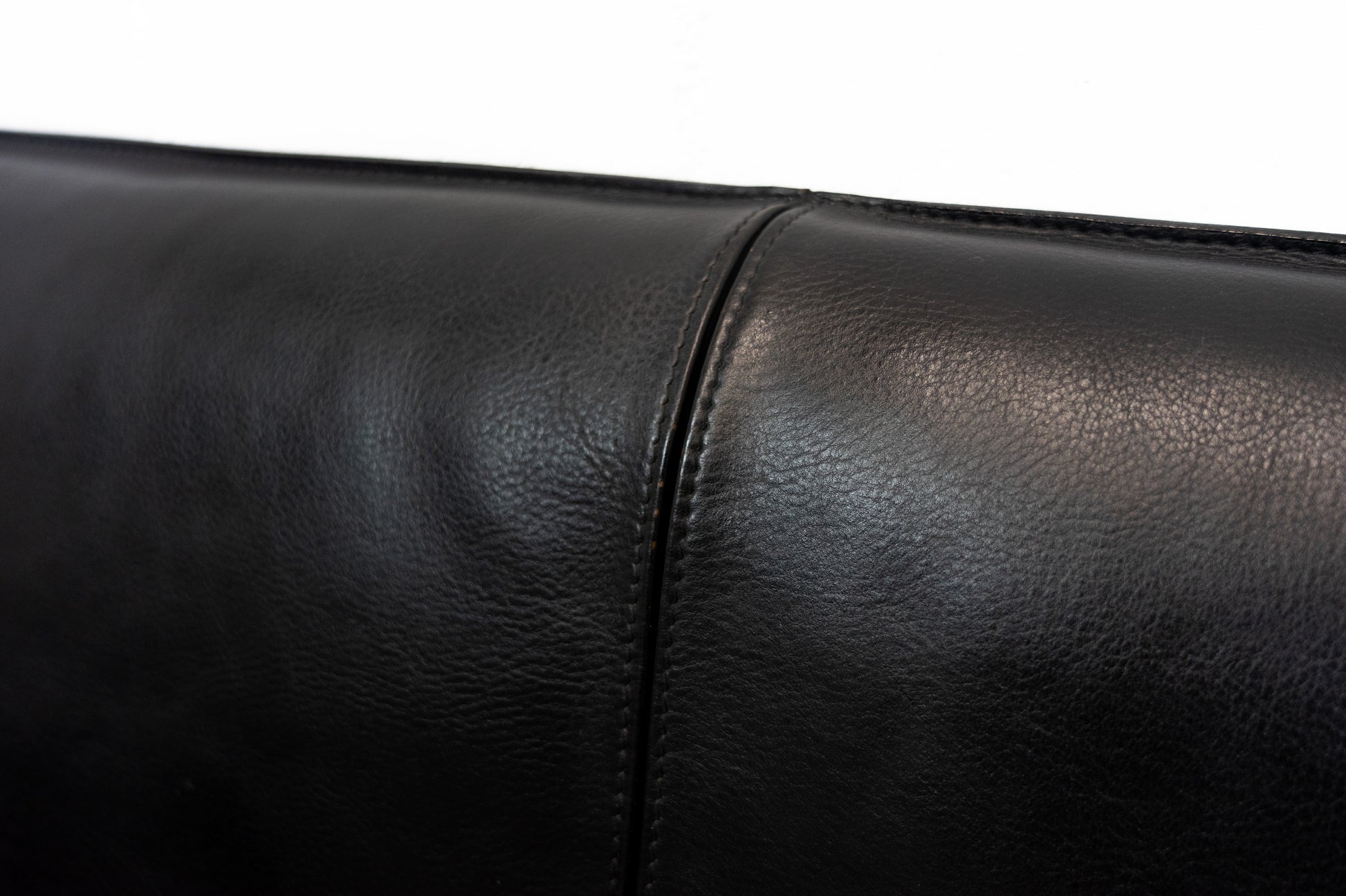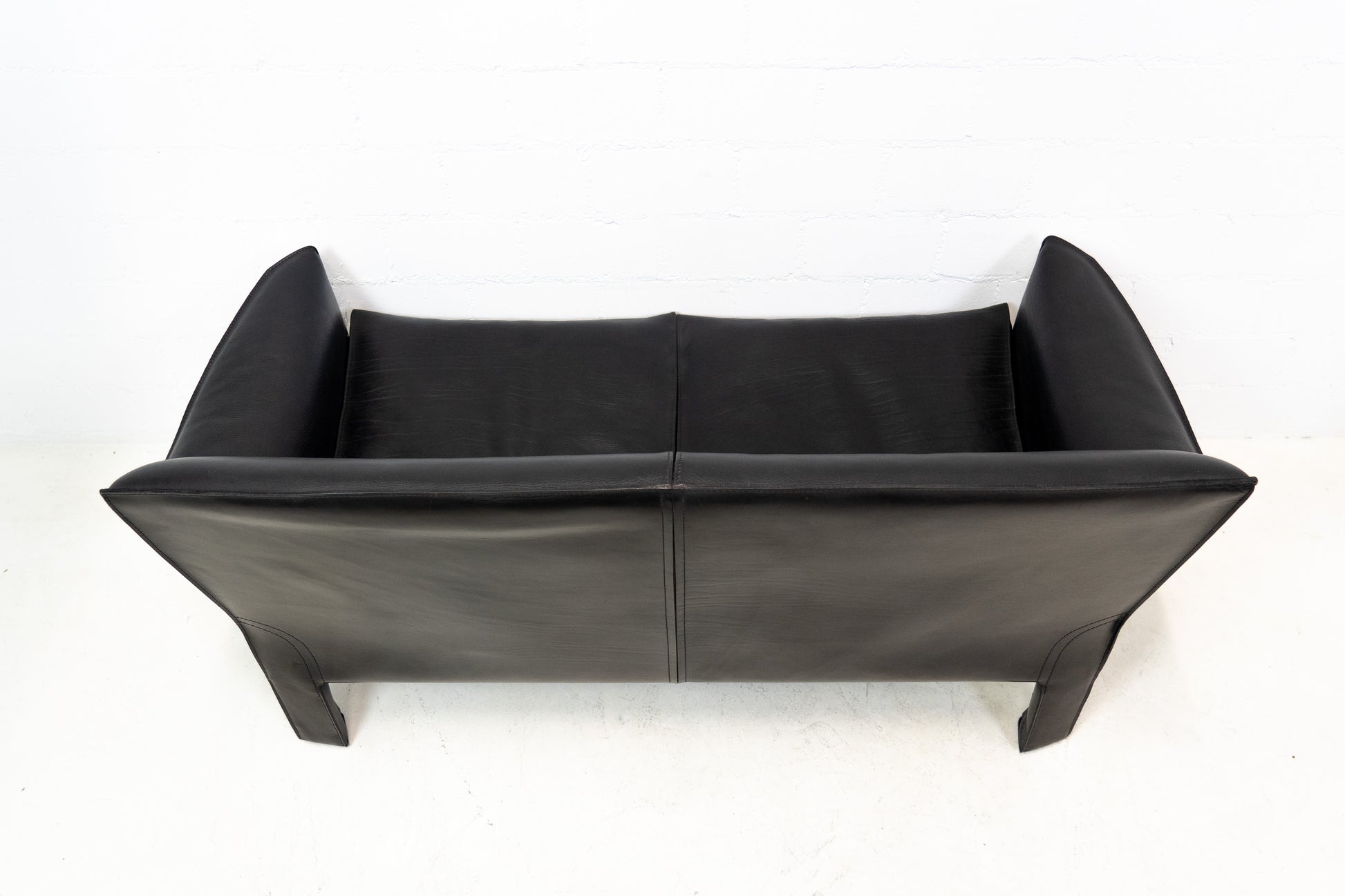 Der Bezug ist Leder in Schwarz. Das Leder ist durch die Stärke nahezu unzerstörbar. Es ist schön erhalten und hat leichte Gebrauchsspuren in Form von Kratzern und Abschürfungen. Der Sitzkomfort ist nach wie vor super. Das Modell wurde von Mario Bellini entworfen.