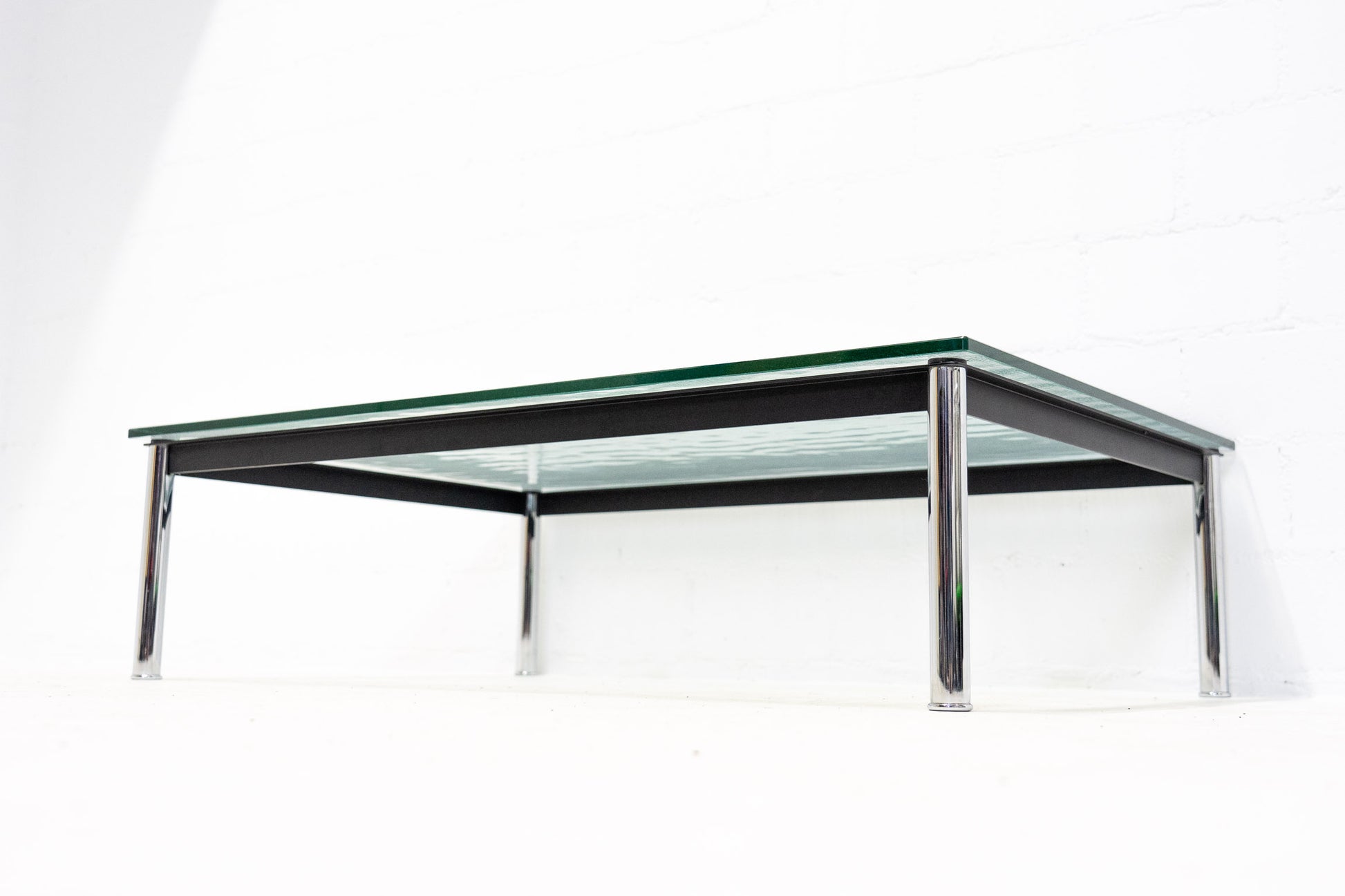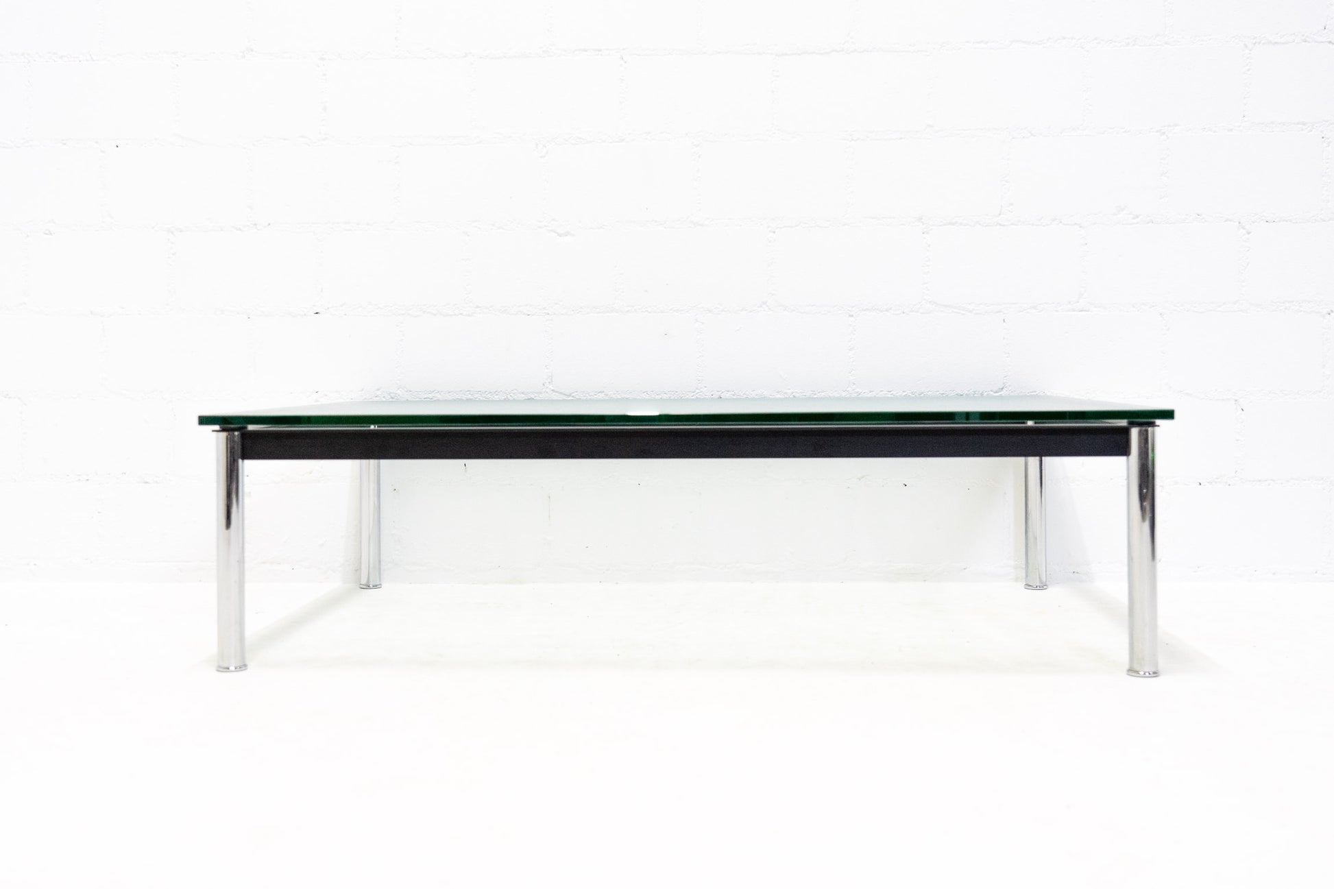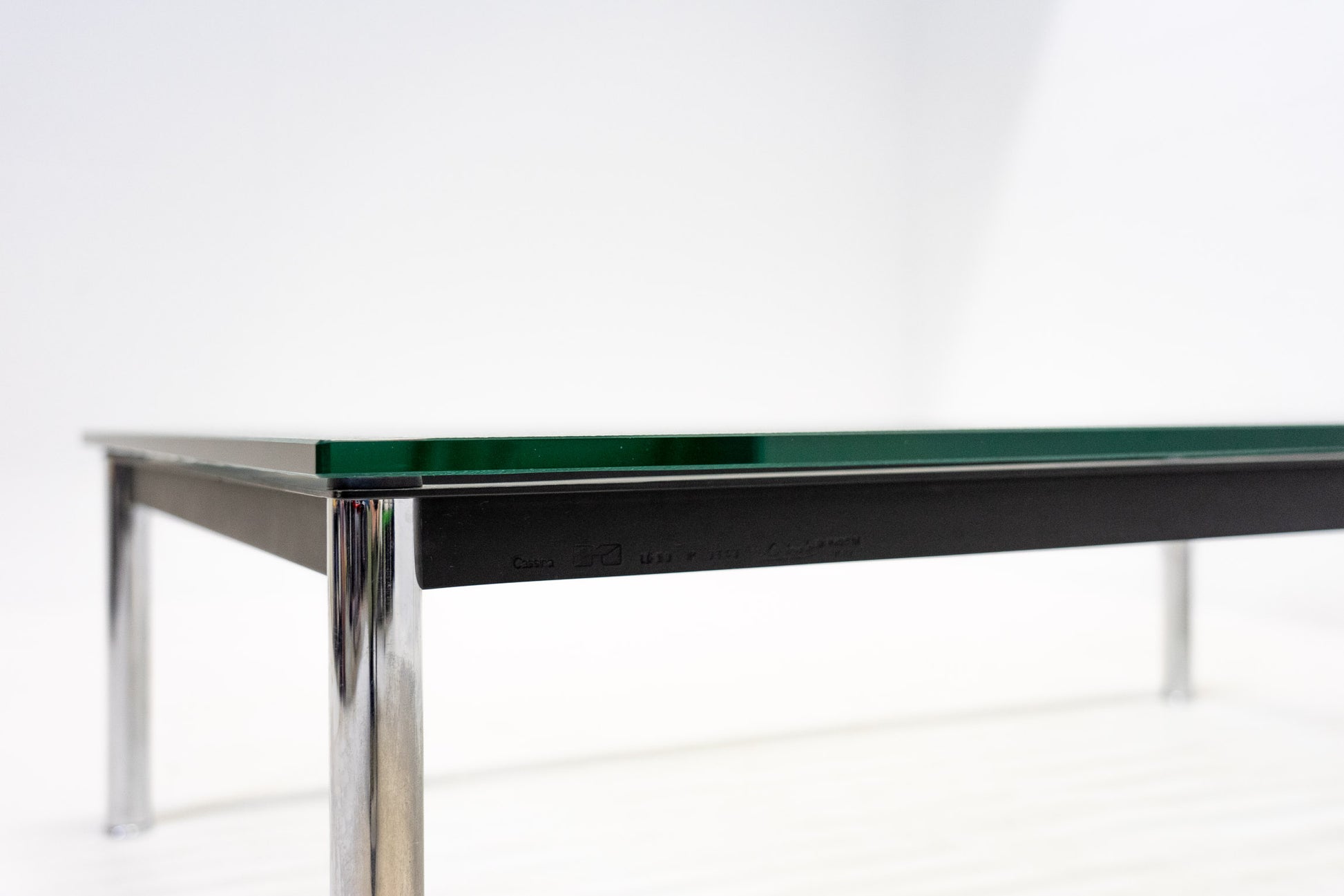 Der LC10 Glastisch ist schön erhalten und hat leichte Gebrauchsspuren in Form von Kratzern und etwas patinierten Füssen innen. Wir haben davon ein Detailfoto gemacht. Die Platte ist schön erhalten. Dieser Designklassiker wurde von Le Corbusier, Charlotte Perriand und Pierre Jeanneret entworfen. Der derzeitige Listenpreis von diesem Couchtisch liegt bei ca. 2970 CHF.