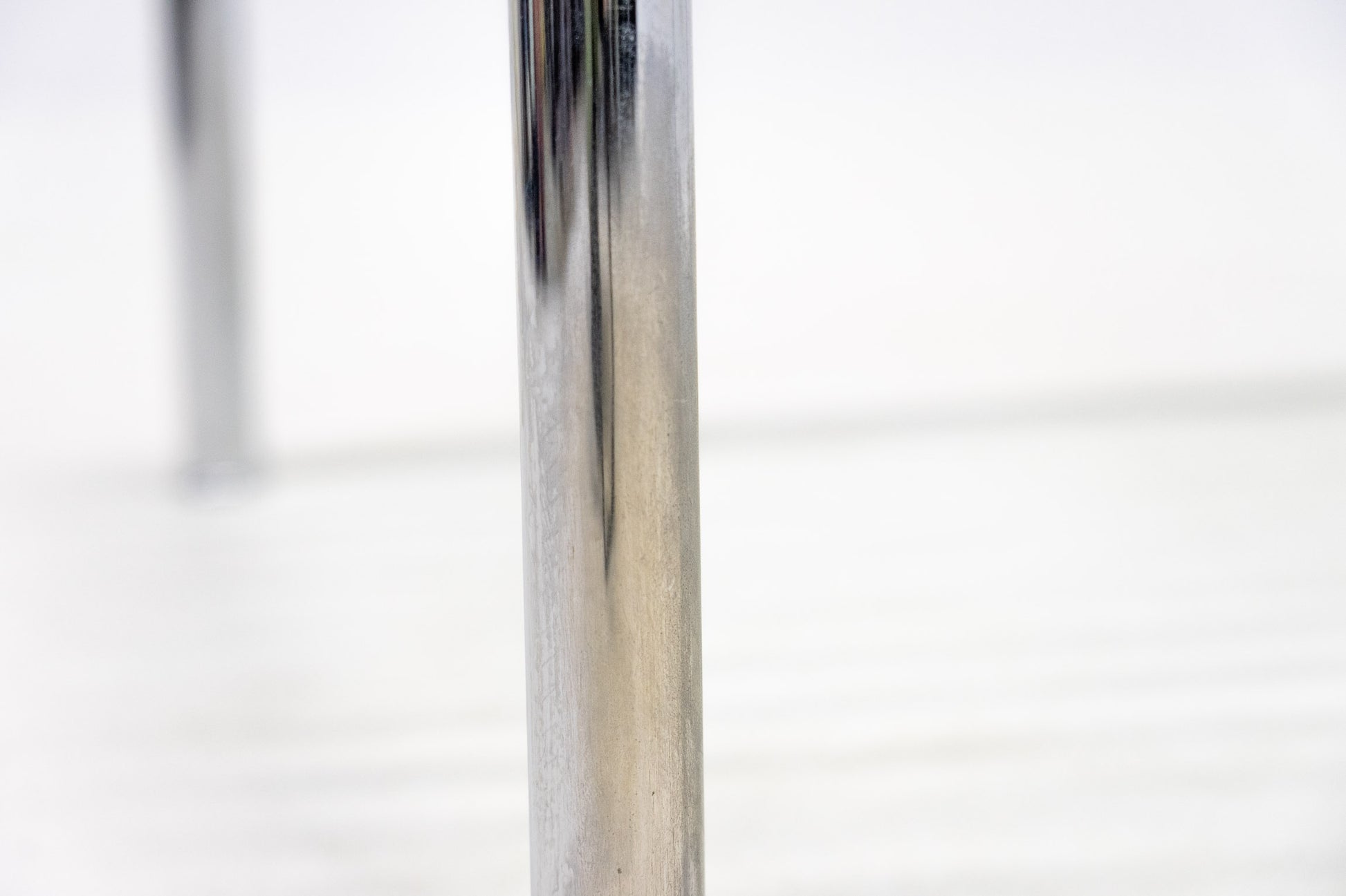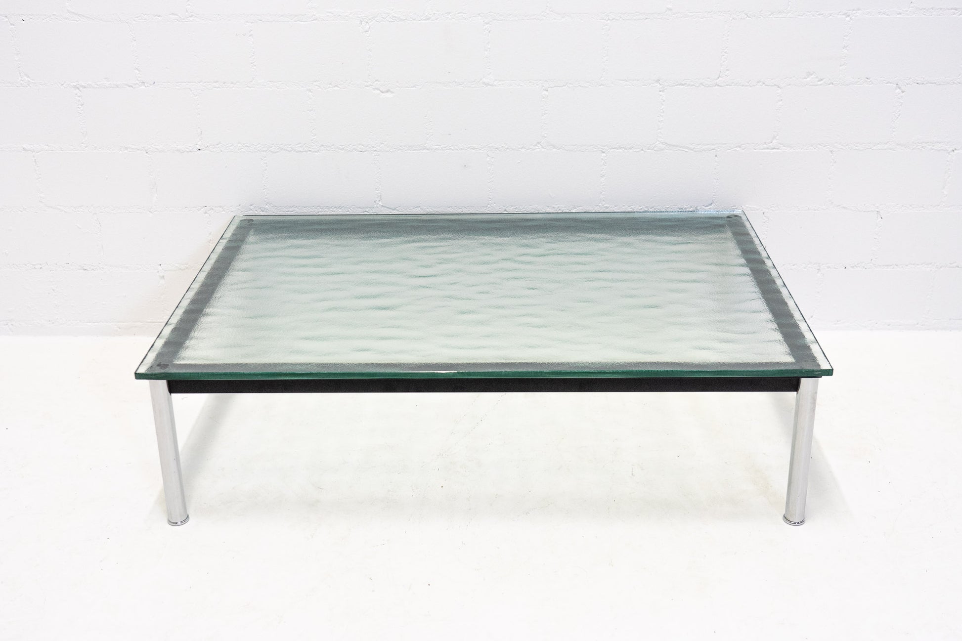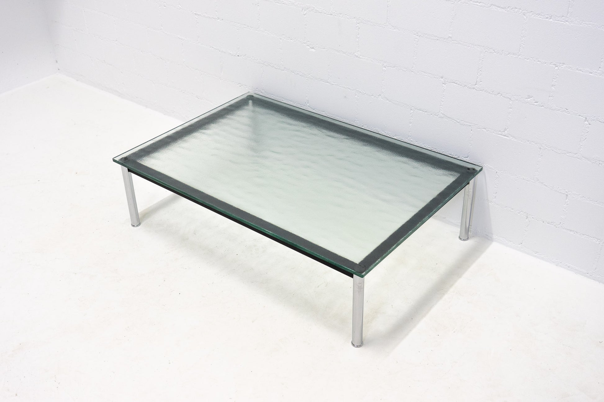 Der LC10 Glastisch ist schön erhalten und hat leichte Gebrauchsspuren in Form von Kratzern und etwas patinierten Füssen innen. Wir haben davon ein Detailfoto gemacht. Die Platte ist schön erhalten. Dieser Designklassiker wurde von Le Corbusier, Charlotte Perriand und Pierre Jeanneret entworfen. Der derzeitige Listenpreis von diesem Couchtisch liegt bei ca. 2970 CHF.