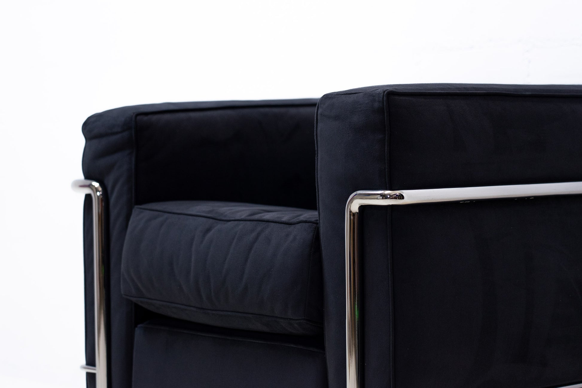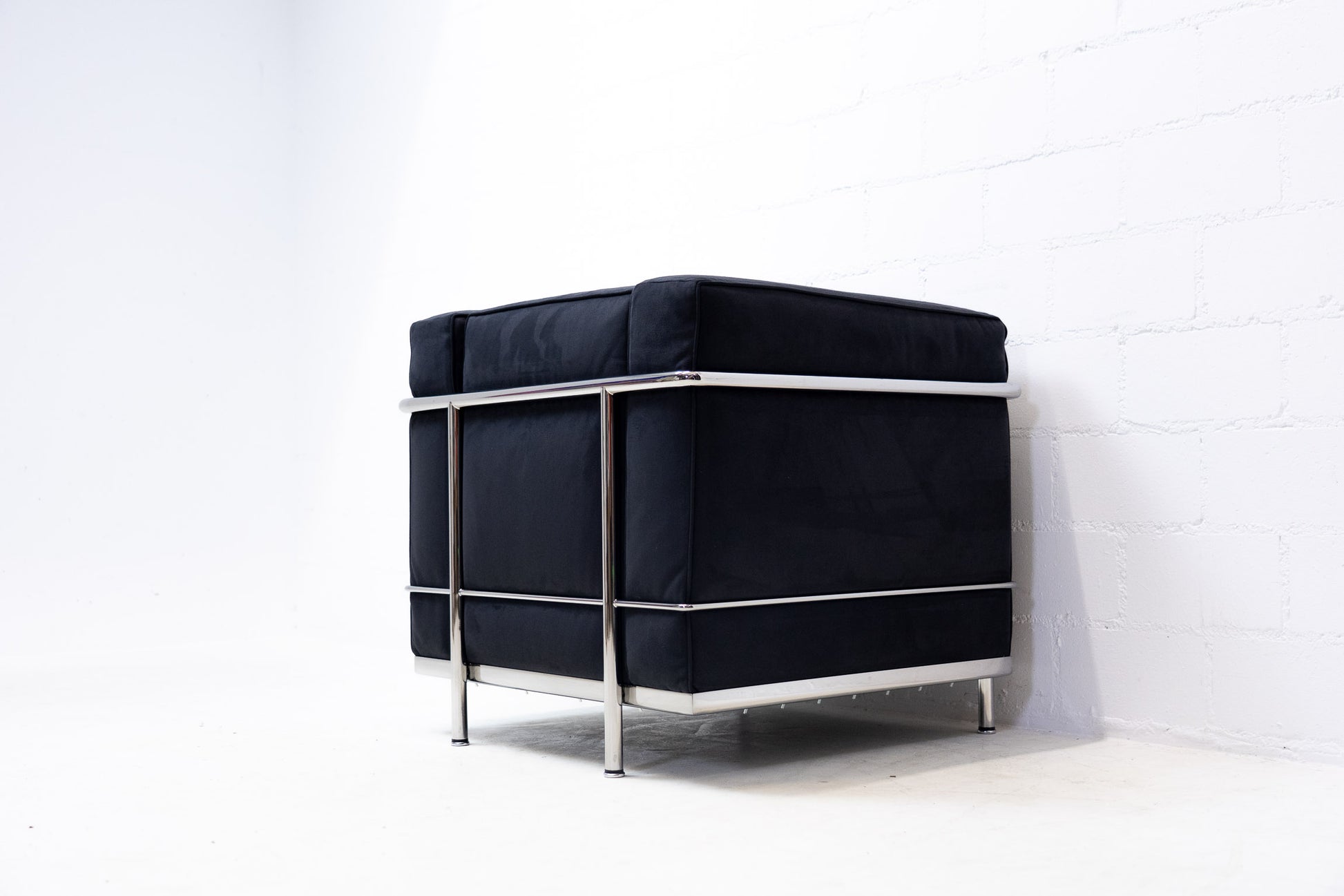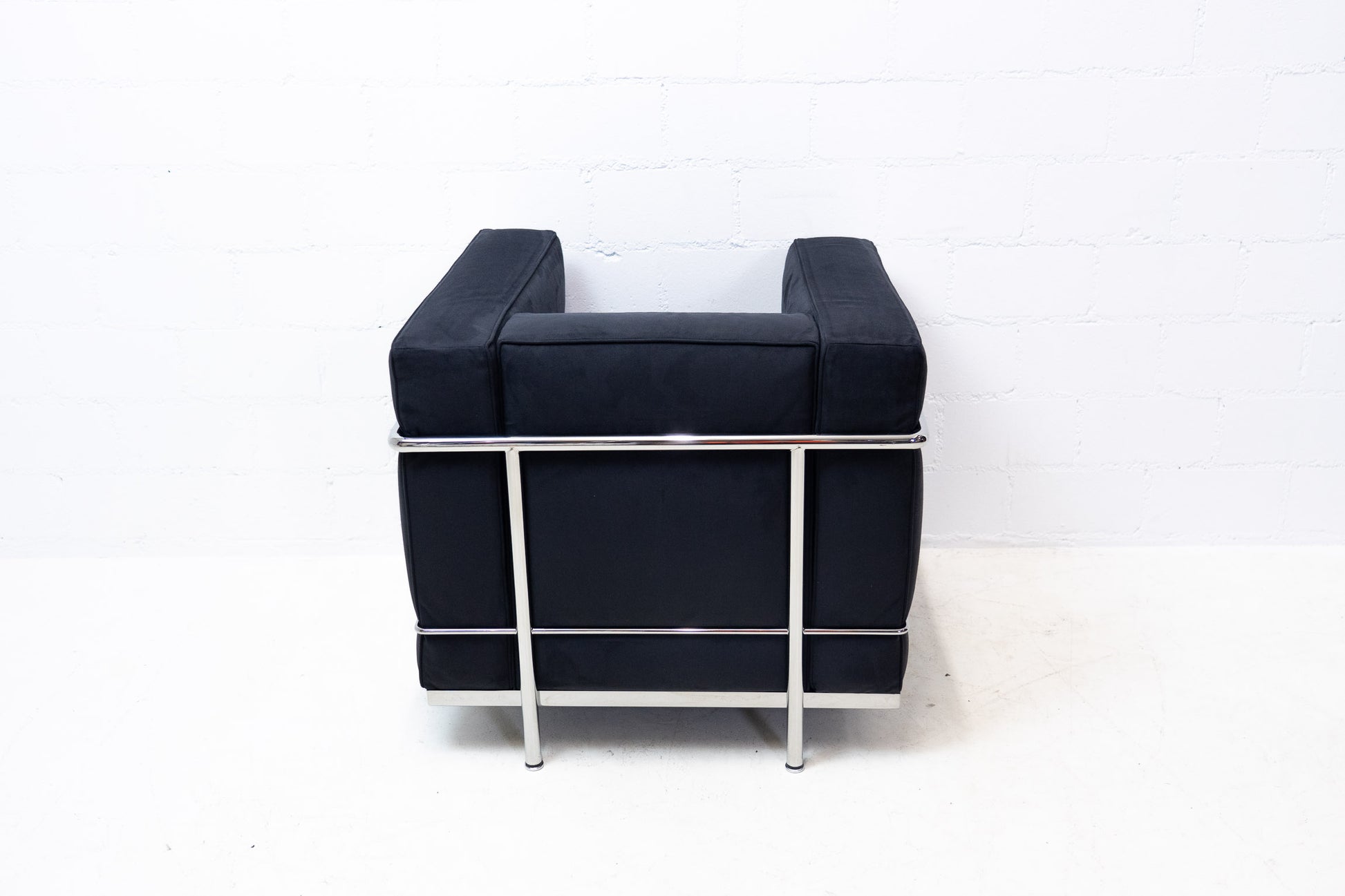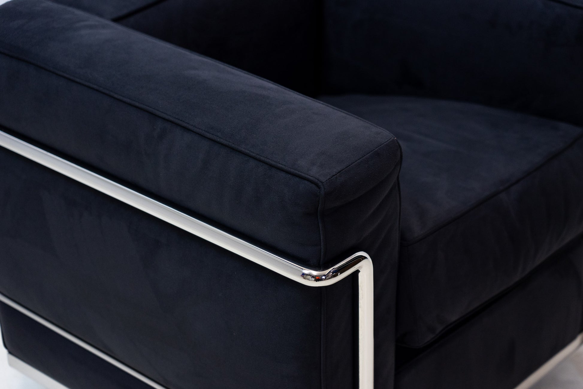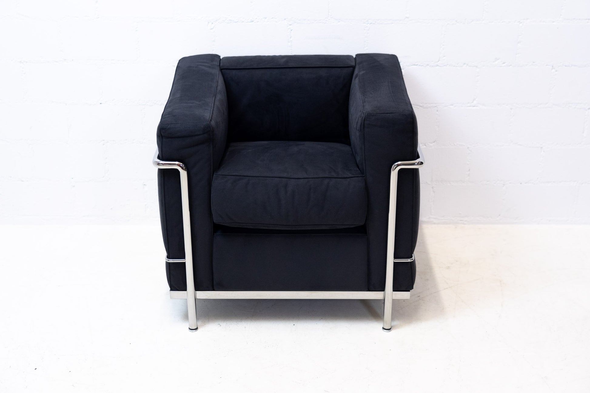 Der Bezug ist Textil in Schwarz. Es ist ein Wildlederstoff, ähnlich wie Alcantara. Der Bezug ist sehr gut erhalten. Es hat leichte Gebrauchsspuren in Form von Kratzern und Abschürfungen. Der Sitzkomfort ist nach wie vor super. Das Design stammt von Le Corbusier, Charlotte Perriand und Pierre Jeanneret. Wir haben insgesamt 6 Sessel in jeweils ähnlichem Zustand ab Lager verfügbar. Der Preis bezieht sich auf einen Sessel.