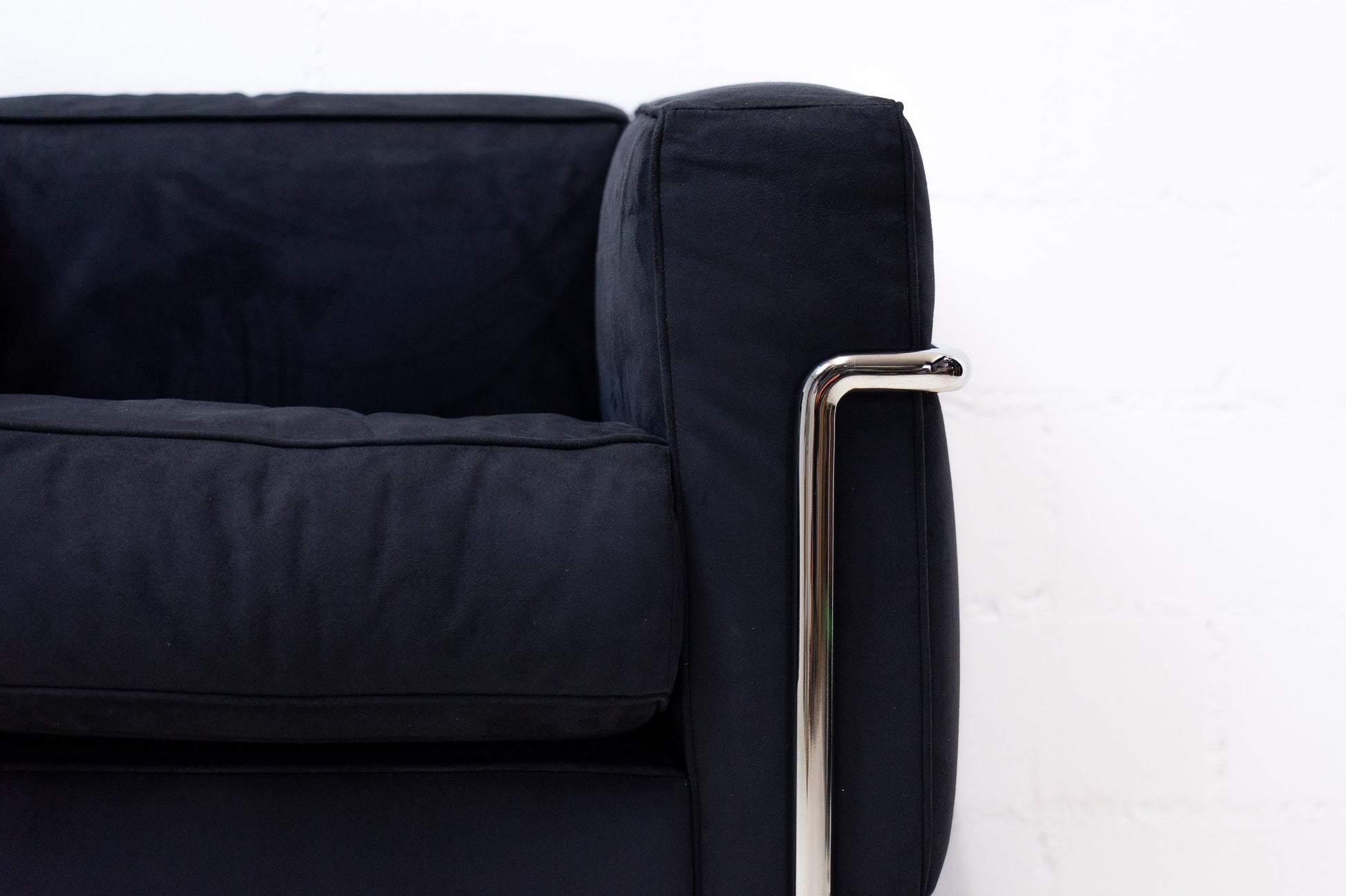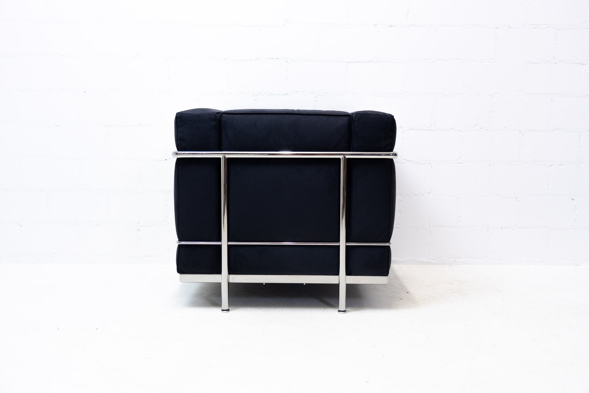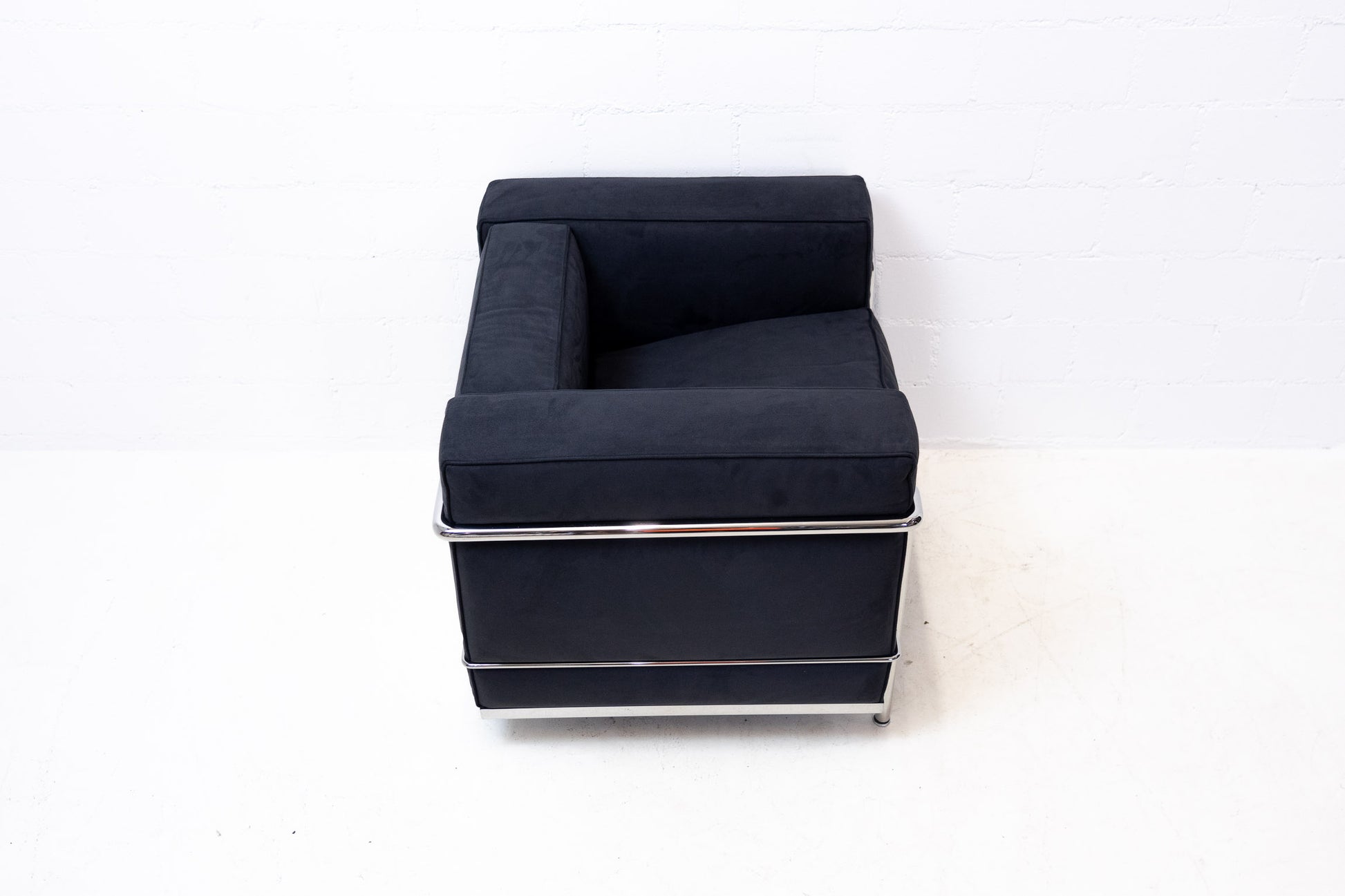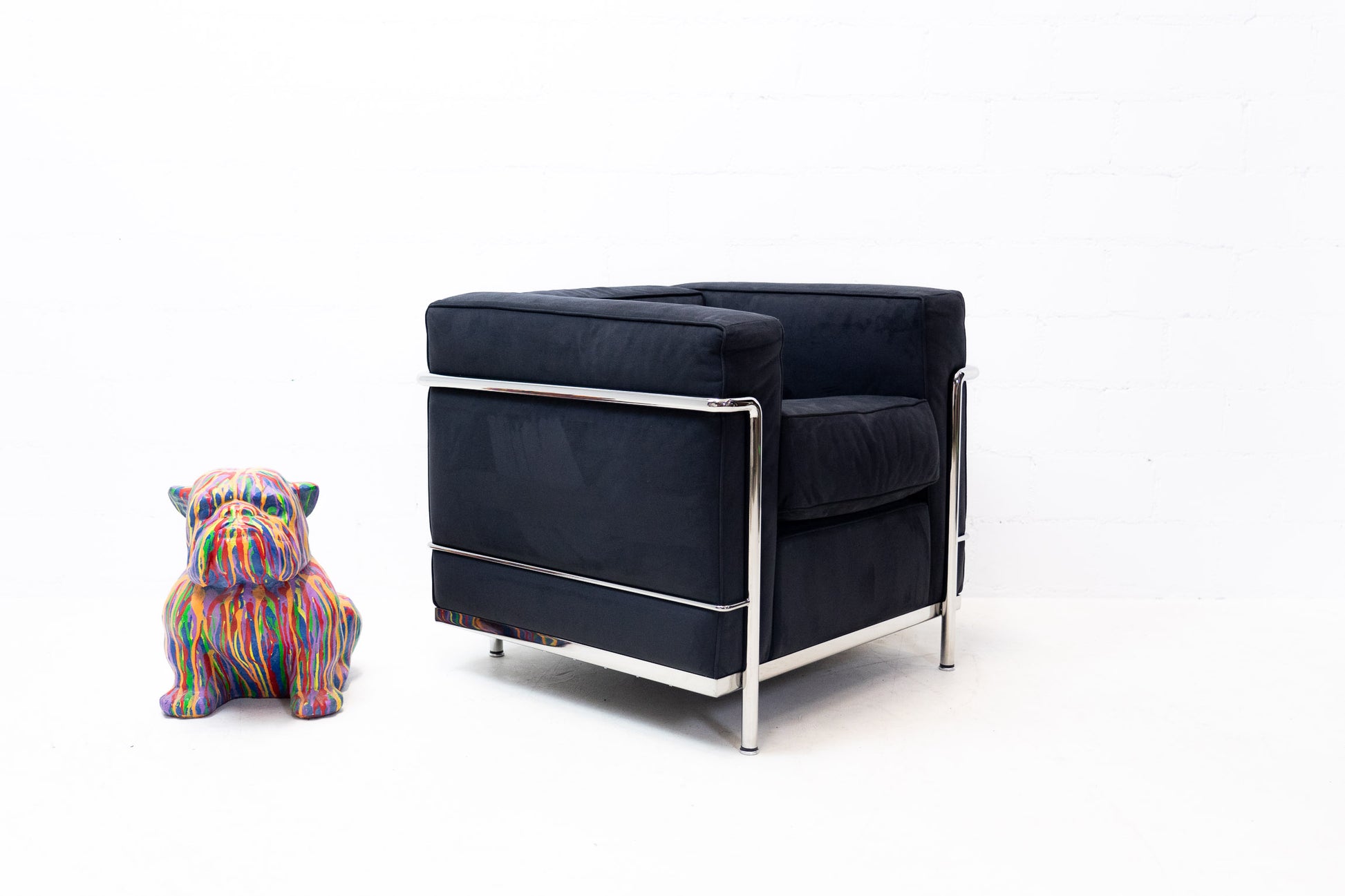 Der Bezug ist Textil in Schwarz. Es ist ein Wildlederstoff, ähnlich wie Alcantara. Der Bezug ist sehr gut erhalten. Es hat leichte Gebrauchsspuren in Form von Kratzern und Abschürfungen. Der Sitzkomfort ist nach wie vor super. Das Design stammt von Le Corbusier, Charlotte Perriand und Pierre Jeanneret. Wir haben insgesamt 6 Sessel in jeweils ähnlichem Zustand ab Lager verfügbar. Der Preis bezieht sich auf einen Sessel.