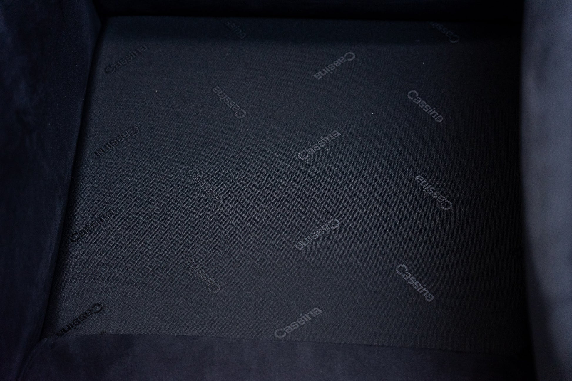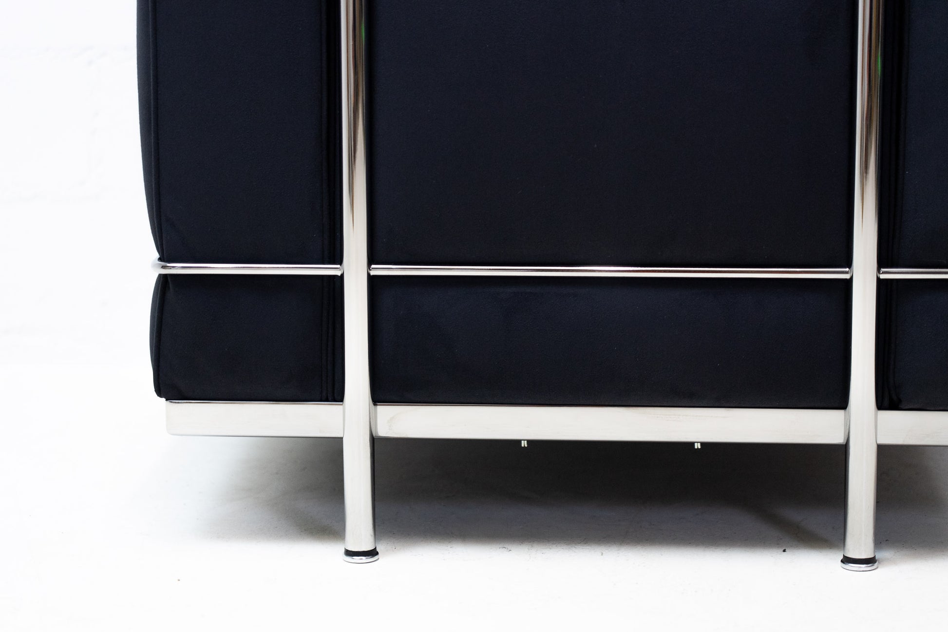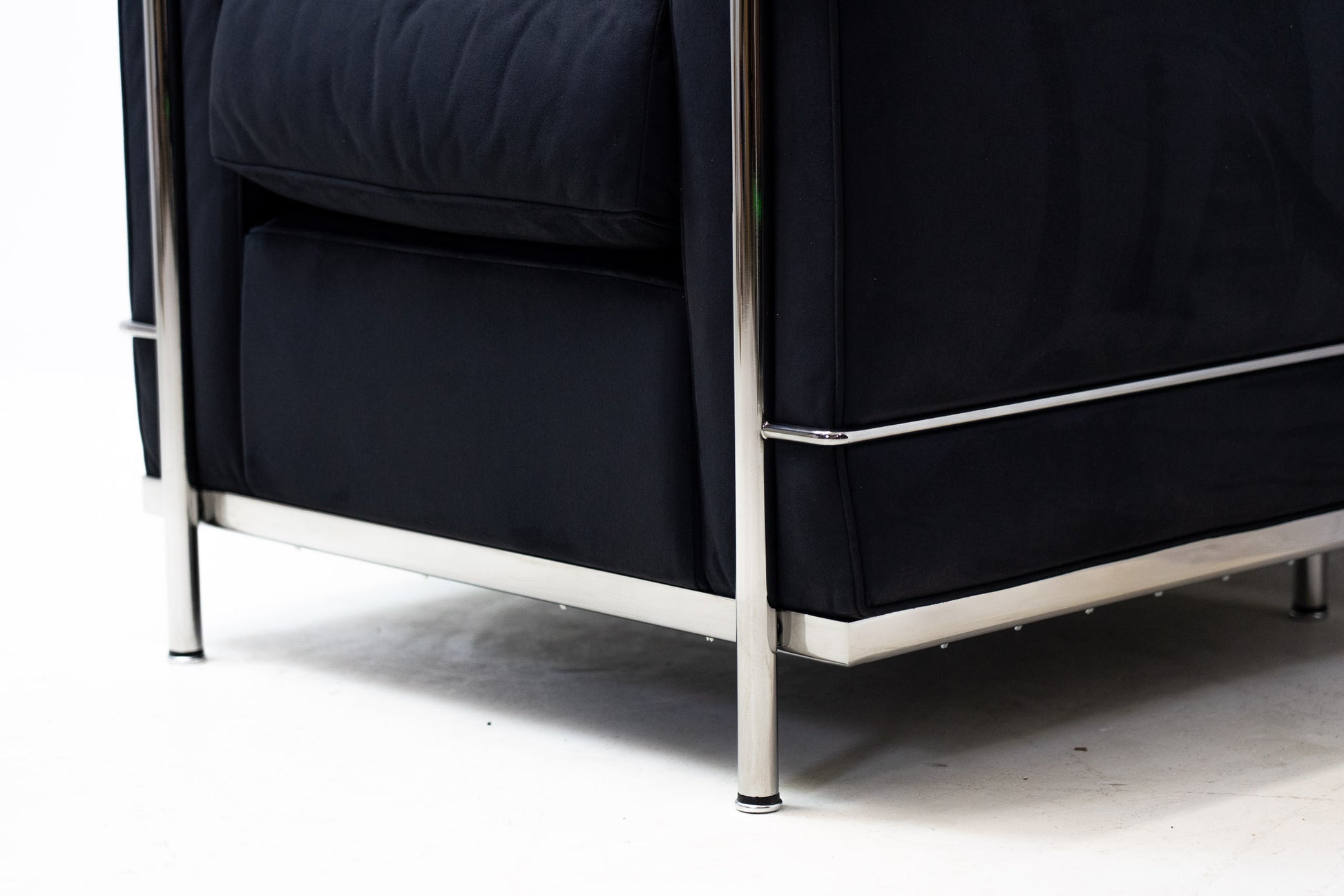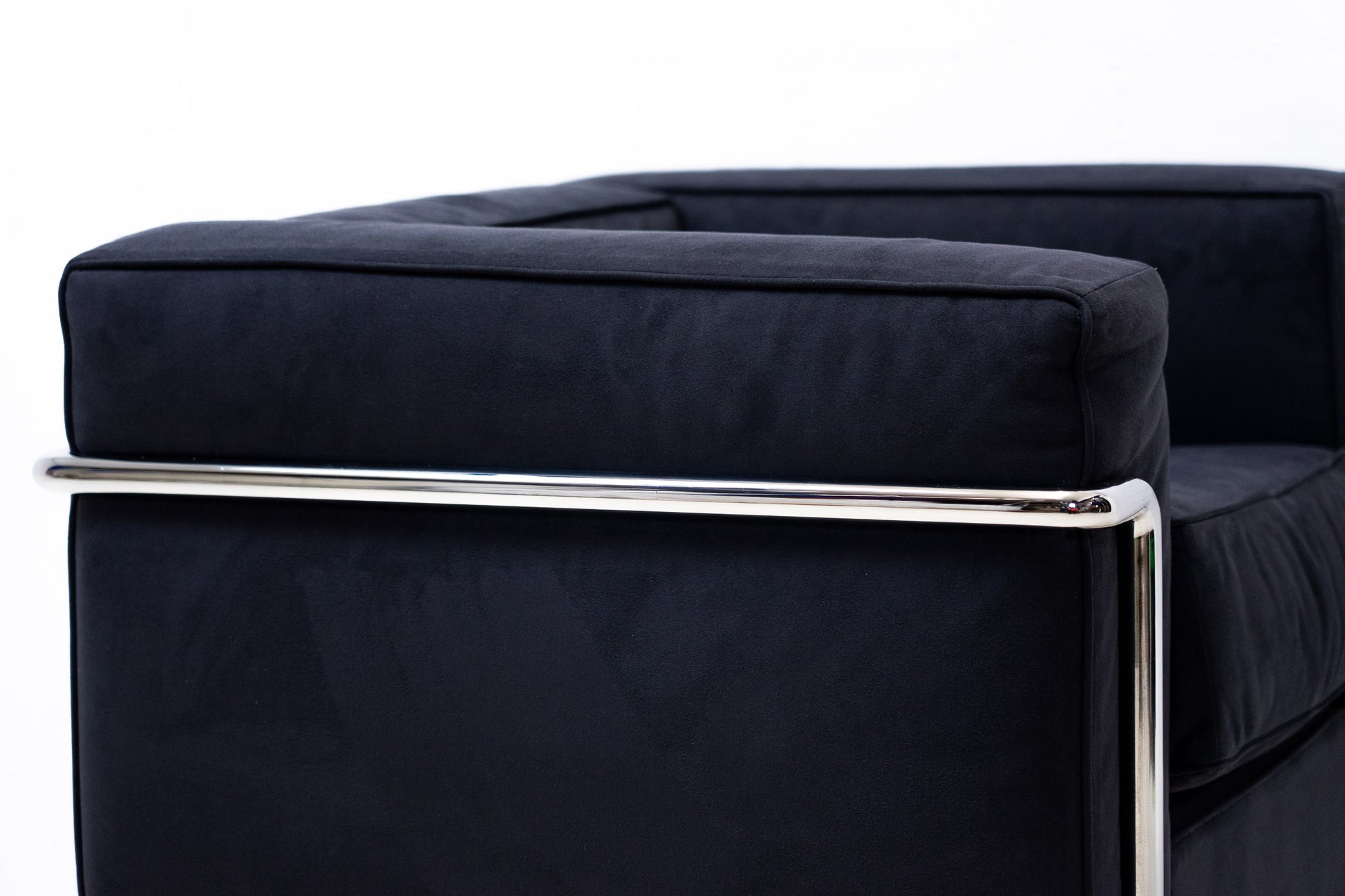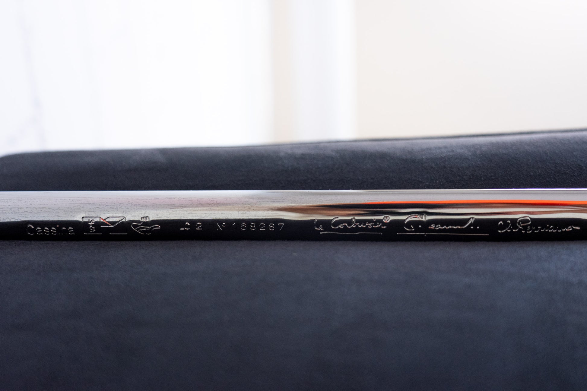 Der Bezug ist Textil in Schwarz. Es ist ein Wildlederstoff, ähnlich wie Alcantara. Der Bezug ist sehr gut erhalten. Es hat leichte Gebrauchsspuren in Form von Kratzern und Abschürfungen. Der Sitzkomfort ist nach wie vor super. Das Design stammt von Le Corbusier, Charlotte Perriand und Pierre Jeanneret. Wir haben insgesamt 6 Sessel in jeweils ähnlichem Zustand ab Lager verfügbar. Der Preis bezieht sich auf einen Sessel.