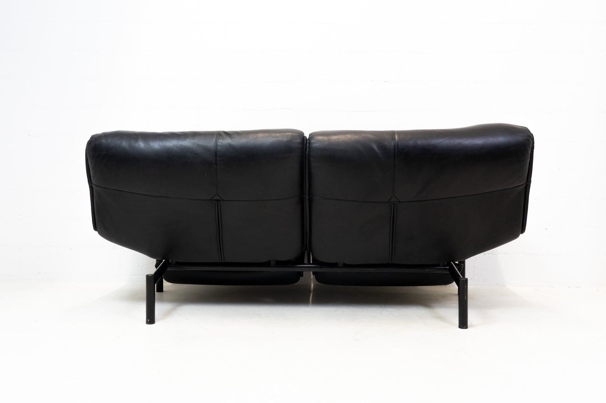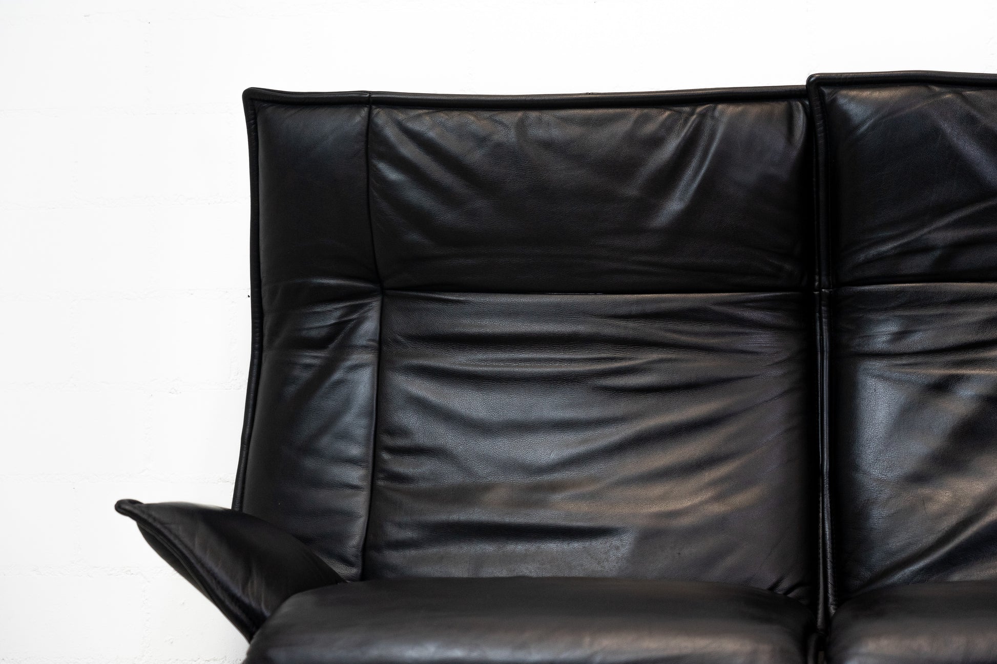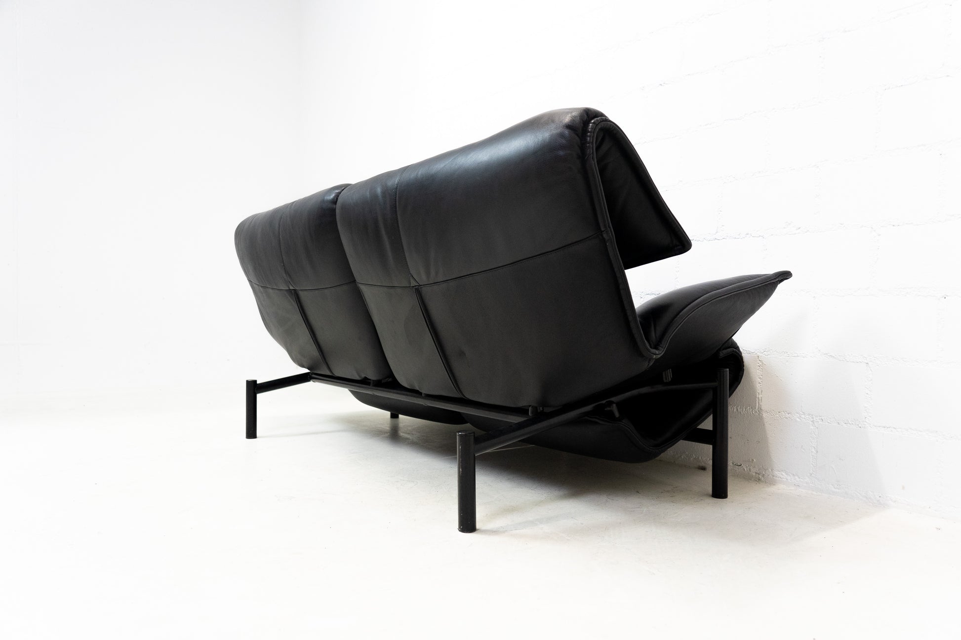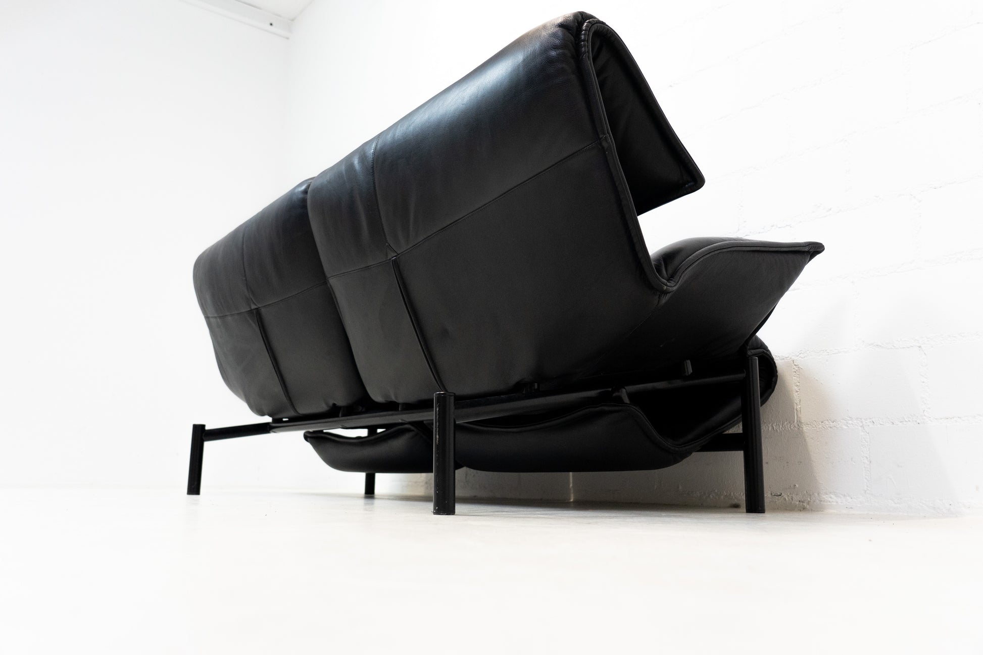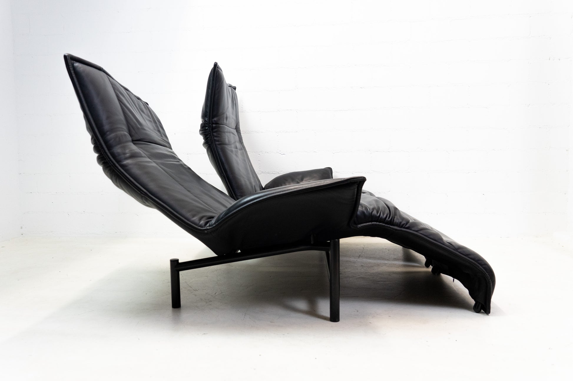 Der Bezug ist Leder in Schwarz. Das Sofa ist dem Alter entsprechend gut erhalten. Es hat Gebrauchsspuren in Form von Kratzern und Abschürfungen. Wir haben davon Detailfotos gemacht. Man kann die Rückenlehnen einzeln hochklappen und kann so den Kopf auch abstützen an der Lehne. Ein super Konzept, je nach dem wie man gerade sitzen möchte. Die linke geht etwas schwerer als die rechte. Beide funktioniert aber. Zudem lassen sich die Rückenlehnen über einen Schalter jeweils einzeln nach hinten fahren. Die Fussstützen können ausgeklappt werden. Das Design ist von Vico Magistretti.