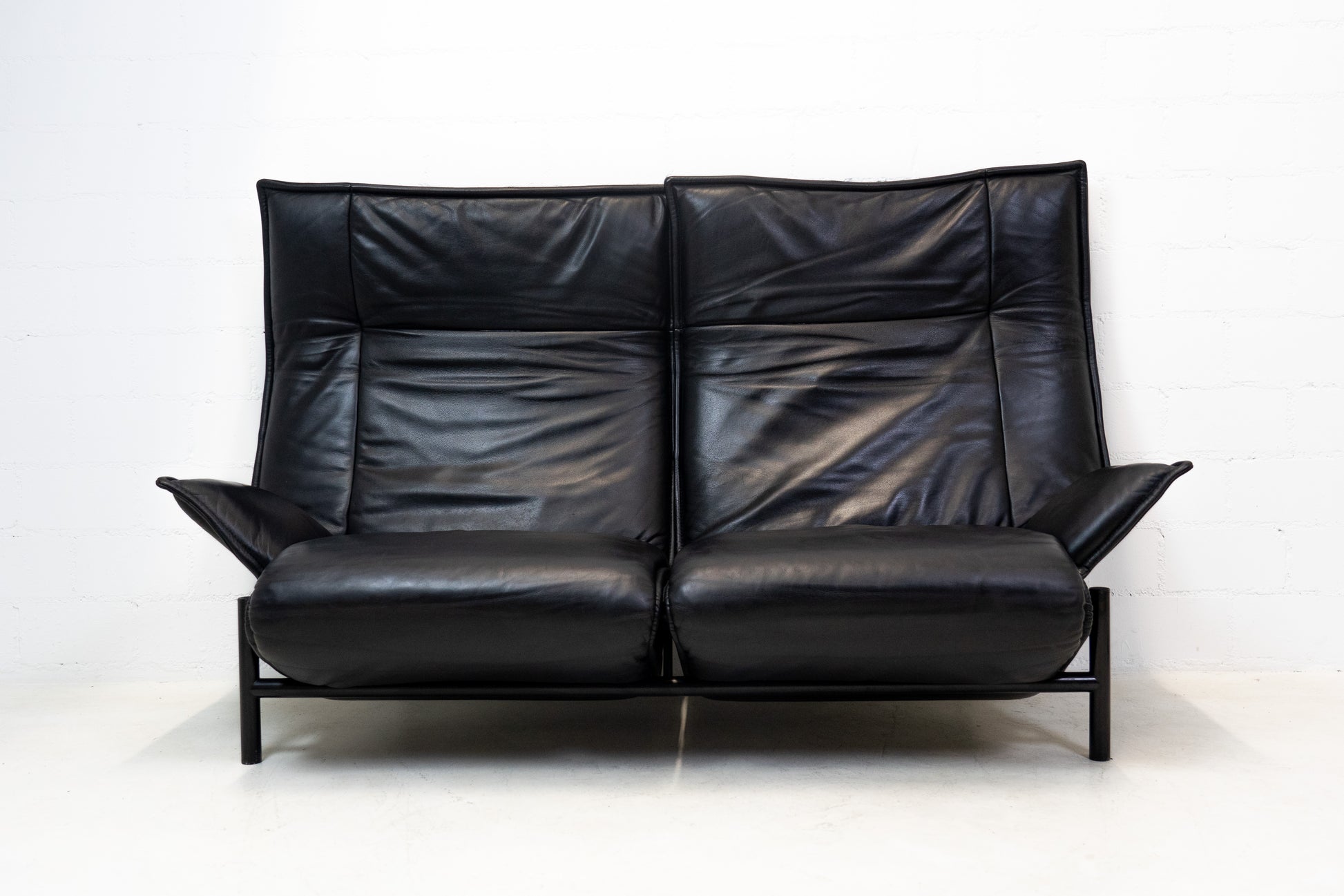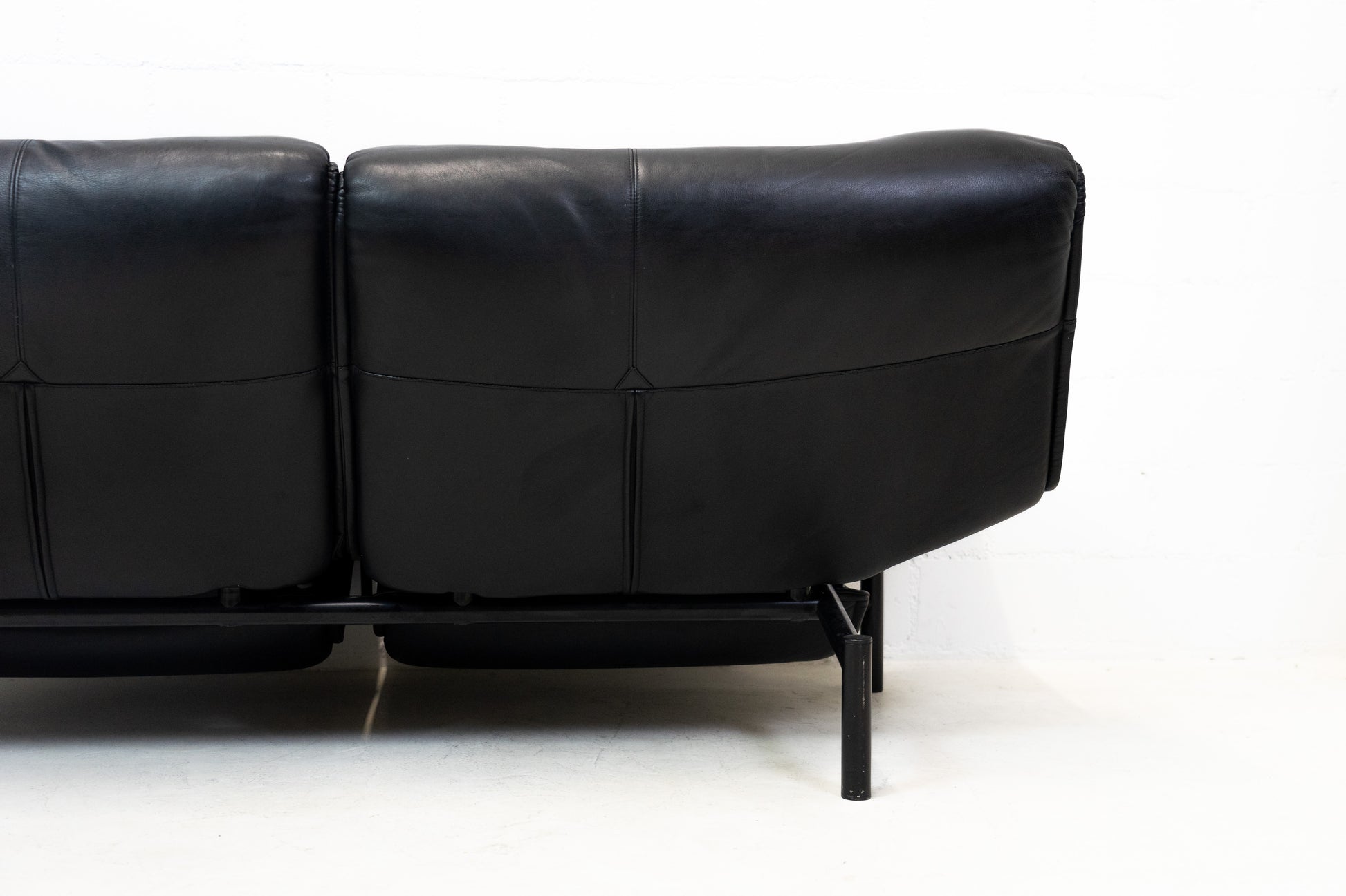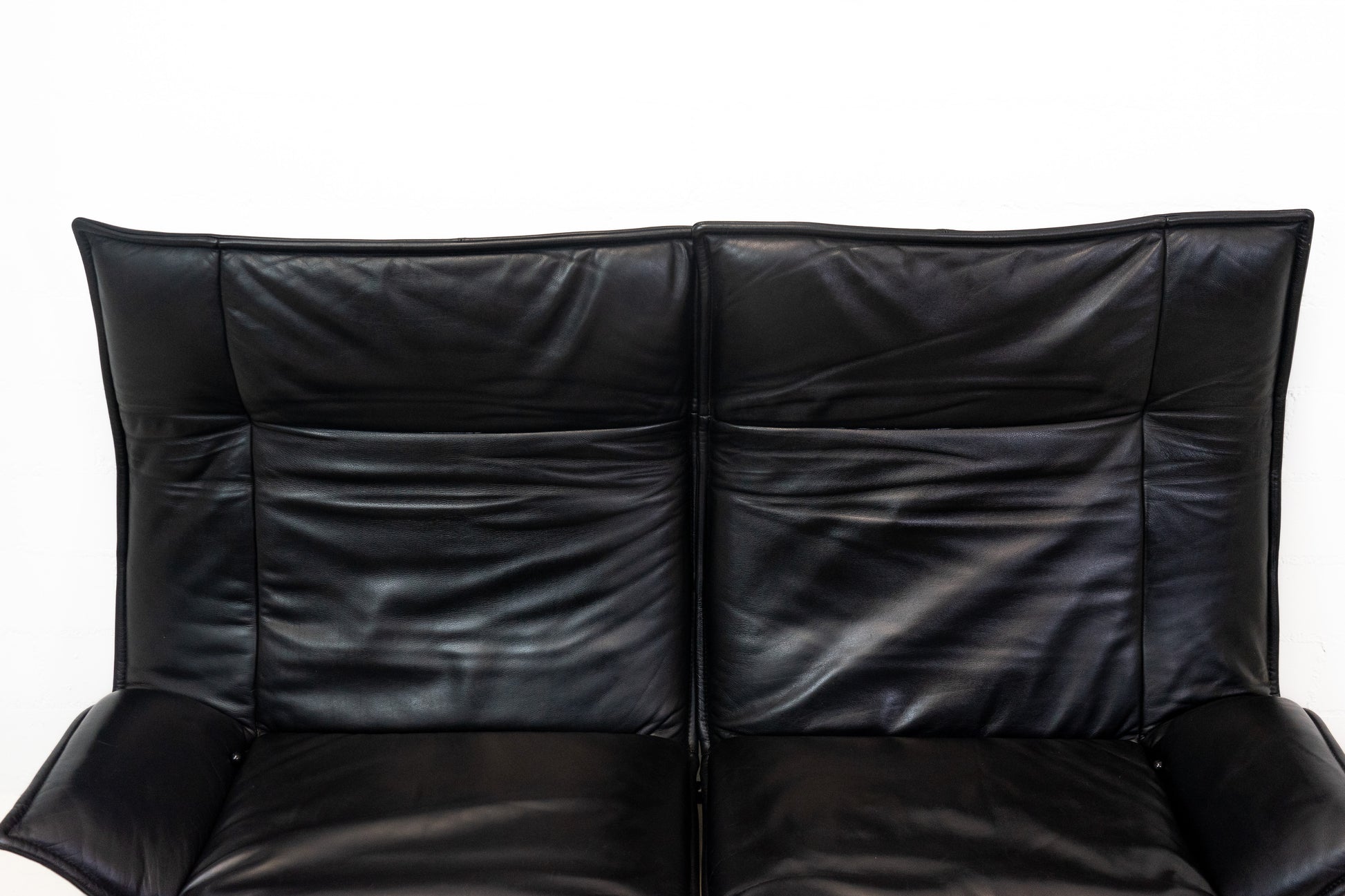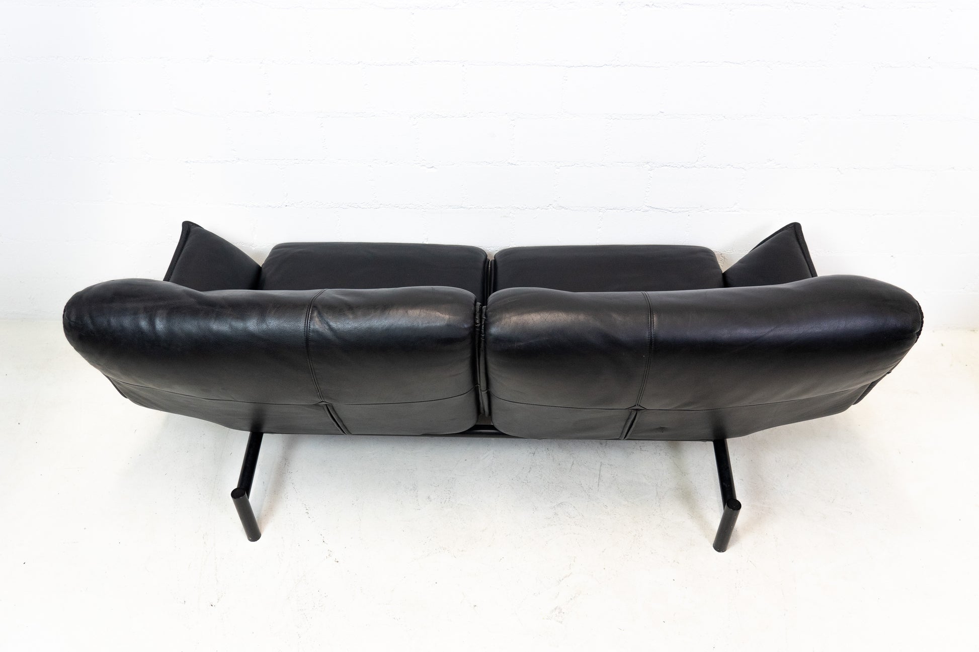 Der Bezug ist Leder in Schwarz. Das Sofa ist dem Alter entsprechend gut erhalten. Es hat Gebrauchsspuren in Form von Kratzern und Abschürfungen. Wir haben davon Detailfotos gemacht. Man kann die Rückenlehnen einzeln hochklappen und kann so den Kopf auch abstützen an der Lehne. Ein super Konzept, je nach dem wie man gerade sitzen möchte. Die linke geht etwas schwerer als die rechte. Beide funktioniert aber. Zudem lassen sich die Rückenlehnen über einen Schalter jeweils einzeln nach hinten fahren. Die Fussstützen können ausgeklappt werden. Das Design ist von Vico Magistretti.