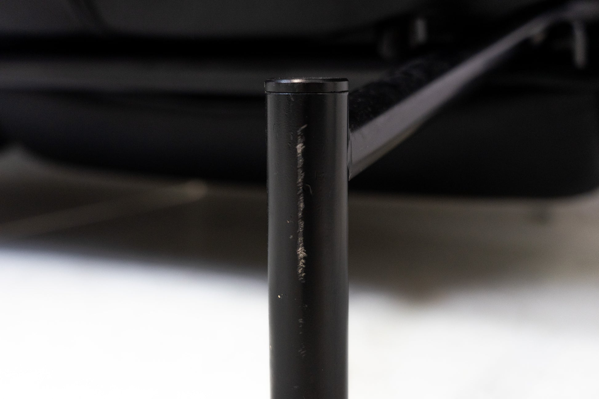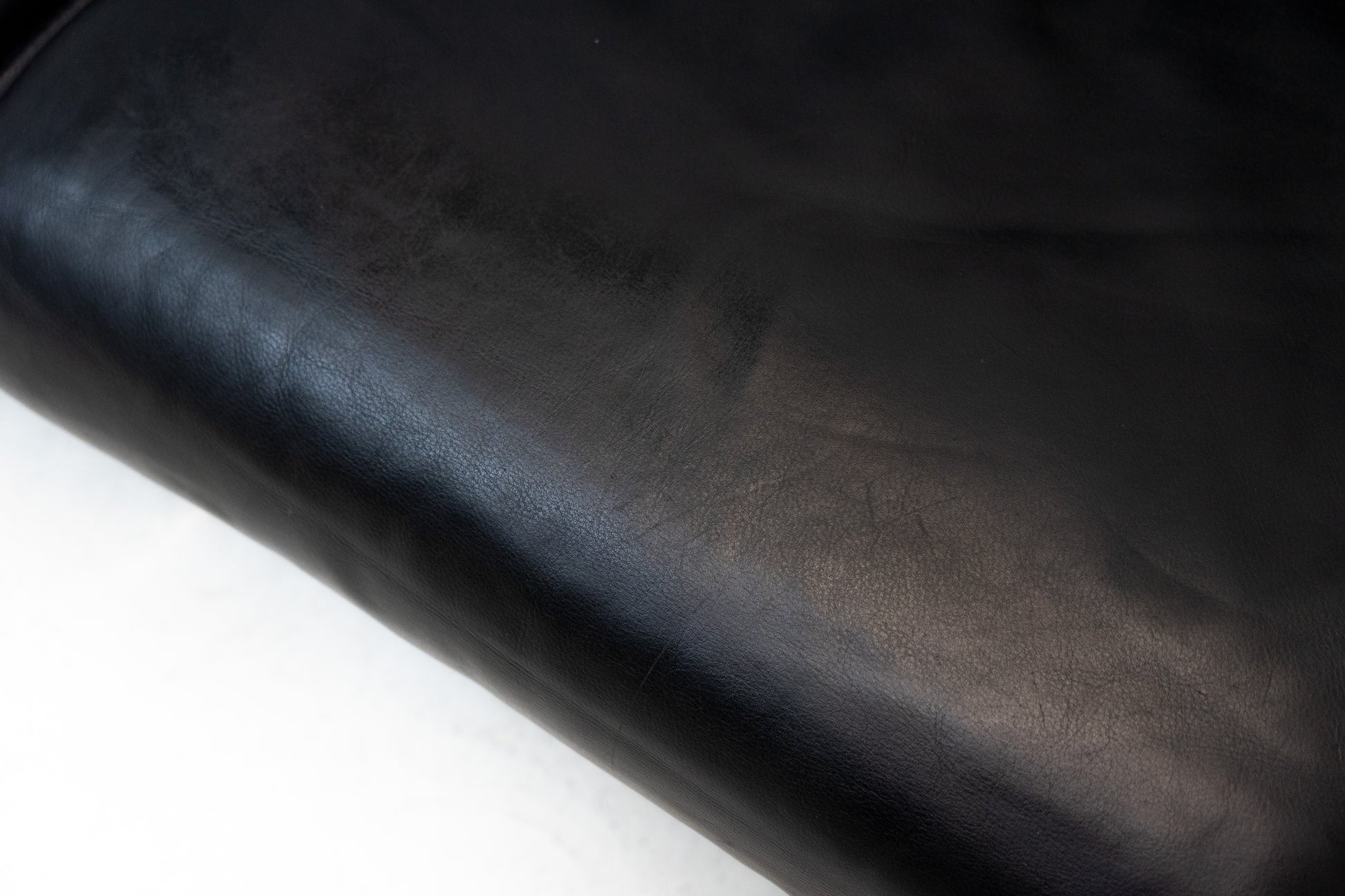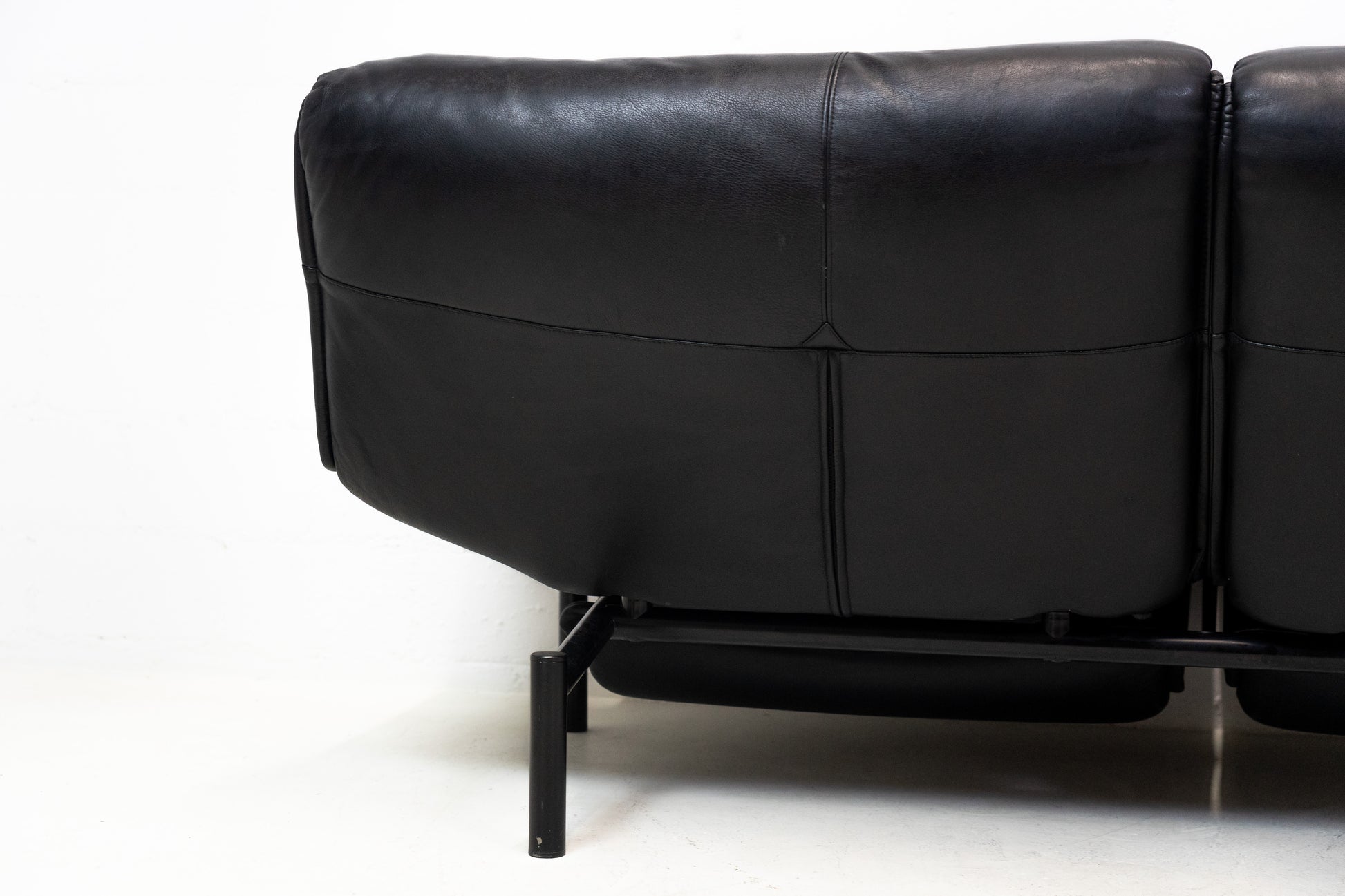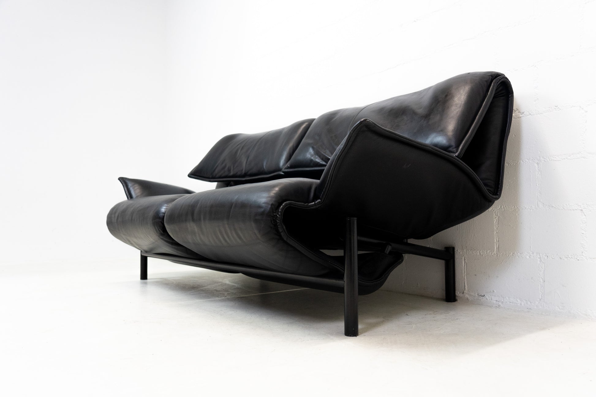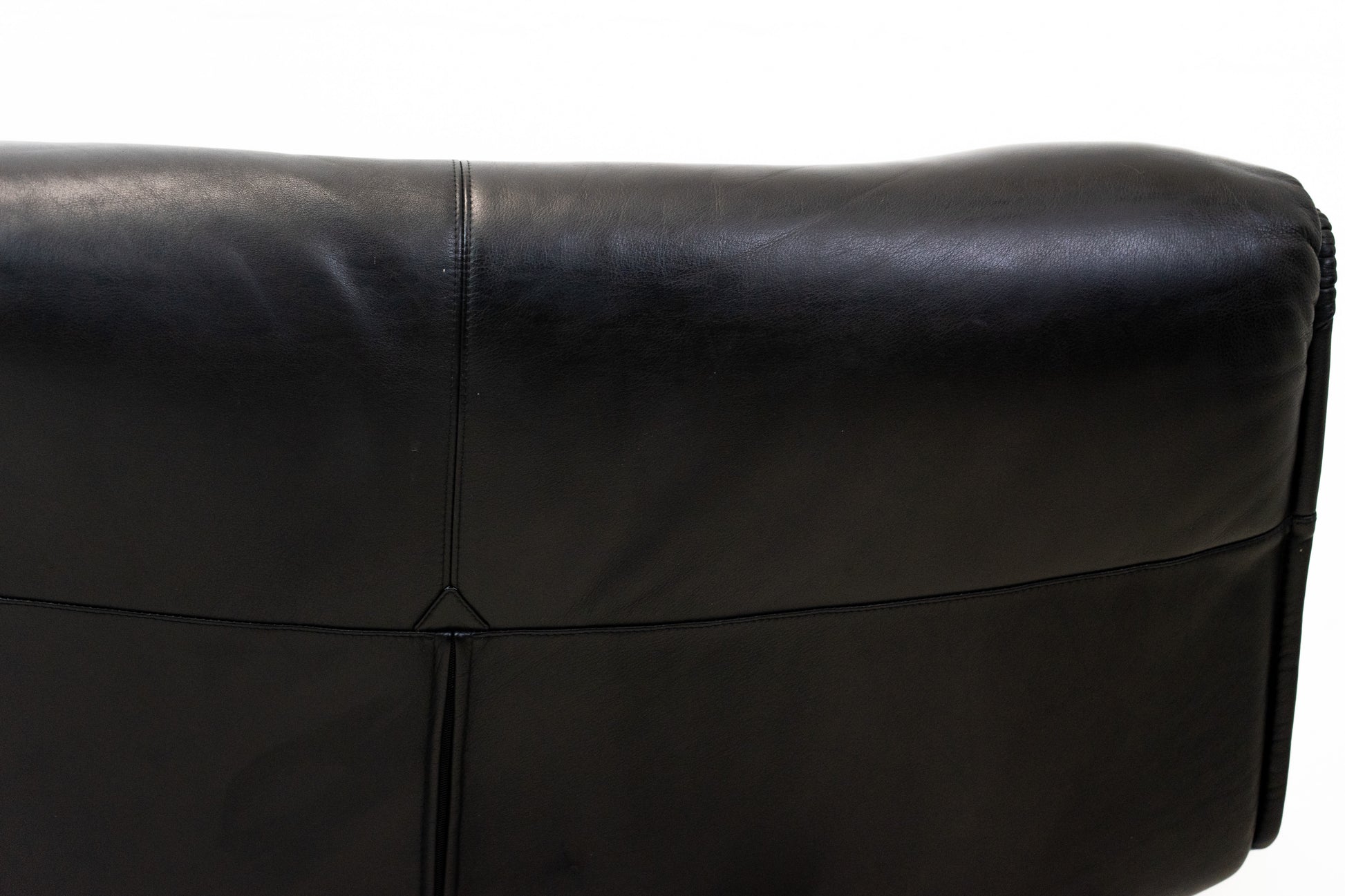 Der Bezug ist Leder in Schwarz. Das Sofa ist dem Alter entsprechend gut erhalten. Es hat Gebrauchsspuren in Form von Kratzern und Abschürfungen. Wir haben davon Detailfotos gemacht. Man kann die Rückenlehnen einzeln hochklappen und kann so den Kopf auch abstützen an der Lehne. Ein super Konzept, je nach dem wie man gerade sitzen möchte. Die linke geht etwas schwerer als die rechte. Beide funktioniert aber. Zudem lassen sich die Rückenlehnen über einen Schalter jeweils einzeln nach hinten fahren. Die Fussstützen können ausgeklappt werden. Das Design ist von Vico Magistretti.