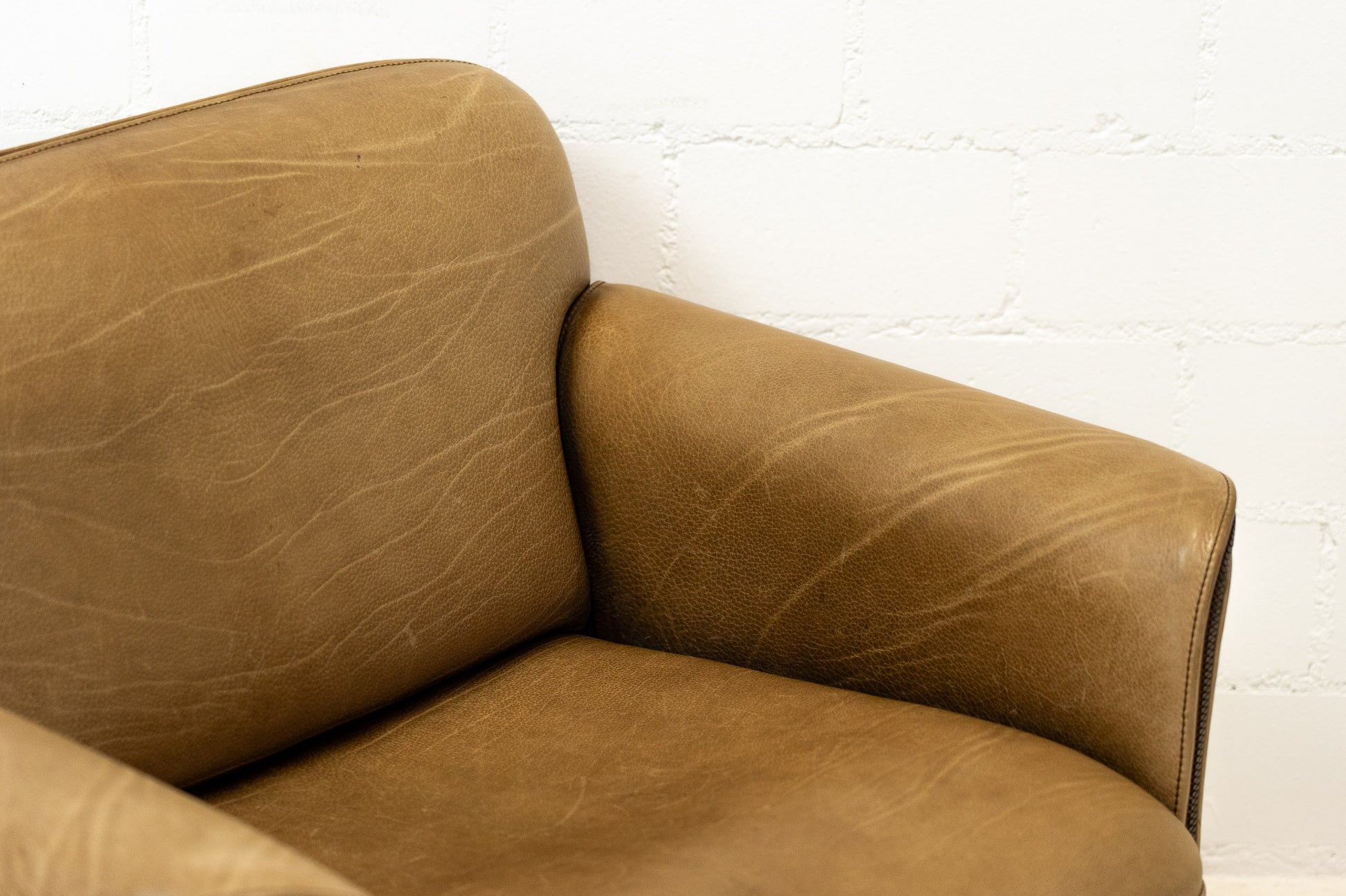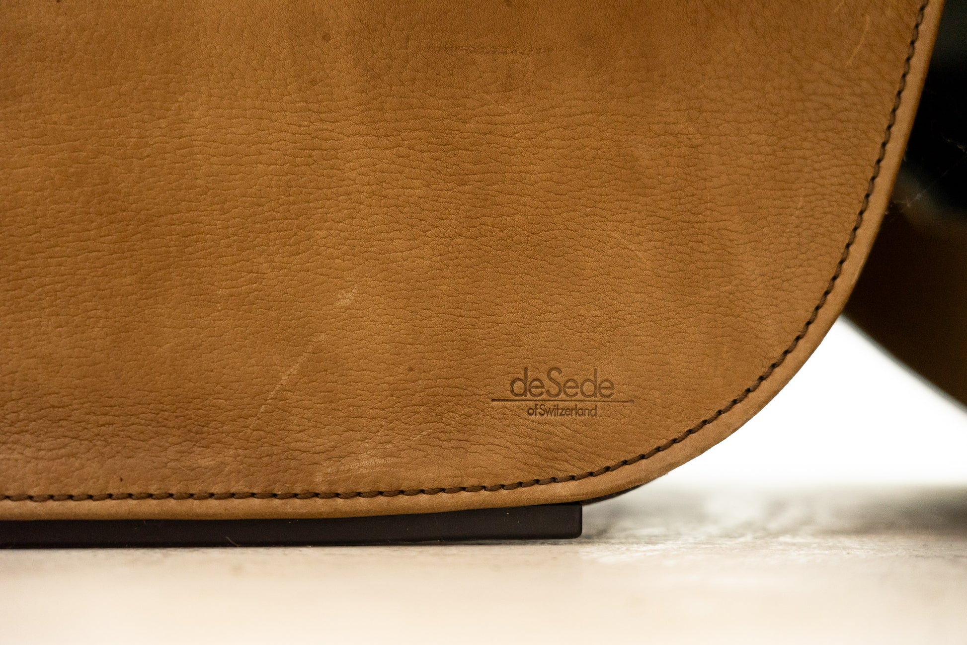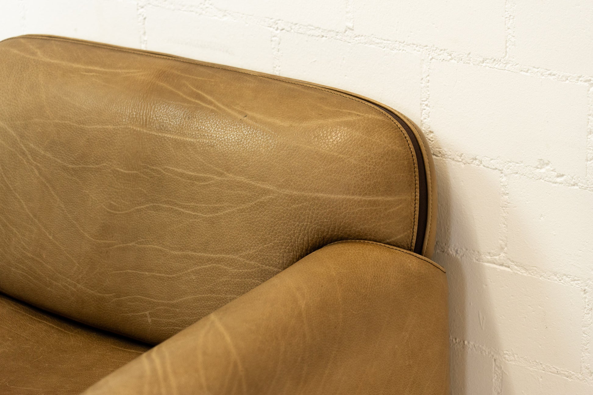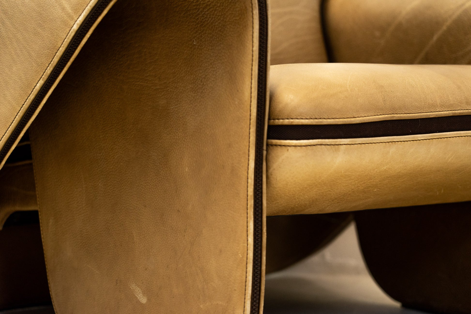 Der Bezug ist Leder, welches dem Alter entsprechend schön erhalten ist. Es hat Gebrauchsspuren in Form von Kratzern, Abschürfungen, Farbänderungen durch den Lichteinfall und Verfärbungen. Wir haben davon Detailfotos gemacht. Der Sitzkomfort ist nach wie vor super. Der Sessel ist filigran gebaut und wirkt durch die speziellen Armlehnen leicht. Der DS-125 wurde von Gerd Lange entworfen. Dieses Modell wird nicht mehr bei De Sede produziert. Sie können hier also ein spezielles Design-Objekt mit Seltenheitswert kaufen. De Sede Möbel werden von Hand in der Schweiz gefertigt. Ein echtes Qualitätsprodukt.