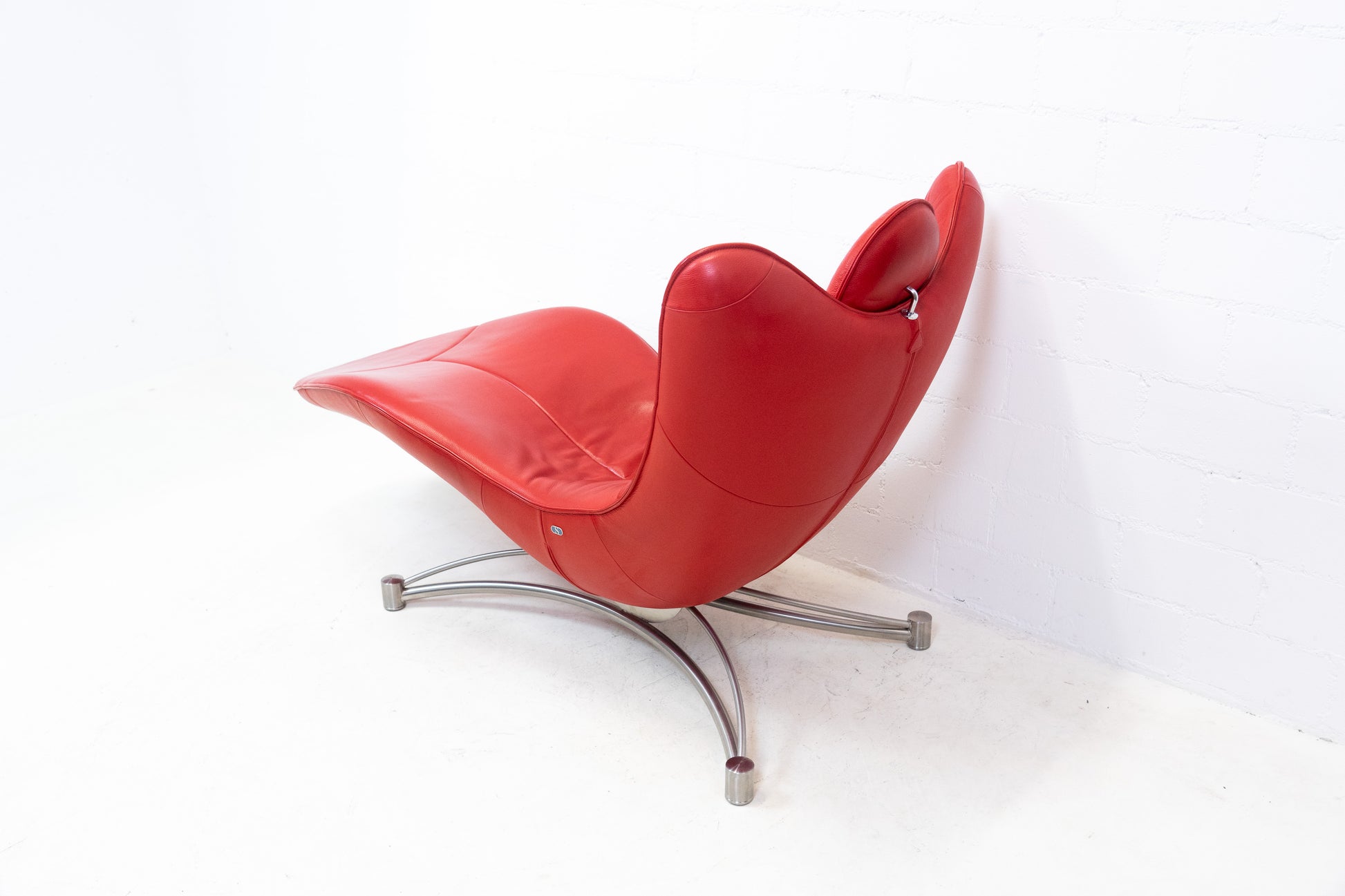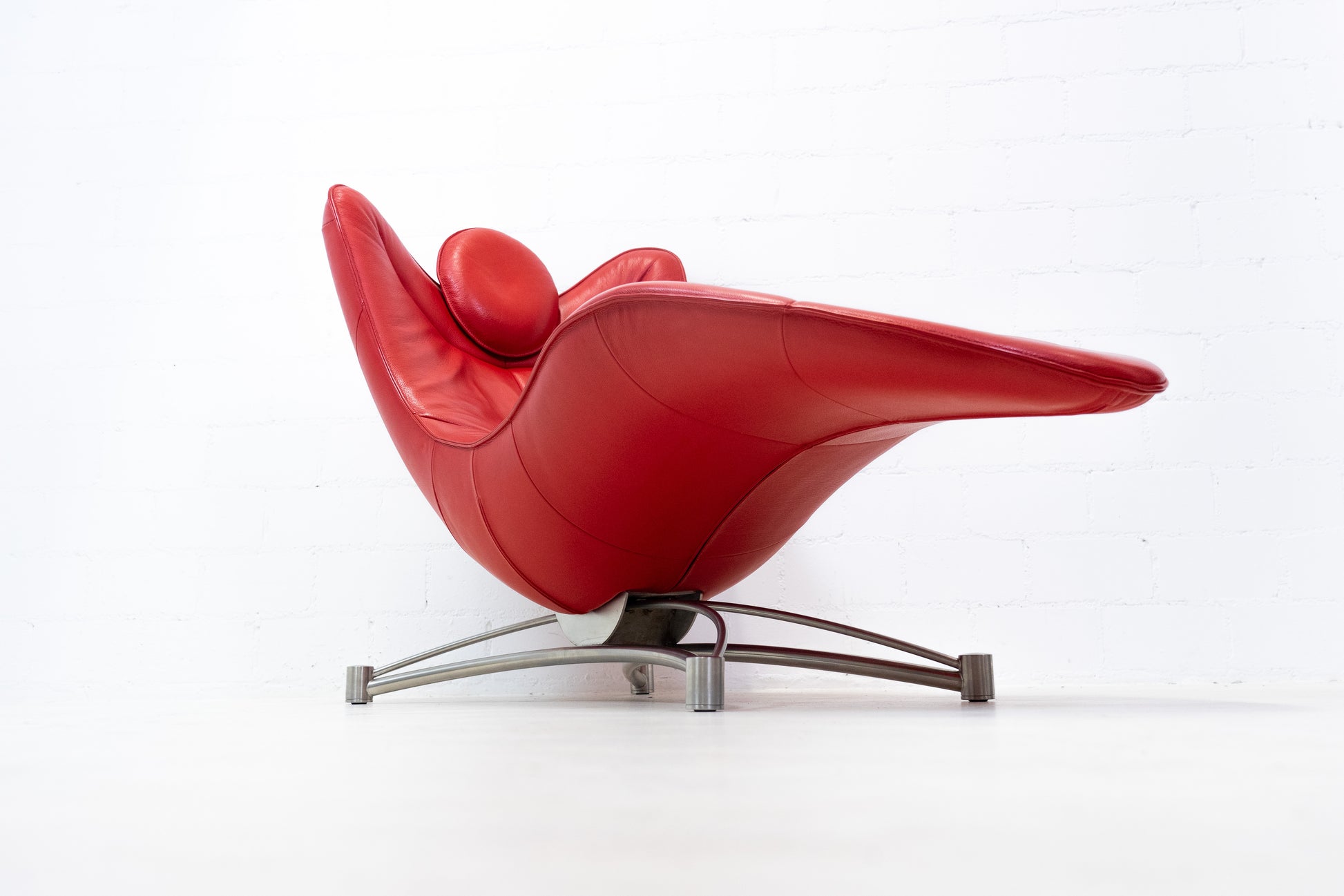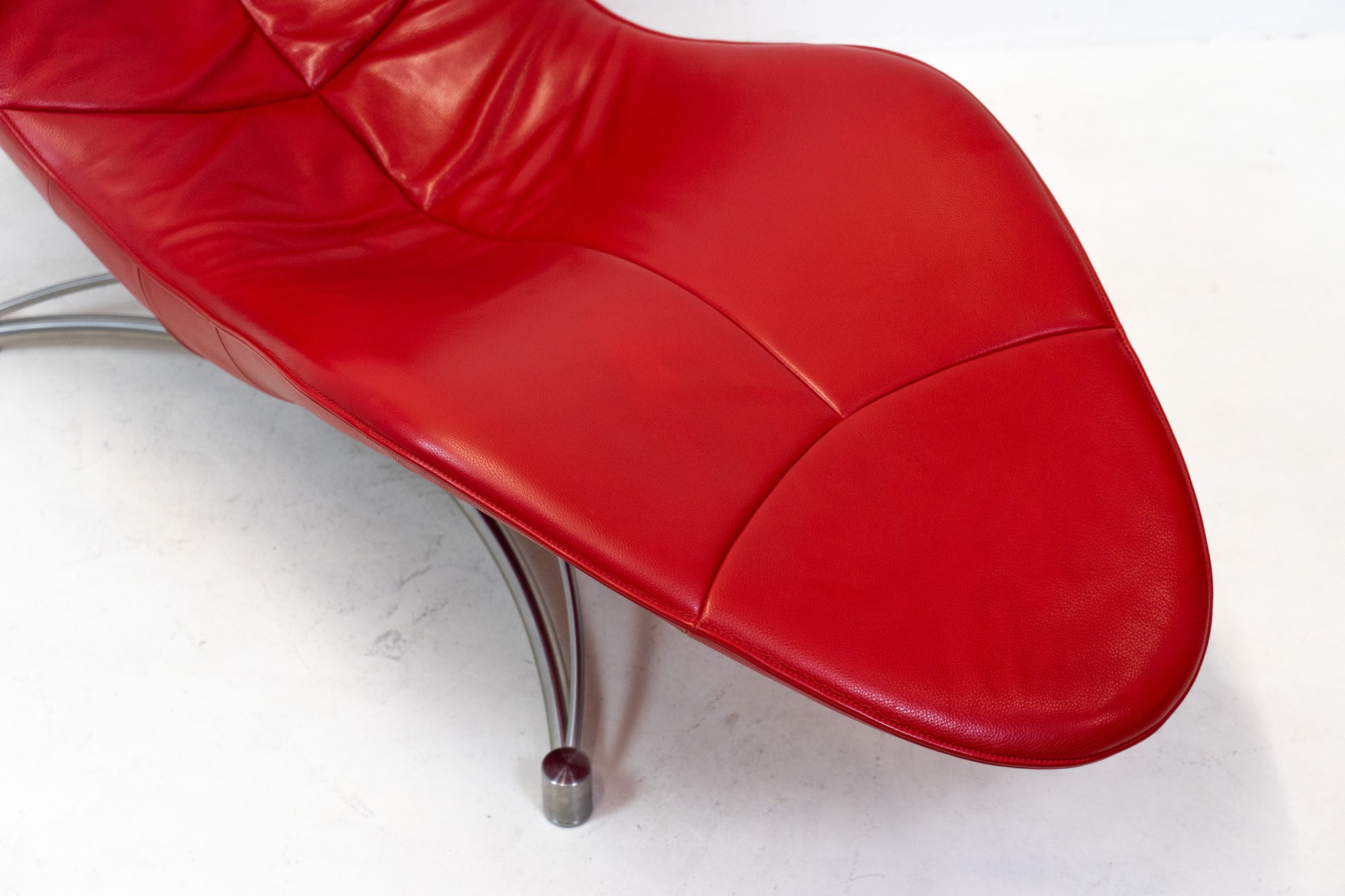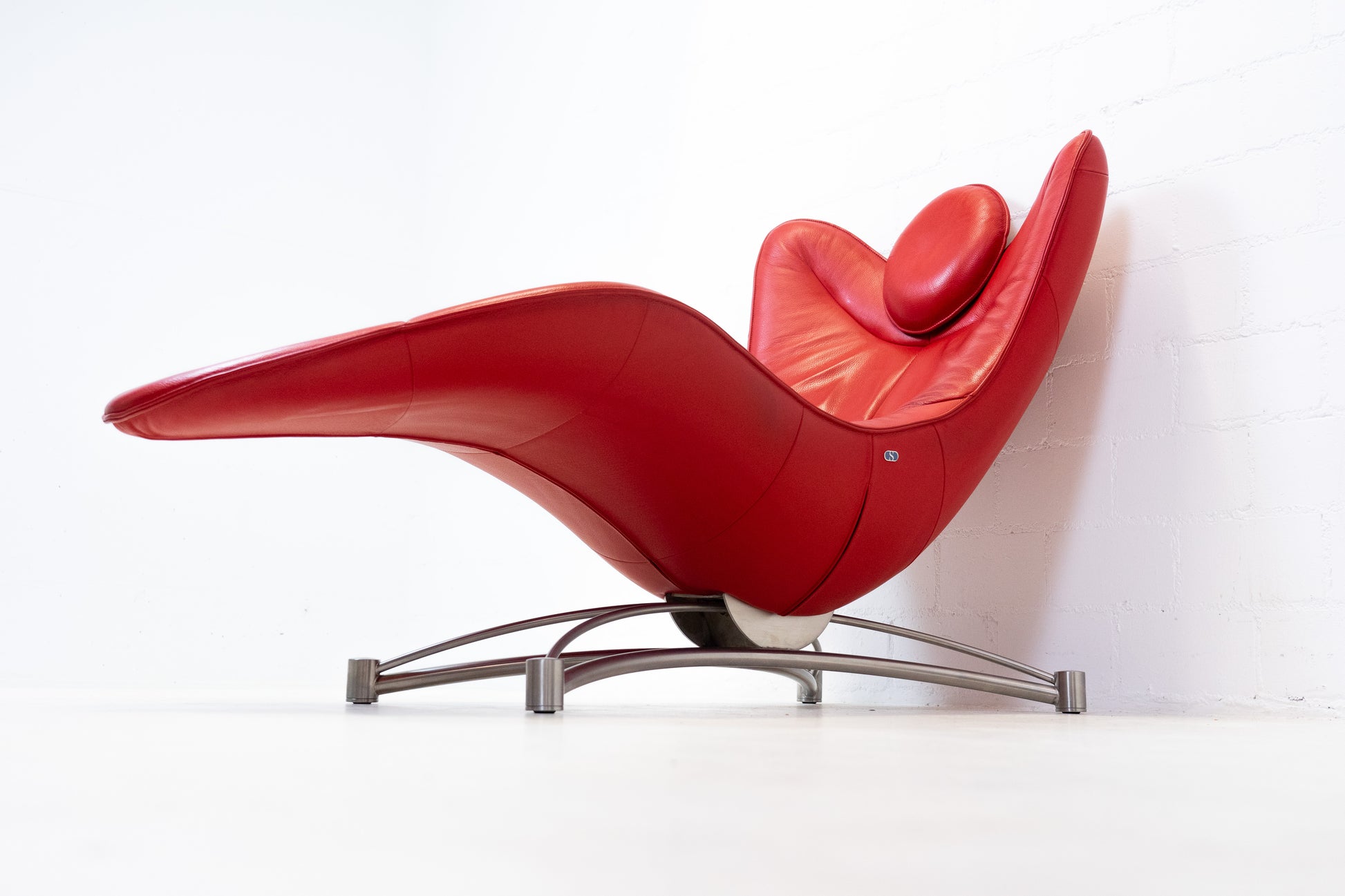 Der Bezug ist Leder, welches sehr gut / fast neuwertig erhalten ist. Es hat nur geringe Gebrauchsspuren in Form von Kratzern und Abschürfungen. Der Liegekomfort ist nach wie vor sehr gut. Die Kopfstütze der Liege lässt sich verstellen. Das Design stammt von Jane Worthington und die Liege wurde von De Sede produziert.