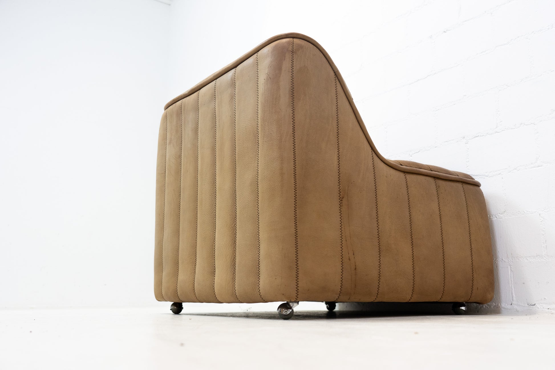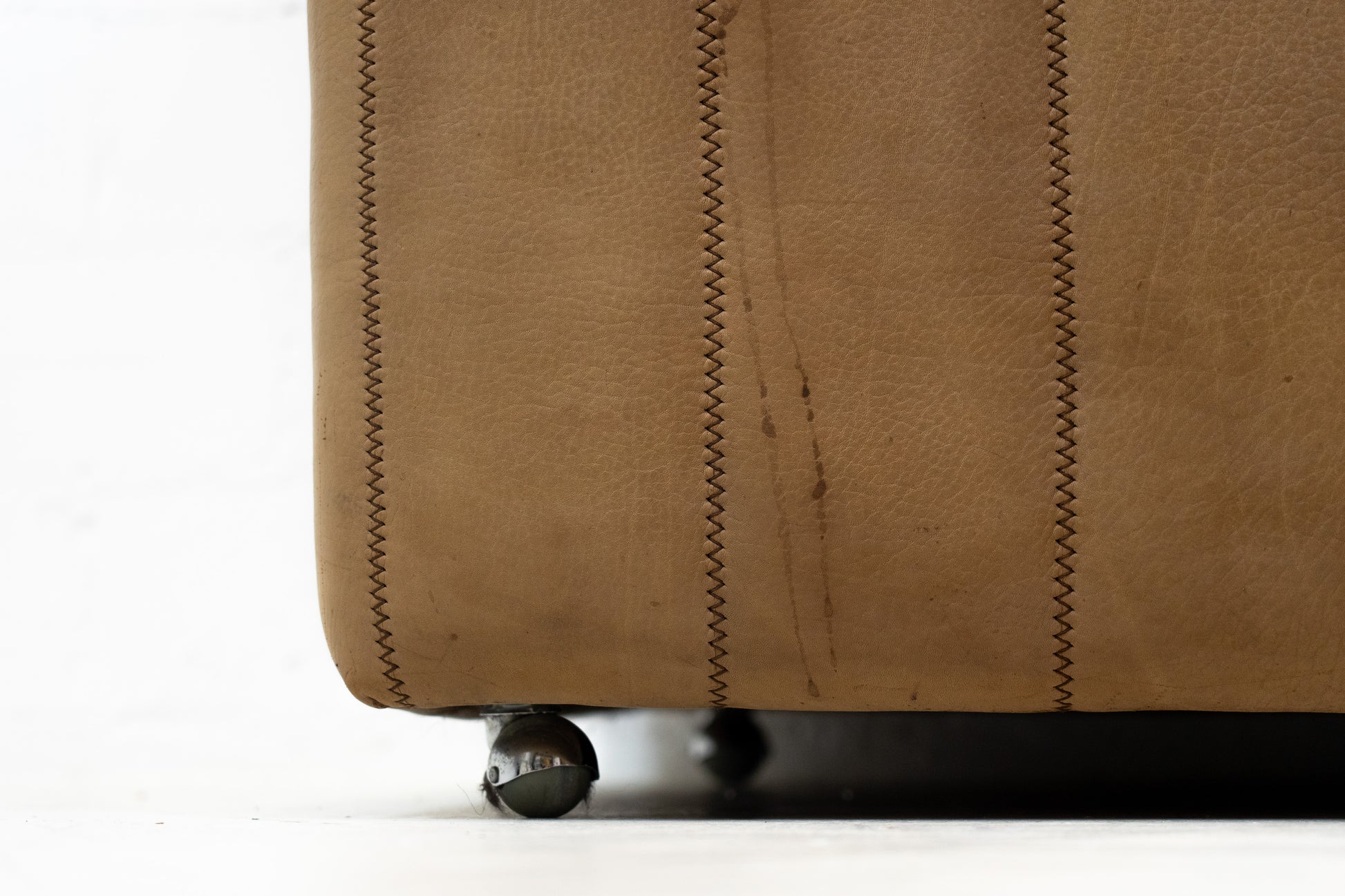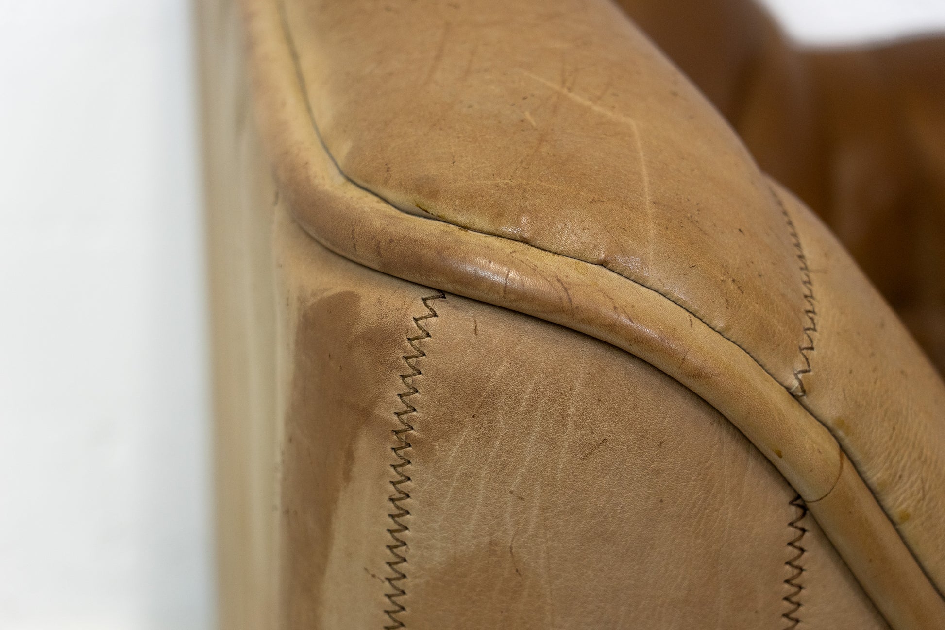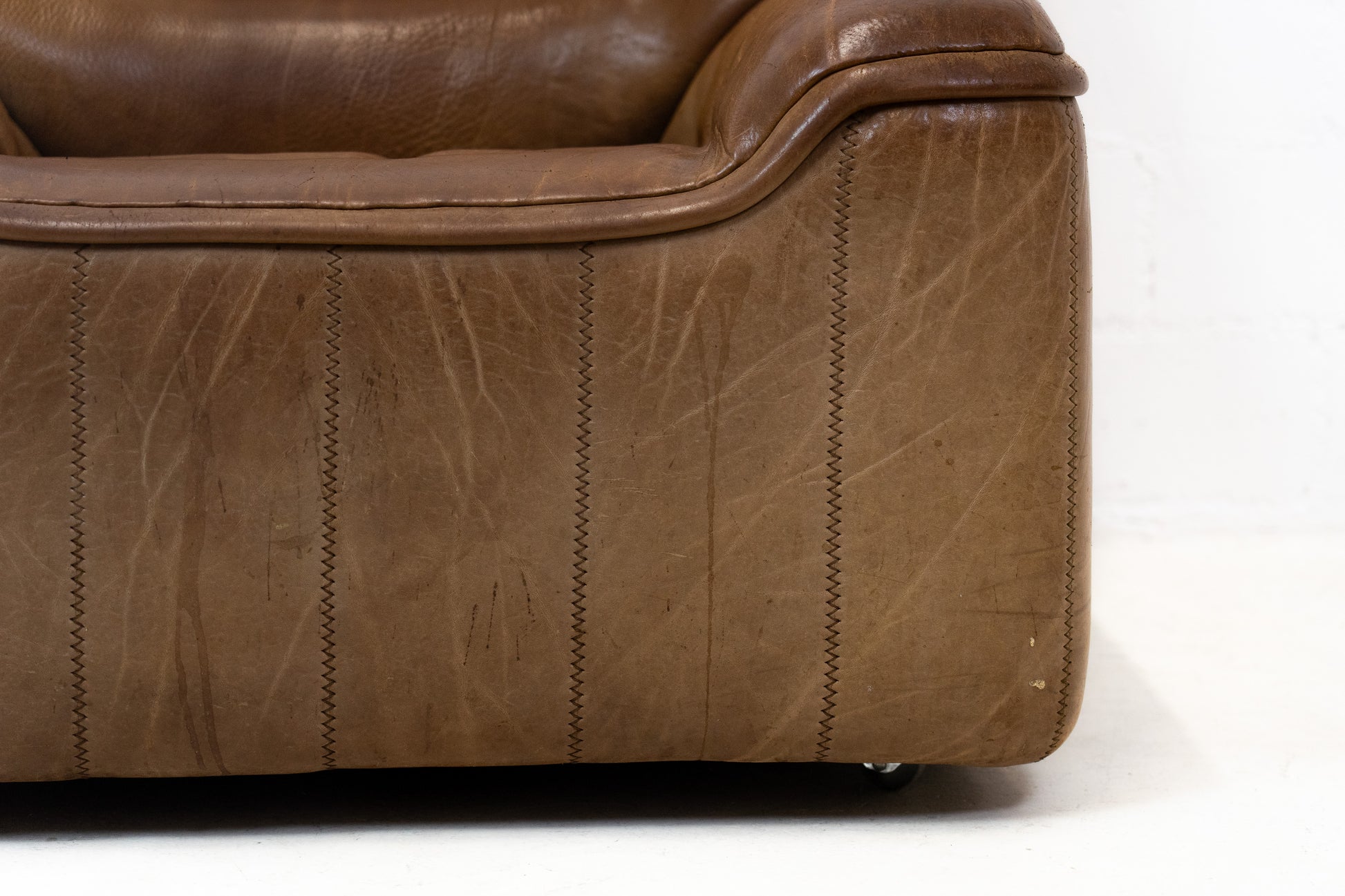 Der Bezug ist sehr dickes Leder, welches dem Alter entsprechend gut erhalten und schön weich ist. Es hat Gebrauchsspuren in Form von Kratzern, Abschürfungen und Verfärbungen. Der Sessel stammt aus einem Katzenhaushalt. Der Sitzkomfort ist nach wie vor super. Der Sessel wurde vom Vorbesitzer auf Rollen umgerüstet. Dieses Modell wird nicht mehr bei De Sede produziert und ist entsprechend selten geworden. De Sede Möbel werden von Hand in der Schweiz gefertigt. Ein echtes Qualitätsprodukt. Wir haben insgesamt 2 Sessel in jeweils ähnlichem Zustand ab Lager verfügbar. Den anderen Sessel finden Sie unter unseren weiteren Angeboten.