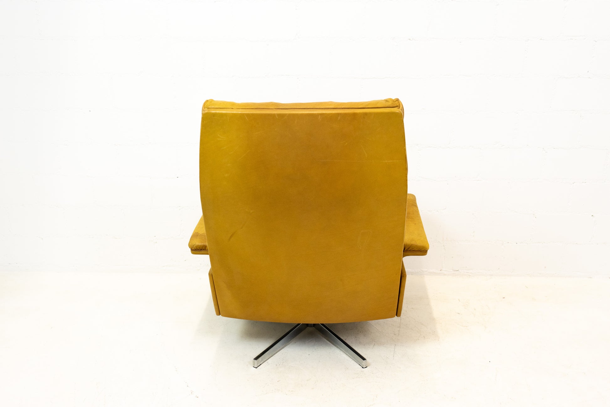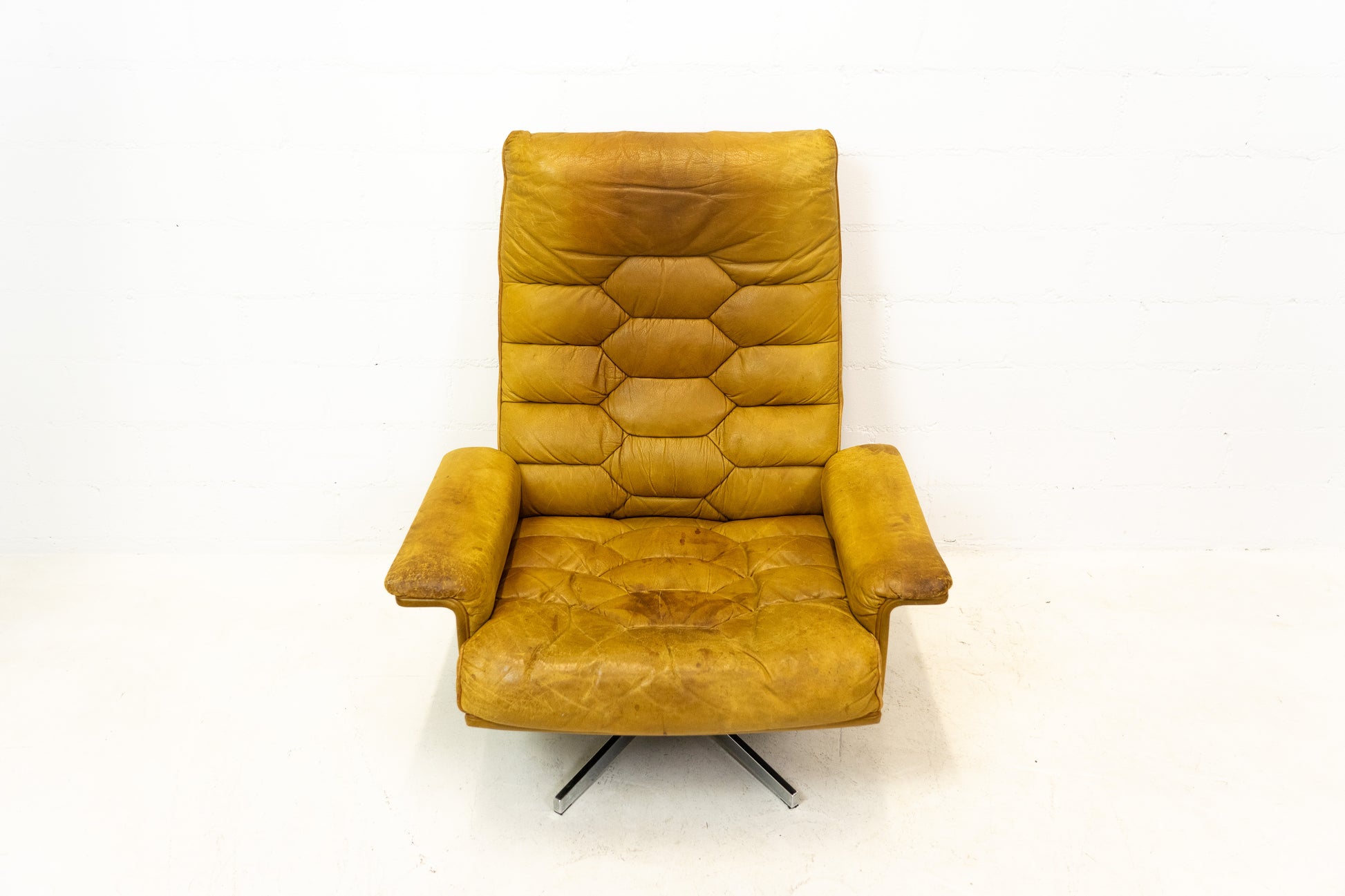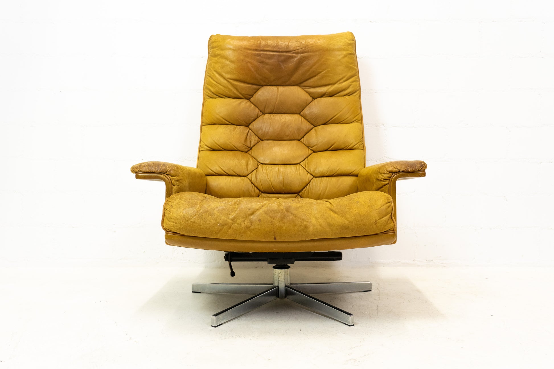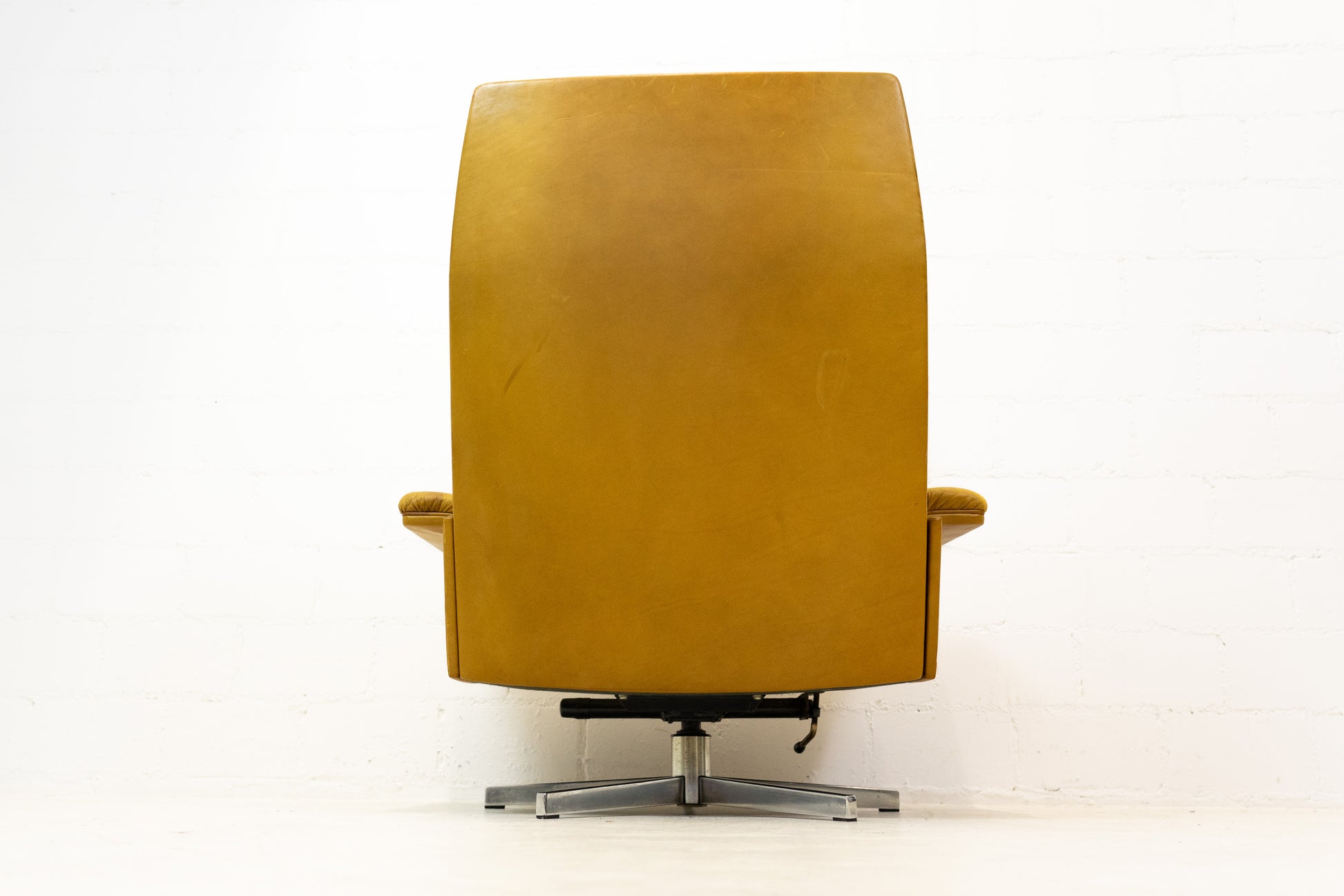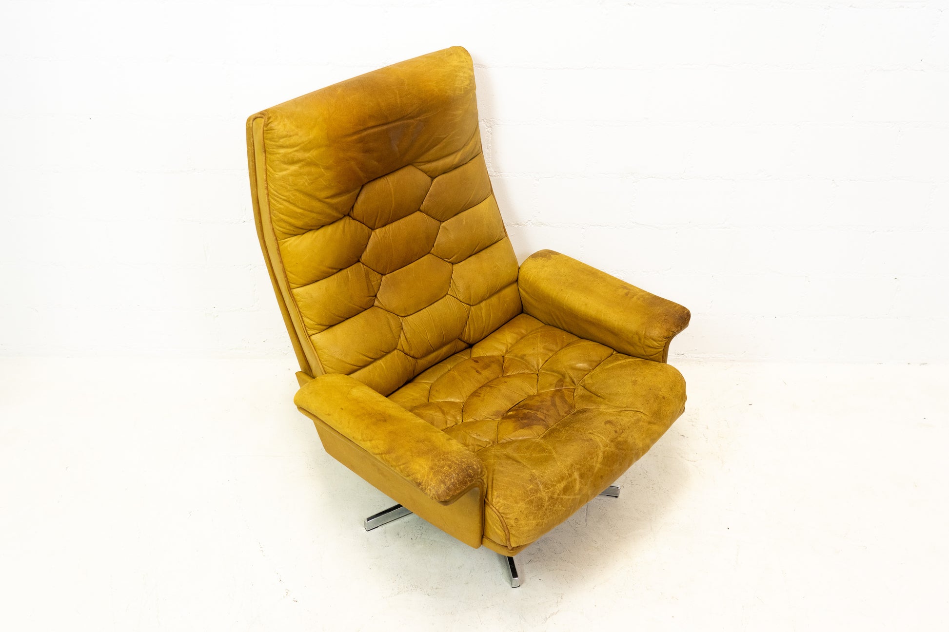 Der Bezug ist Leder, welches dem Alter entsprechend erhalten ist. Es hat Gebrauchsspuren in Form von Kratzern, Abschürfungen, brüchigen Stellen und Verfärbungen. Der Sitzkomfort ist nach wie vor super und die hochwertige Polsterung immer noch gut nach alle den Jahrzehnten. Dieses Modell wird nicht mehr bei De Sede produziert und ist entsprechend selten geworden. Es ist ein Entwurf von Robert Haussmann. De Sede Möbel werden von Hand in der Schweiz gefertigt. Ein echtes Qualitätsprodukt. Der Sessel ist drehbar und kippbar (Stärke einstellbar). Wir haben insgesamt aus der gleichen Serie noch einen weiteren Sessel, 2 Sessel mit kurzer Rückenlehne und einen Hocker.