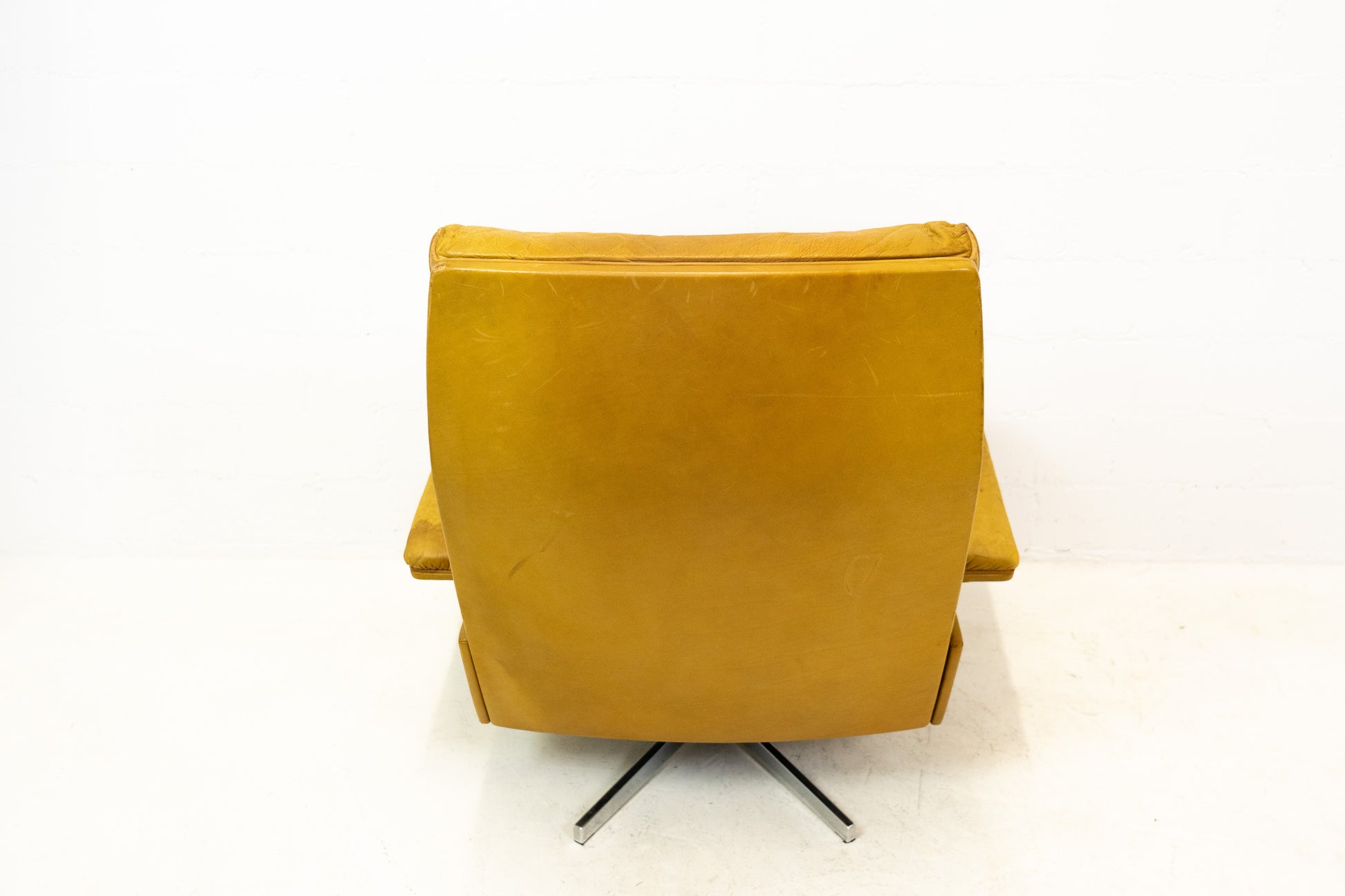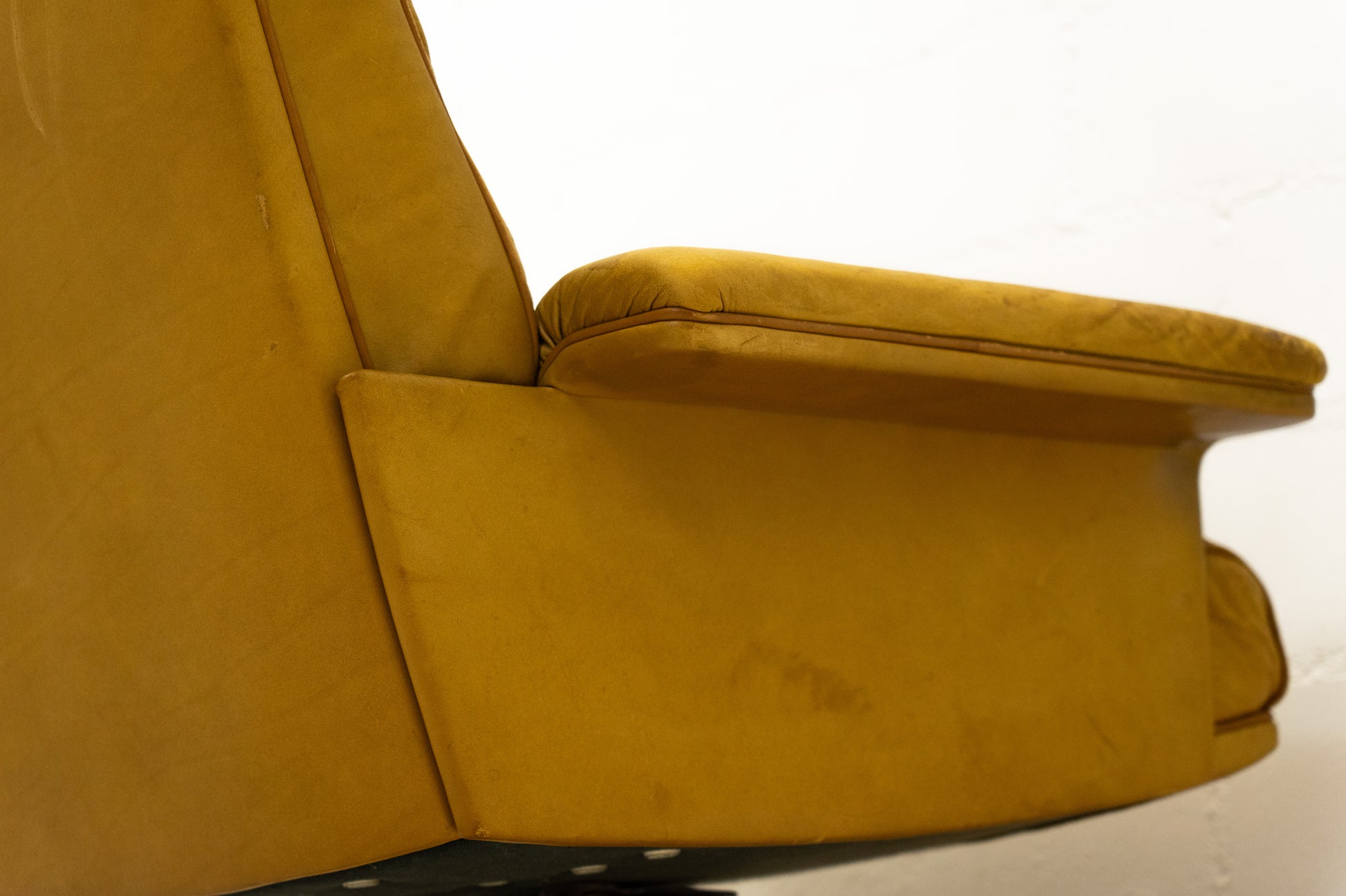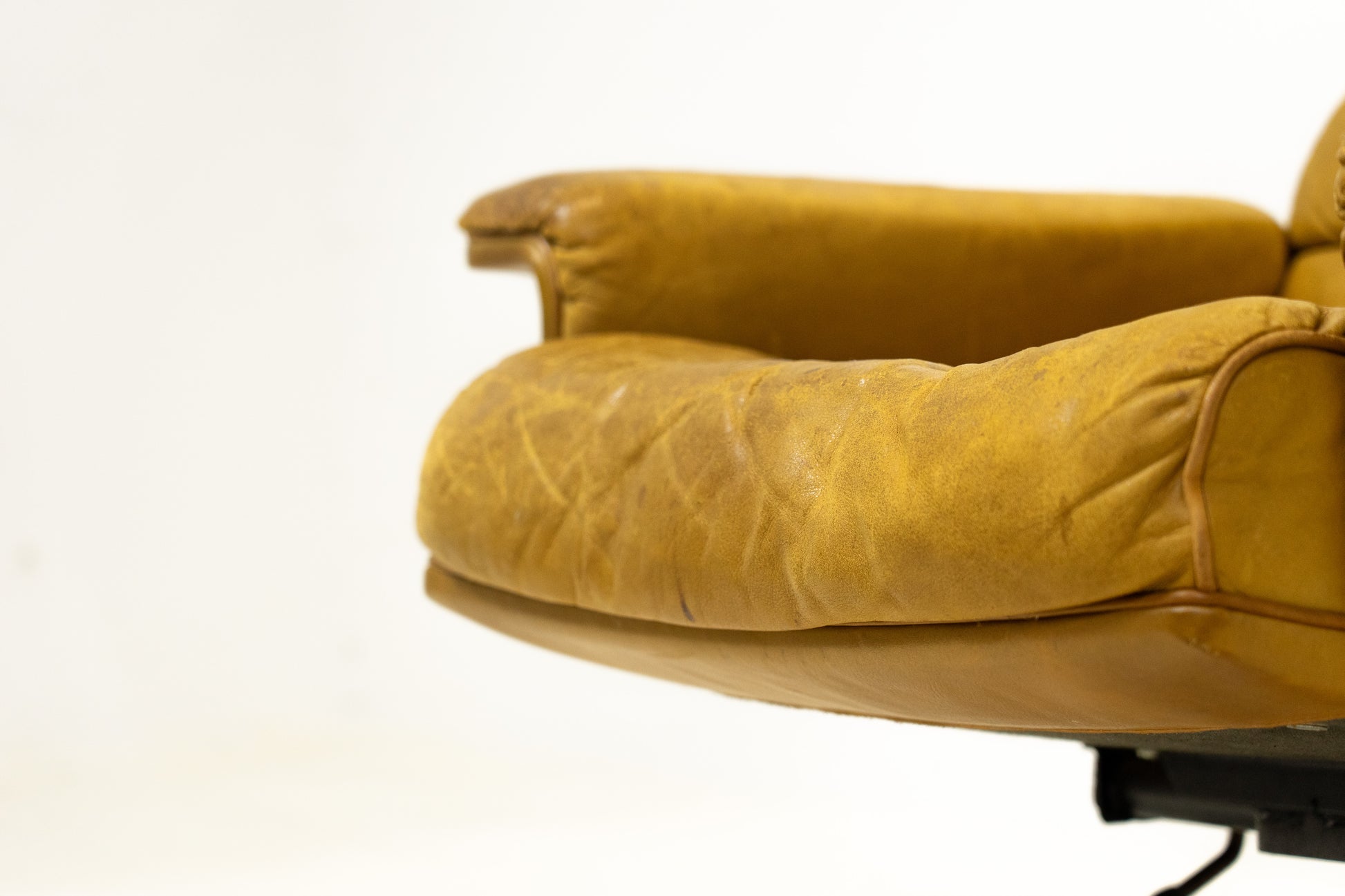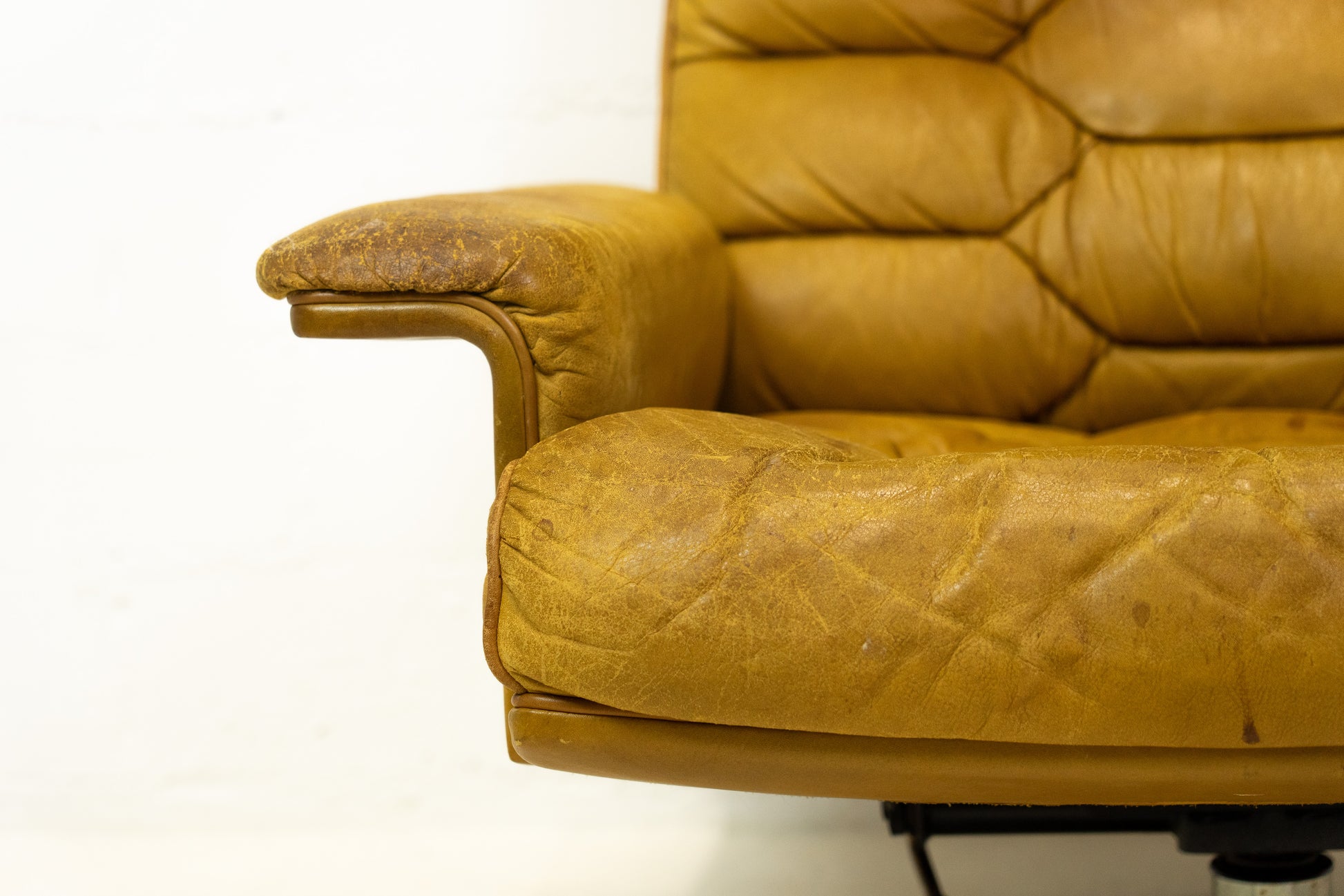 Der Bezug ist Leder, welches dem Alter entsprechend erhalten ist. Es hat Gebrauchsspuren in Form von Kratzern, Abschürfungen, brüchigen Stellen und Verfärbungen. Der Sitzkomfort ist nach wie vor super und die hochwertige Polsterung immer noch gut nach alle den Jahrzehnten. Dieses Modell wird nicht mehr bei De Sede produziert und ist entsprechend selten geworden. Es ist ein Entwurf von Robert Haussmann. De Sede Möbel werden von Hand in der Schweiz gefertigt. Ein echtes Qualitätsprodukt. Der Sessel ist drehbar und kippbar (Stärke einstellbar). Wir haben insgesamt aus der gleichen Serie noch einen weiteren Sessel, 2 Sessel mit kurzer Rückenlehne und einen Hocker.