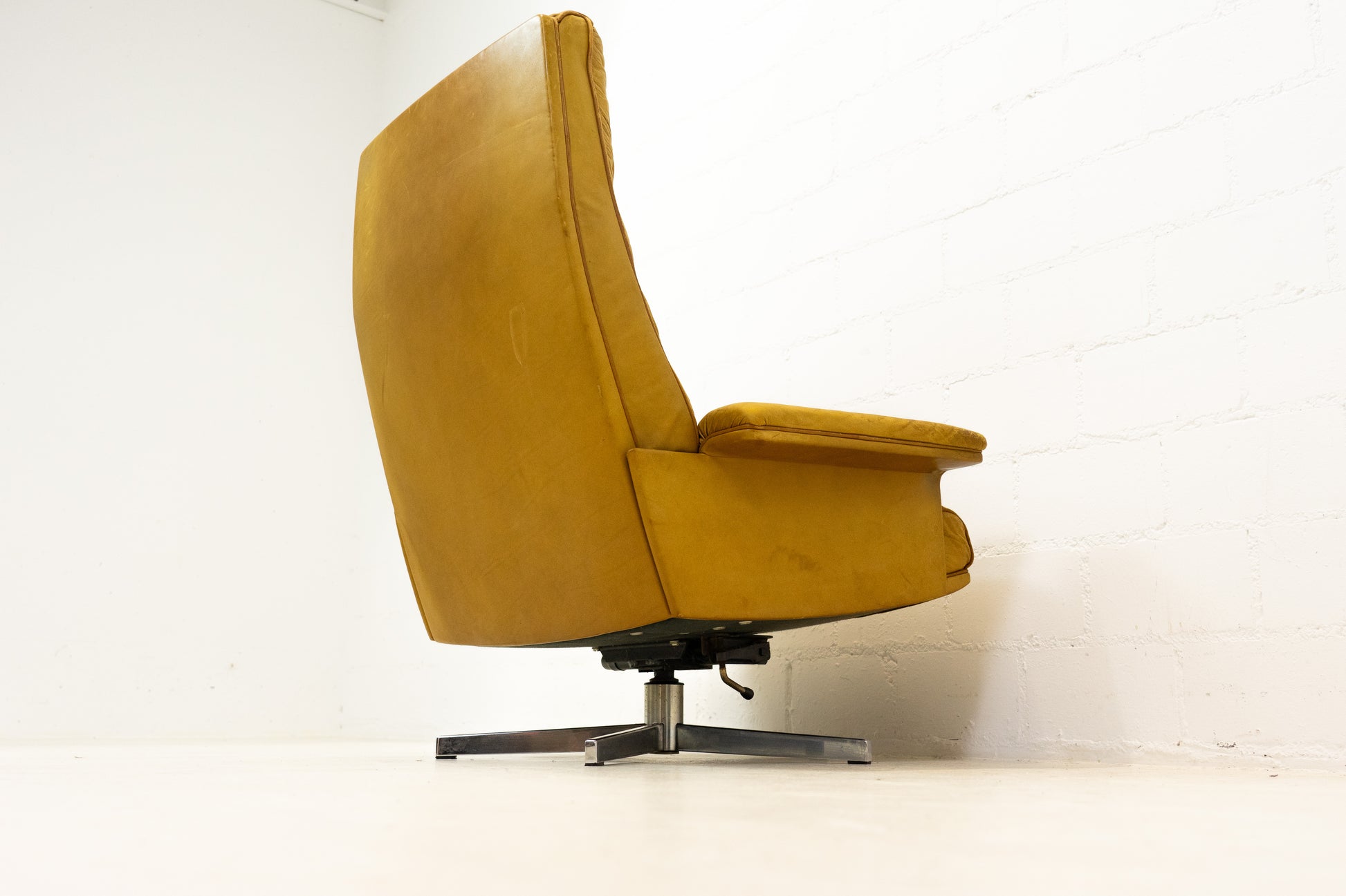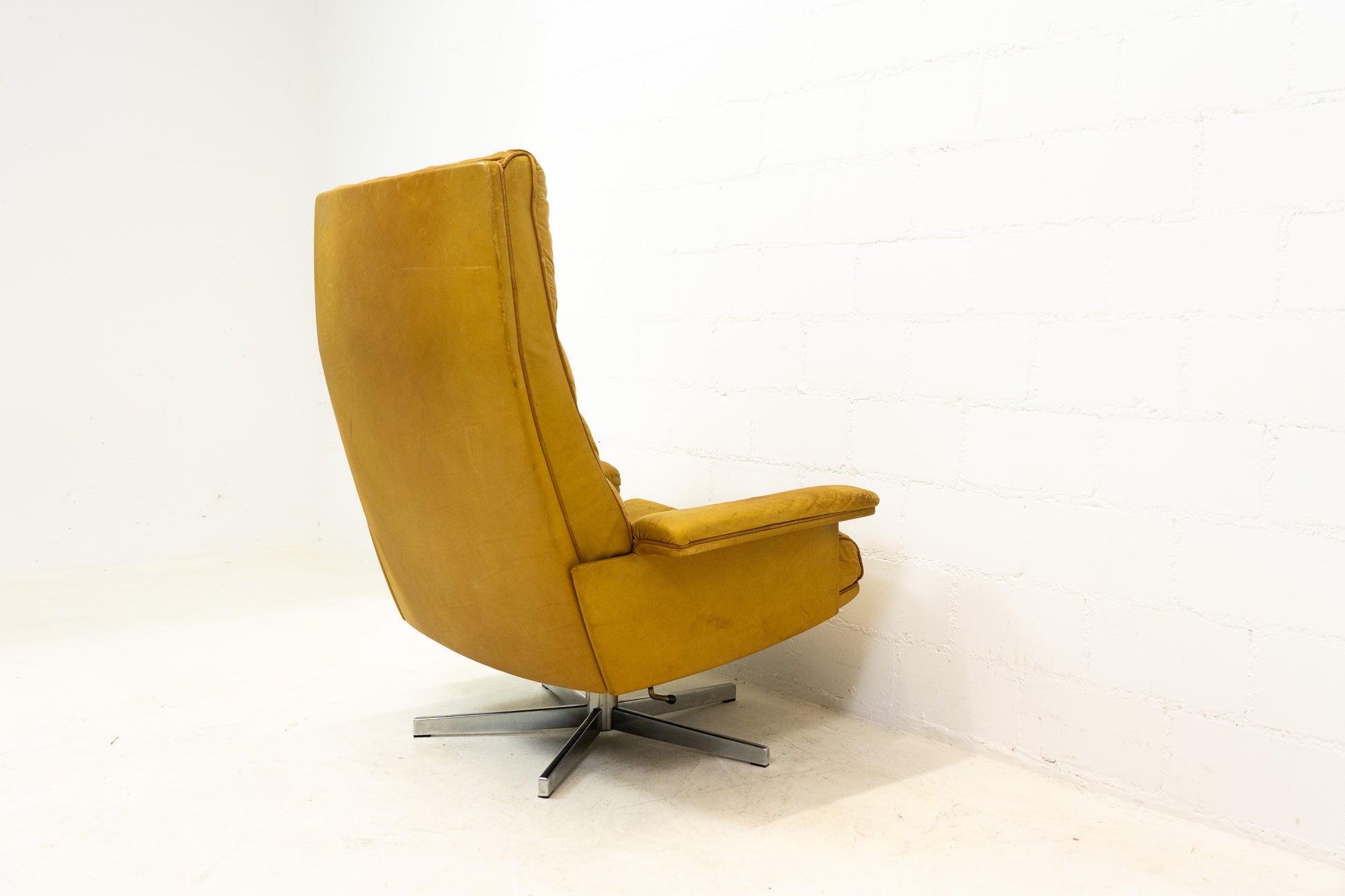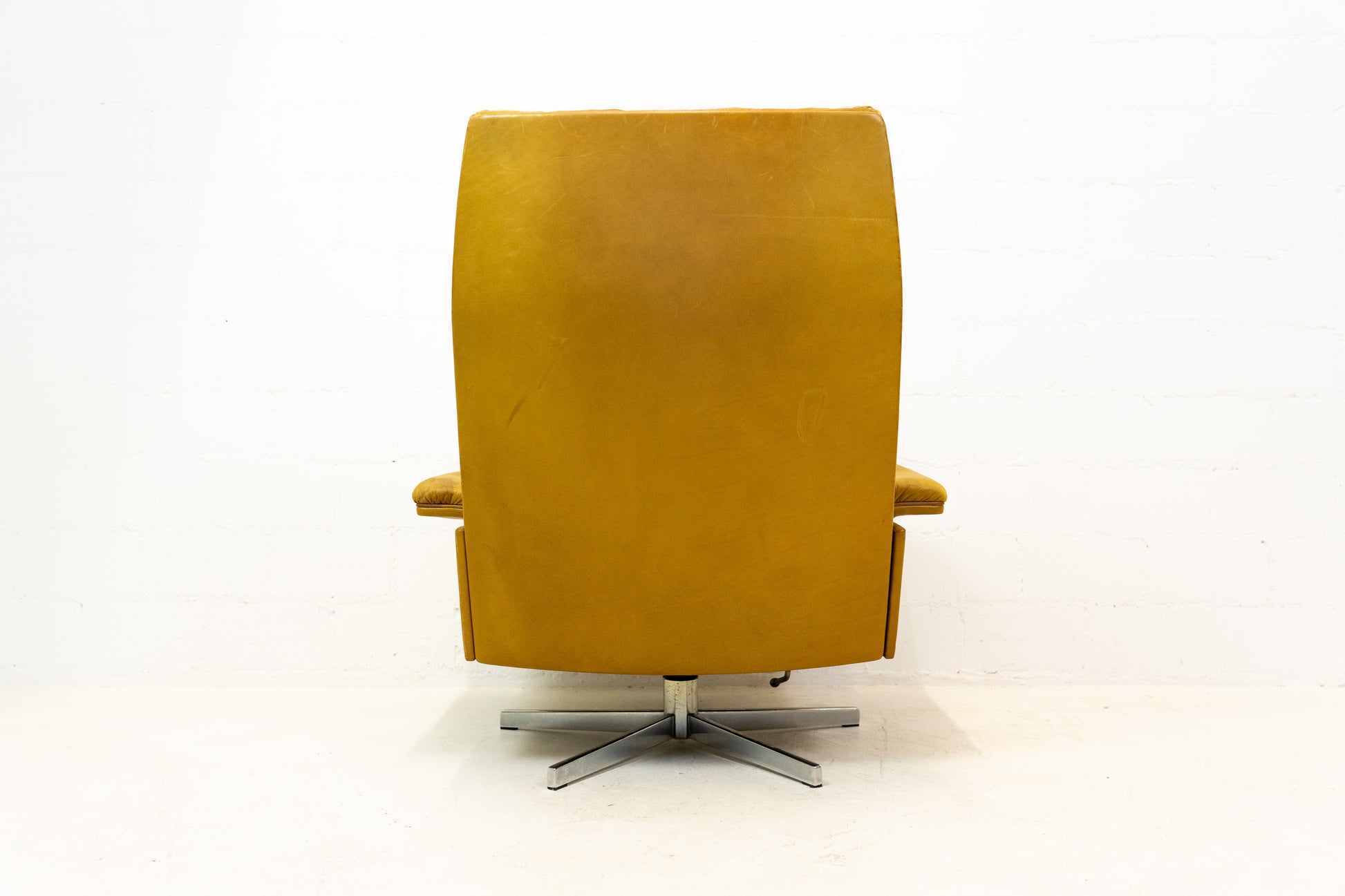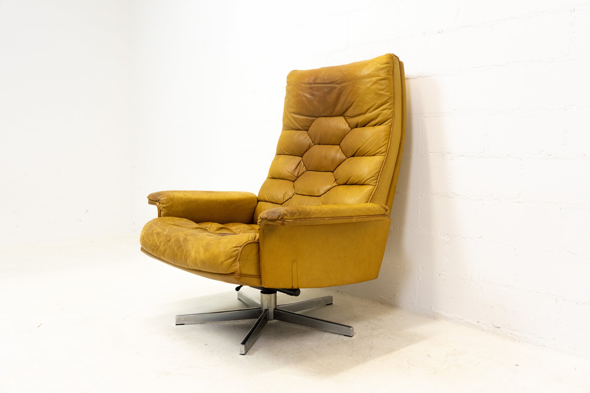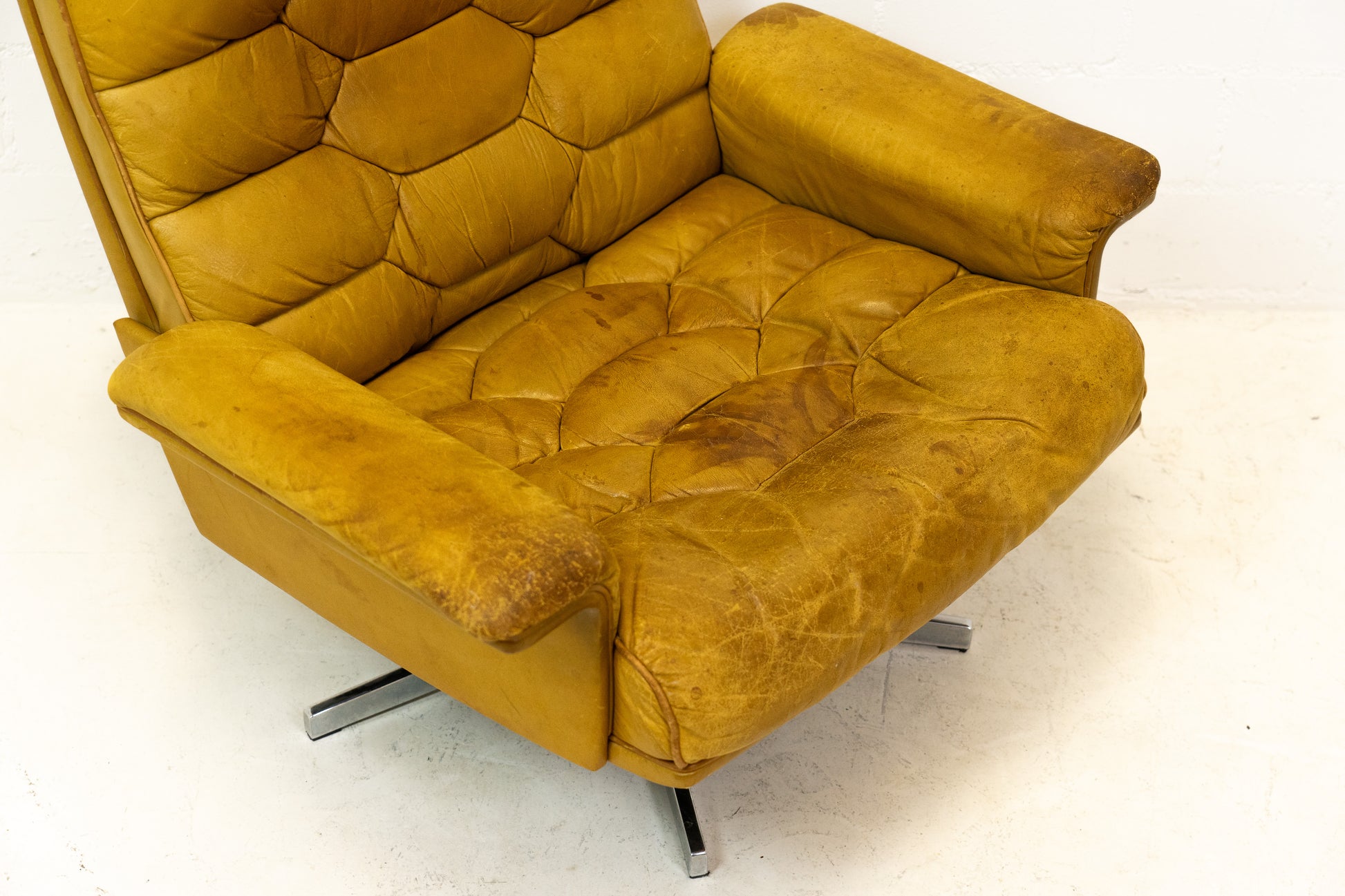 Der Bezug ist Leder, welches dem Alter entsprechend erhalten ist. Es hat Gebrauchsspuren in Form von Kratzern, Abschürfungen, brüchigen Stellen und Verfärbungen. Der Sitzkomfort ist nach wie vor super und die hochwertige Polsterung immer noch gut nach alle den Jahrzehnten. Dieses Modell wird nicht mehr bei De Sede produziert und ist entsprechend selten geworden. Es ist ein Entwurf von Robert Haussmann. De Sede Möbel werden von Hand in der Schweiz gefertigt. Ein echtes Qualitätsprodukt. Der Sessel ist drehbar und kippbar (Stärke einstellbar). Wir haben insgesamt aus der gleichen Serie noch einen weiteren Sessel, 2 Sessel mit kurzer Rückenlehne und einen Hocker.
