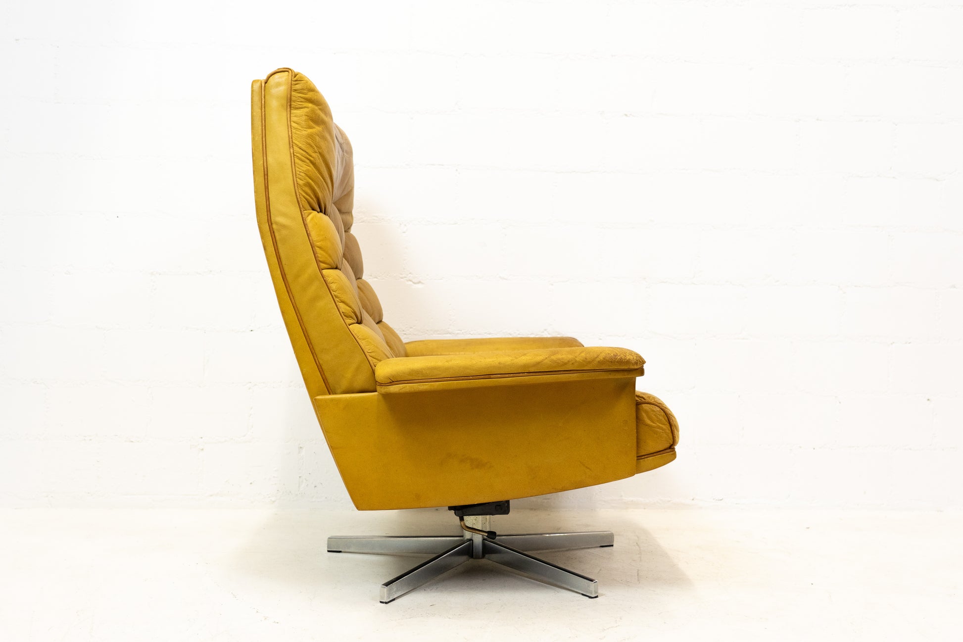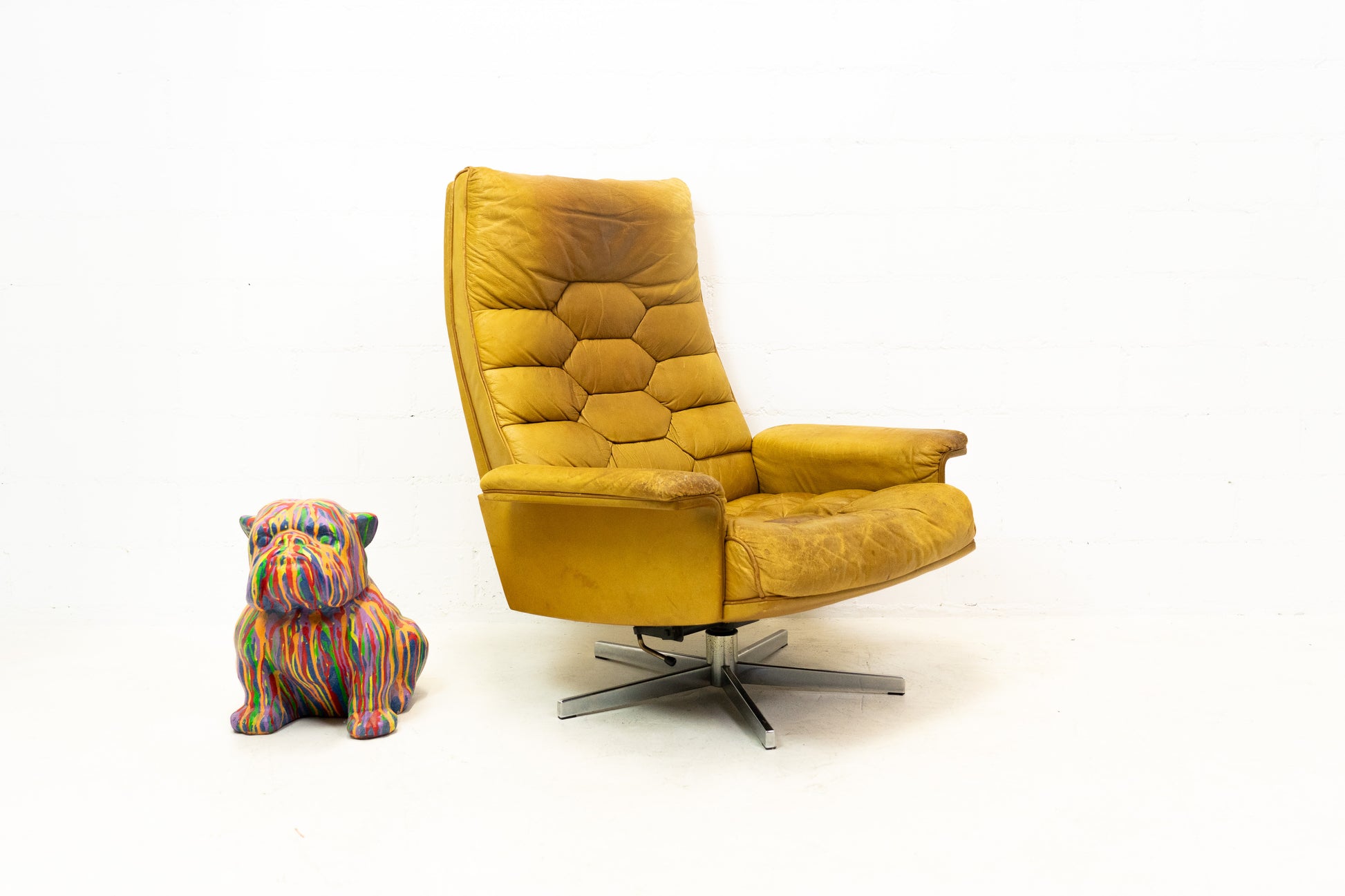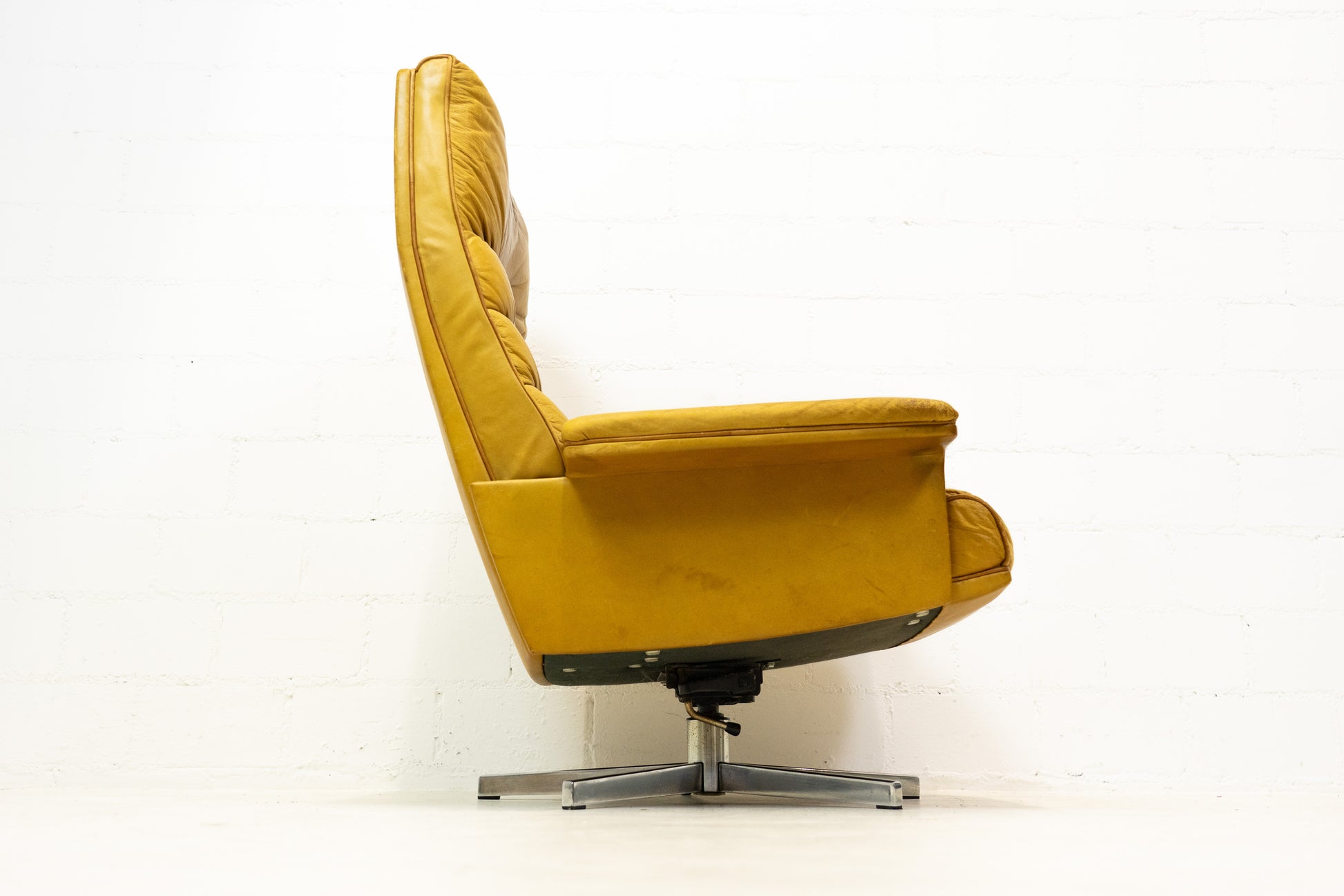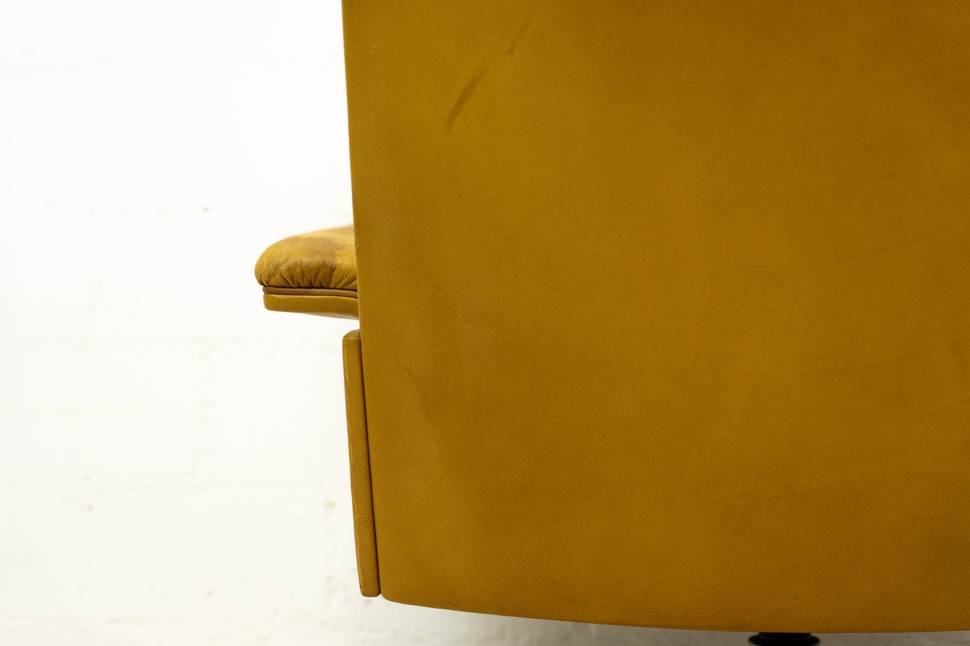 Der Bezug ist Leder, welches dem Alter entsprechend erhalten ist. Es hat Gebrauchsspuren in Form von Kratzern, Abschürfungen, brüchigen Stellen und Verfärbungen. Der Sitzkomfort ist nach wie vor super und die hochwertige Polsterung immer noch gut nach alle den Jahrzehnten. Dieses Modell wird nicht mehr bei De Sede produziert und ist entsprechend selten geworden. Es ist ein Entwurf von Robert Haussmann. De Sede Möbel werden von Hand in der Schweiz gefertigt. Ein echtes Qualitätsprodukt. Der Sessel ist drehbar und kippbar (Stärke einstellbar). Wir haben insgesamt aus der gleichen Serie noch einen weiteren Sessel, 2 Sessel mit kurzer Rückenlehne und einen Hocker.