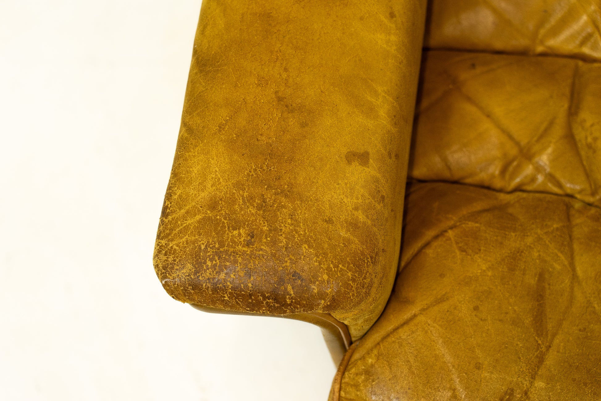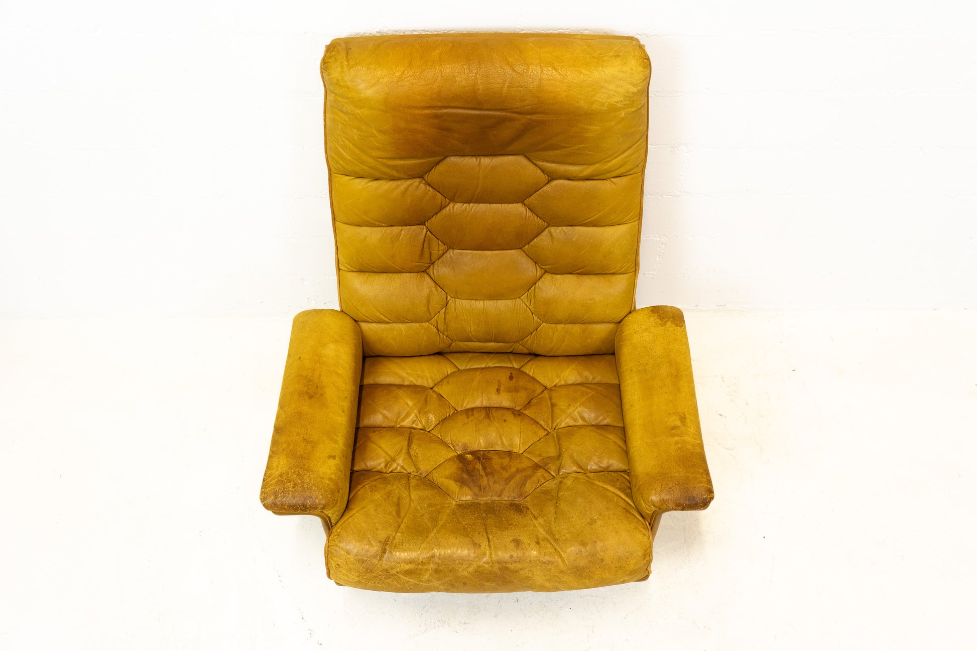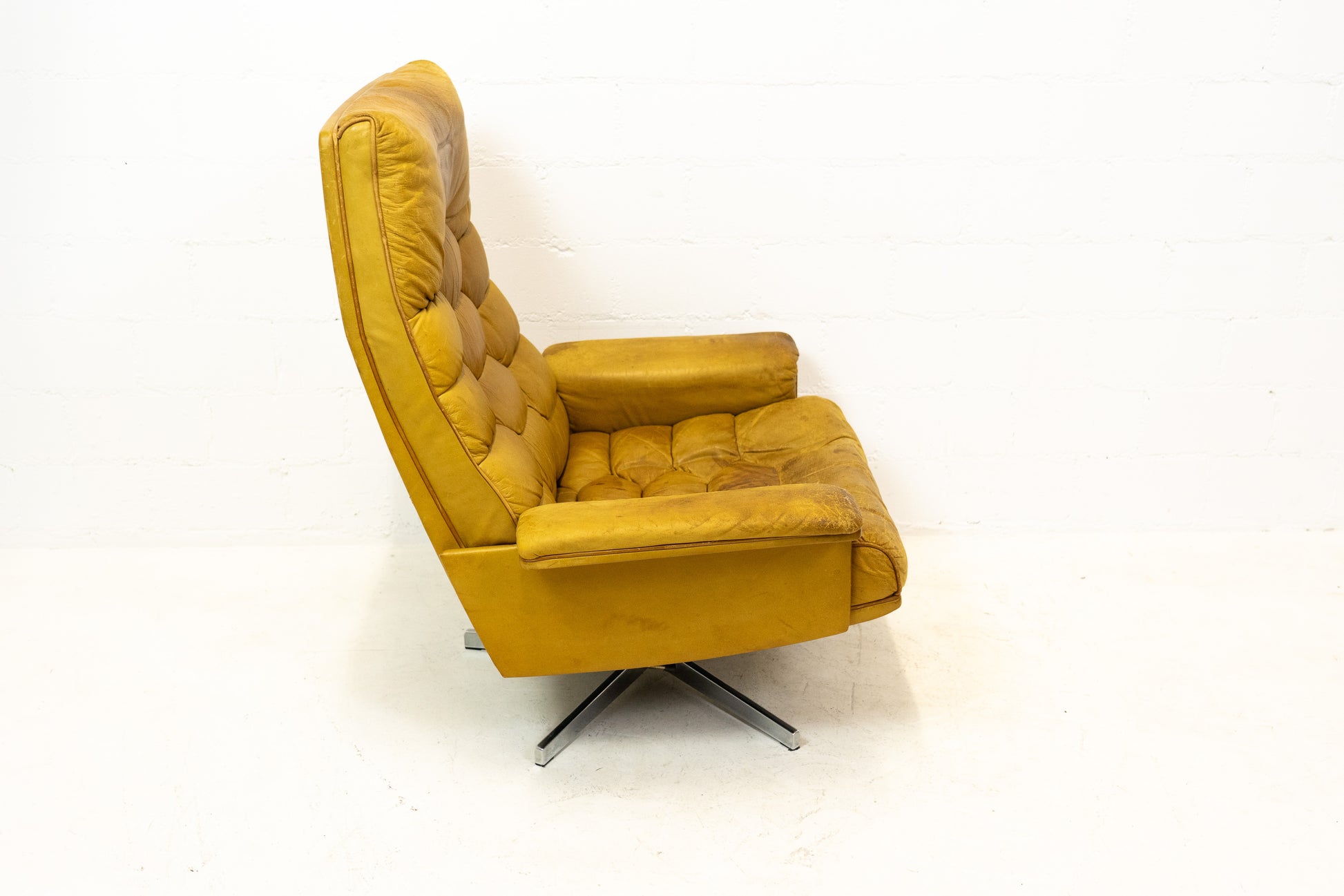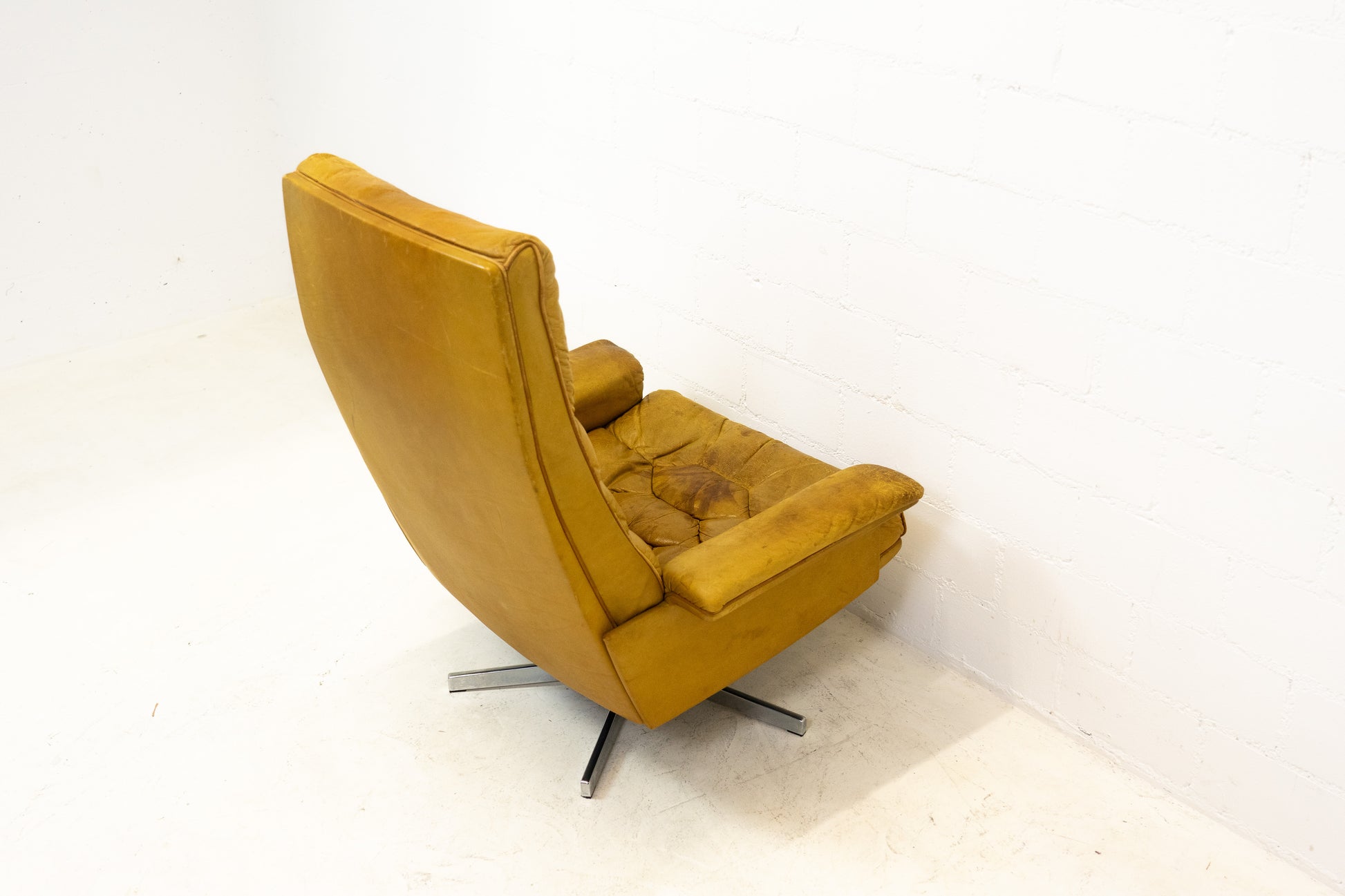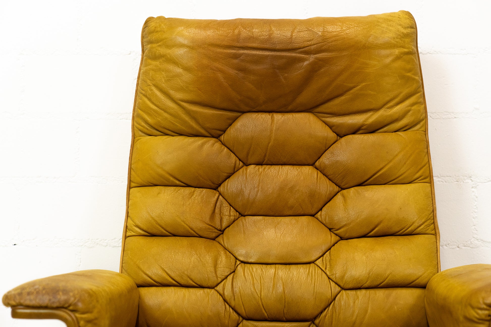 Der Bezug ist Leder, welches dem Alter entsprechend erhalten ist. Es hat Gebrauchsspuren in Form von Kratzern, Abschürfungen, brüchigen Stellen und Verfärbungen. Der Sitzkomfort ist nach wie vor super und die hochwertige Polsterung immer noch gut nach alle den Jahrzehnten. Dieses Modell wird nicht mehr bei De Sede produziert und ist entsprechend selten geworden. Es ist ein Entwurf von Robert Haussmann. De Sede Möbel werden von Hand in der Schweiz gefertigt. Ein echtes Qualitätsprodukt. Der Sessel ist drehbar und kippbar (Stärke einstellbar). Wir haben insgesamt aus der gleichen Serie noch einen weiteren Sessel, 2 Sessel mit kurzer Rückenlehne und einen Hocker.