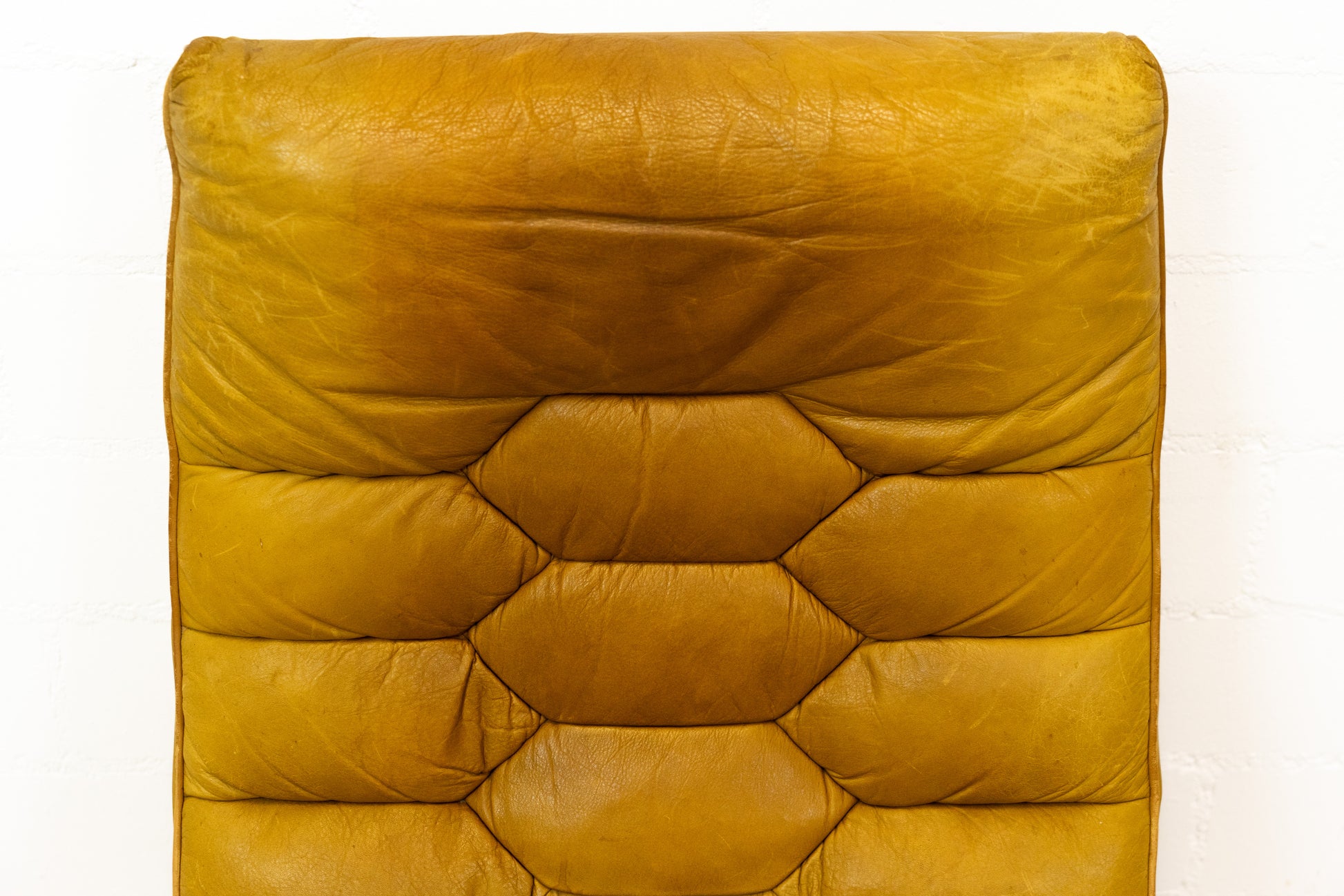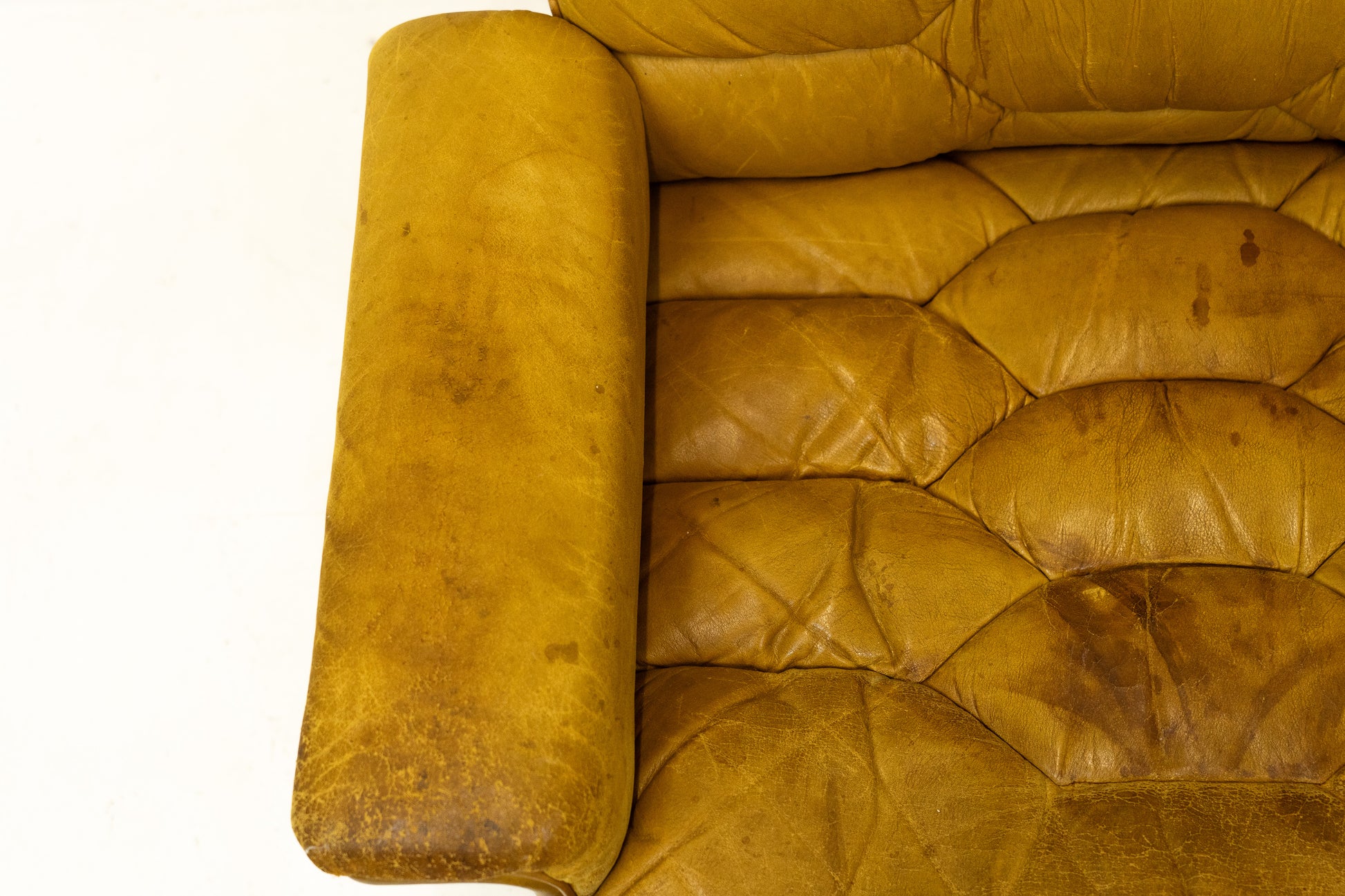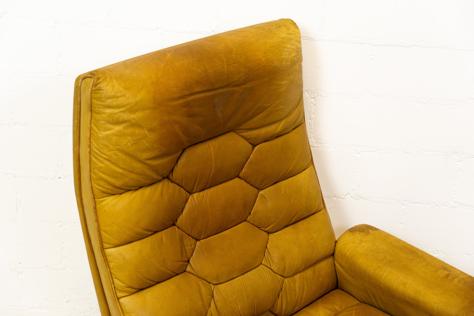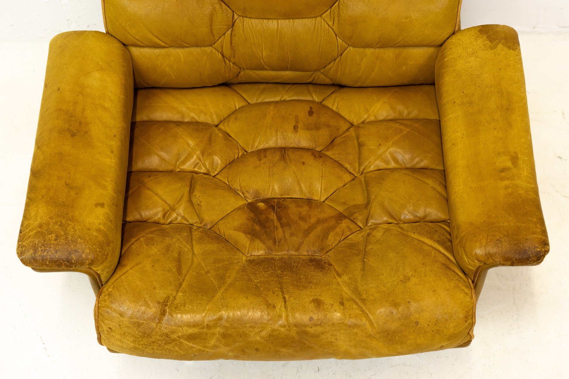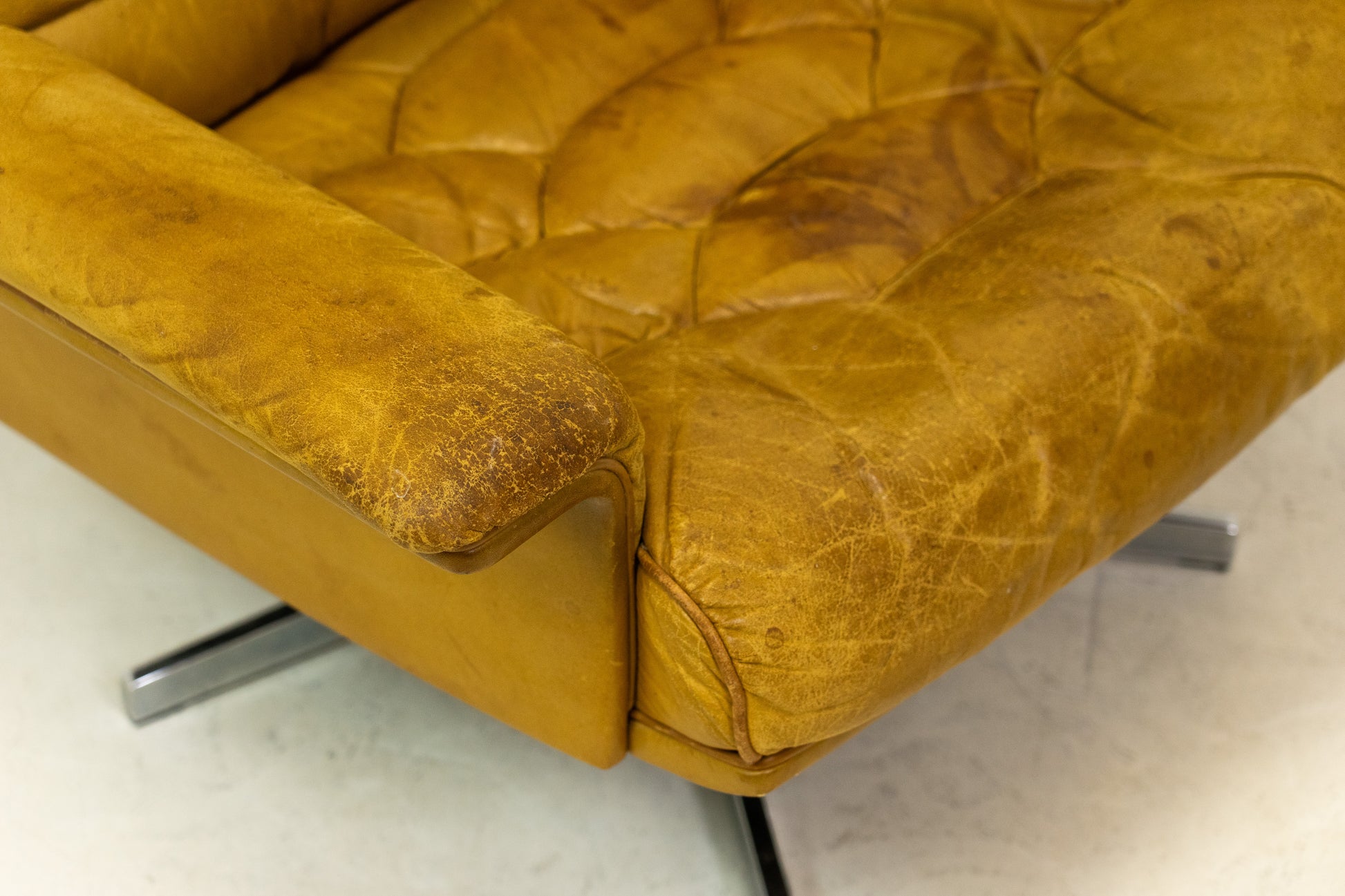 Der Bezug ist Leder, welches dem Alter entsprechend erhalten ist. Es hat Gebrauchsspuren in Form von Kratzern, Abschürfungen, brüchigen Stellen und Verfärbungen. Der Sitzkomfort ist nach wie vor super und die hochwertige Polsterung immer noch gut nach alle den Jahrzehnten. Dieses Modell wird nicht mehr bei De Sede produziert und ist entsprechend selten geworden. Es ist ein Entwurf von Robert Haussmann. De Sede Möbel werden von Hand in der Schweiz gefertigt. Ein echtes Qualitätsprodukt. Der Sessel ist drehbar und kippbar (Stärke einstellbar). Wir haben insgesamt aus der gleichen Serie noch einen weiteren Sessel, 2 Sessel mit kurzer Rückenlehne und einen Hocker.
