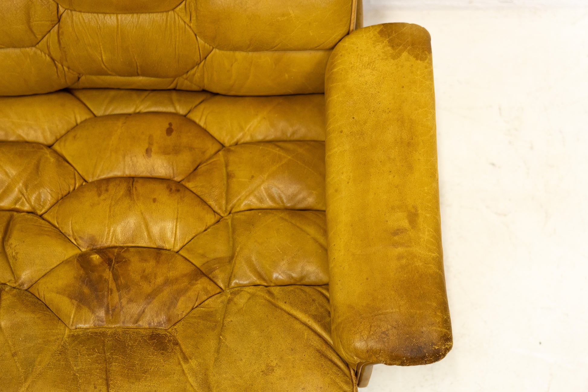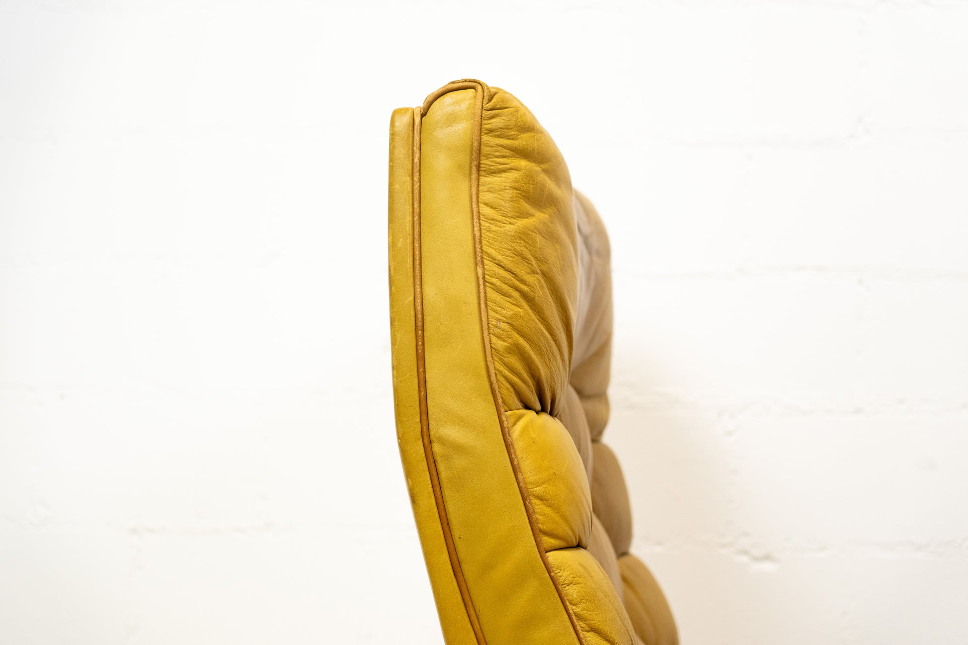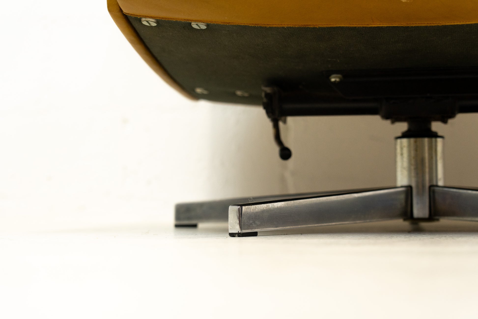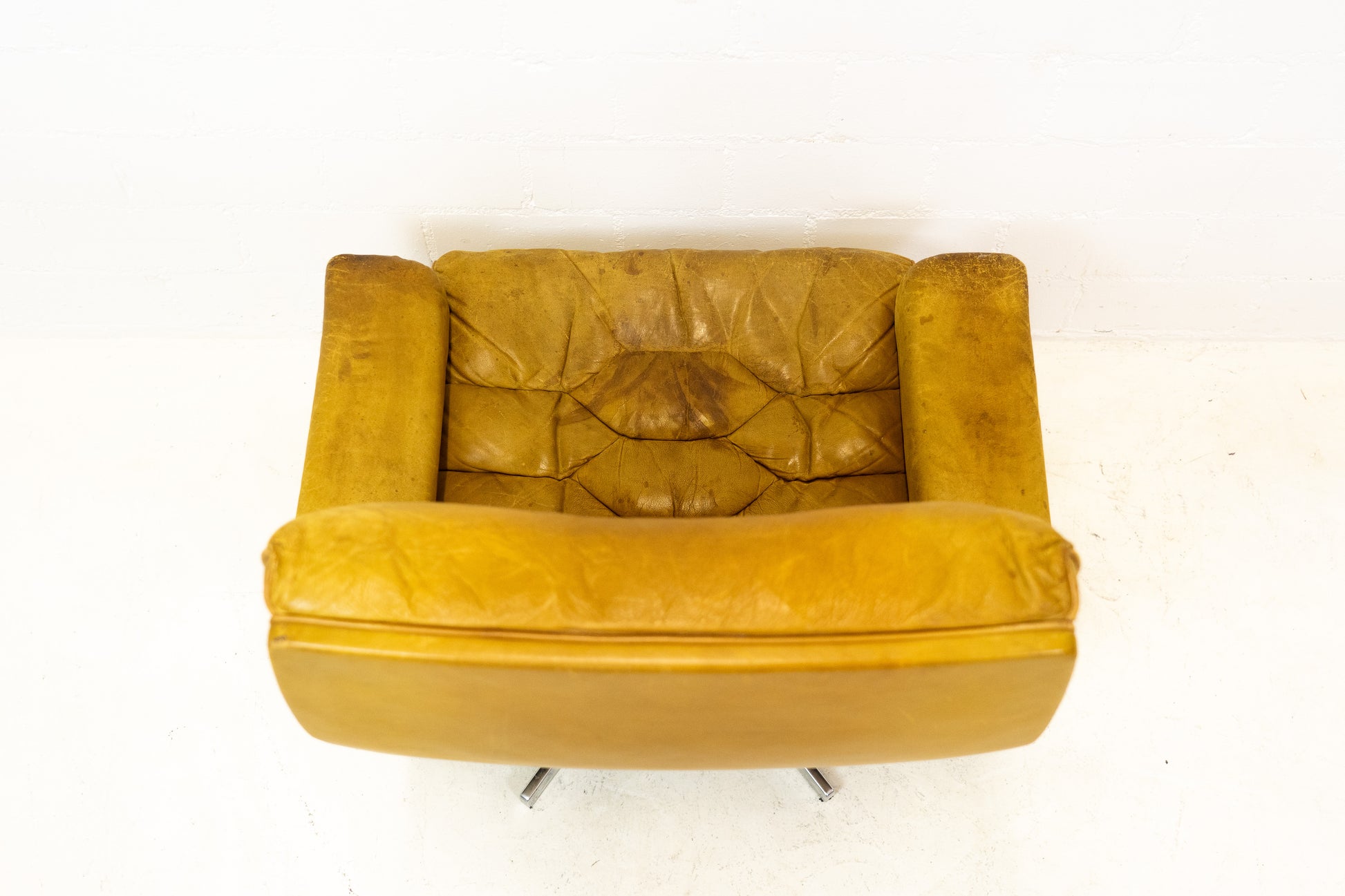 Der Bezug ist Leder, welches dem Alter entsprechend erhalten ist. Es hat Gebrauchsspuren in Form von Kratzern, Abschürfungen, brüchigen Stellen und Verfärbungen. Der Sitzkomfort ist nach wie vor super und die hochwertige Polsterung immer noch gut nach alle den Jahrzehnten. Dieses Modell wird nicht mehr bei De Sede produziert und ist entsprechend selten geworden. Es ist ein Entwurf von Robert Haussmann. De Sede Möbel werden von Hand in der Schweiz gefertigt. Ein echtes Qualitätsprodukt. Der Sessel ist drehbar und kippbar (Stärke einstellbar). Wir haben insgesamt aus der gleichen Serie noch einen weiteren Sessel, 2 Sessel mit kurzer Rückenlehne und einen Hocker.