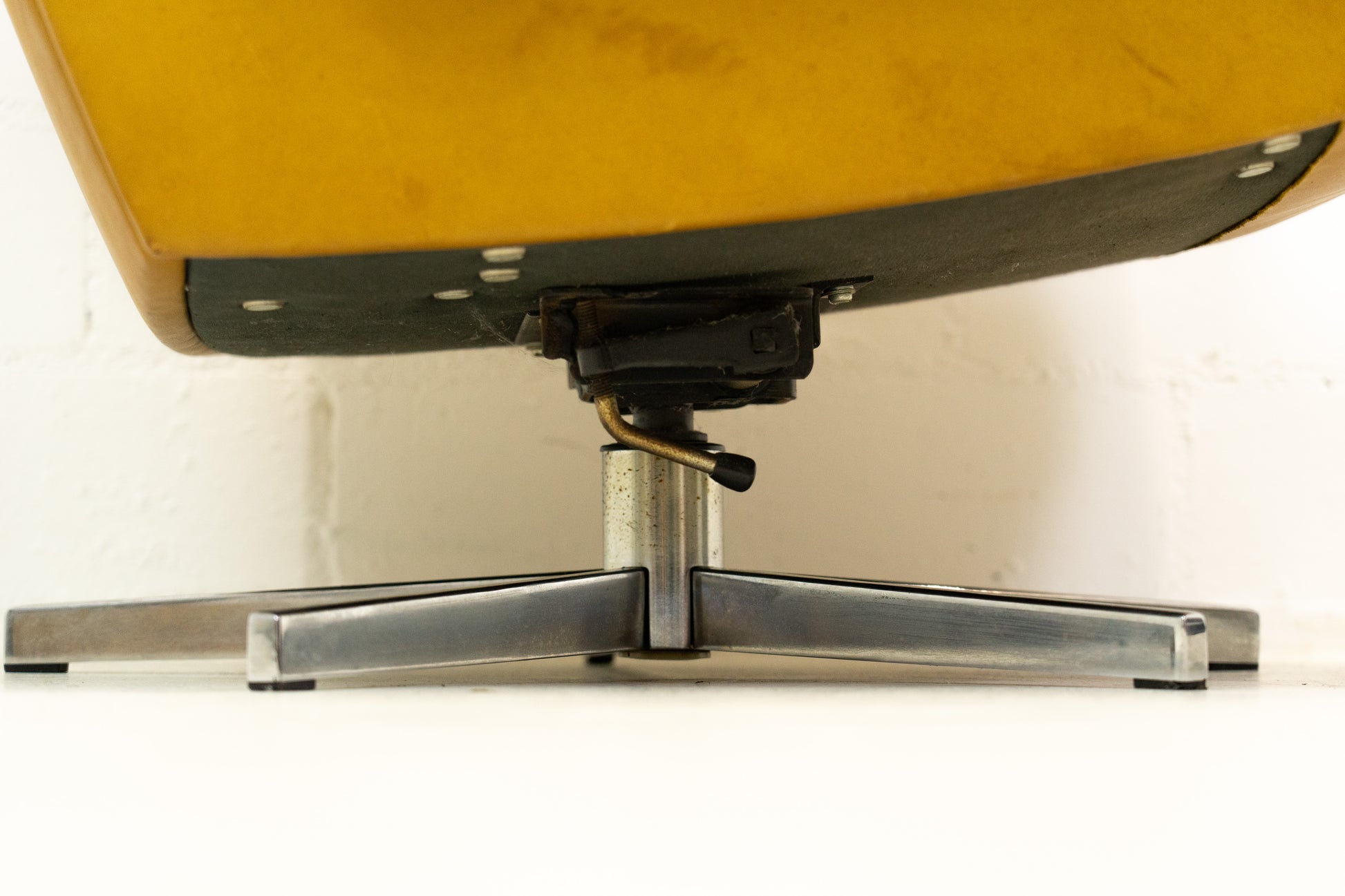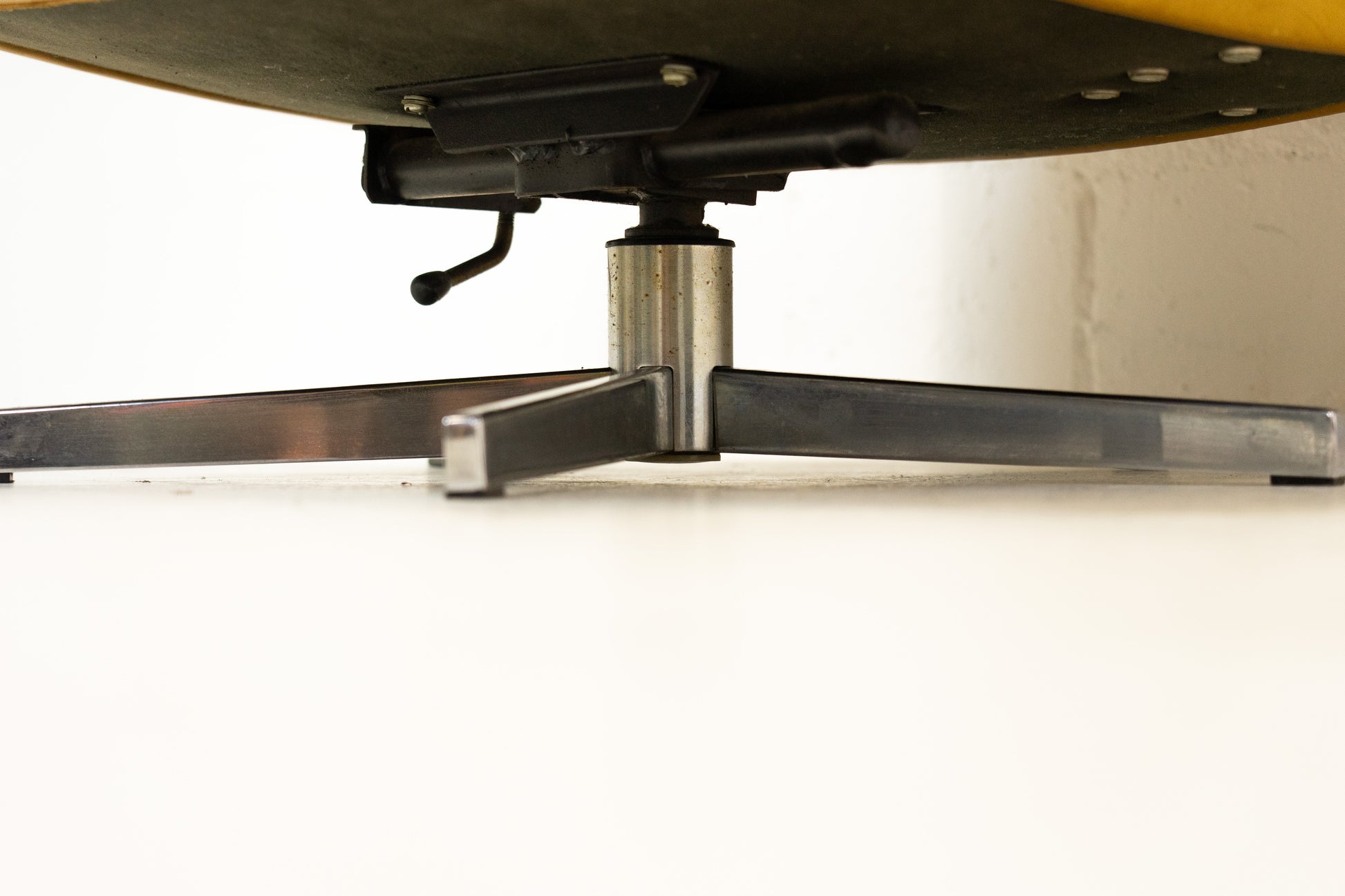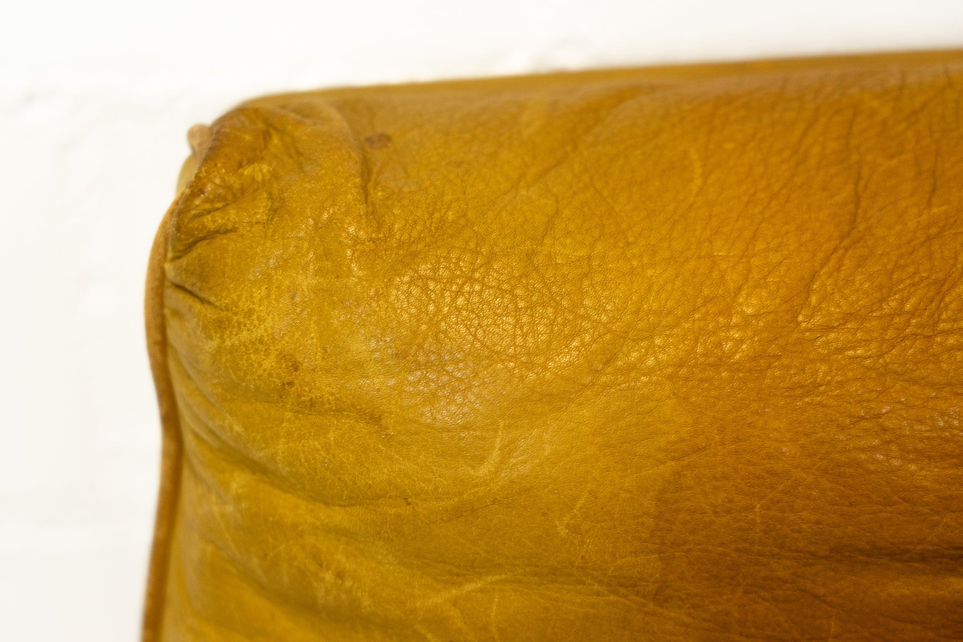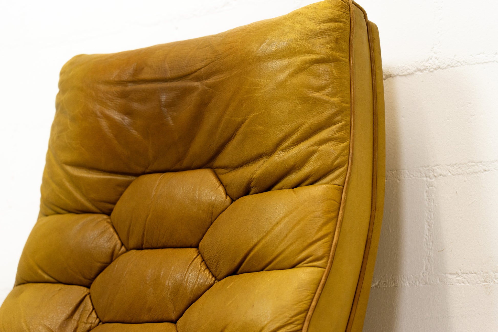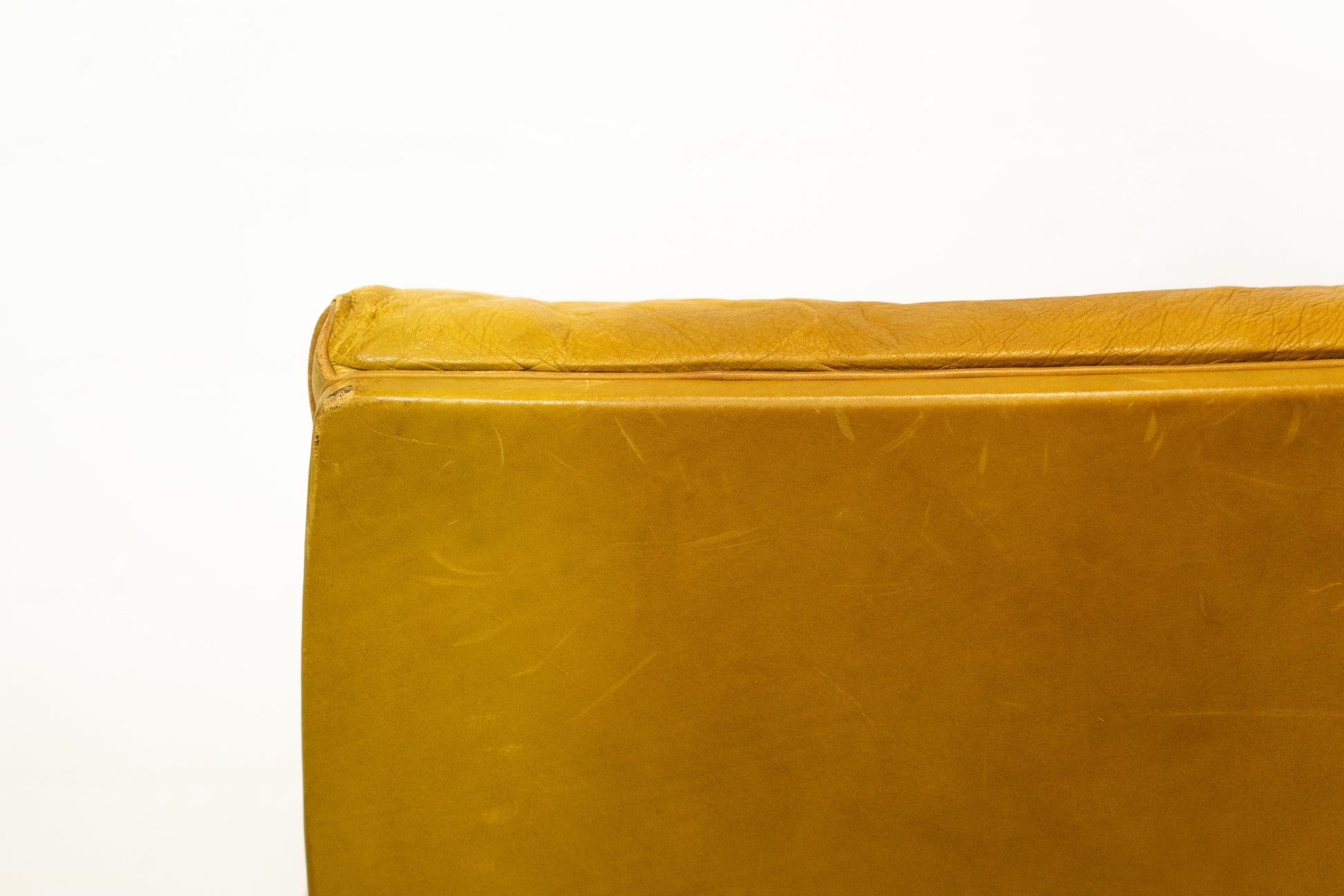 Der Bezug ist Leder, welches dem Alter entsprechend erhalten ist. Es hat Gebrauchsspuren in Form von Kratzern, Abschürfungen, brüchigen Stellen und Verfärbungen. Der Sitzkomfort ist nach wie vor super und die hochwertige Polsterung immer noch gut nach alle den Jahrzehnten. Dieses Modell wird nicht mehr bei De Sede produziert und ist entsprechend selten geworden. Es ist ein Entwurf von Robert Haussmann. De Sede Möbel werden von Hand in der Schweiz gefertigt. Ein echtes Qualitätsprodukt. Der Sessel ist drehbar und kippbar (Stärke einstellbar). Wir haben insgesamt aus der gleichen Serie noch einen weiteren Sessel, 2 Sessel mit kurzer Rückenlehne und einen Hocker.