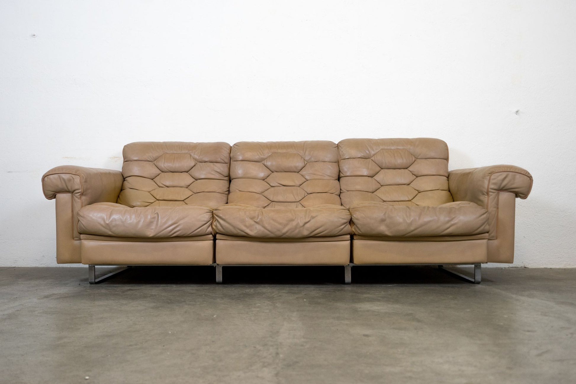 Das Sofa ist dem Alter entsprechend gut erhalten. Es hat über die Zeit Gebrauchsspuren in Form von Kratzern, Abschürfungen, leichten Verfärbungen und leichten Farbänderungen durch den Lichteinfall bekommen. Wir haben davon ein Detailfoto gemacht. Der Sitzkomfort ist nach wie vor super. Für das Alter von ca. 50 Jahren ist das Sofa noch schön erhalten. Das Design stammt von Robert Haussmann. De Sede Möbel werden von Hand in der Schweiz gefertigt. Ein echtes Qualitätsprodukt.
