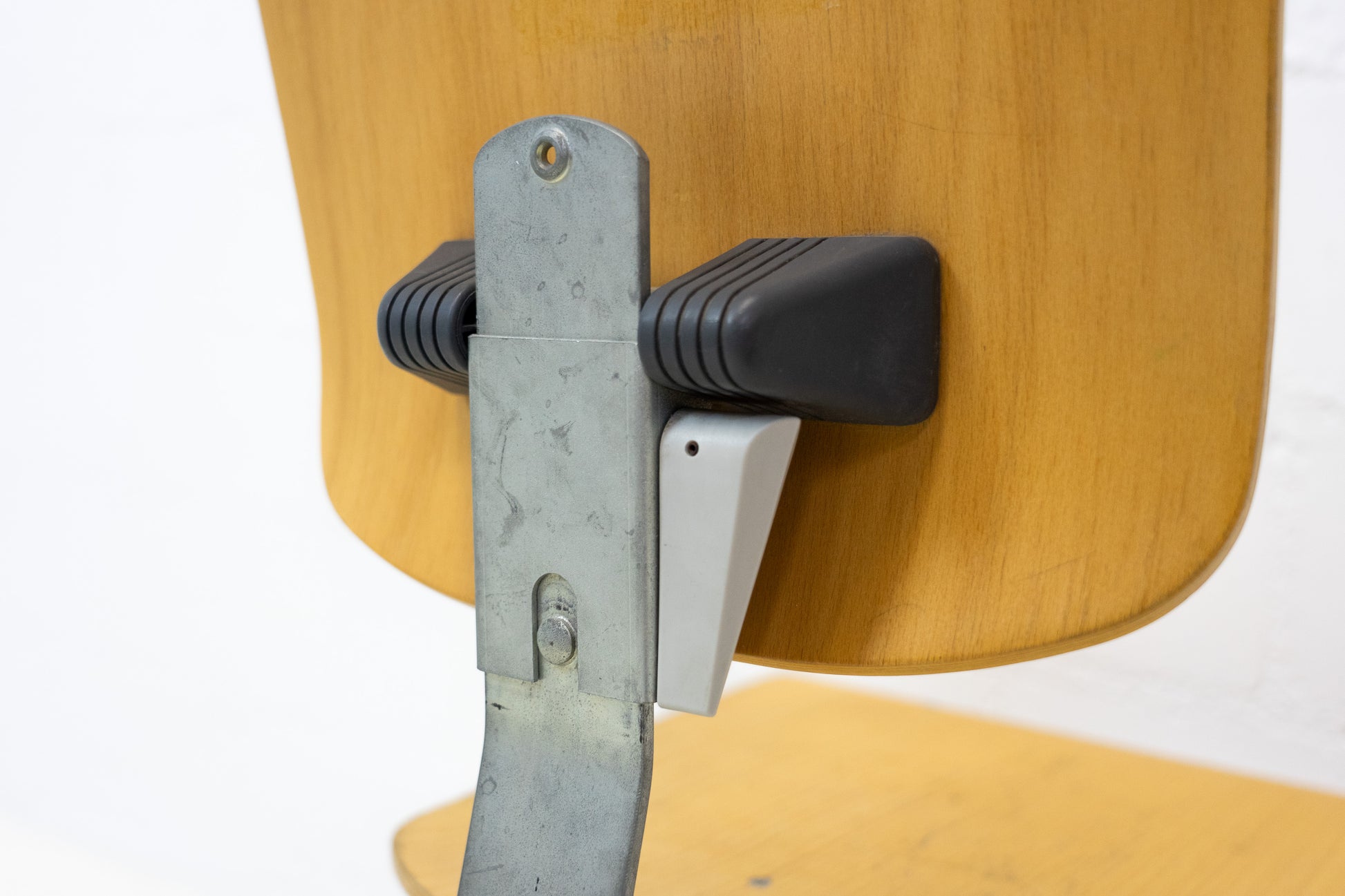 Die Stühle sind qualitativ sehr hochwertig gebaut mit einem massiven Gestell, das nicht drehbar ist. Die Höhe kann manuell verstellt werden über eine Schraube. Zudem kann die Rückenlehne angepasst werden. Es hat stellenweise deutliche Gebrauchsspuren in Form von Abschürfungen, Kratzern, Schäden im Holz und Verfärbungen. Wir haben davon Detailfotos gemacht. Der Sitzkomfort ist sehr gut. Wir haben insgesamt 30 dieser Stühle mit jeweils ähnlichem Zustand ab Lager verfügbar. Der Preis bezieht sich auf einen Stuhl.