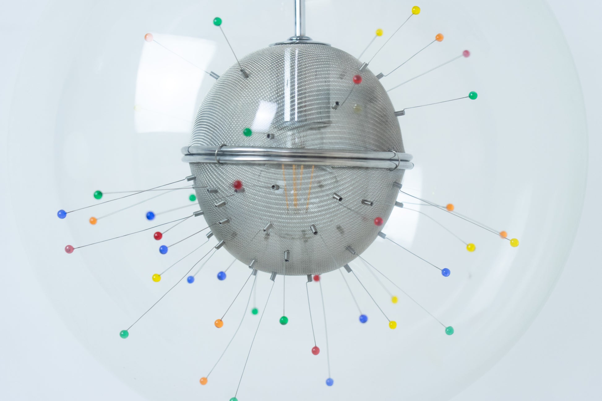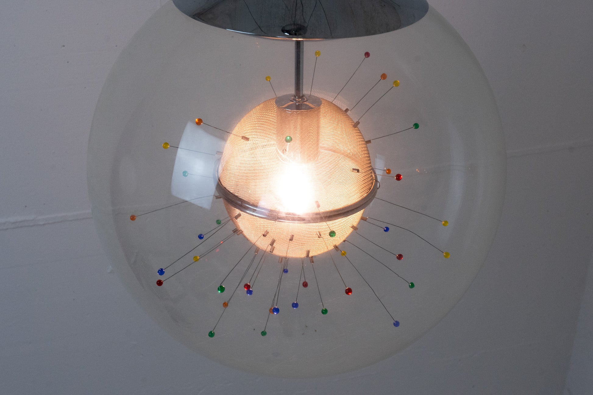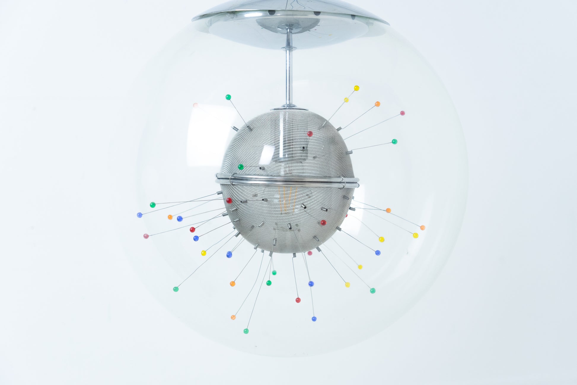 Die Lampe ist dem Alter entsprechend gut erhalten. Es hat leichte Gebrauchsspuren in Form von feinen Kratzern und Abschürfungen. Das Metall ist etwas patiniert. Das Leuchtmittel ist inklusive. Es ist eine Glaskugel rund um ein kunstvolles Gebilde. Die Länge der Leuchte kann über ein feines Drahtseil eingestellt werden.