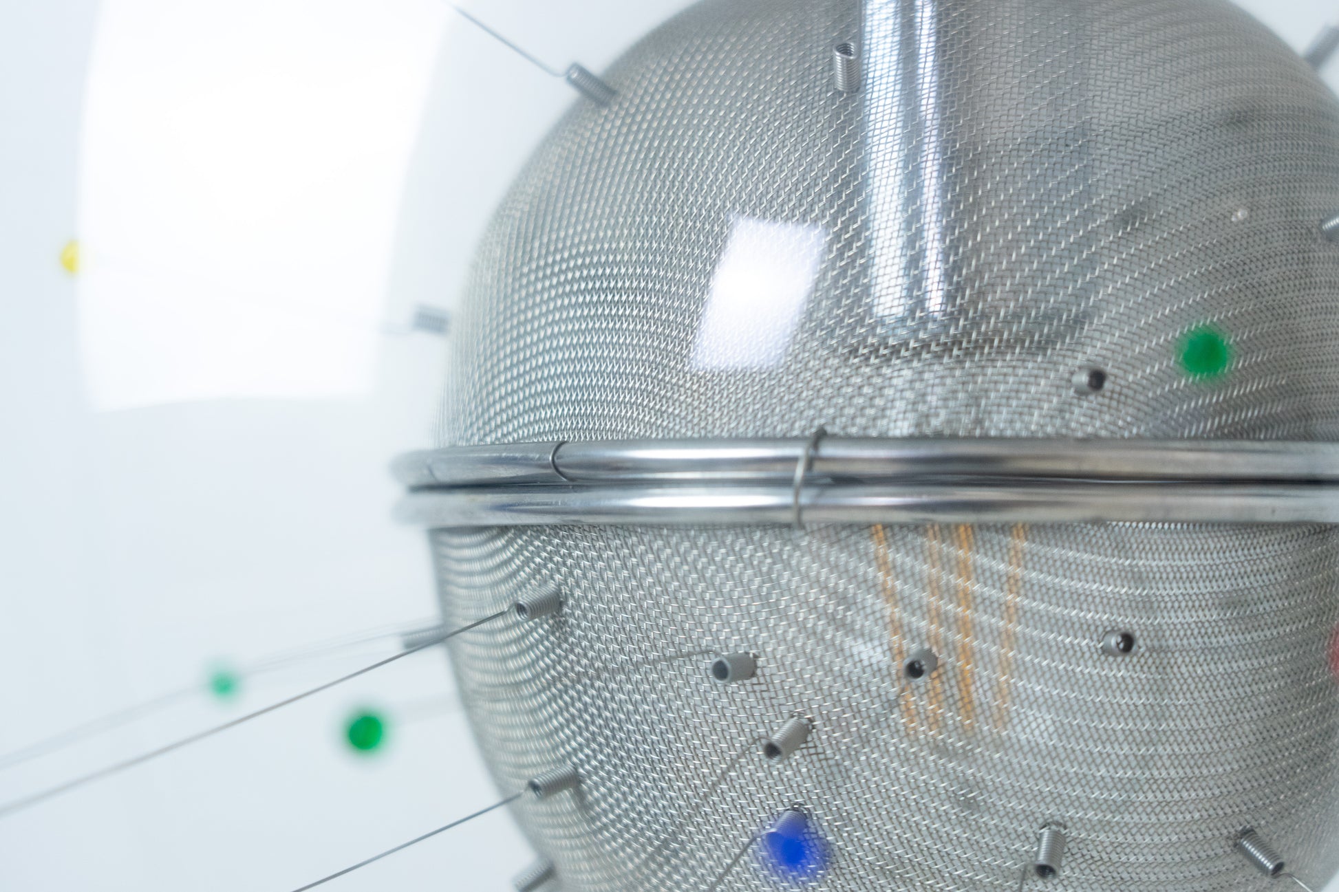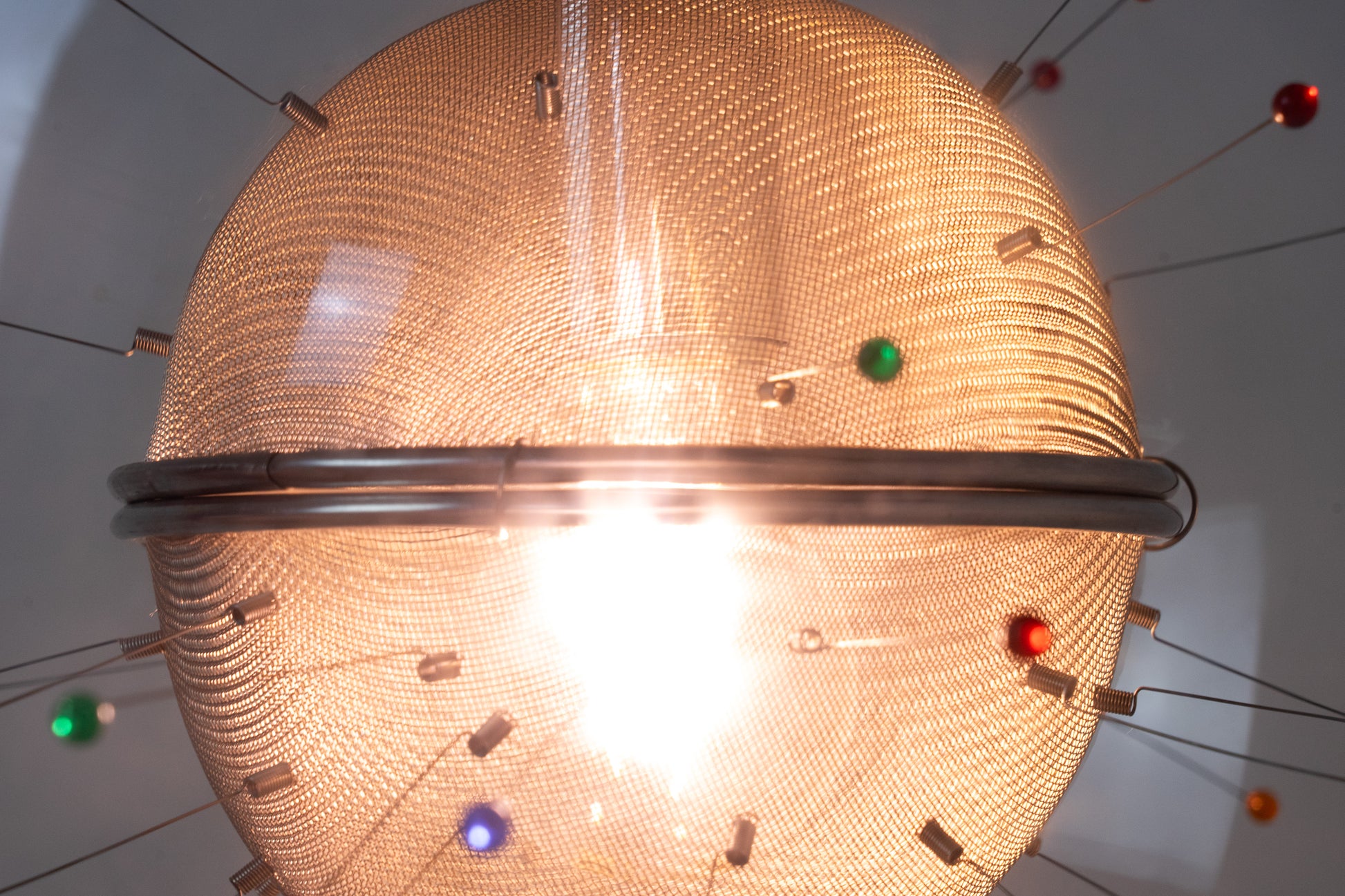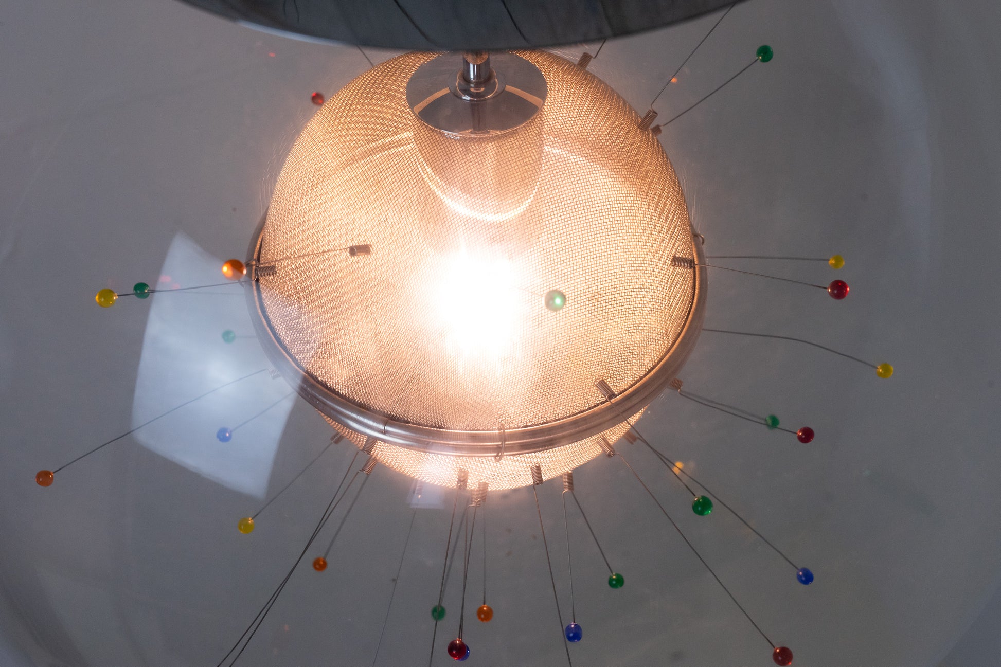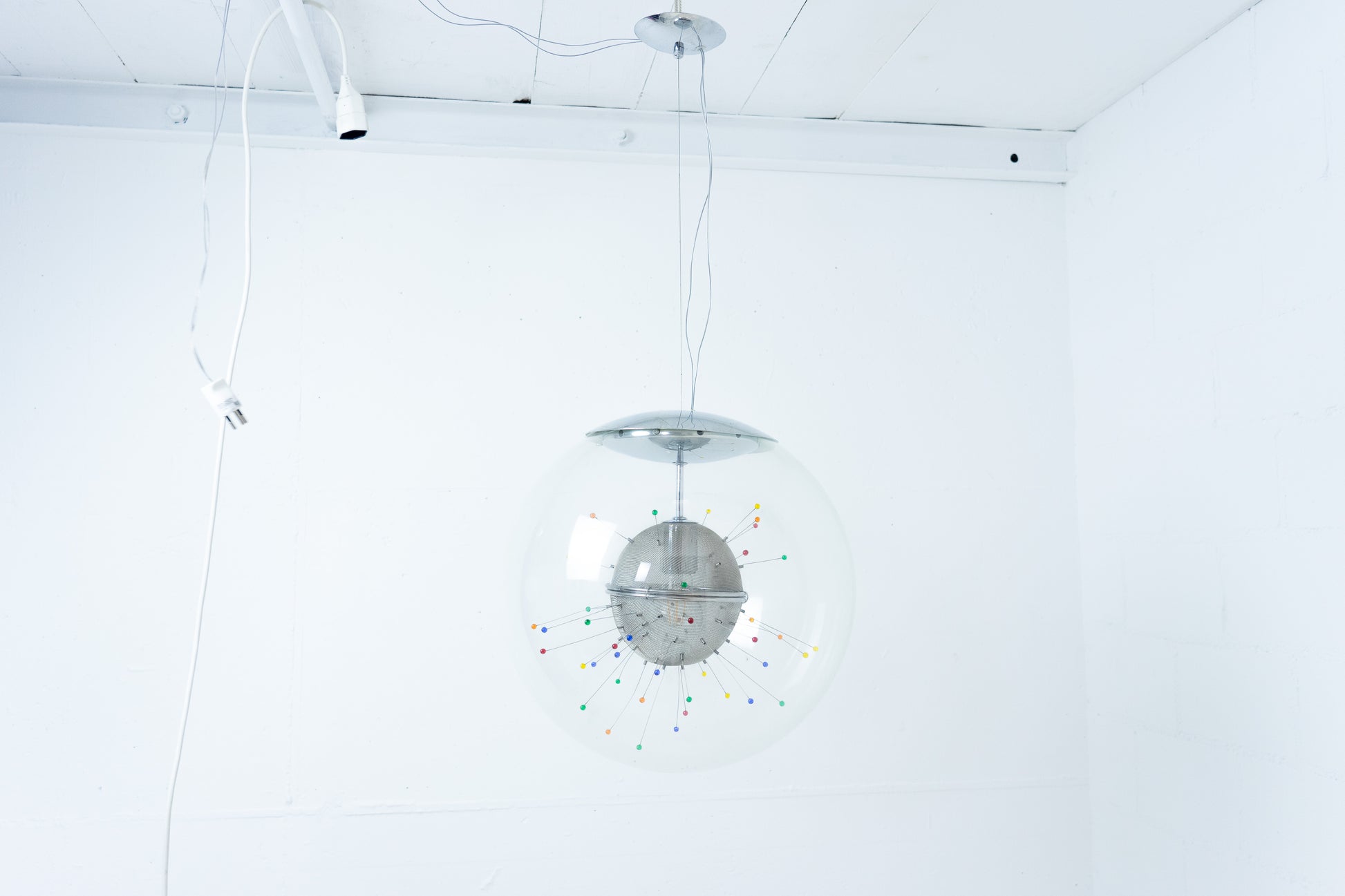 Die Lampe ist dem Alter entsprechend gut erhalten. Es hat leichte Gebrauchsspuren in Form von feinen Kratzern und Abschürfungen. Das Metall ist etwas patiniert. Das Leuchtmittel ist inklusive. Es ist eine Glaskugel rund um ein kunstvolles Gebilde. Die Länge der Leuchte kann über ein feines Drahtseil eingestellt werden.