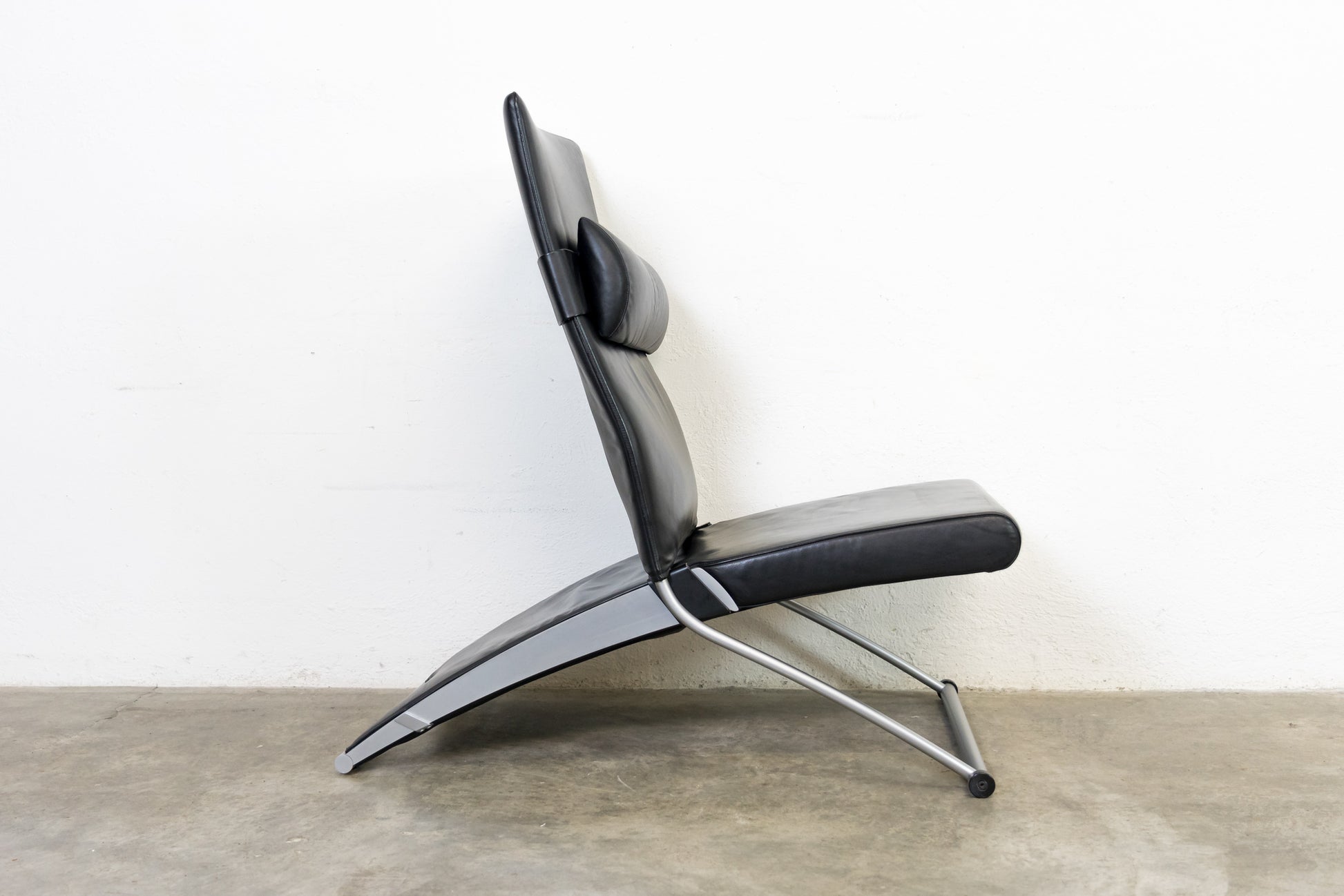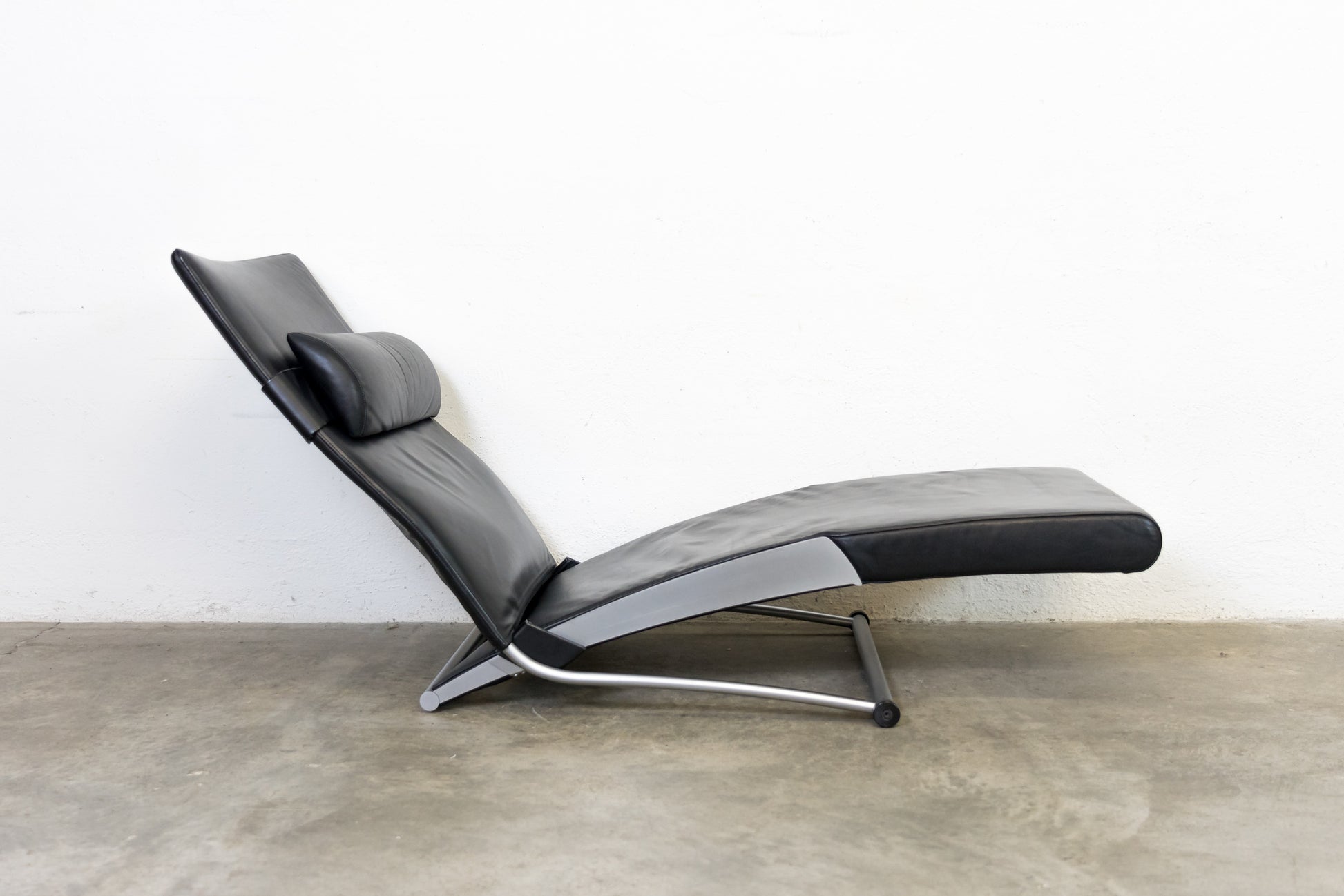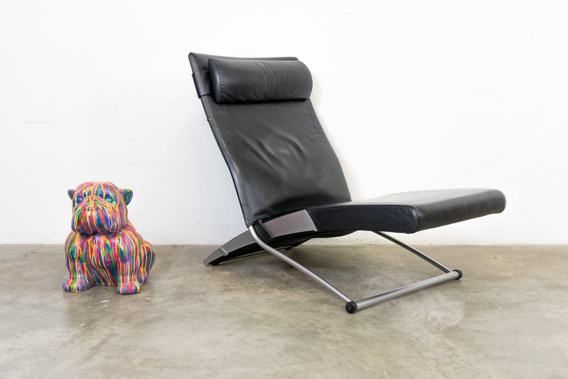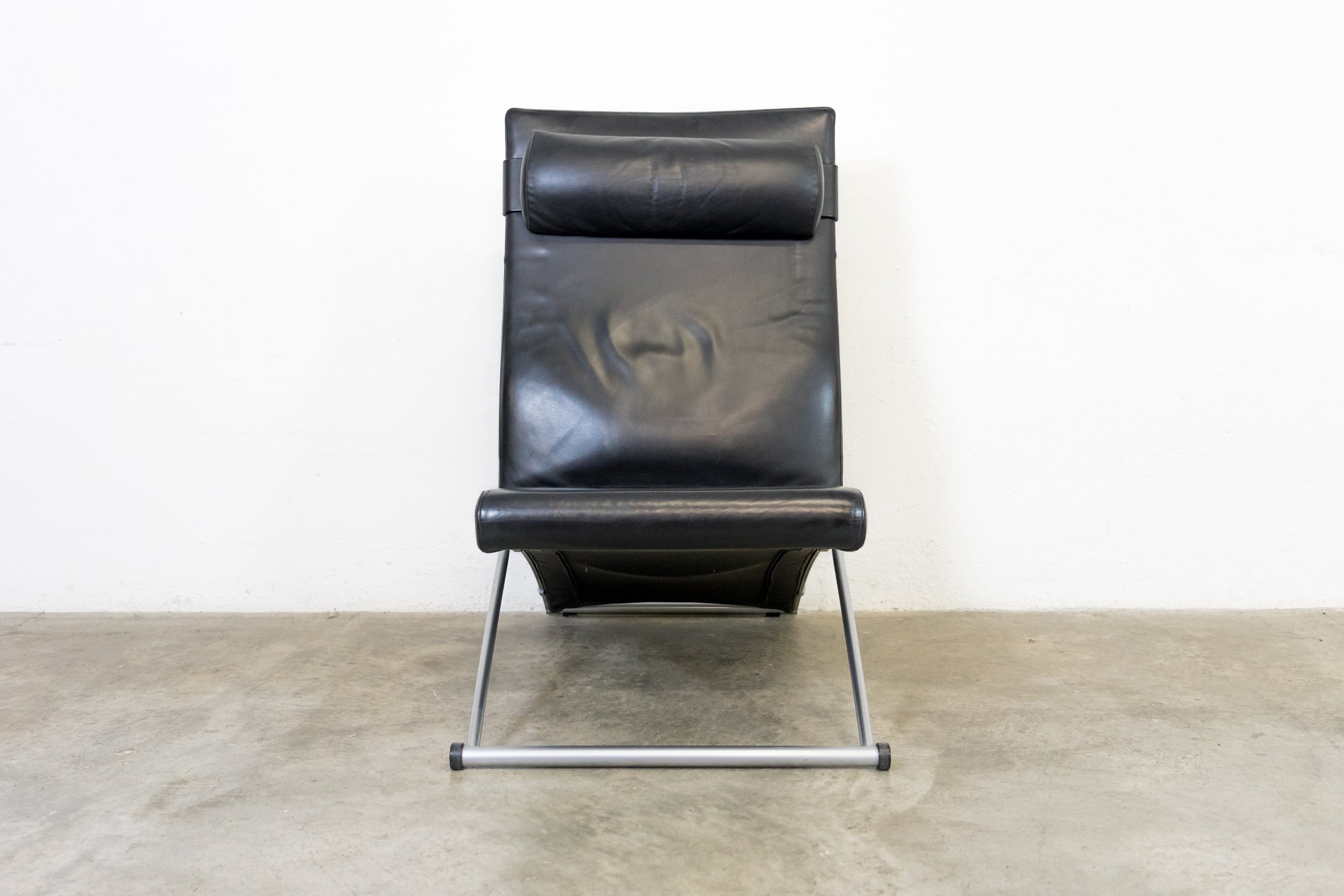 Der Bezug ist schwarzes Leder, das schön erhalten ist. Es hat leichte Gebrauchsspuren in Form Kratzern und Abschürfungen. Der Liegekomfort ist nach wie vor sehr gut. Man hat wahlweise eine Liege oder einen Sessel, da der X-Chair stufenlos verstellbar ist. Die Liege wurde von Joachim Nees 1999 für Interprofil entworfen. Der X-Chair wurde 2000 mit dem Red Dot Award und dem IF Design Award ausgezeichnet. Ein seltenes Stück Design-Geschichte.