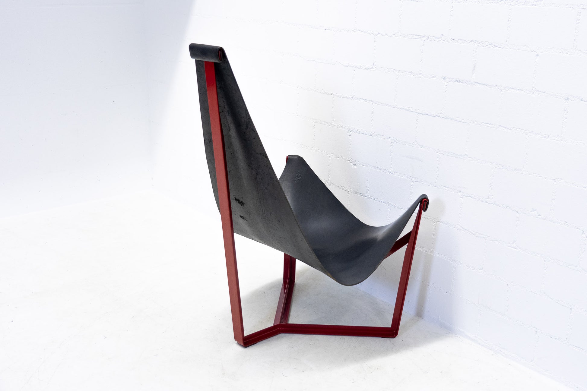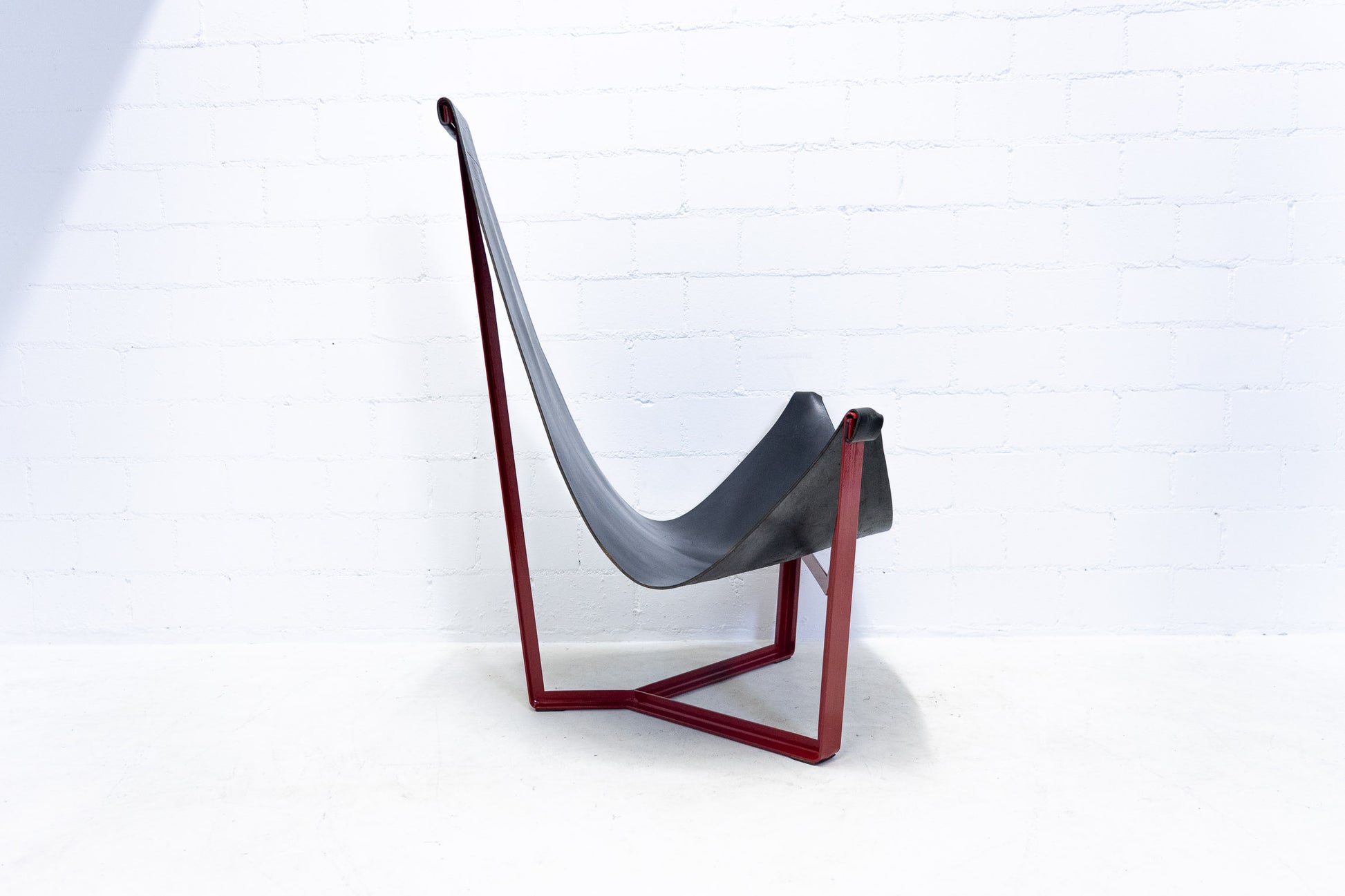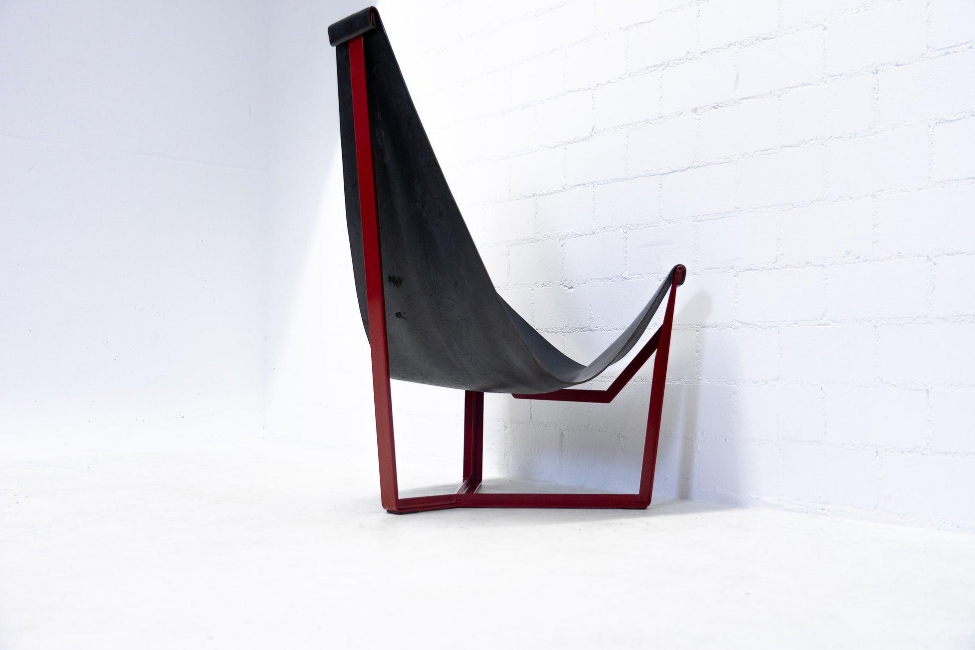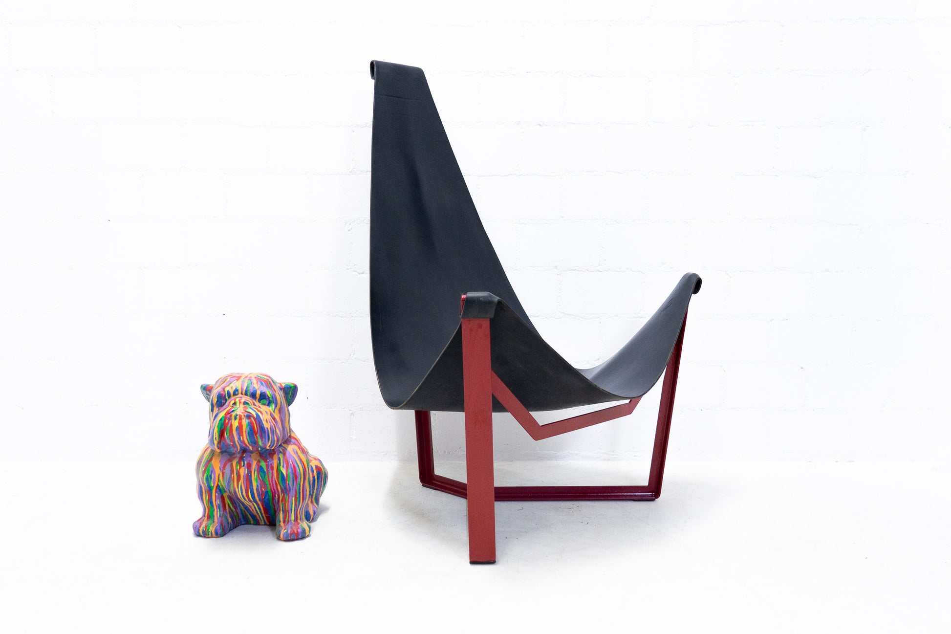 Der Sessel ist gut erhalten. Es hat leichte Gebrauchsspuren in Form von Abschürfungen und Kratzern. Der Sitzkomfort ist sehr gut. Das robuste Kernleder in schwarz ist auf einen roten Metallrahmen gespannt. Über den Hersteller oder Designer konnten wir leider nichts heraus finden.