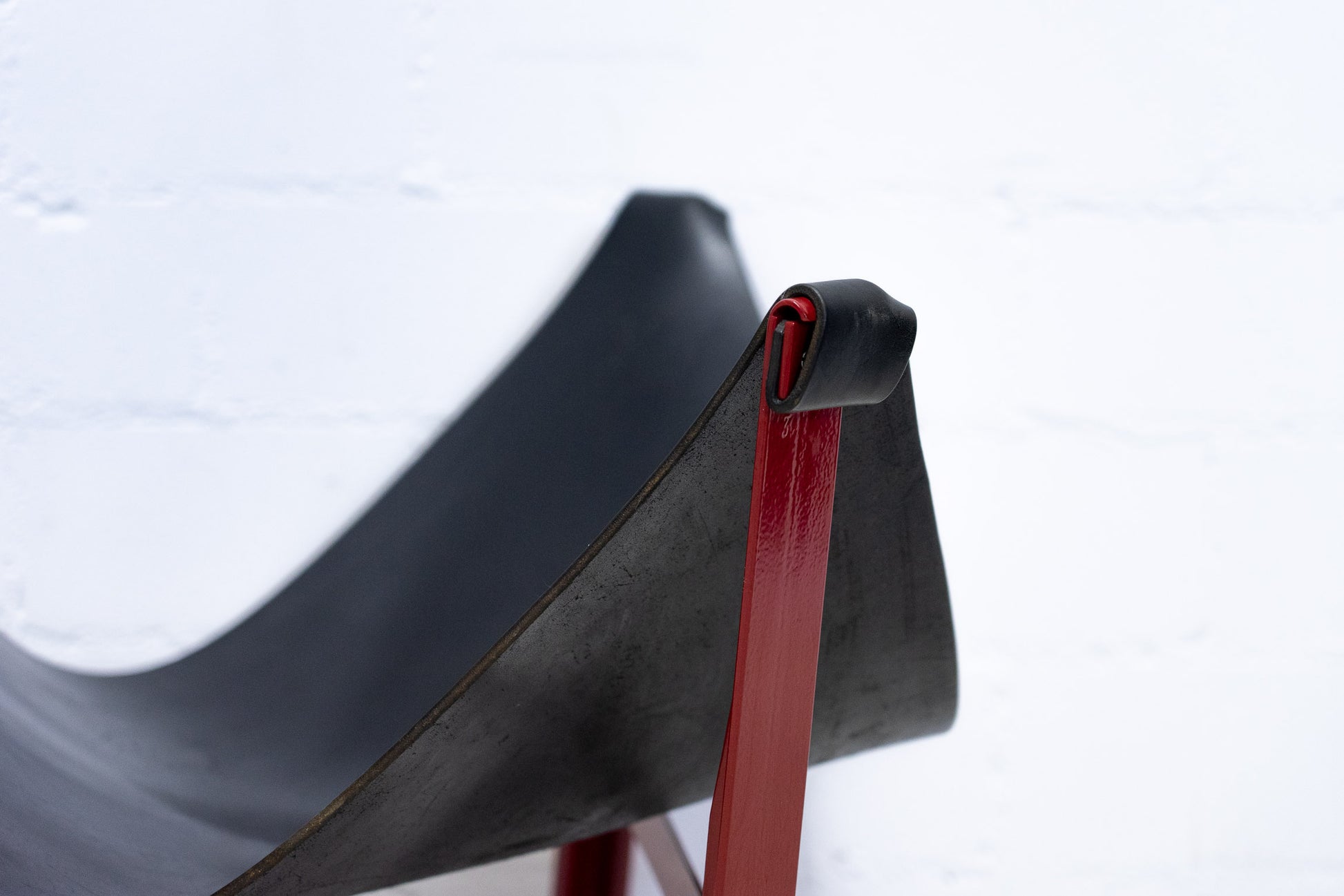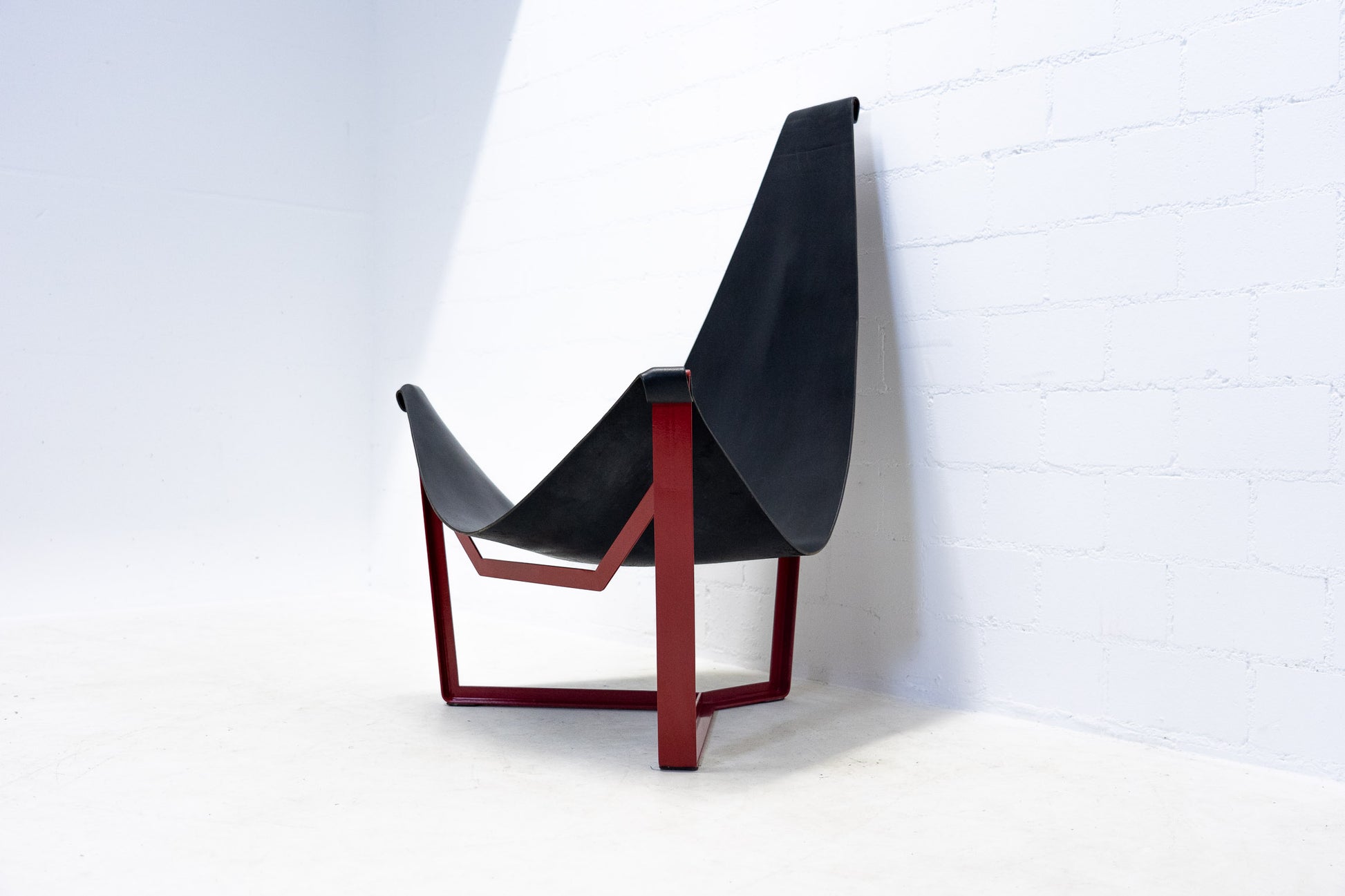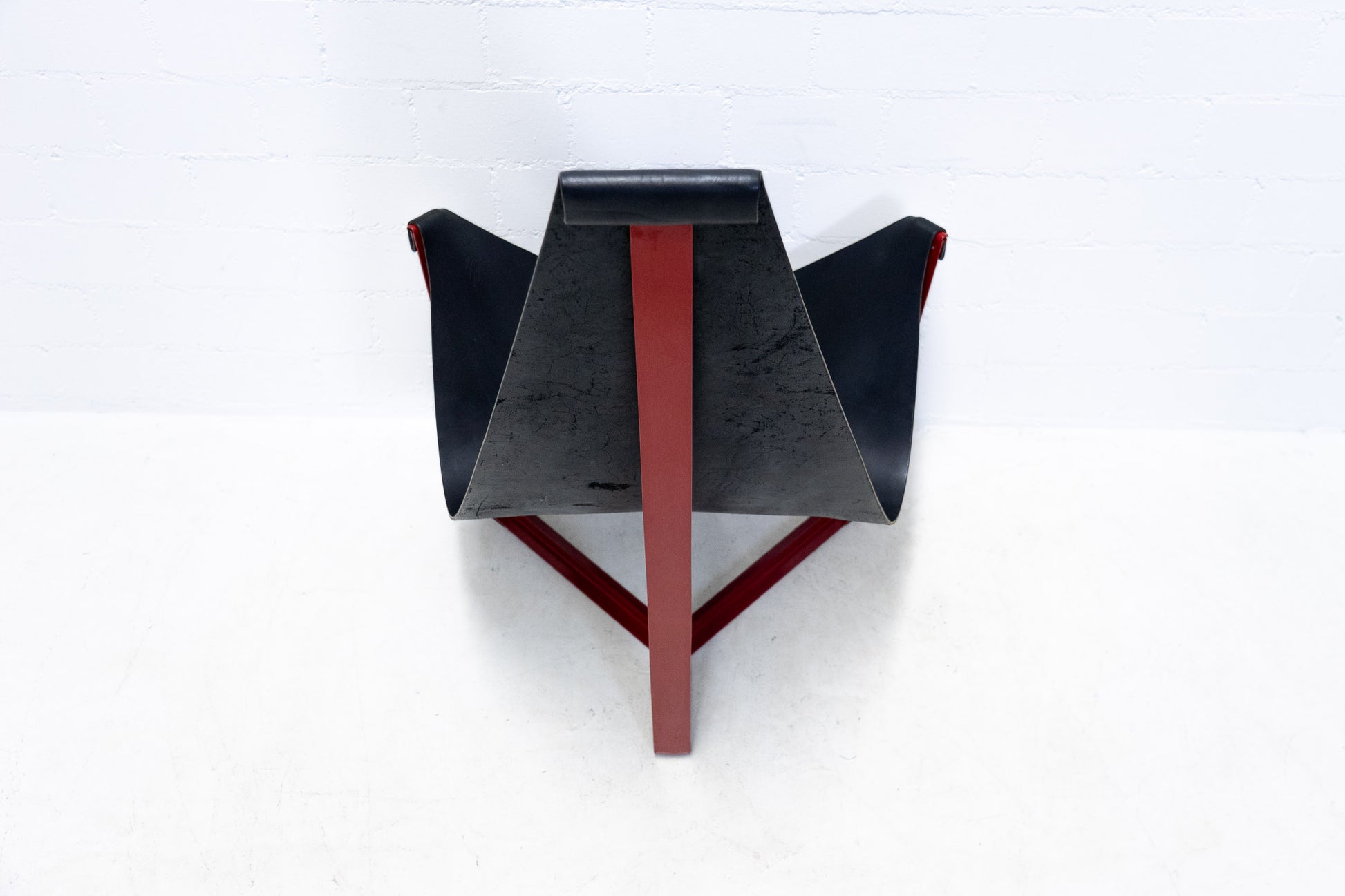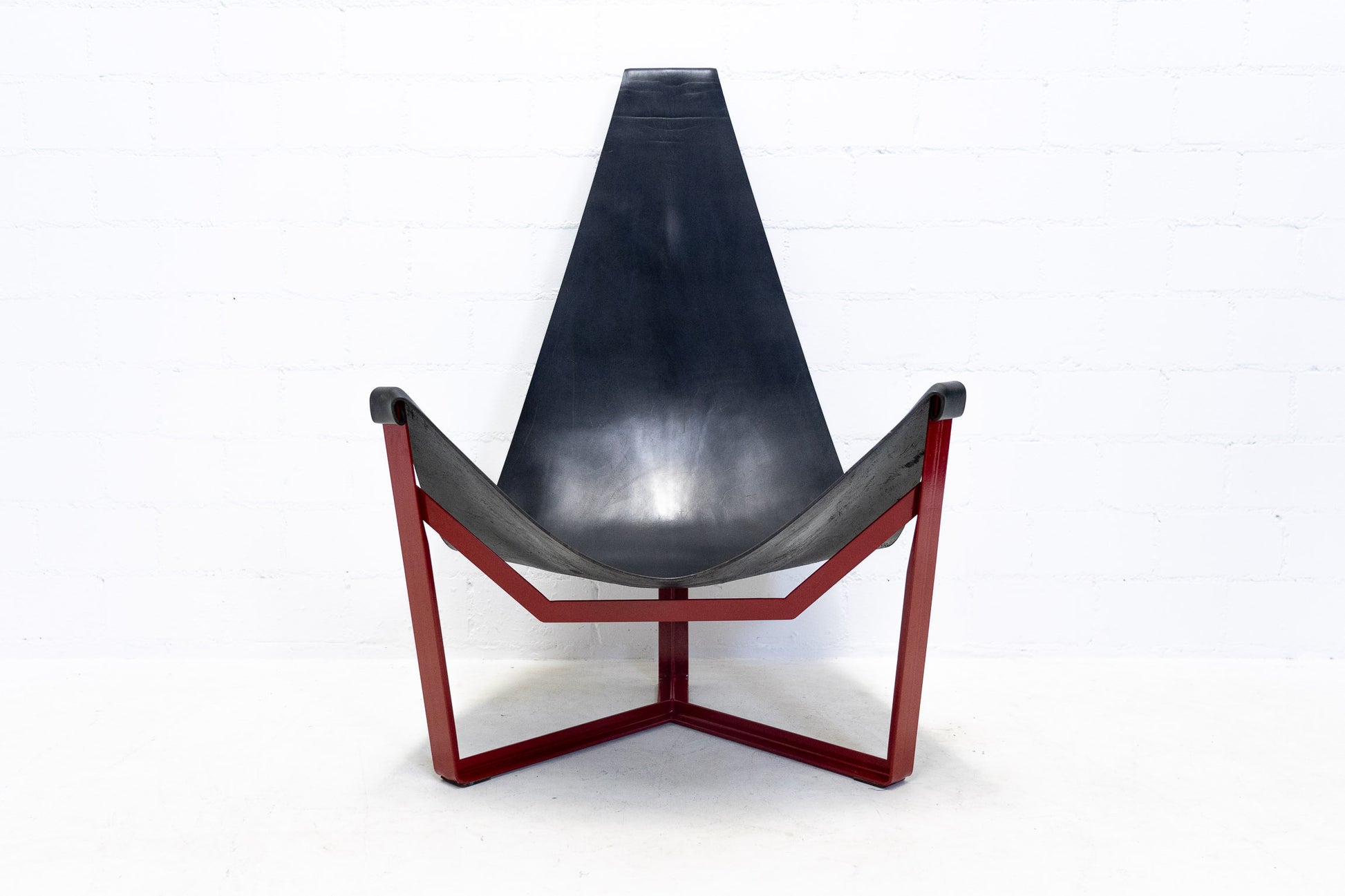 Der Sessel ist gut erhalten. Es hat leichte Gebrauchsspuren in Form von Abschürfungen und Kratzern. Der Sitzkomfort ist sehr gut. Das robuste Kernleder in schwarz ist auf einen roten Metallrahmen gespannt. Über den Hersteller oder Designer konnten wir leider nichts heraus finden.