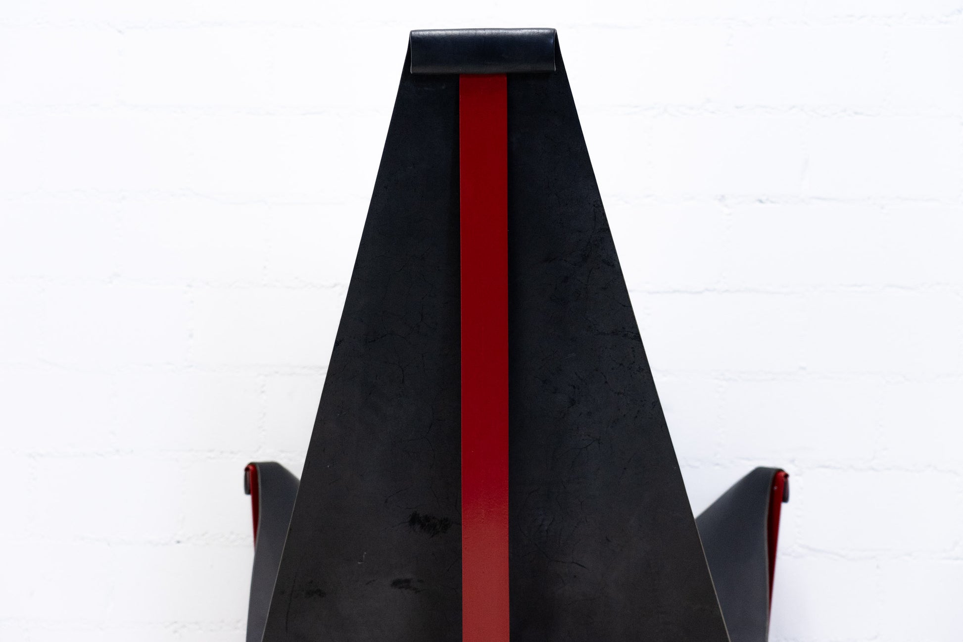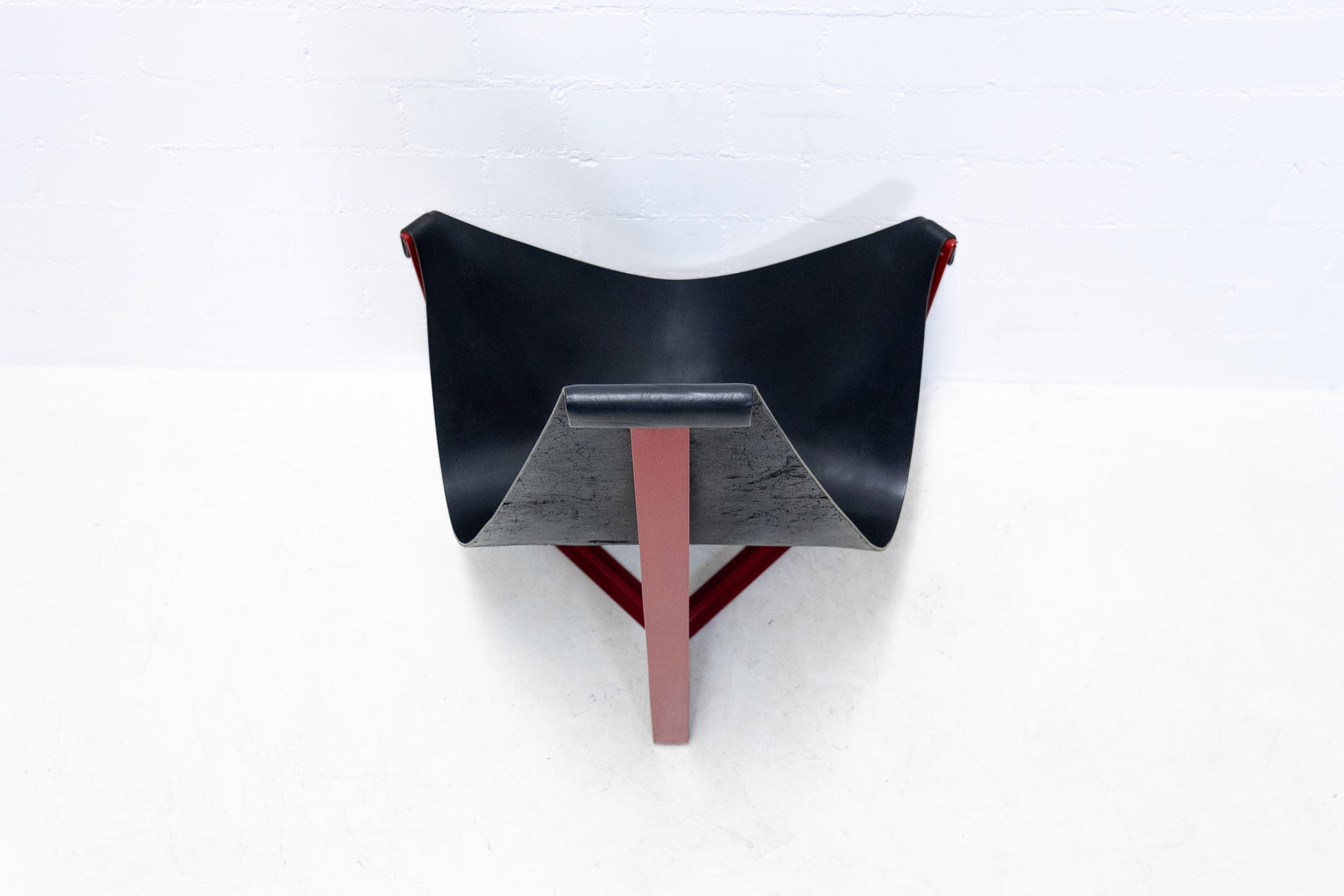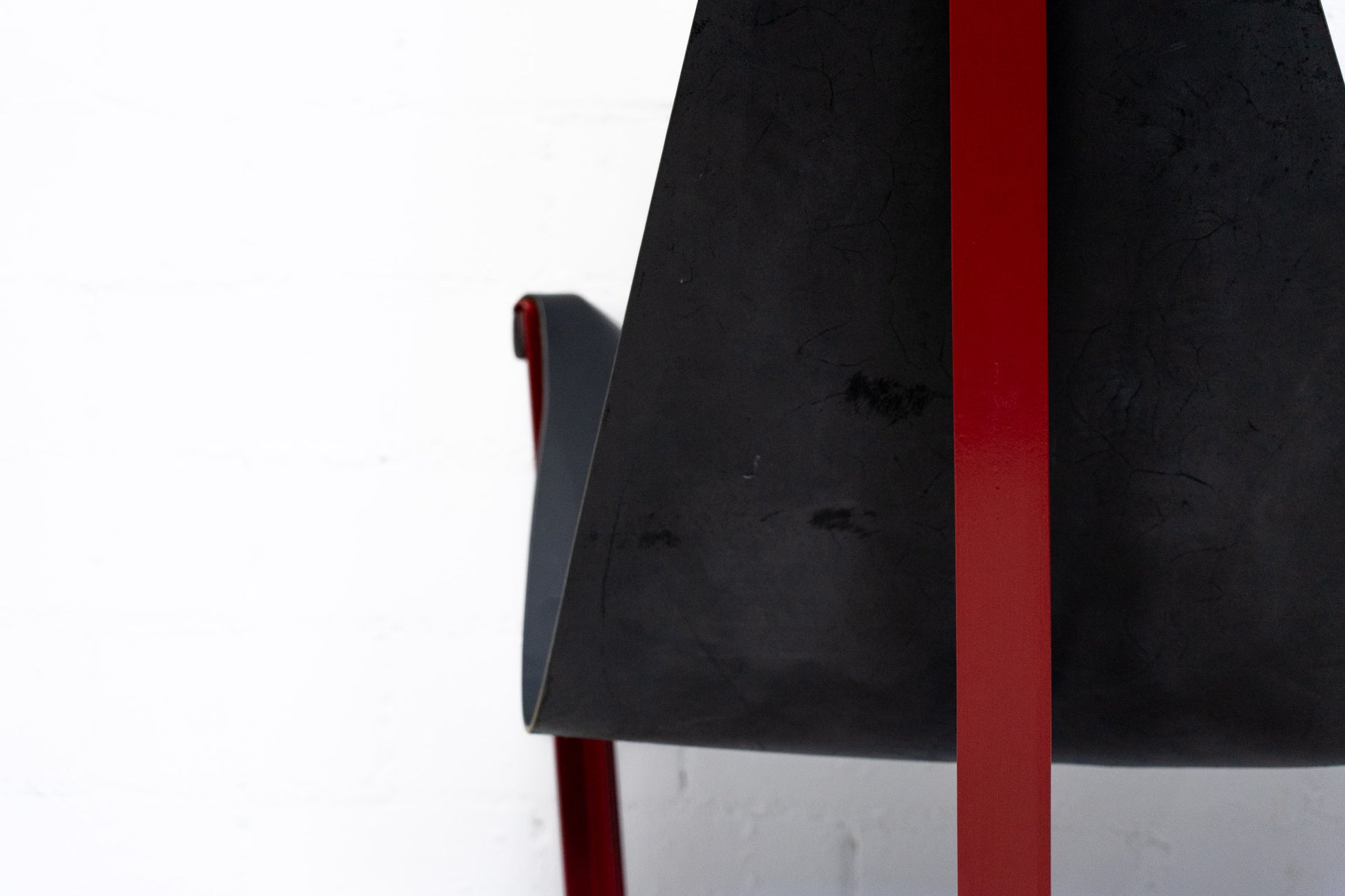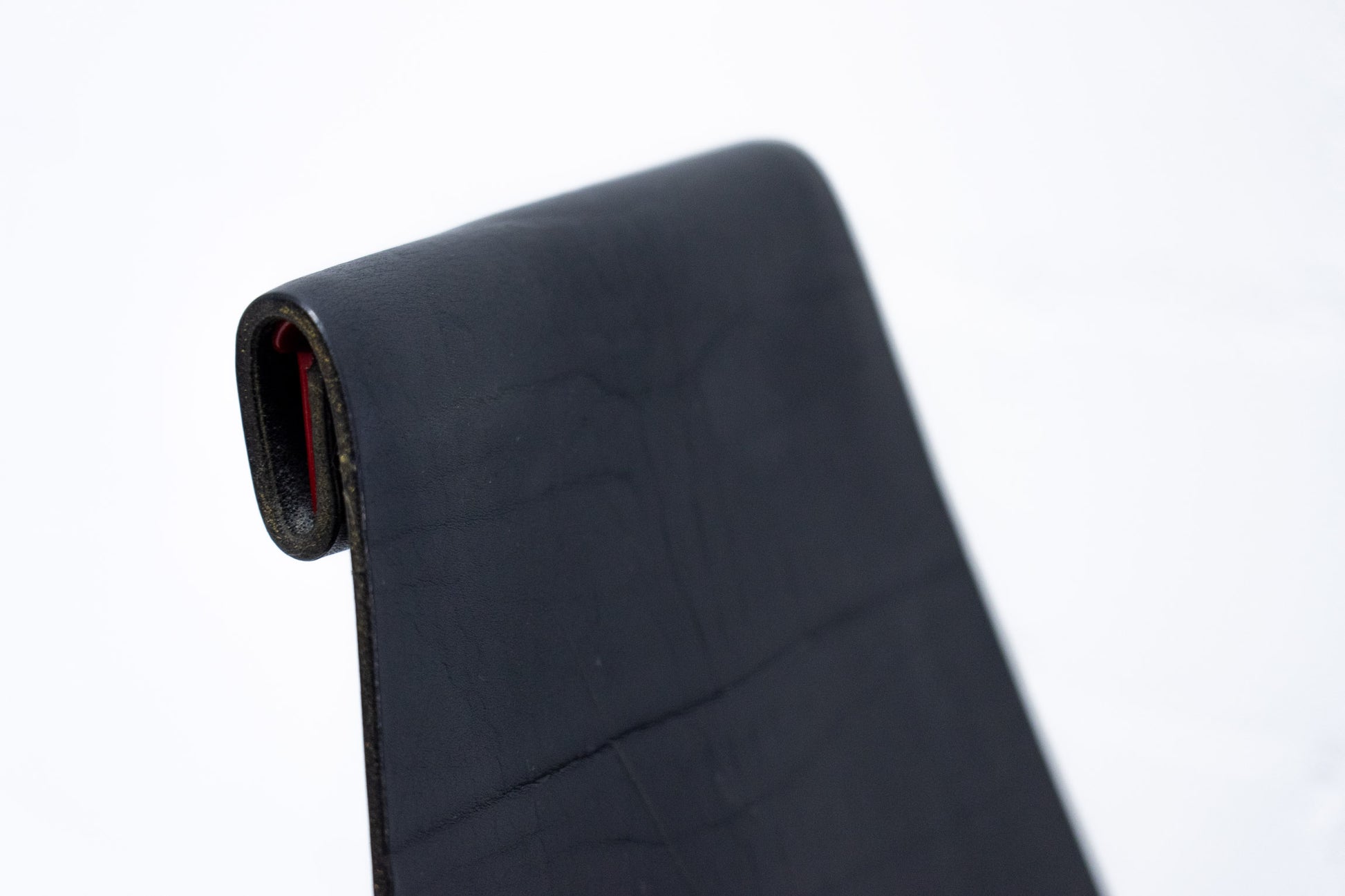 Der Sessel ist gut erhalten. Es hat leichte Gebrauchsspuren in Form von Abschürfungen und Kratzern. Der Sitzkomfort ist sehr gut. Das robuste Kernleder in schwarz ist auf einen roten Metallrahmen gespannt. Über den Hersteller oder Designer konnten wir leider nichts heraus finden.
