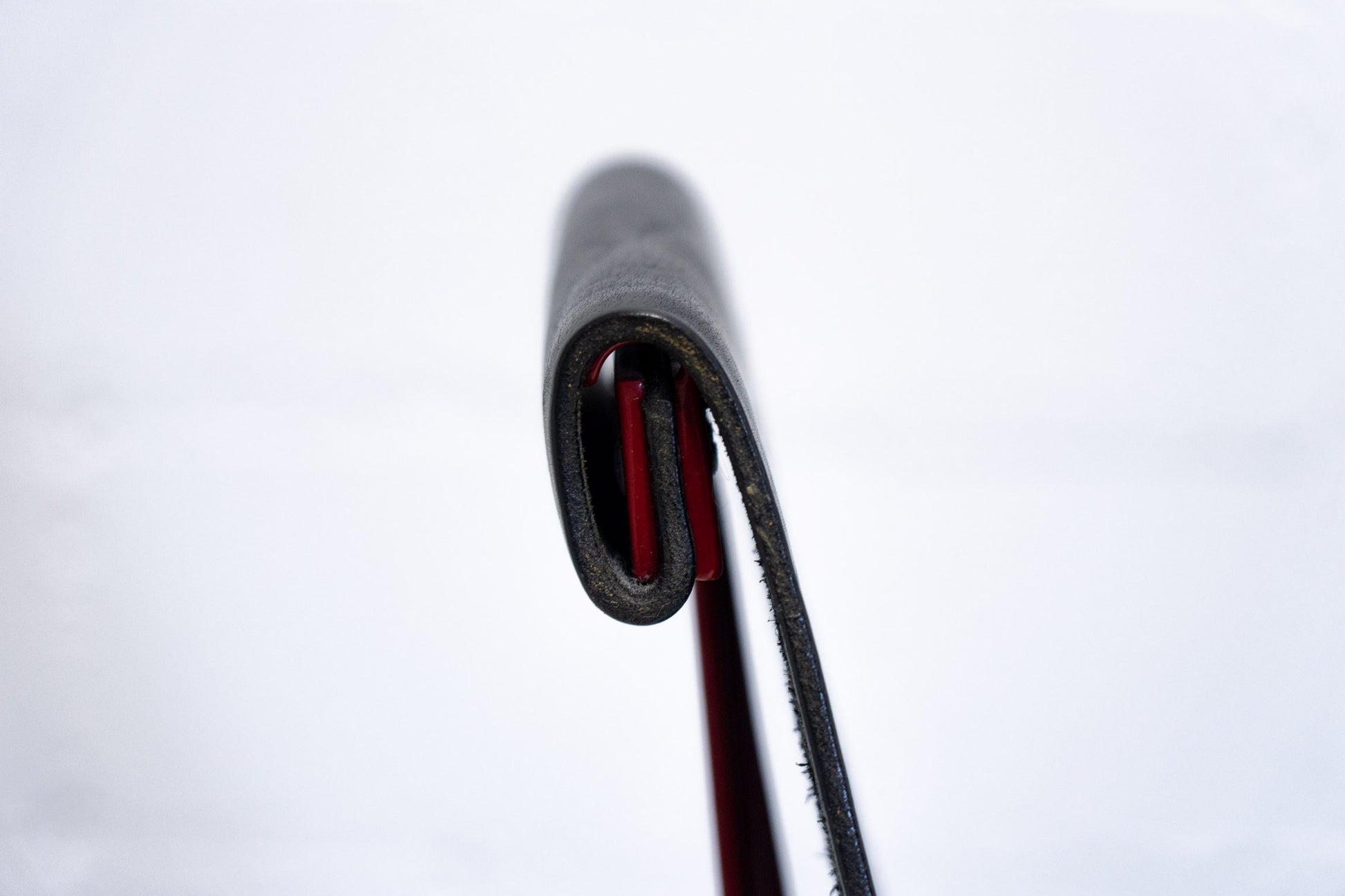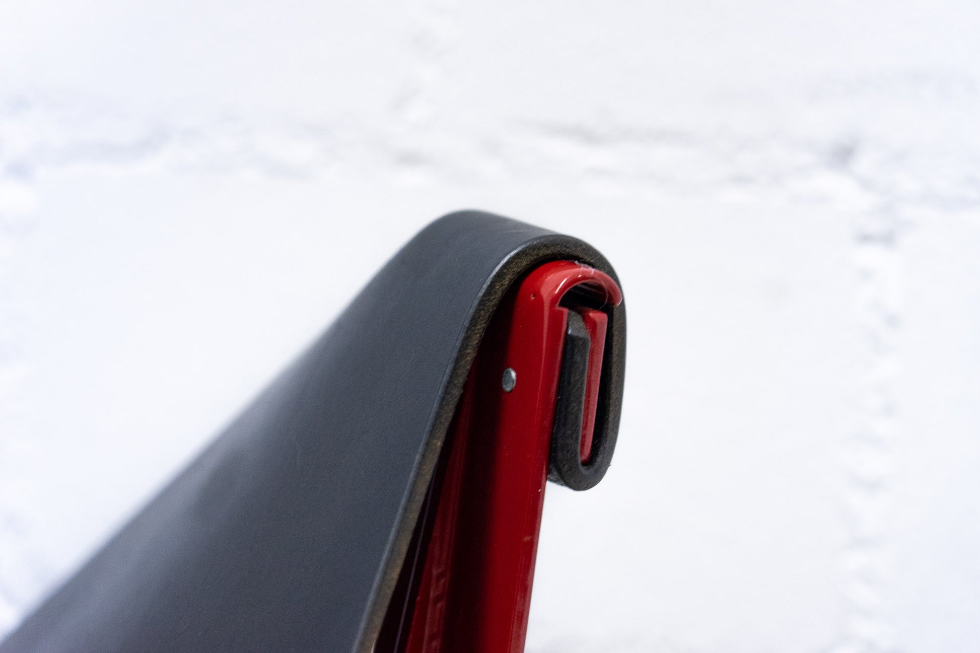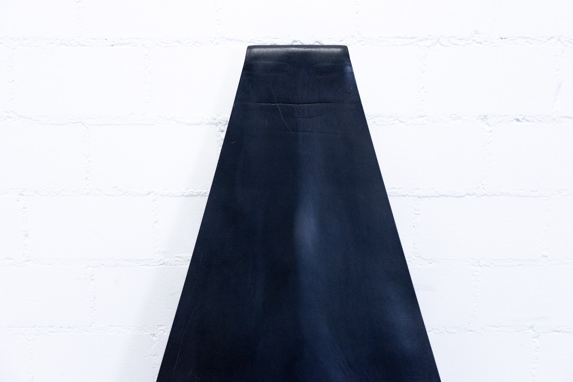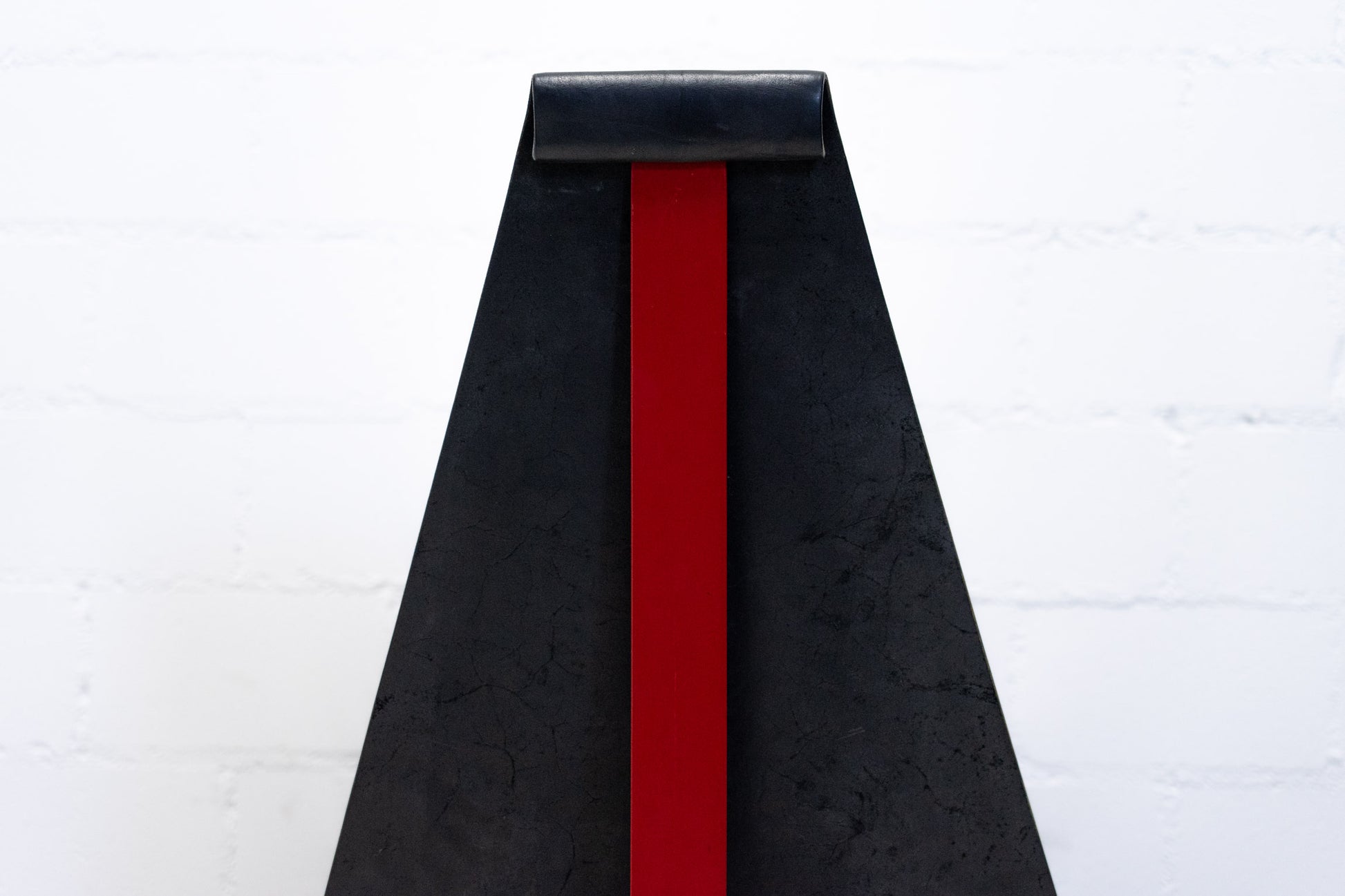 Der Sessel ist gut erhalten. Es hat leichte Gebrauchsspuren in Form von Abschürfungen und Kratzern. Der Sitzkomfort ist sehr gut. Das robuste Kernleder in schwarz ist auf einen roten Metallrahmen gespannt. Über den Hersteller oder Designer konnten wir leider nichts heraus finden.