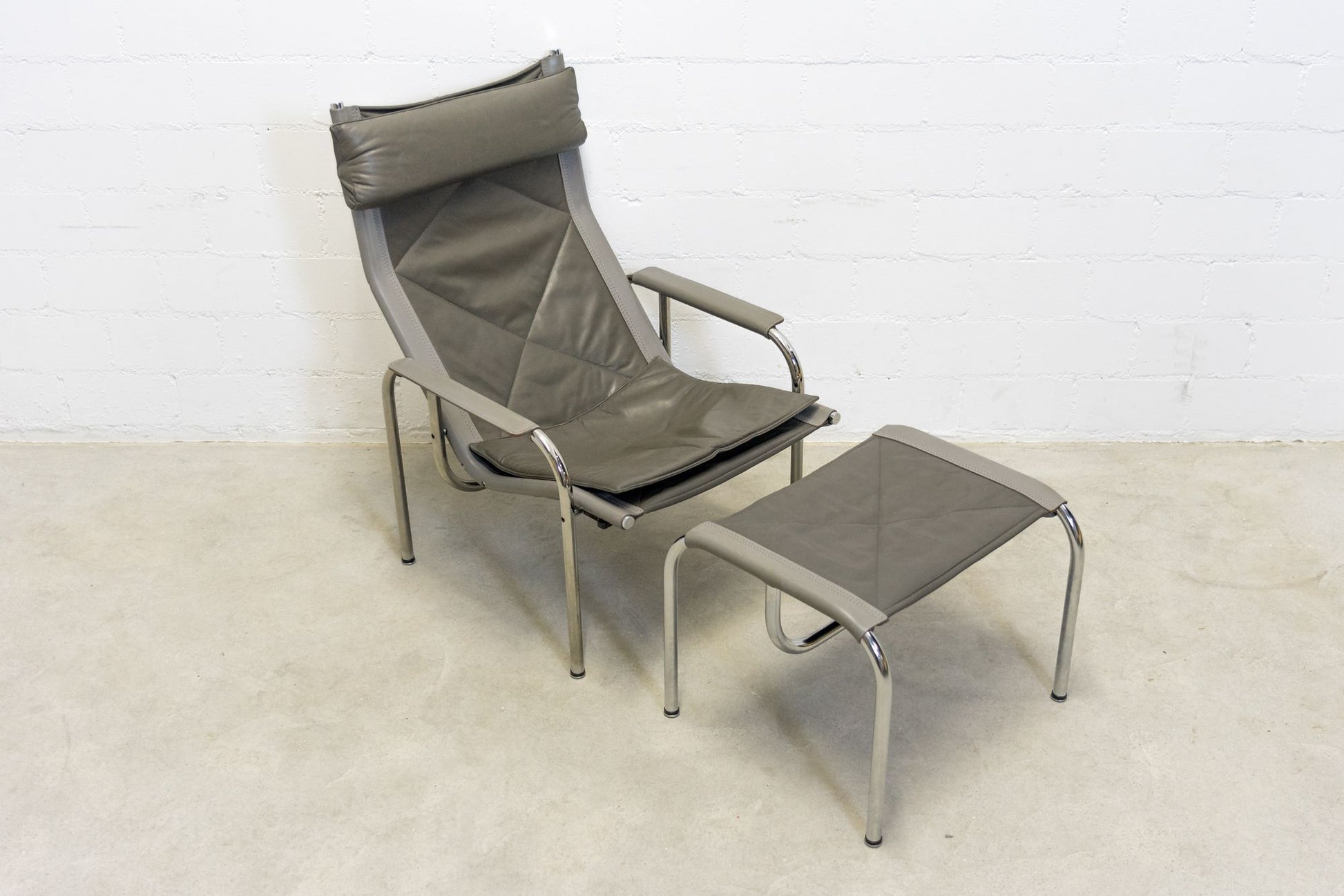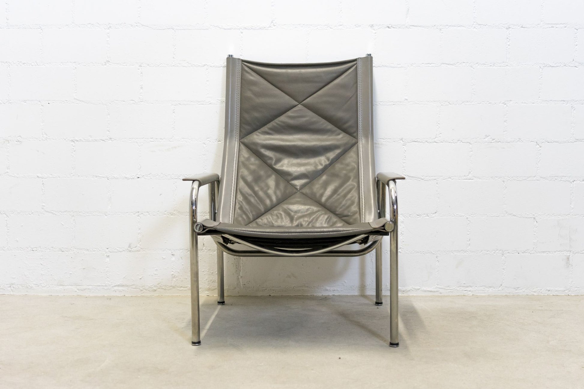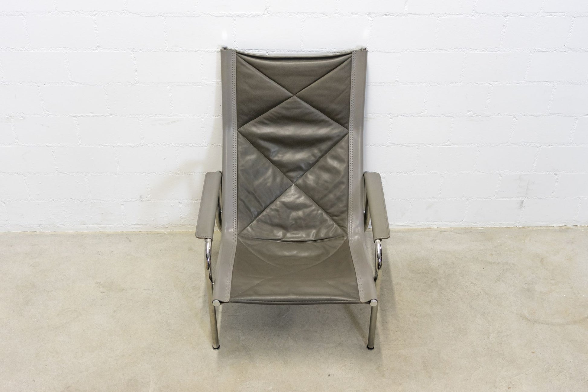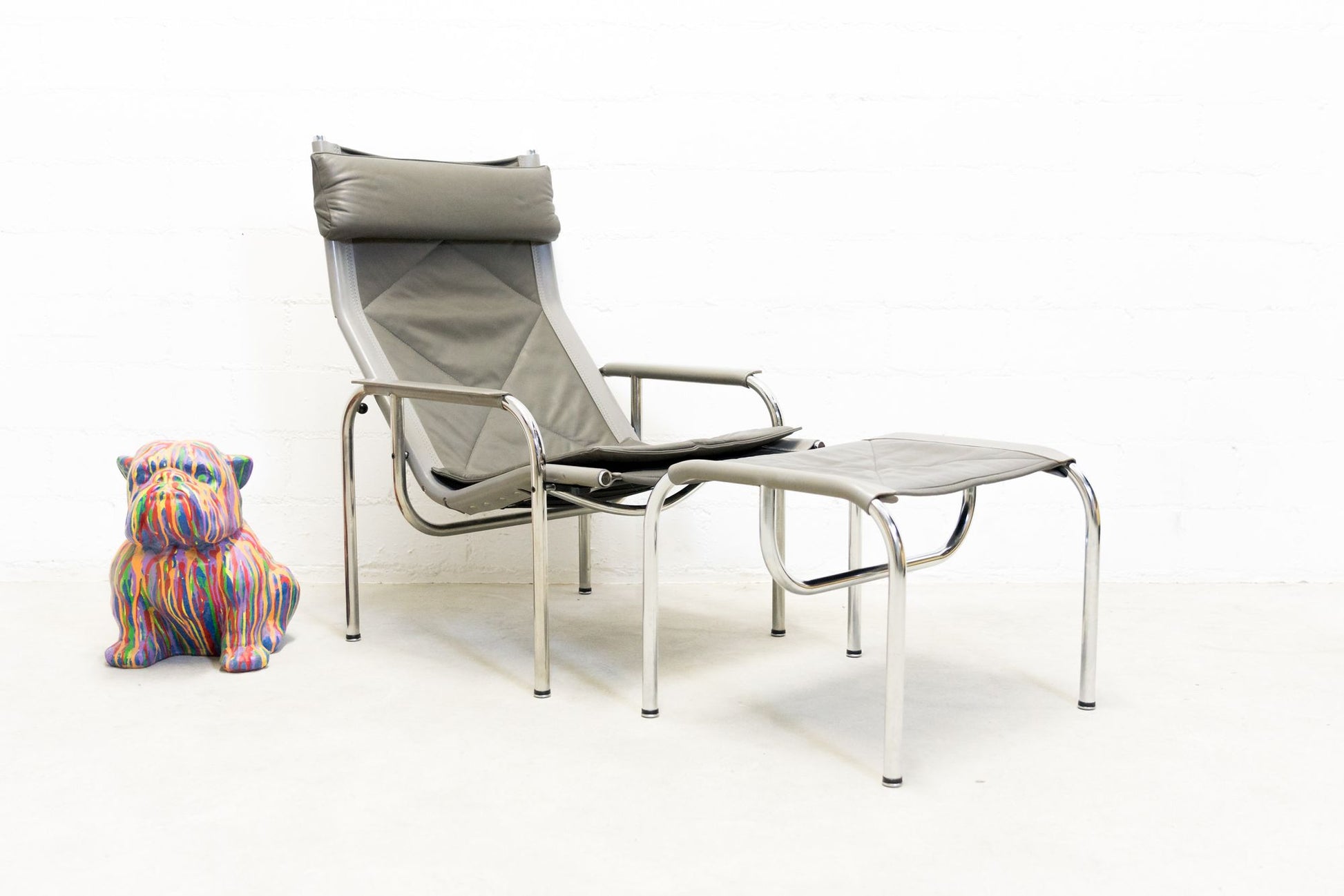 Das Leder und das Gestell sind gut erhalten. Es hat leichte Gebrauchsspuren in Form von Kratzern und Abschürfungen. Wir haben davon ein Detailfoto gemacht. Der Sitzkomfort ist nach wie vor super. Der Sessel wurde von Hans Eichenberger entworfen. Der Sessel ist in 3 Stufen durch einen Mechanismus einfach einstellbar. Der derzeitige Neupreis für einen Sessel mit Hocker beträgt ca. 5500 CHF.