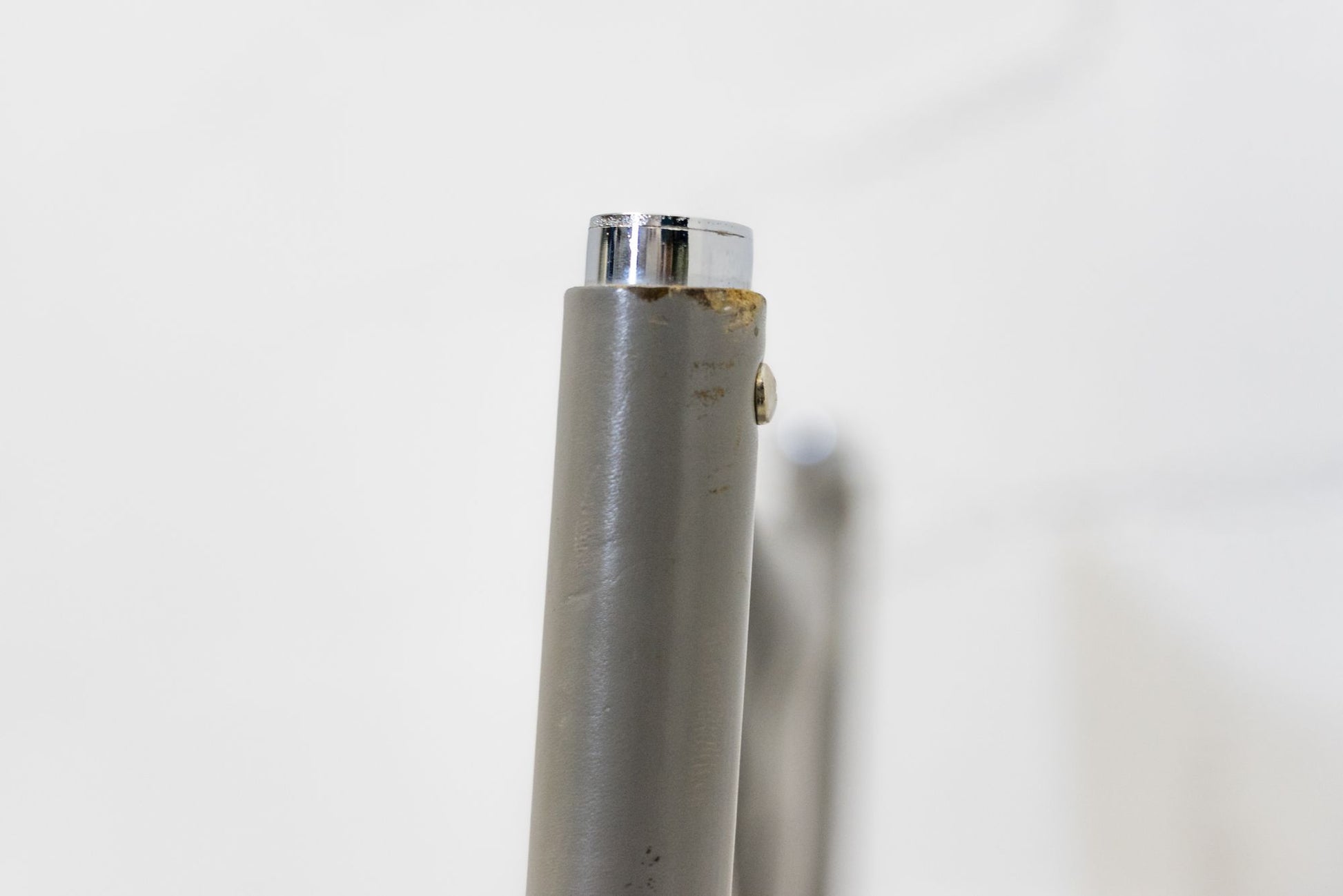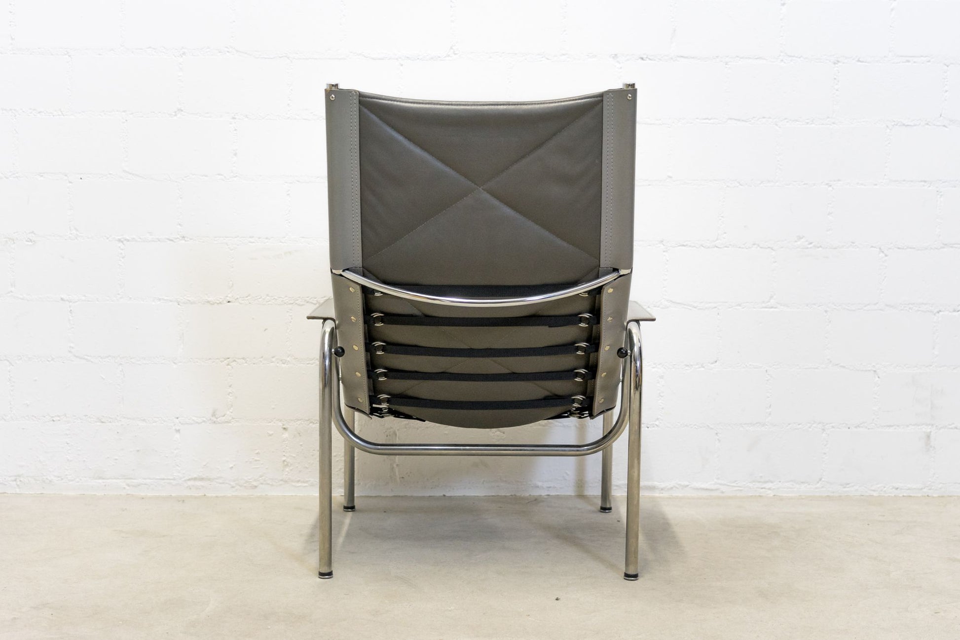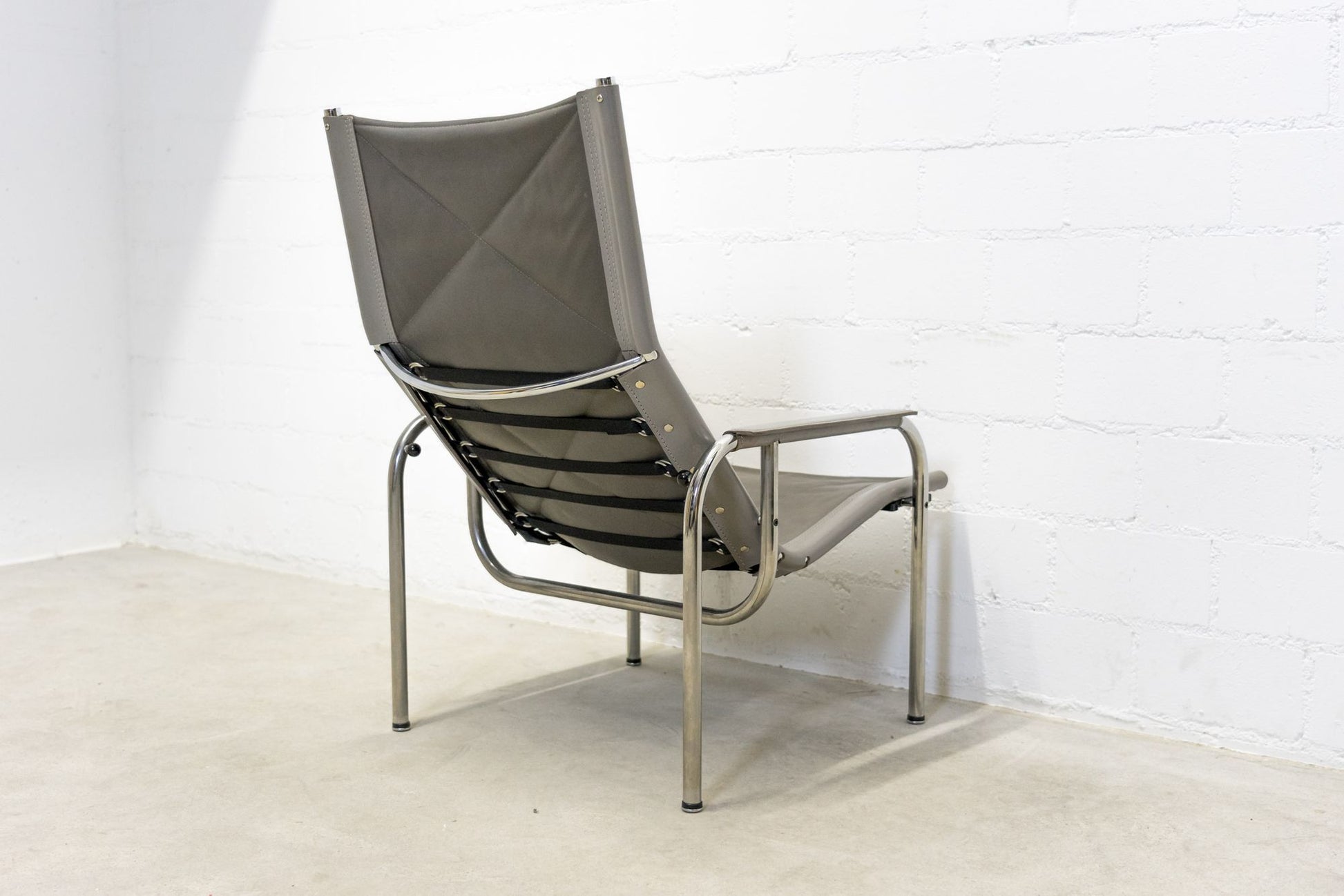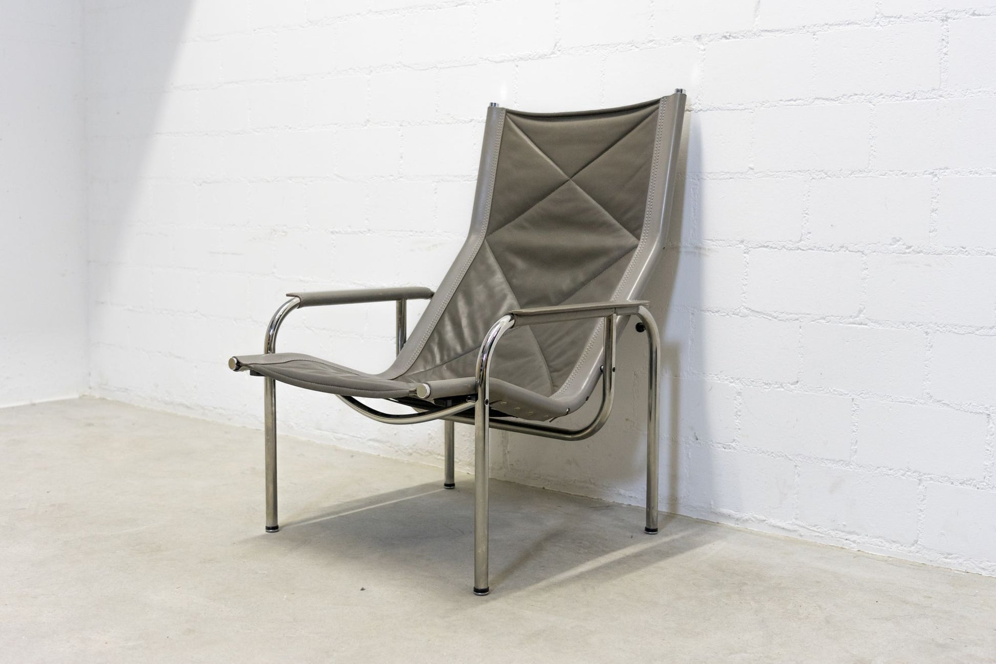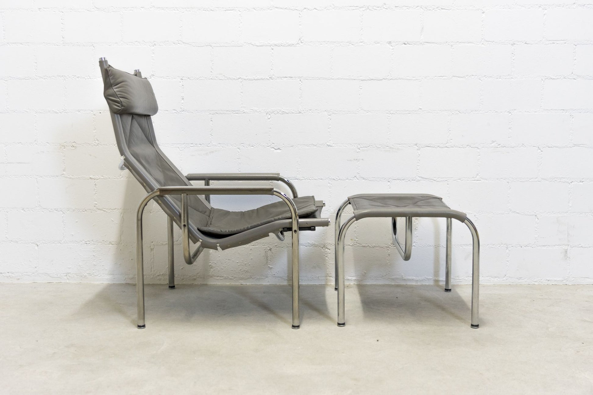 Das Leder und das Gestell sind gut erhalten. Es hat leichte Gebrauchsspuren in Form von Kratzern und Abschürfungen. Wir haben davon ein Detailfoto gemacht. Der Sitzkomfort ist nach wie vor super. Der Sessel wurde von Hans Eichenberger entworfen. Der Sessel ist in 3 Stufen durch einen Mechanismus einfach einstellbar. Der derzeitige Neupreis für einen Sessel mit Hocker beträgt ca. 5500 CHF.