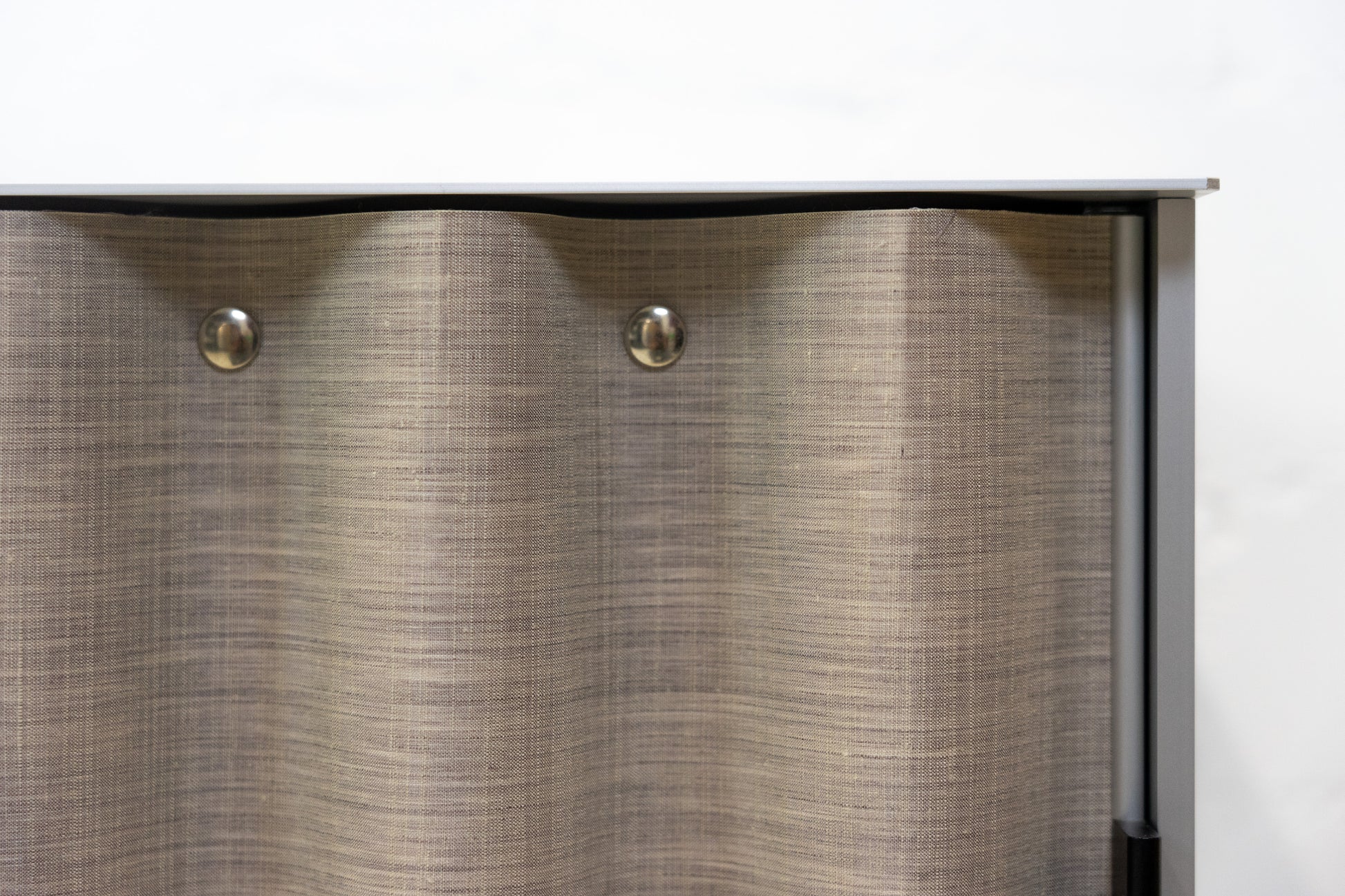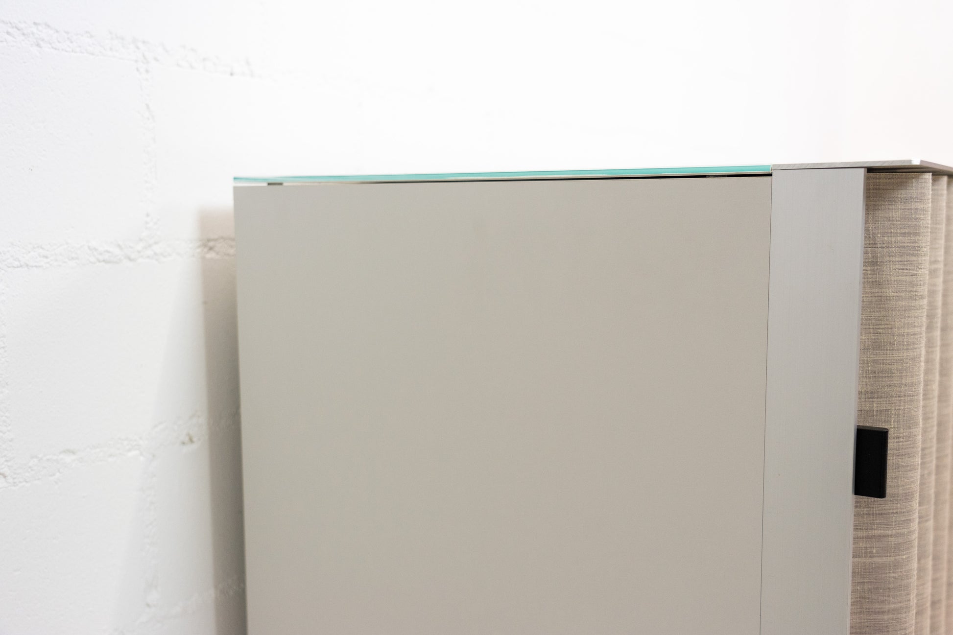 Das Sideboard ist schön erhalten und hat leichte Gebrauchsspuren in Form von Kratzern und Abschürfungen. Der Entwurf von Kurt Thut ist aus dem Jahr 1993. Das Möbel wird immer noch produziert. Der Faltvorhang ist Porto 204. Das Glasdeckblatt ist Lichtgrau und der Korpus ebenfalls. Es hat 3 Tablare und 3 Schubladen. Der damalige Neupreis betrug ca. 6160 Franken.