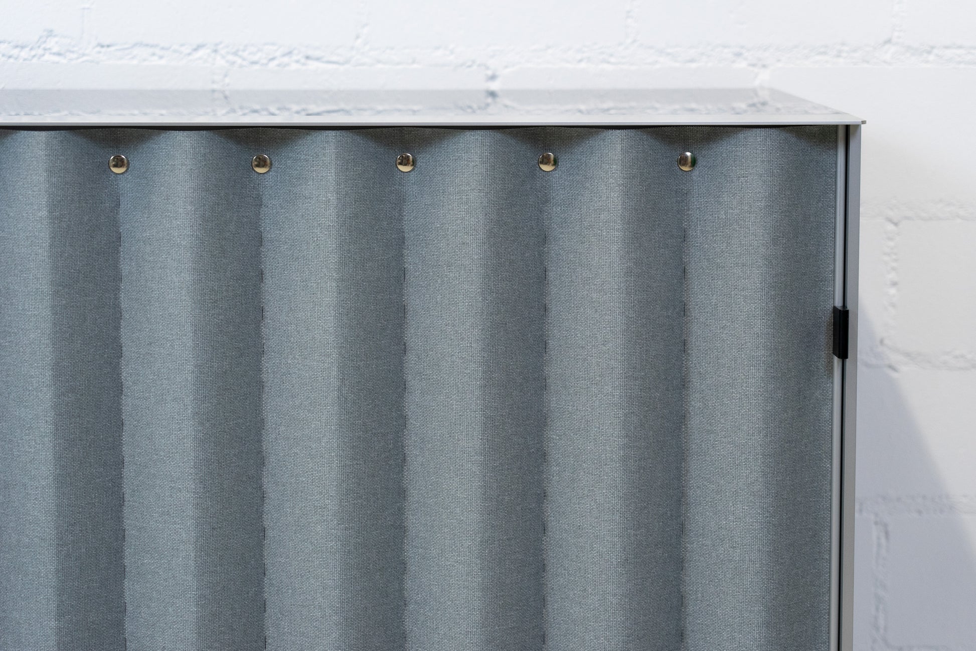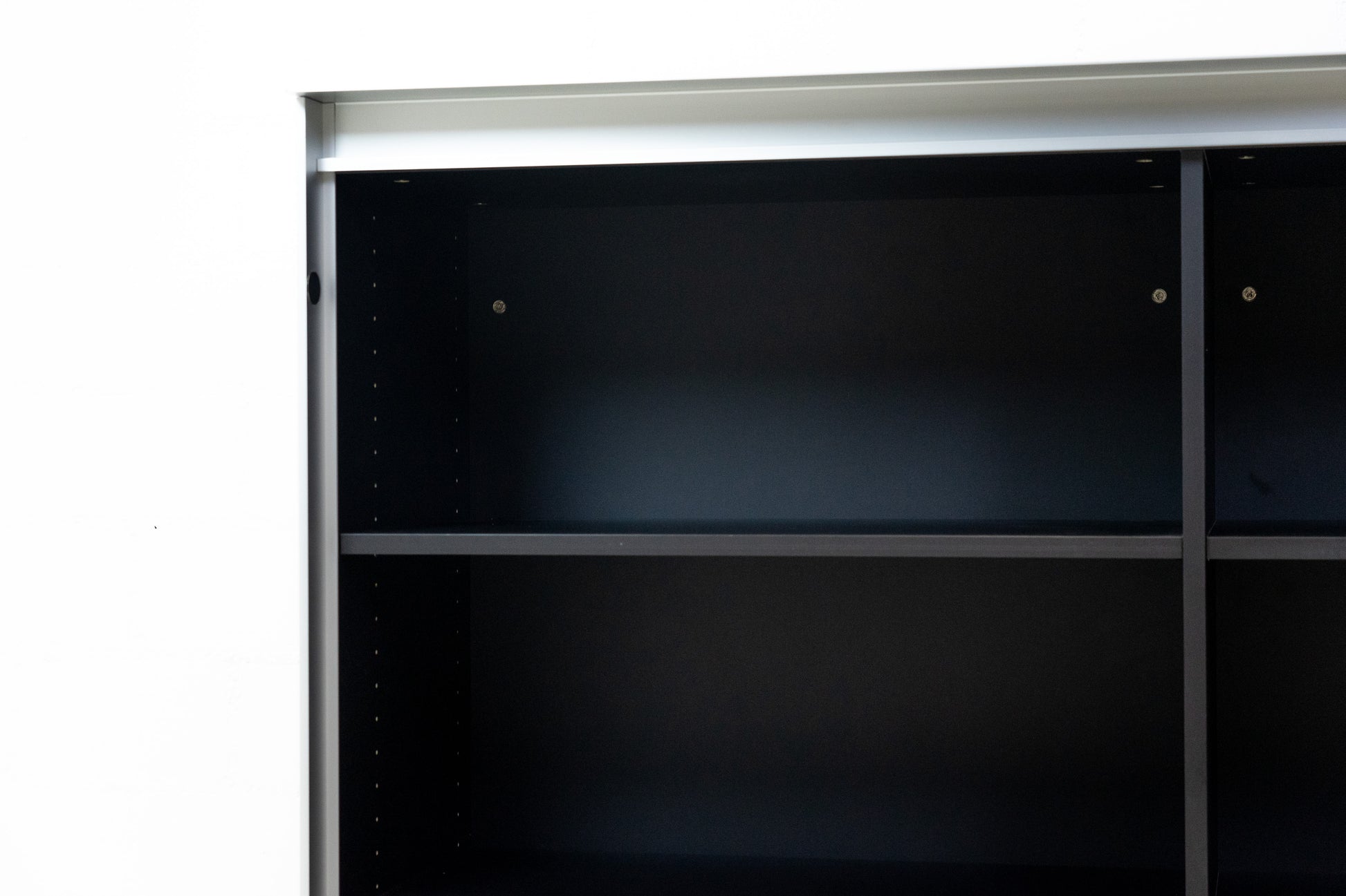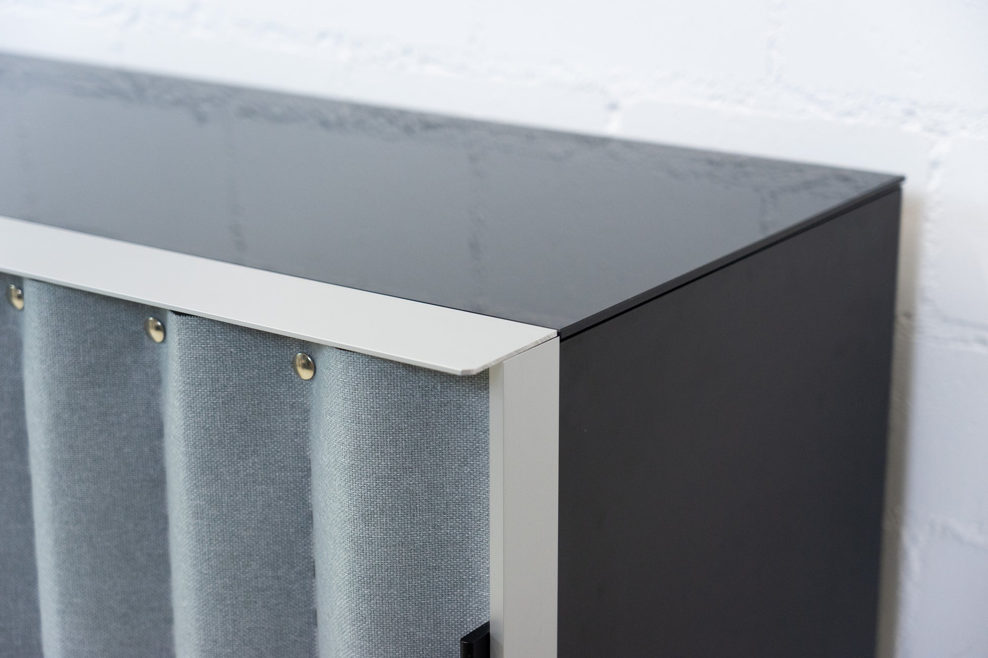 Das Sideboard ist schön erhalten und hat leichte Gebrauchsspuren in Form von Kratzern und Abschürfungen. Der Entwurf von Kurt Thut ist aus dem Jahr 1993. Das Möbel wird immer noch produziert. Der Faltvorhang ist Screlan 7312 grau. Das Glasdeckblatt ist schwarz und der Korpus ebenfalls. Es hat 4 Tablare. Der damalige Neupreis betrug ca. 5080 Franken.