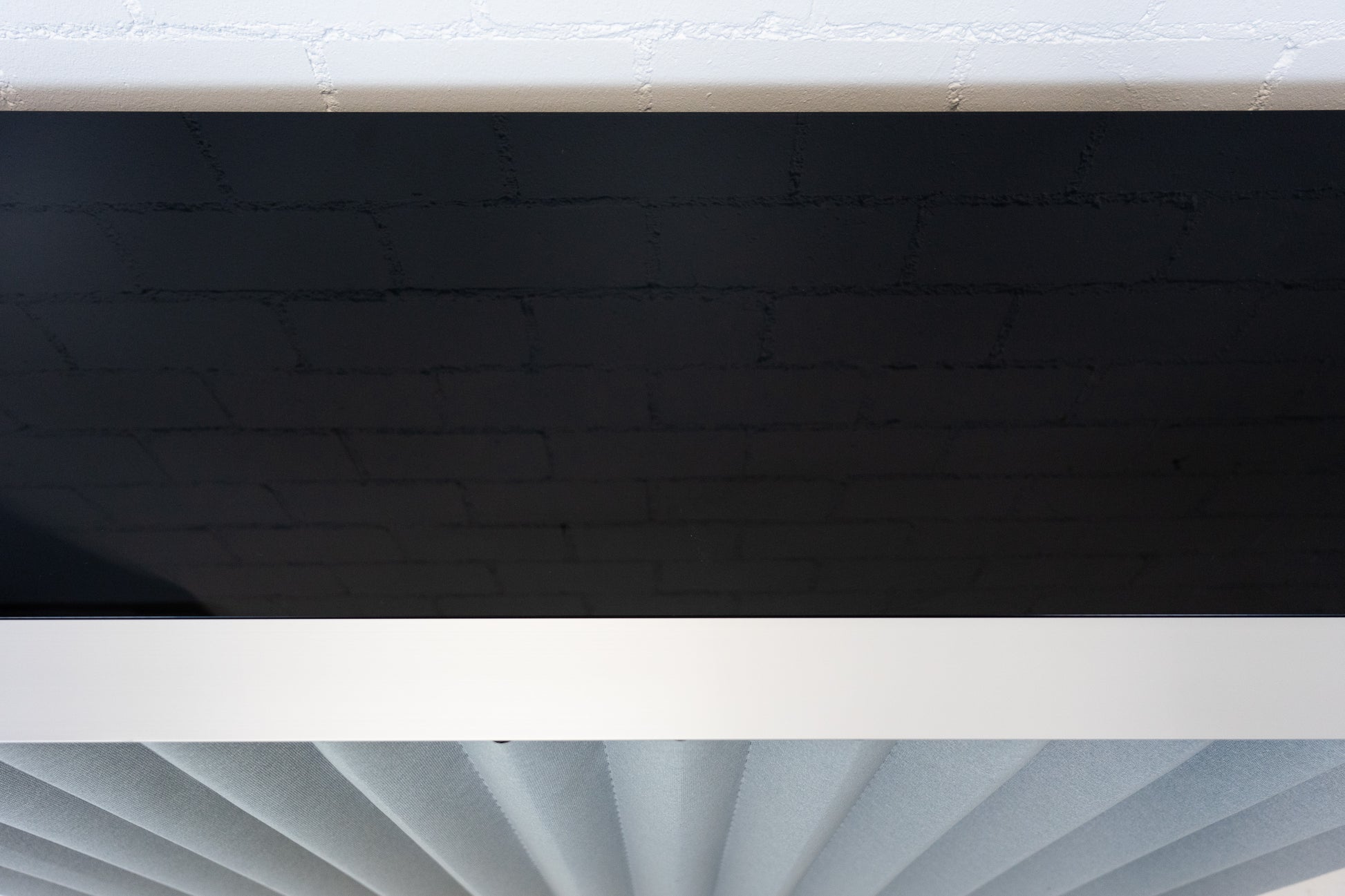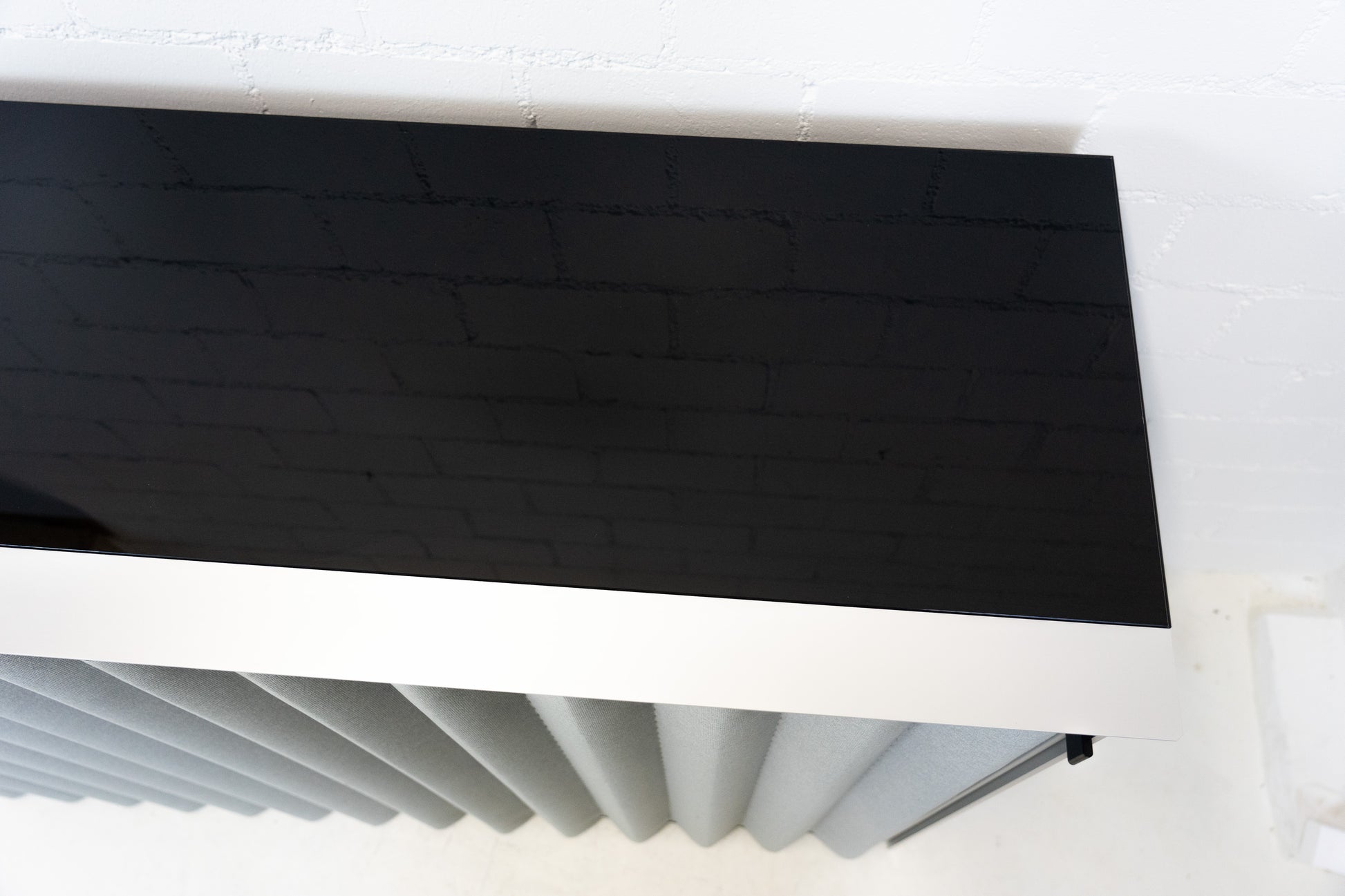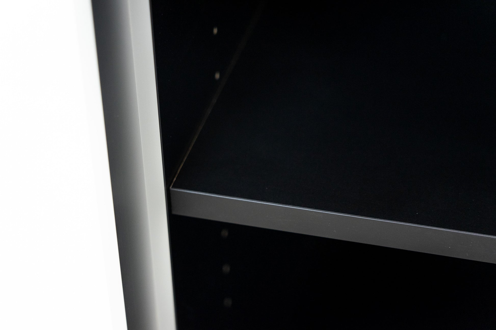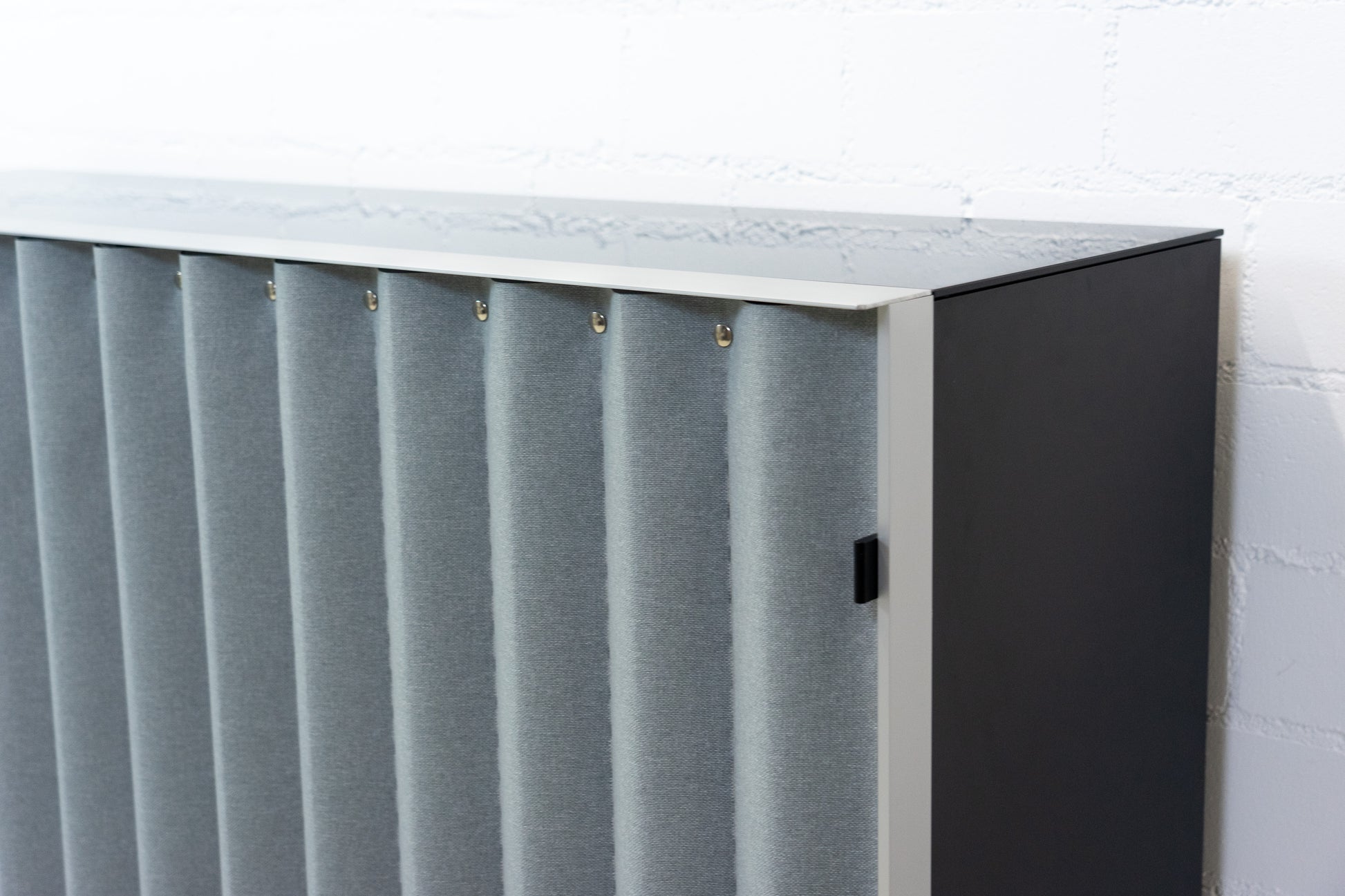 Das Sideboard ist schön erhalten und hat leichte Gebrauchsspuren in Form von Kratzern und Abschürfungen. Der Entwurf von Kurt Thut ist aus dem Jahr 1993. Das Möbel wird immer noch produziert. Der Faltvorhang ist Screlan 7312 grau. Das Glasdeckblatt ist schwarz und der Korpus ebenfalls. Es hat 4 Tablare. Der damalige Neupreis betrug ca. 5080 Franken.