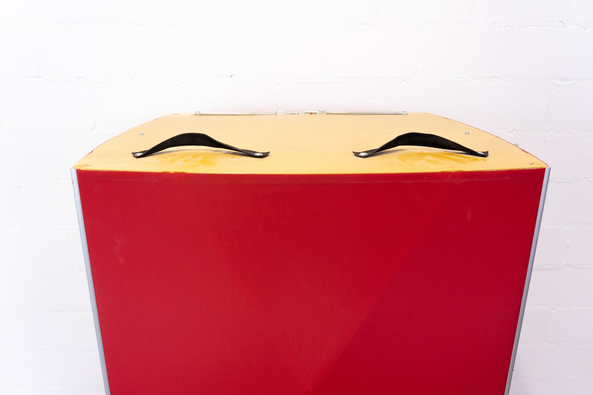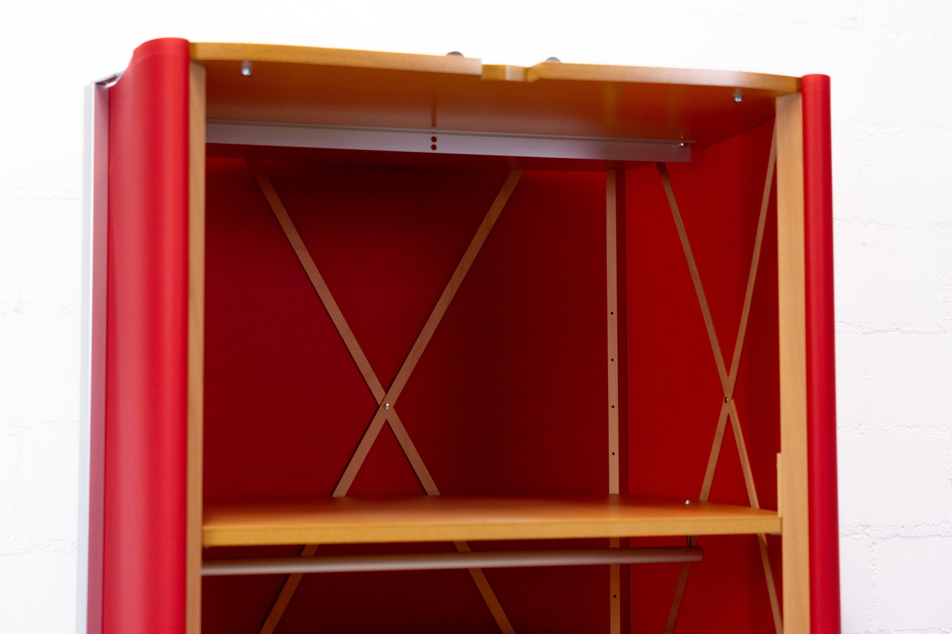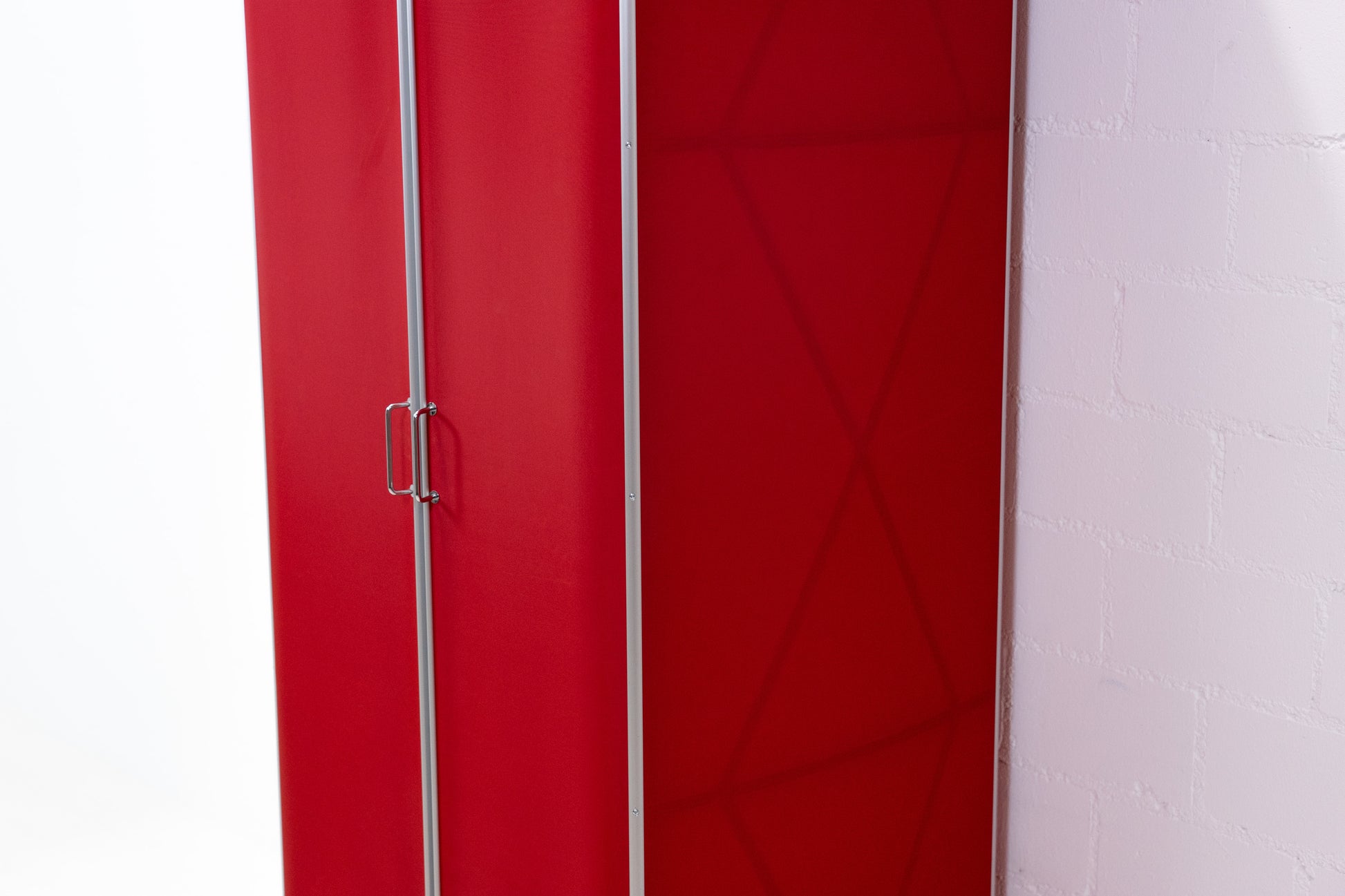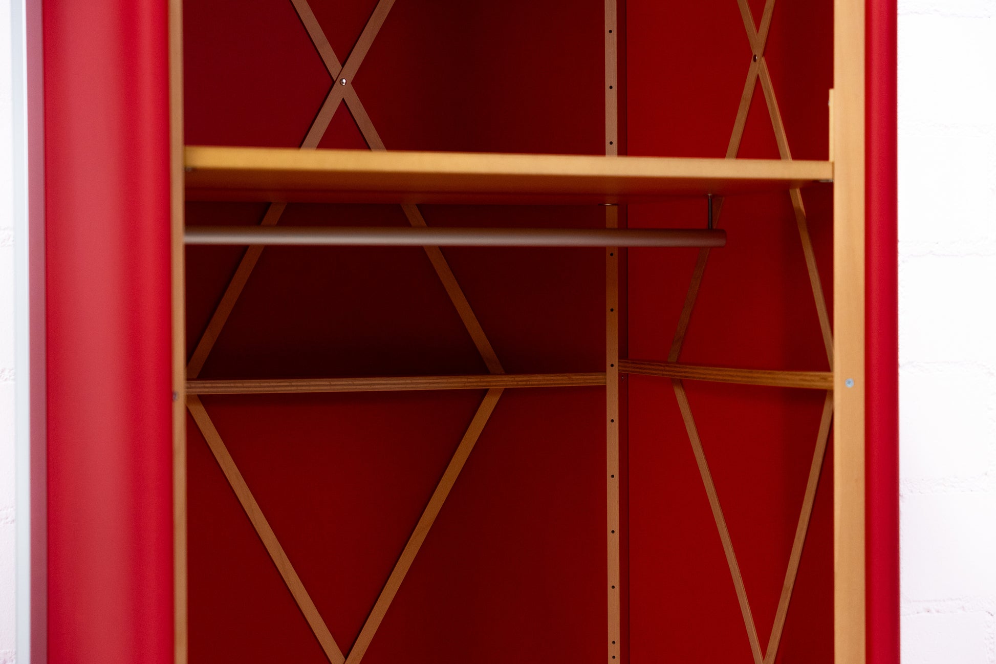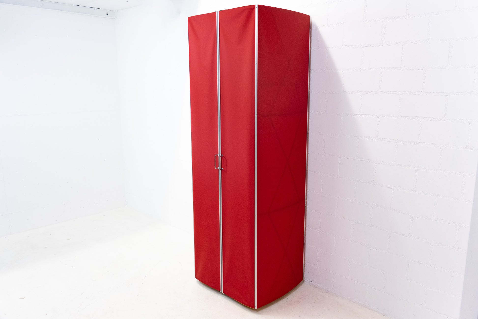 Der Schrank ist schön erhalten. Es hat leichte Gebrauchsspuren in Form von Abschürfungen, Kratzern und geringen Druckstellen in der Folie. Es hat beim Innenleben 1 Tablar und eine Kleiderstange. Die Folie ist Dacron. Der Entwurf von Kurt Thut ist aus dem Jahr 1994. Der derzeitige Neupreis für diese Ausführung laut Thut Preisliste beträgt 3562 Franken. Das Tablar kann einfach heraus genommen und der Schrank ist für 2 Personen super zum tragen, da er ziemlich leicht ist. Tablare können bei Thut jederzeit noch nachbestellt werden.