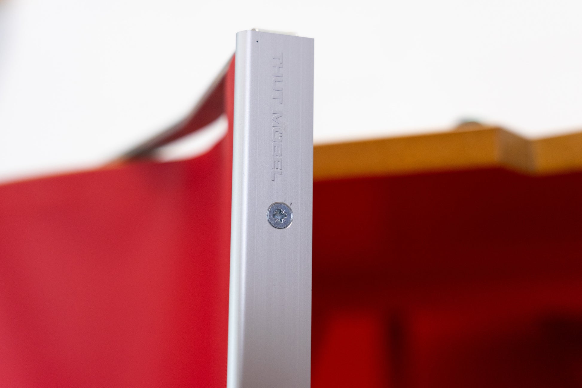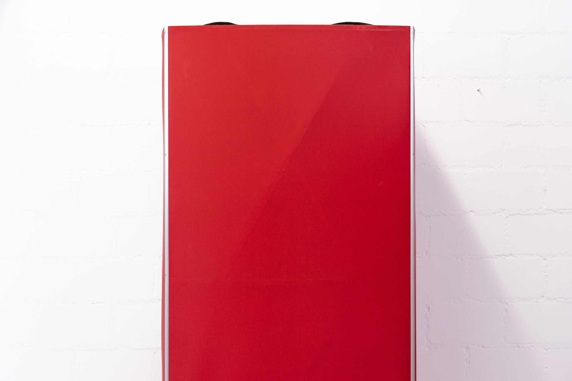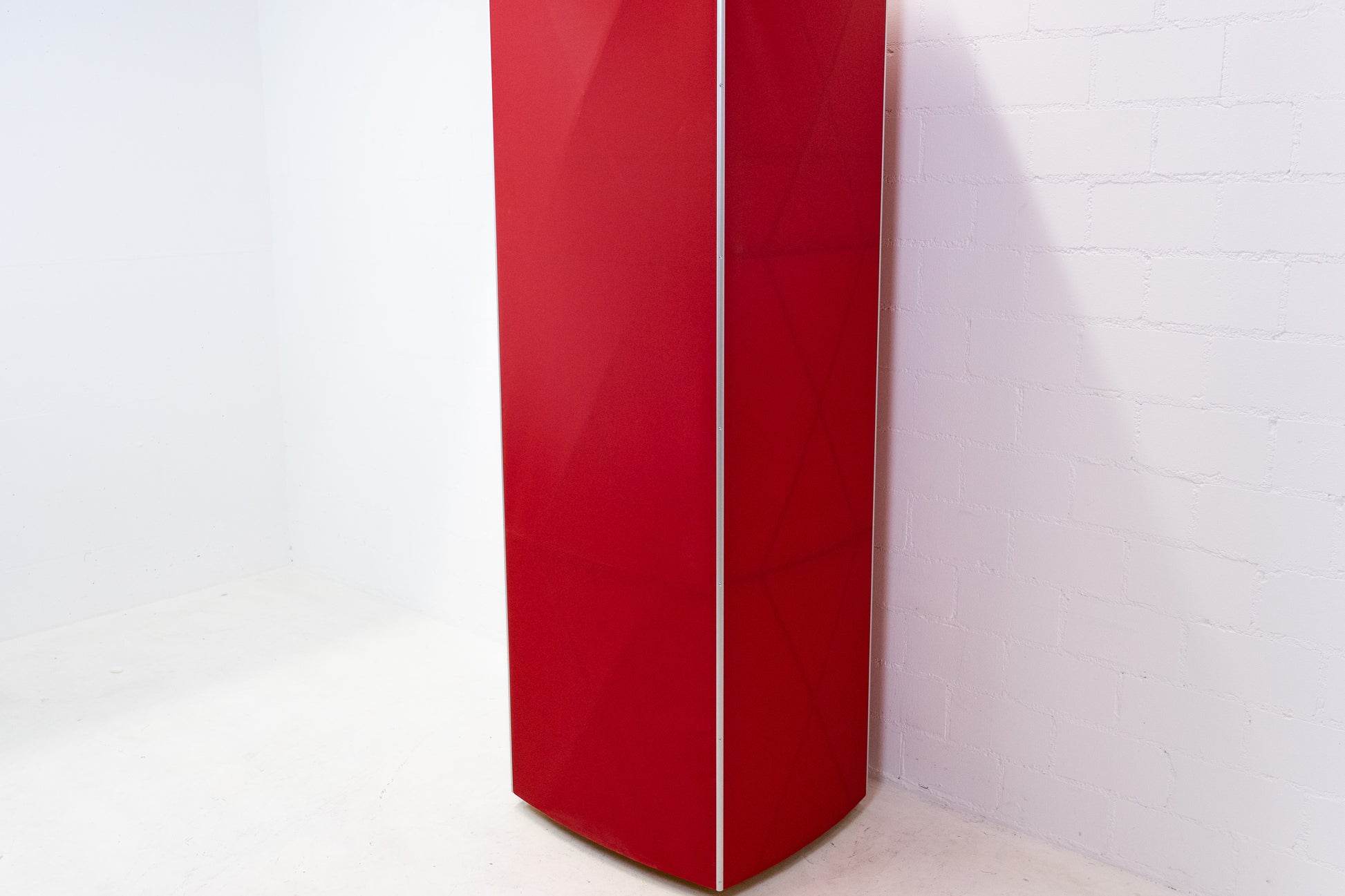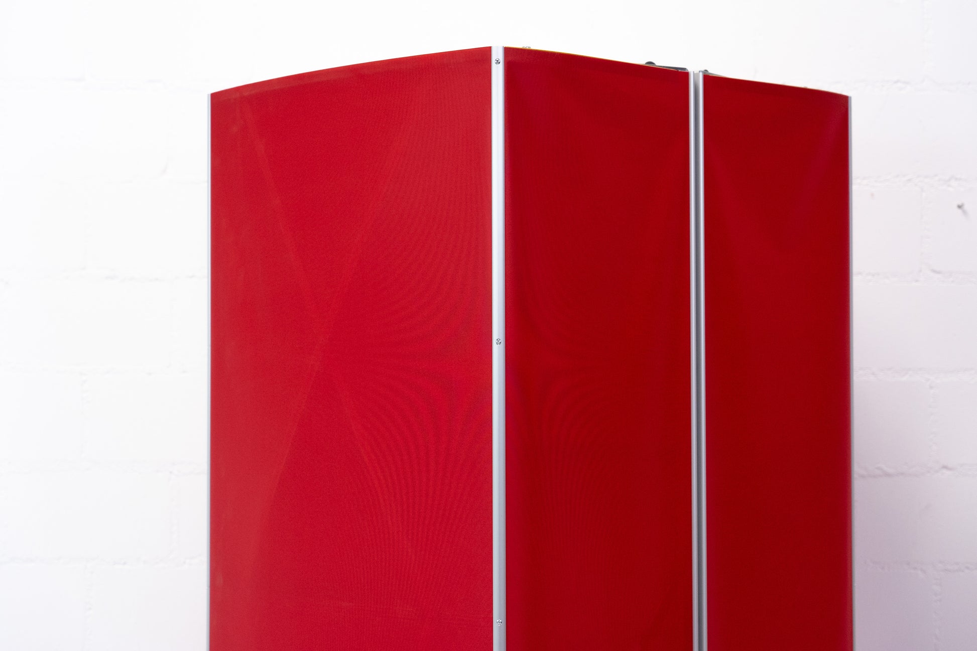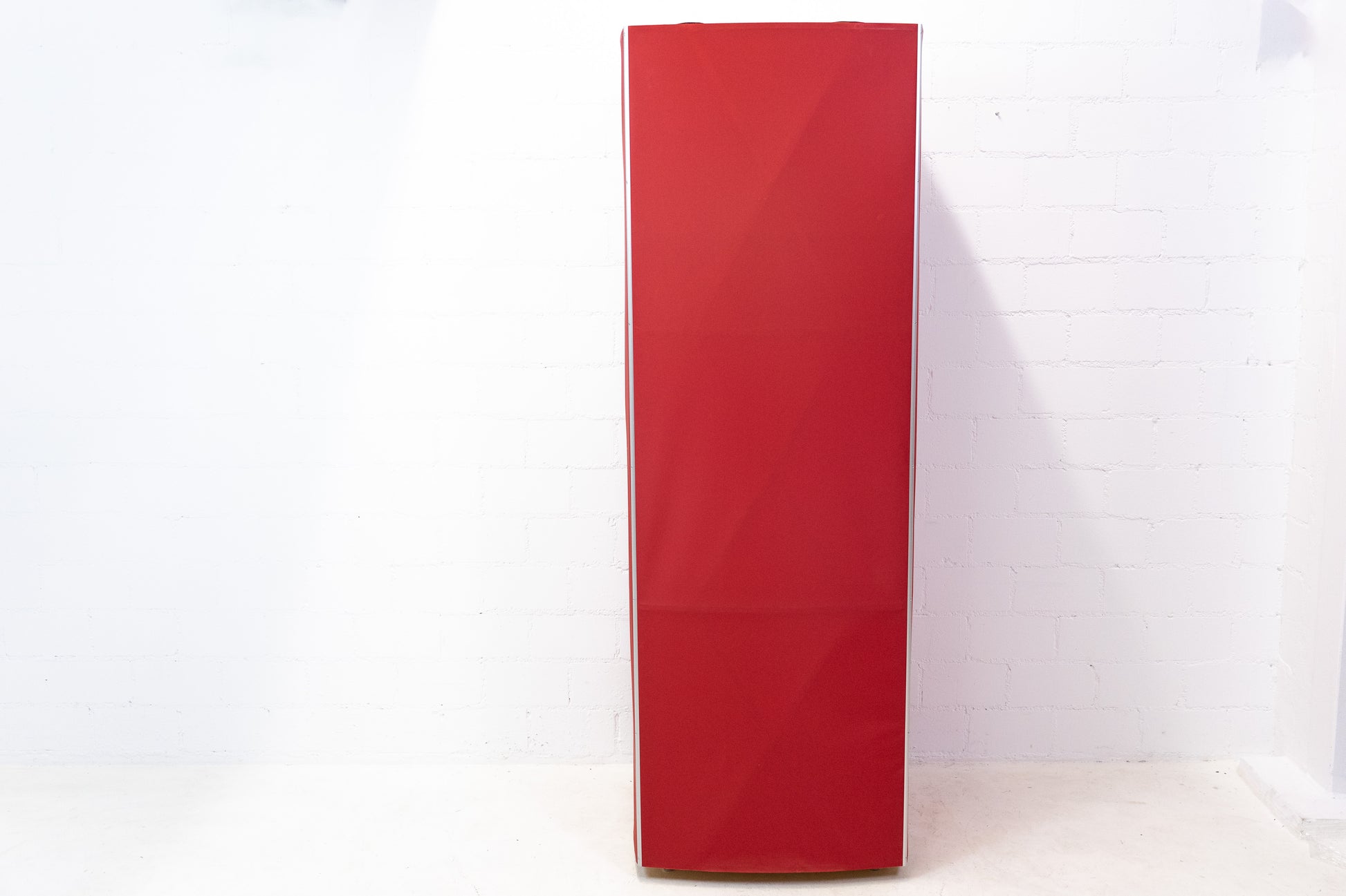 Der Schrank ist schön erhalten. Es hat leichte Gebrauchsspuren in Form von Abschürfungen, Kratzern und geringen Druckstellen in der Folie. Es hat beim Innenleben 1 Tablar und eine Kleiderstange. Die Folie ist Dacron. Der Entwurf von Kurt Thut ist aus dem Jahr 1994. Der derzeitige Neupreis für diese Ausführung laut Thut Preisliste beträgt 3562 Franken. Das Tablar kann einfach heraus genommen und der Schrank ist für 2 Personen super zum tragen, da er ziemlich leicht ist. Tablare können bei Thut jederzeit noch nachbestellt werden.