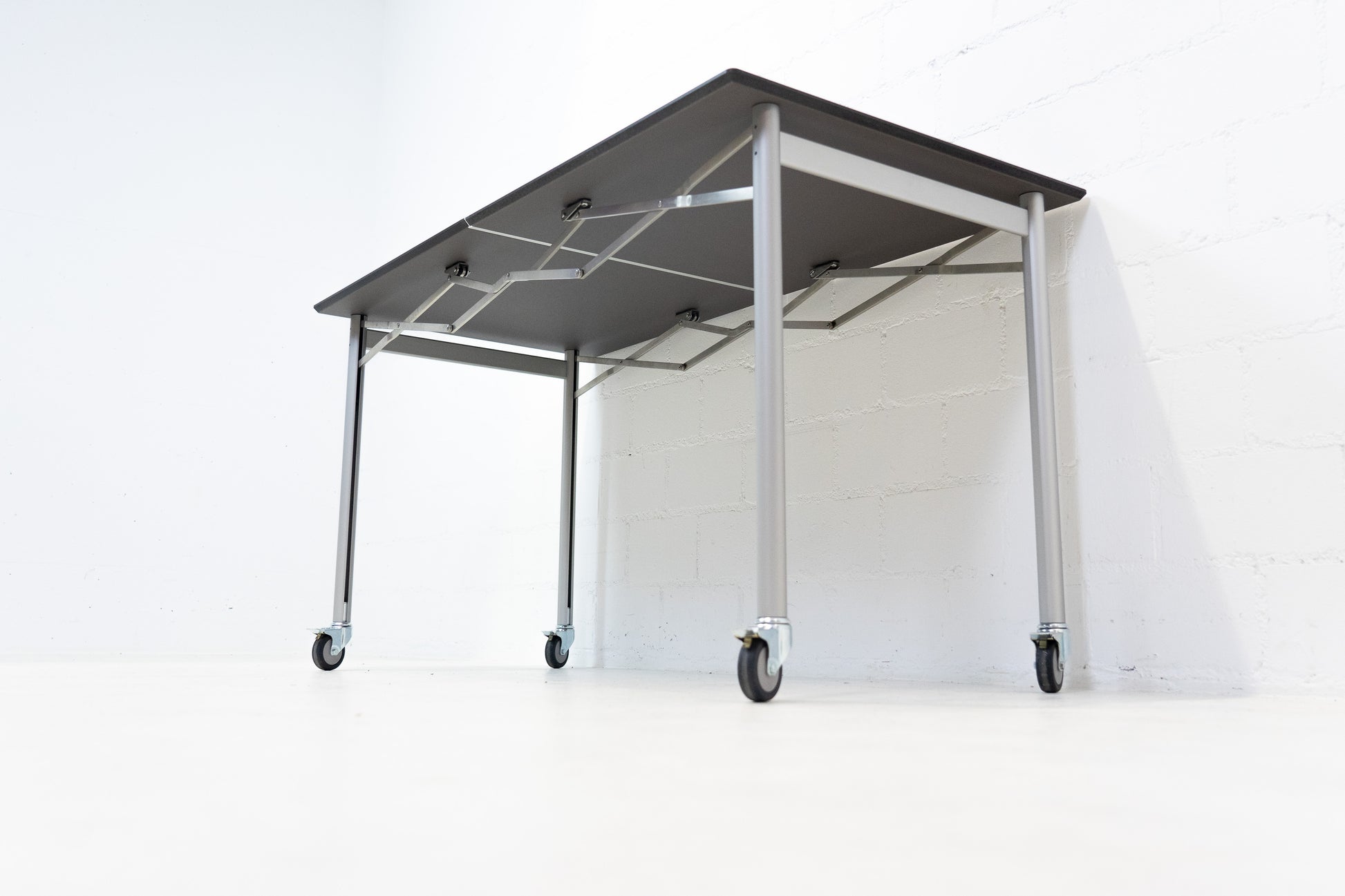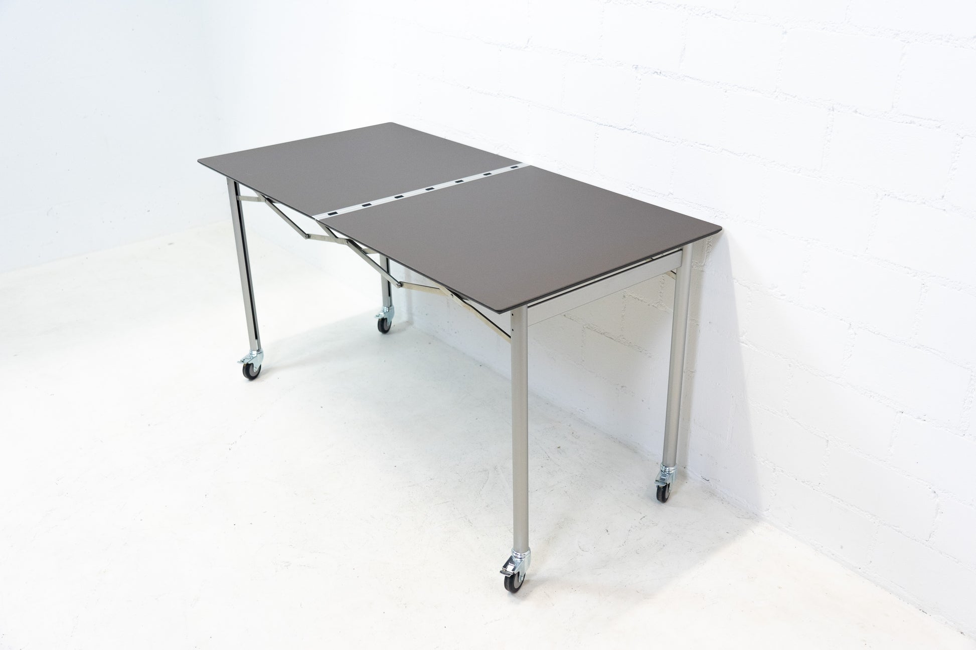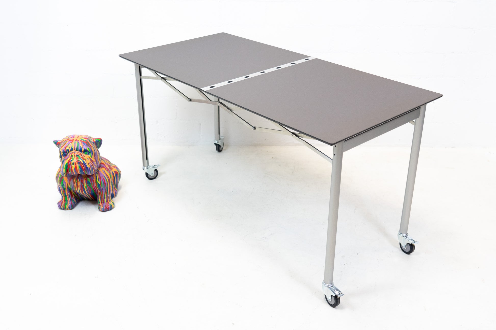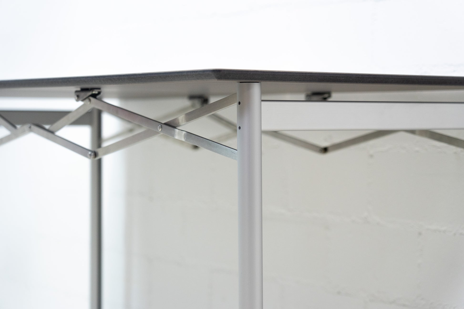 Der Tisch ist sehr gut / fast neuwertig erhalten. Es hat nur geringe Gebrauchsspuren, die kaum auffallen. Der Entwurf von Benjamin Thut ist aus dem Jahr 2001. Der derzeitige Neupreis für eine Version mit Linoleum startet im Thut Shop ab 3621 Franken. Der Tisch kann einfach zusammengeklappt werden und einfach verstaut werden. Das Blatt ist Linol graubraun.