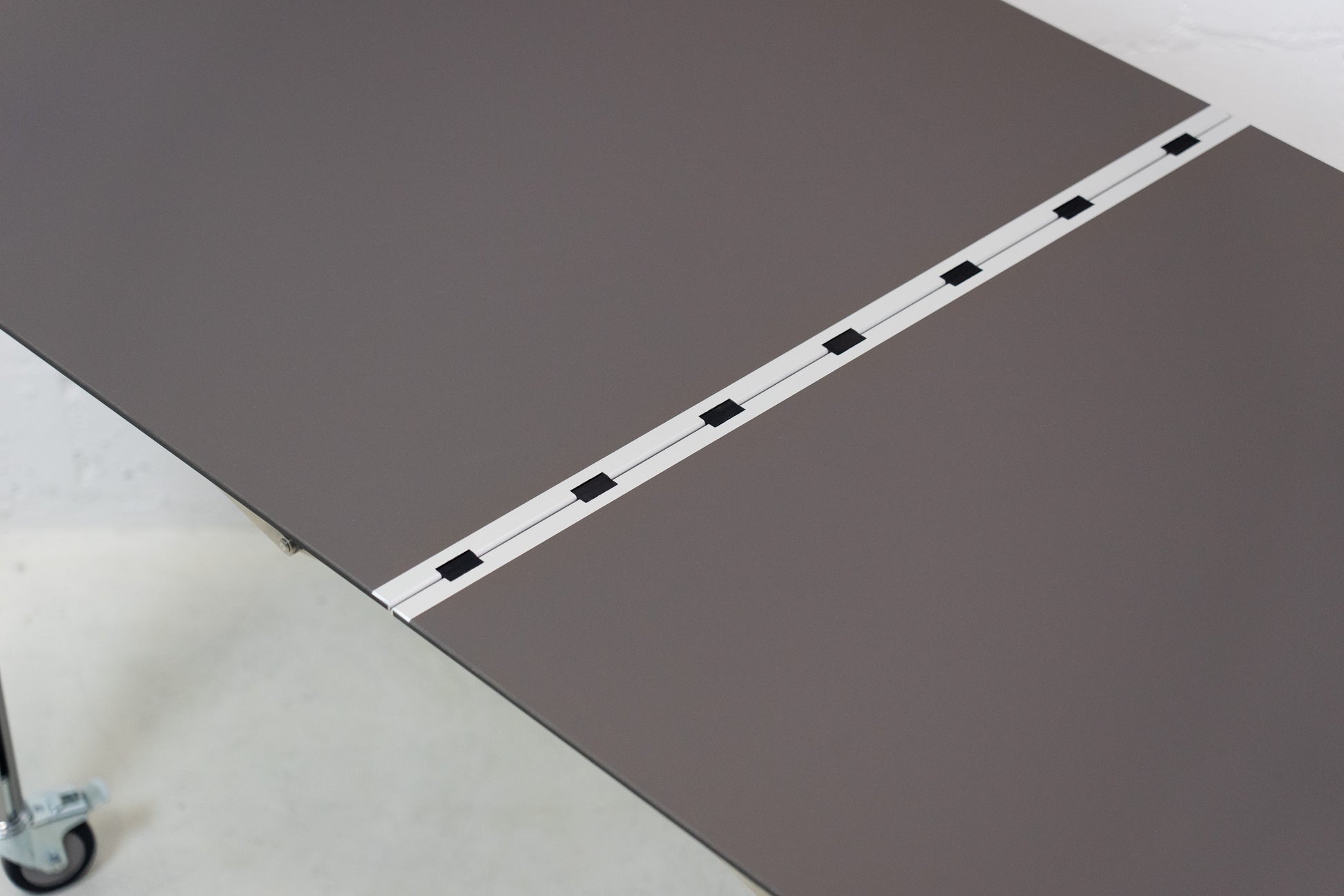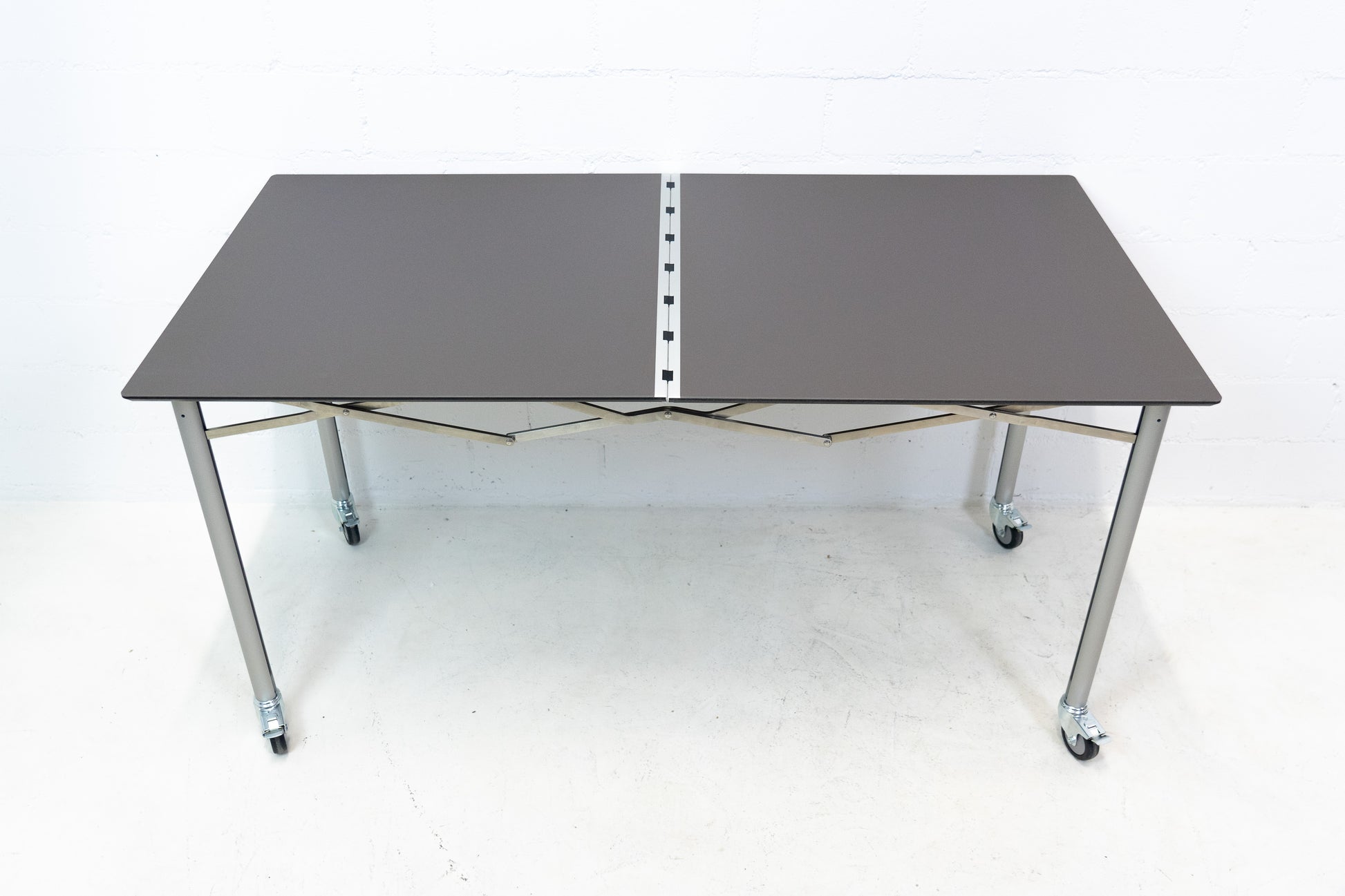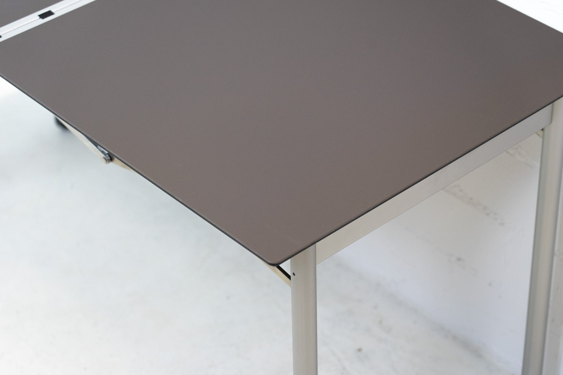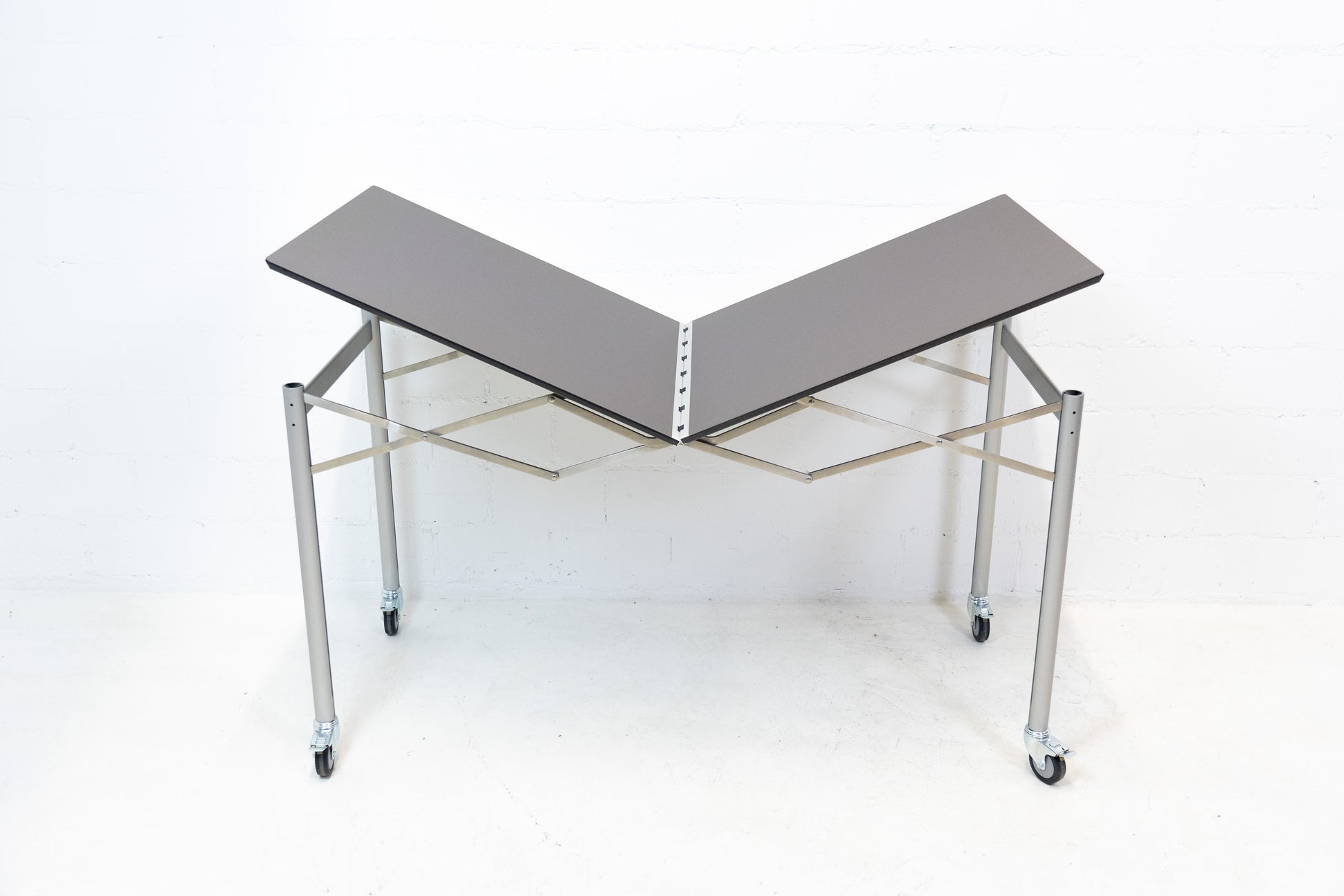 Der Tisch ist sehr gut / fast neuwertig erhalten. Es hat nur geringe Gebrauchsspuren, die kaum auffallen. Der Entwurf von Benjamin Thut ist aus dem Jahr 2001. Der derzeitige Neupreis für eine Version mit Linoleum startet im Thut Shop ab 3621 Franken. Der Tisch kann einfach zusammengeklappt werden und einfach verstaut werden. Das Blatt ist Linol graubraun.
