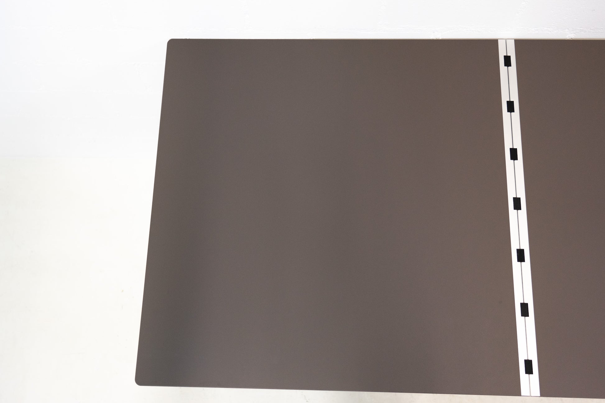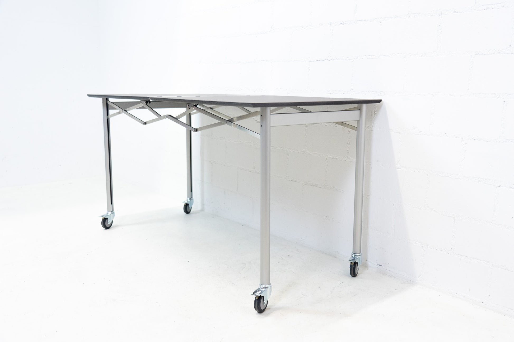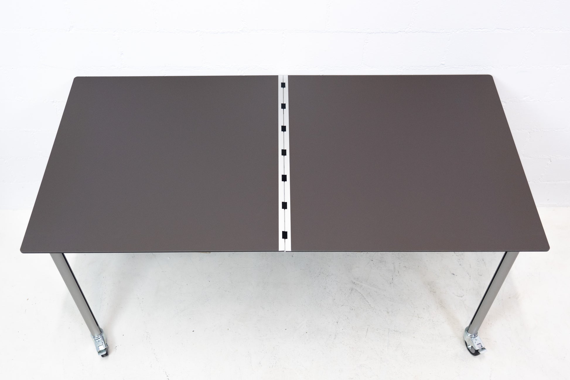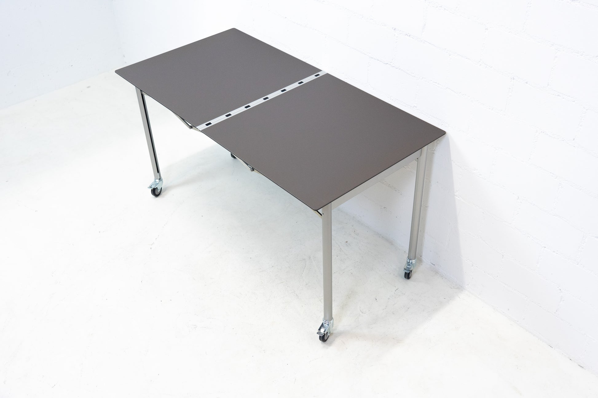 Der Tisch ist sehr gut / fast neuwertig erhalten. Es hat nur geringe Gebrauchsspuren, die kaum auffallen. Der Entwurf von Benjamin Thut ist aus dem Jahr 2001. Der derzeitige Neupreis für eine Version mit Linoleum startet im Thut Shop ab 3621 Franken. Der Tisch kann einfach zusammengeklappt werden und einfach verstaut werden. Das Blatt ist Linol graubraun.
