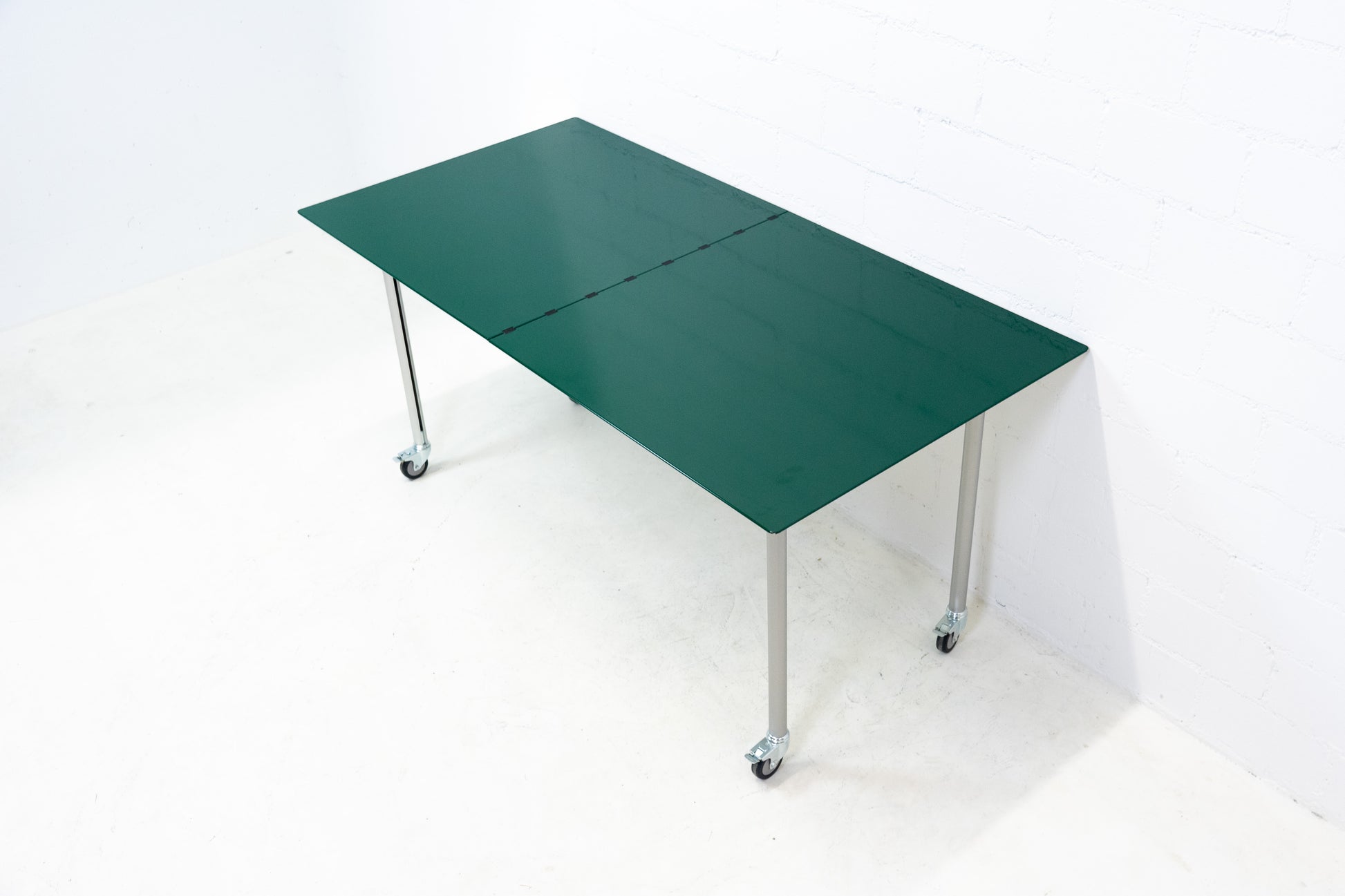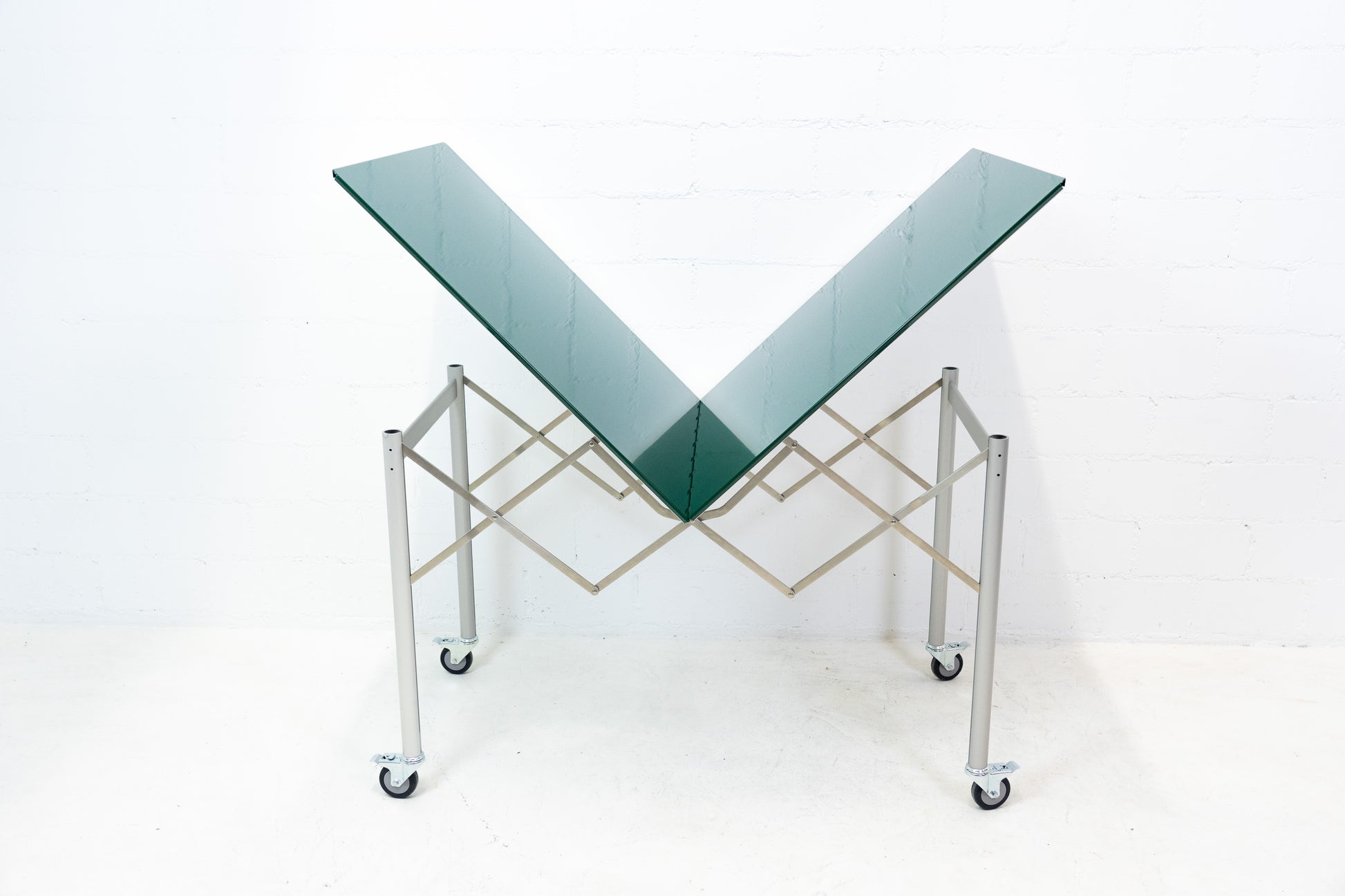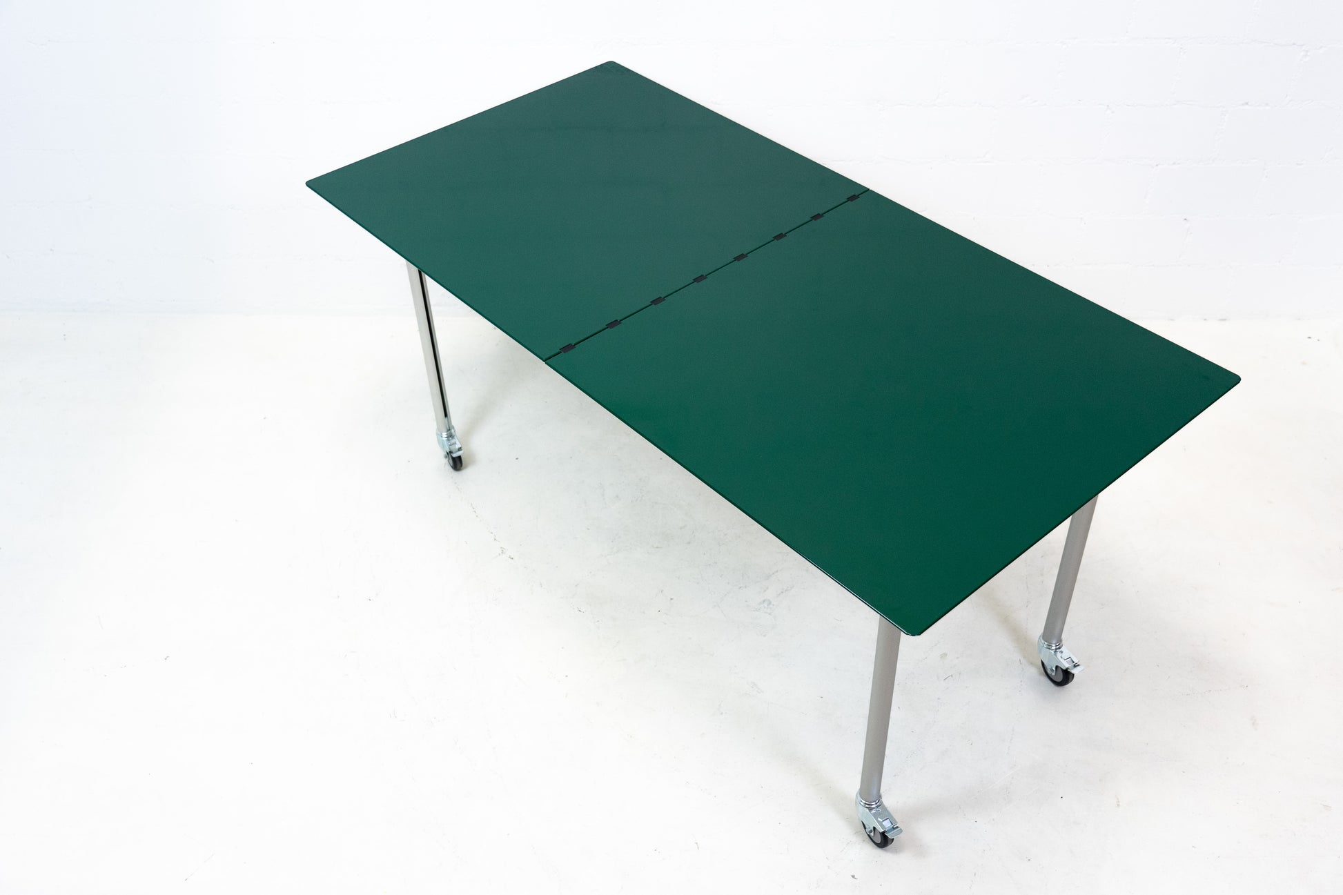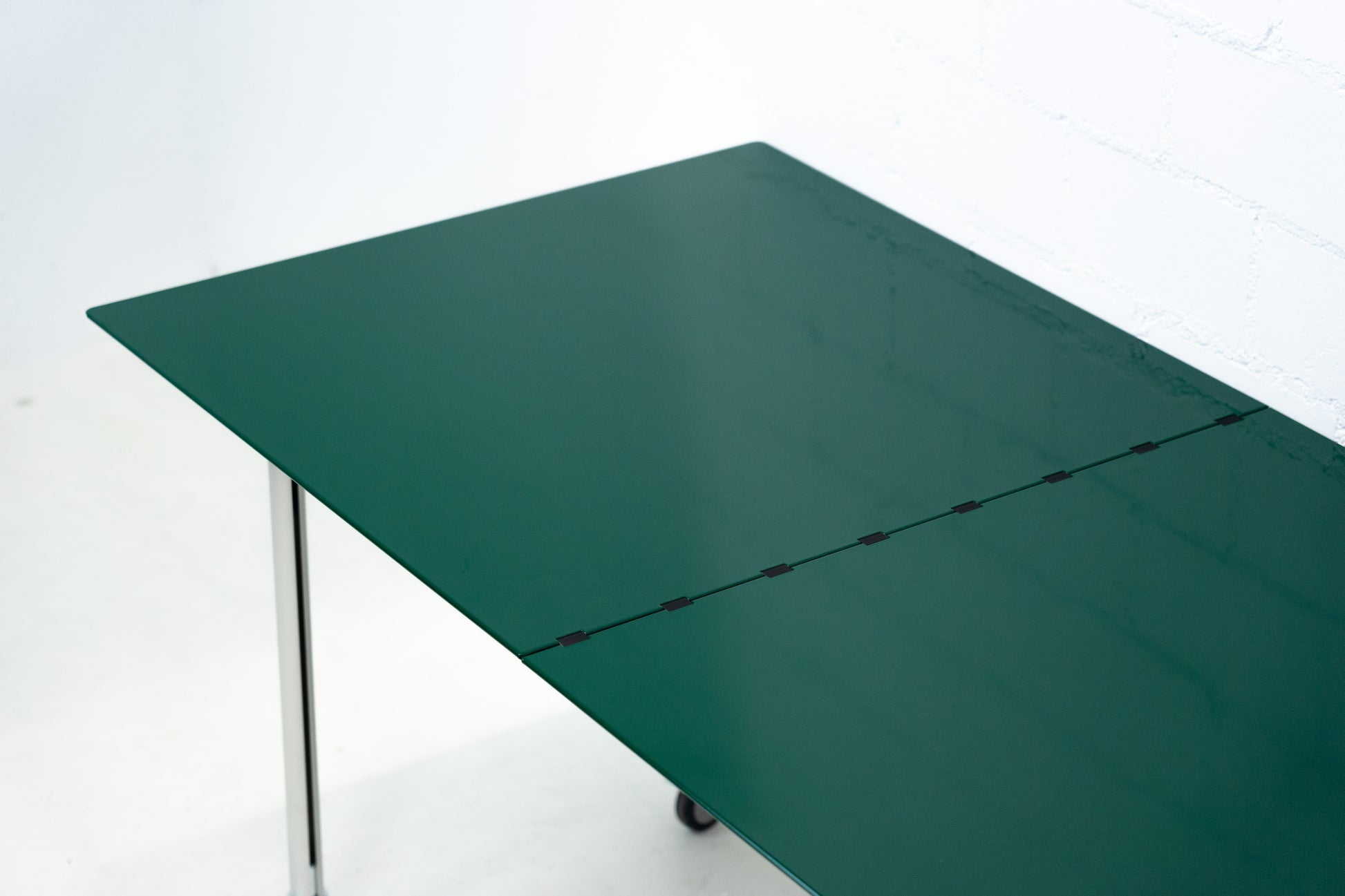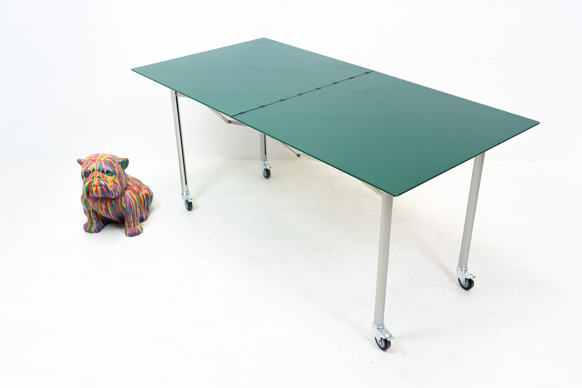 Der Tisch ist sehr gut / fast neuwertig erhalten. Es hat nur geringe Gebrauchsspuren, die kaum auffallen. Auf der Platte hat es feine Kratzer, die je nach Winkel nicht stark auffallen. Wir haben davon ein Detailfoto gemacht. Der Entwurf von Benjamin Thut ist aus dem Jahr 2001. Der derzeitige Neupreis für eine Version in eloxiertem Aluminium ist im Thut Shop 3406 Franken. Dieser Tisch ist jedoch eine Sonderanfertigung. Er hat eine lackierte Platte in British Racing Green und kann so nicht offiziell bestellt werden. Der Tisch kann einfach zusammengeklappt werden und einfach verstaut werden. Wir haben in dieser Ausführung insgesamt 14 Tische ab Lager verfügbar. Der Preis bezieht sich auf einen Tisch.