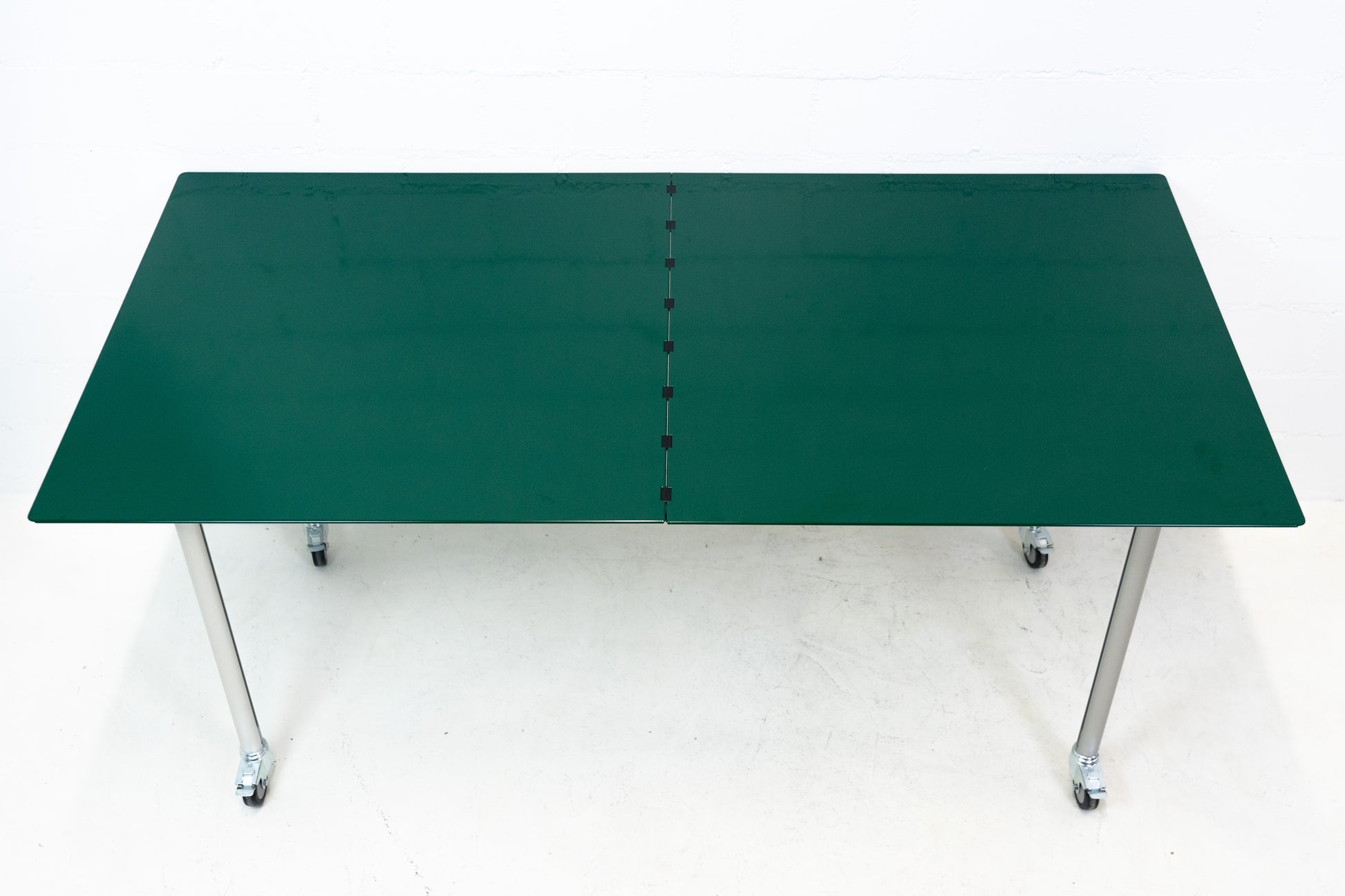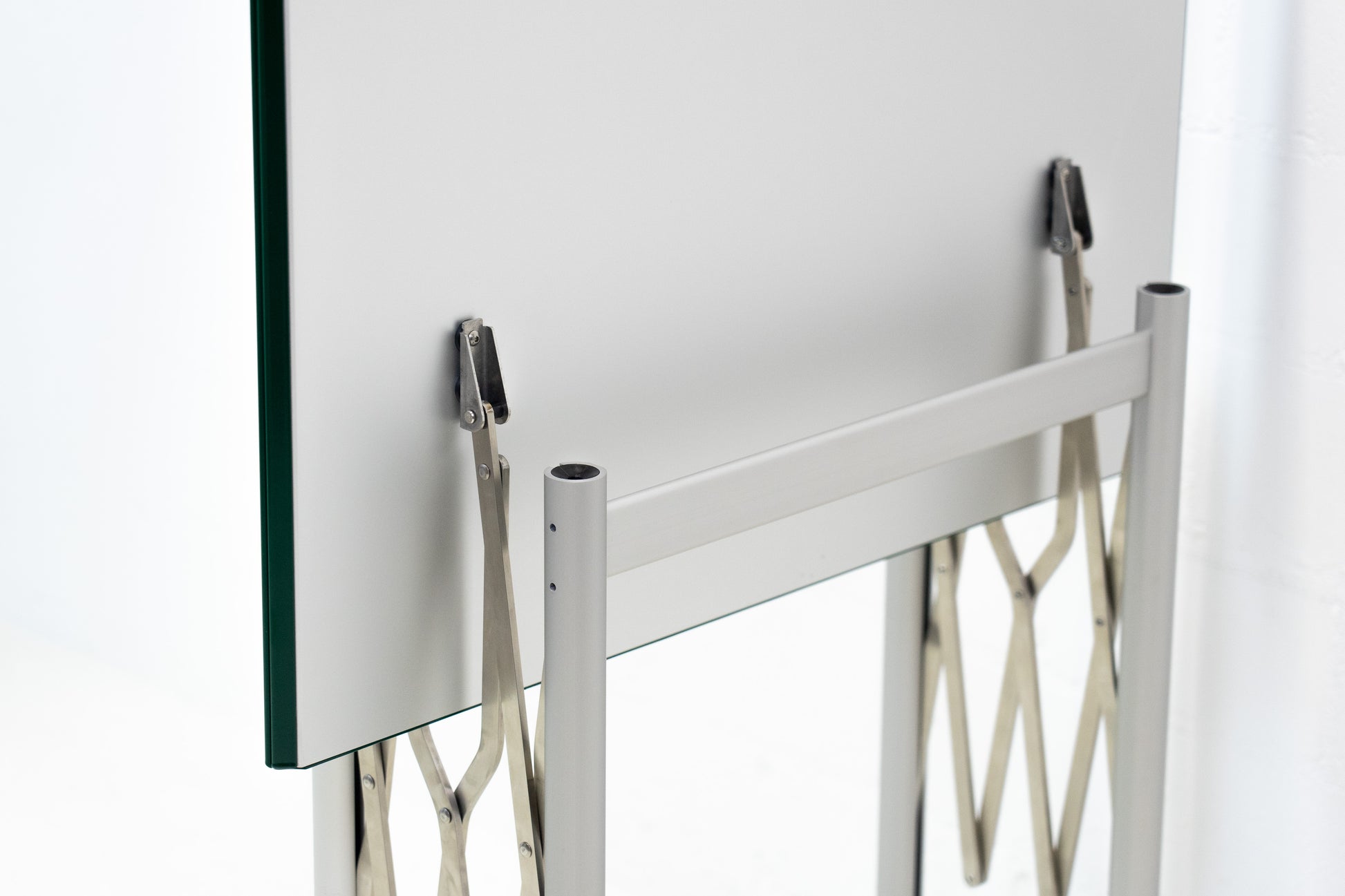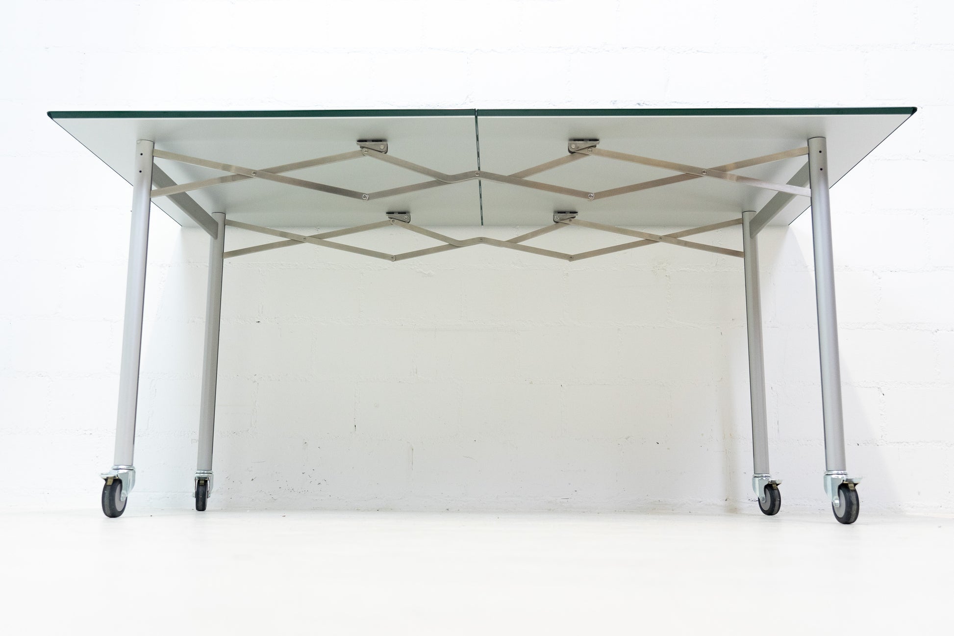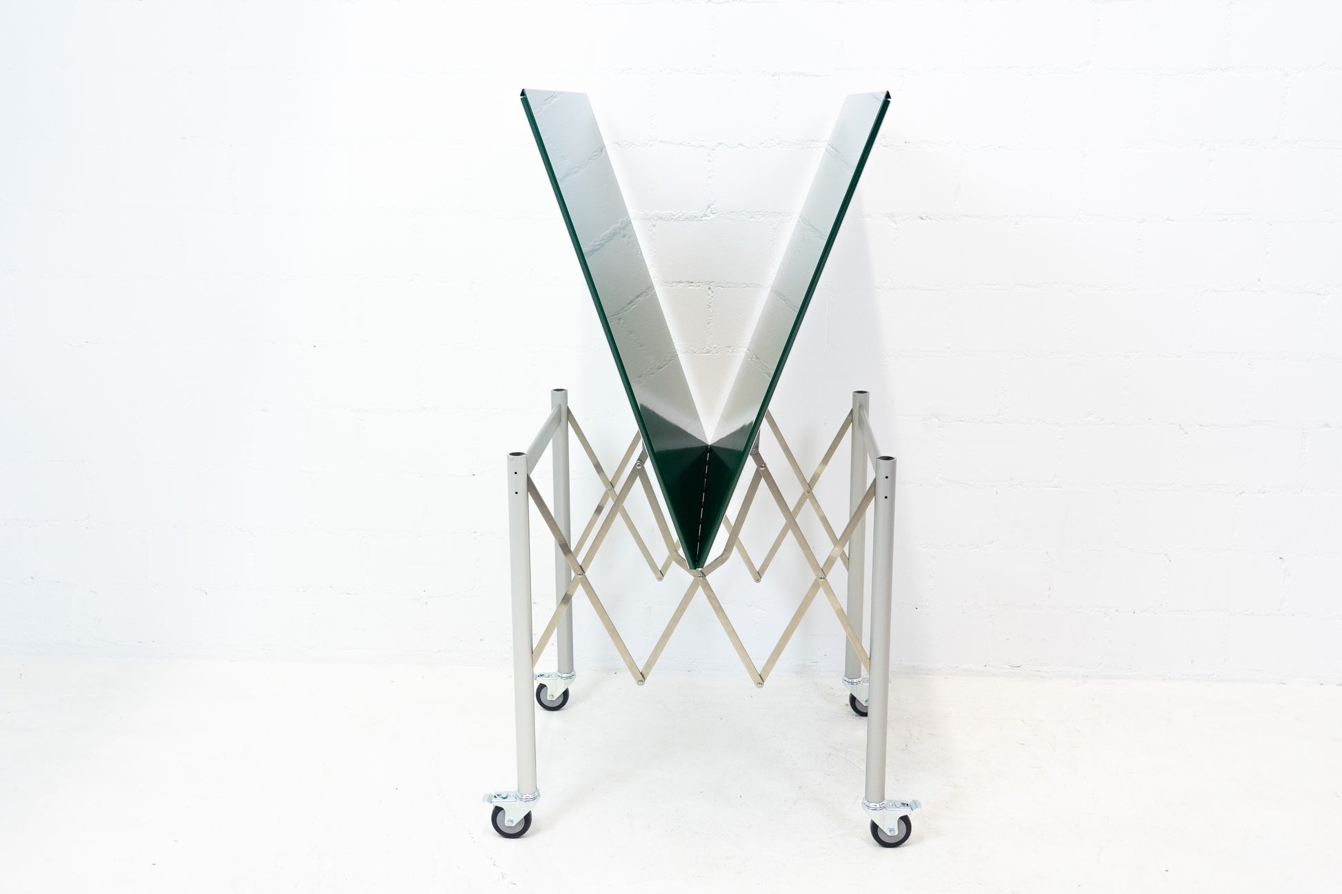 Der Tisch ist sehr gut / fast neuwertig erhalten. Es hat nur geringe Gebrauchsspuren, die kaum auffallen. Auf der Platte hat es feine Kratzer, die je nach Winkel nicht stark auffallen. Wir haben davon ein Detailfoto gemacht. Der Entwurf von Benjamin Thut ist aus dem Jahr 2001. Der derzeitige Neupreis für eine Version in eloxiertem Aluminium ist im Thut Shop 3406 Franken. Dieser Tisch ist jedoch eine Sonderanfertigung. Er hat eine lackierte Platte in British Racing Green und kann so nicht offiziell bestellt werden. Der Tisch kann einfach zusammengeklappt werden und einfach verstaut werden. Wir haben in dieser Ausführung insgesamt 14 Tische ab Lager verfügbar. Der Preis bezieht sich auf einen Tisch.