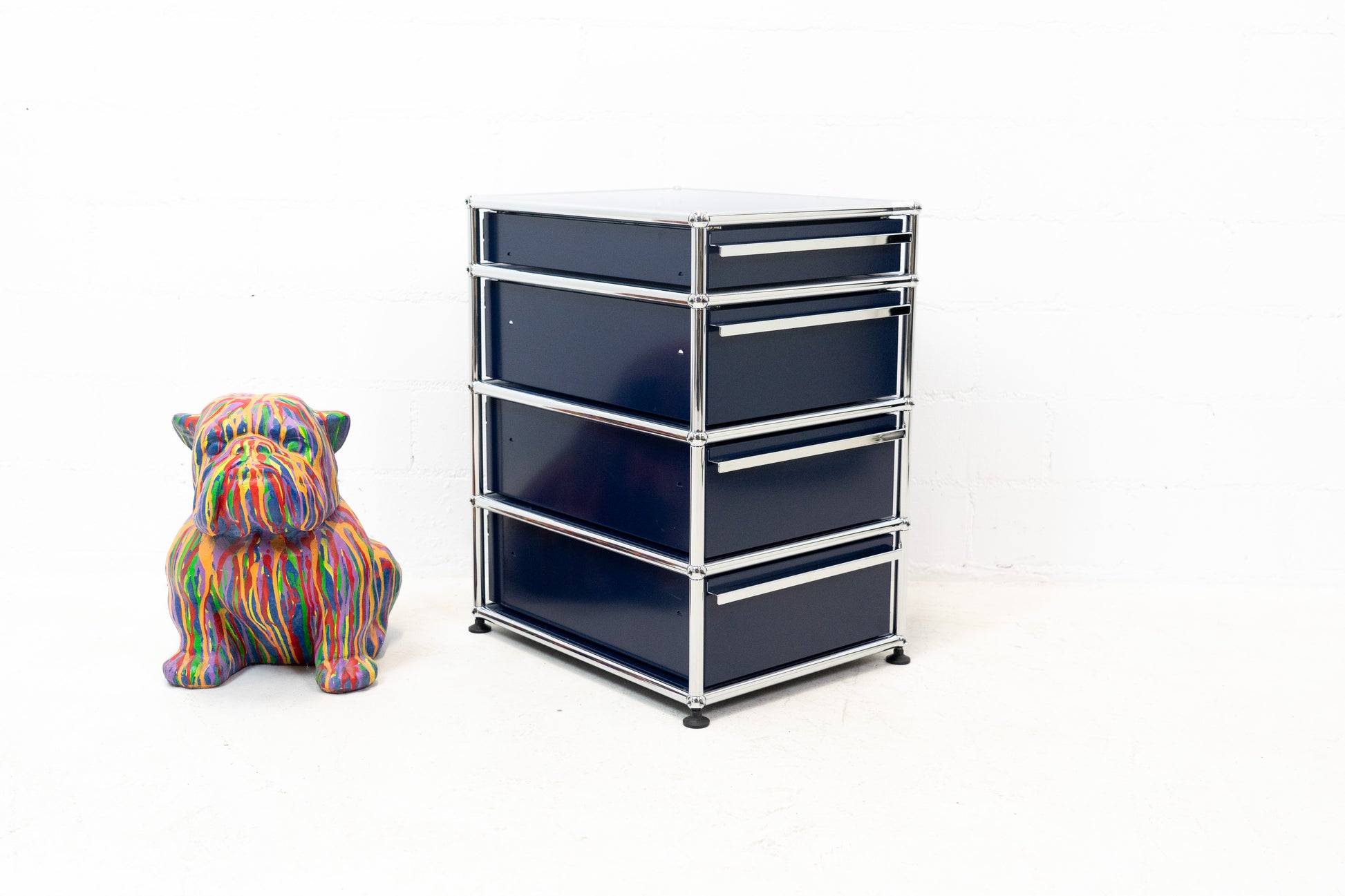 Das Möbel ist in Stahlblau gehalten. Es ist in einem guten Zustand und hat Gebrauchsspuren wie Kratzer und Abschürfungen. Die Schubladen haben teilweise Einlagen. Wir haben insgesamt 3 Korpusse ab Lager verfügbar. Der Preis bezieht sich auf einen Korpus.