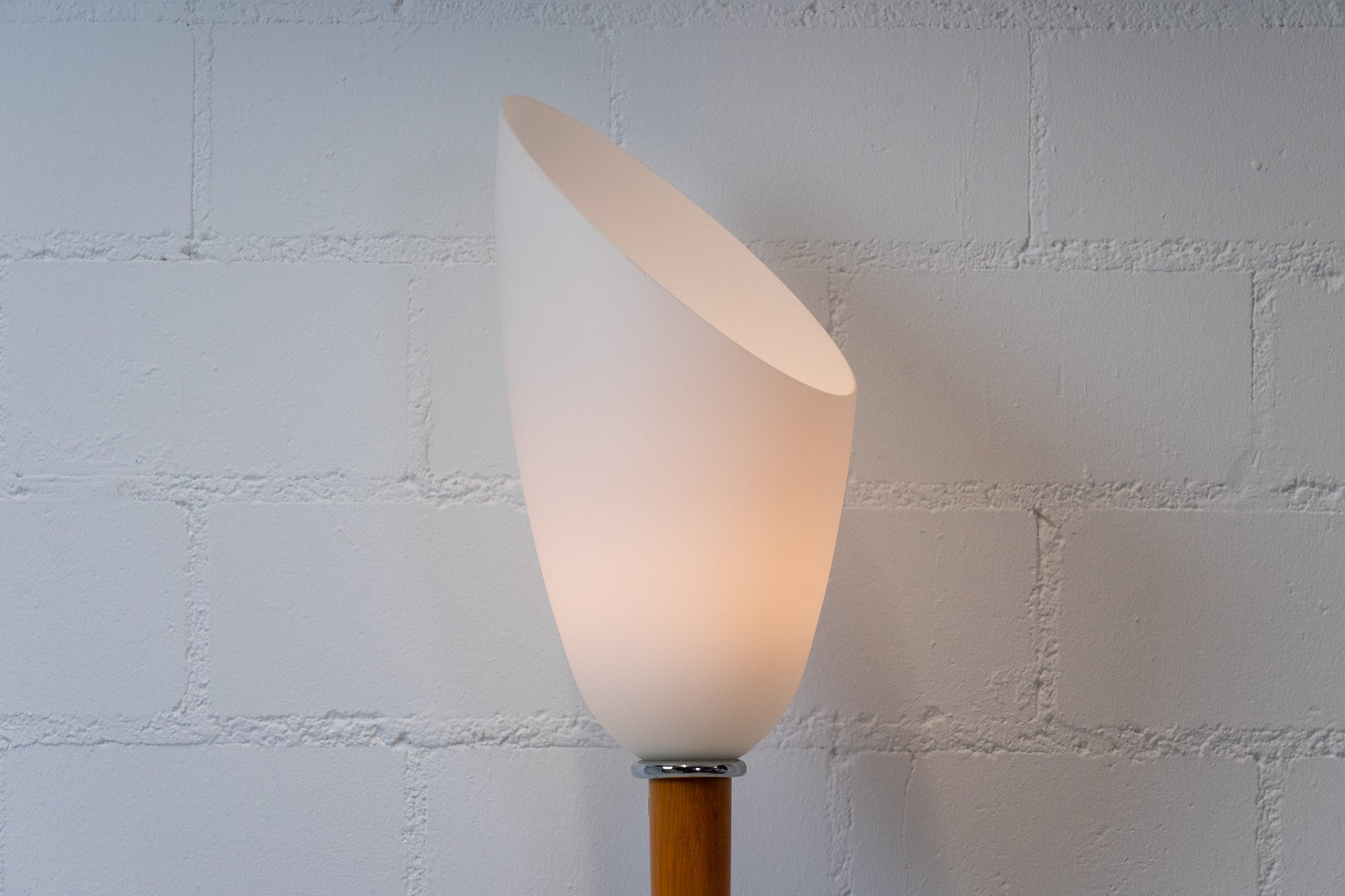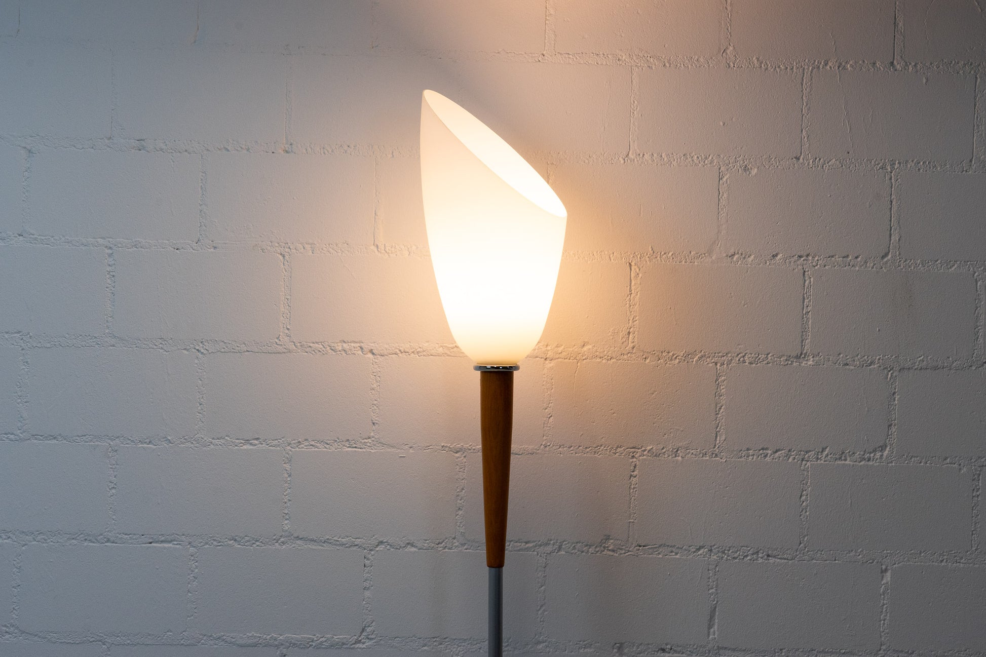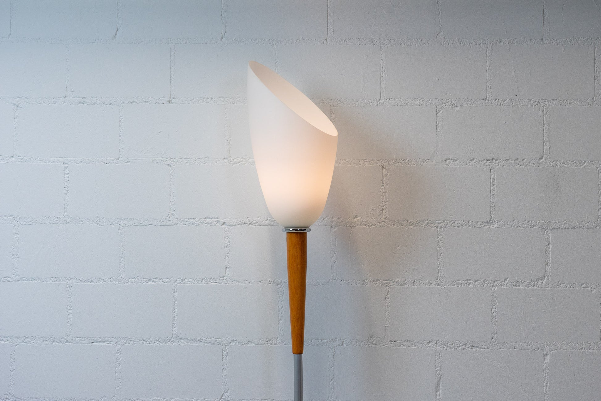 Die Lampe ist gut erhalten. Es hat leichte Gebrauchsspuren in Form von Kratzern und Abschürfungen. Sie ist aus eloxiertem Aluminium und Kirschholz. Der Schirm ist mundgeblasenem und satiniertem Glas. Die Leuchte ist dimmbar und das Leuchtmittel ist nicht inklusive.