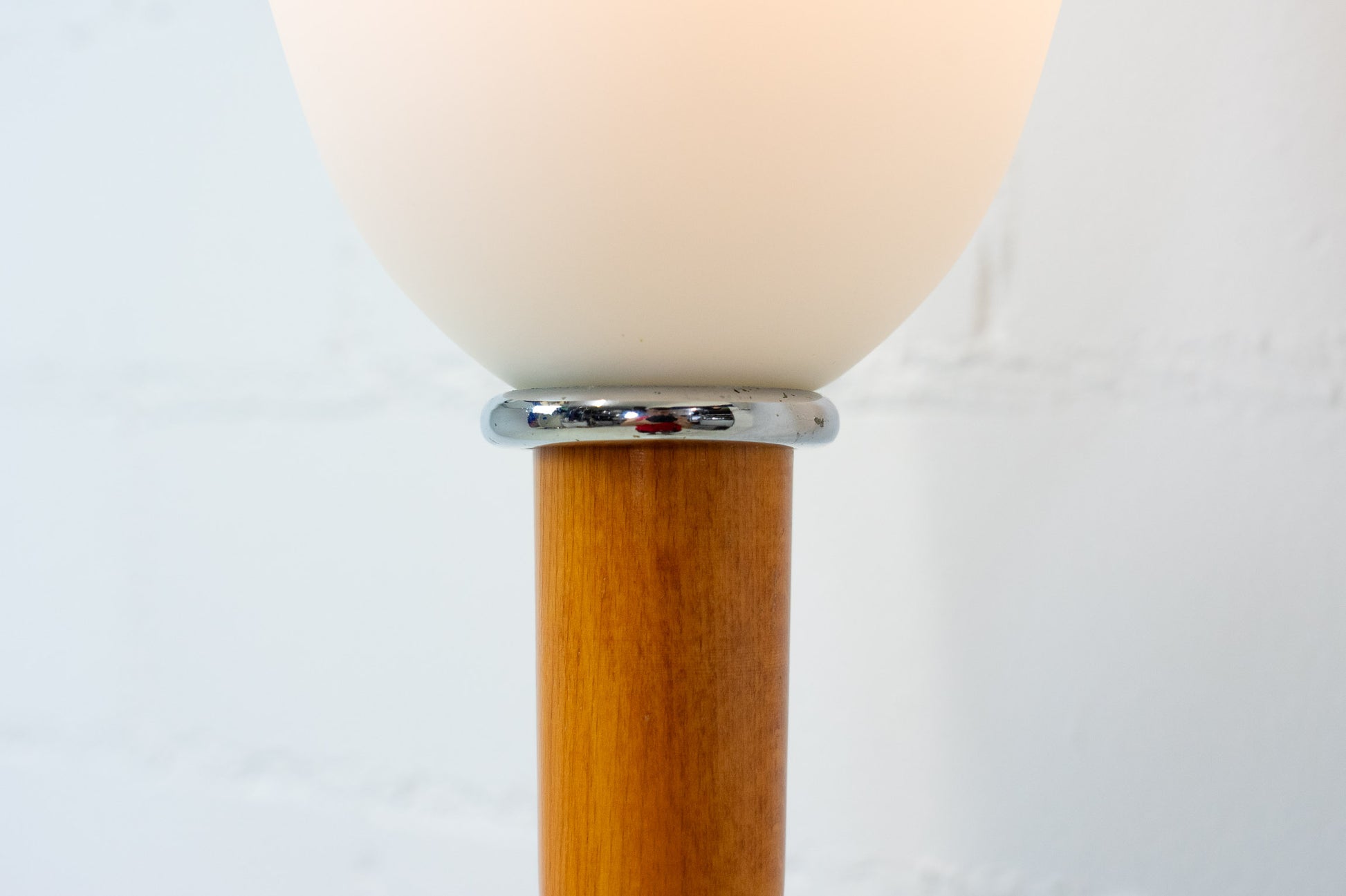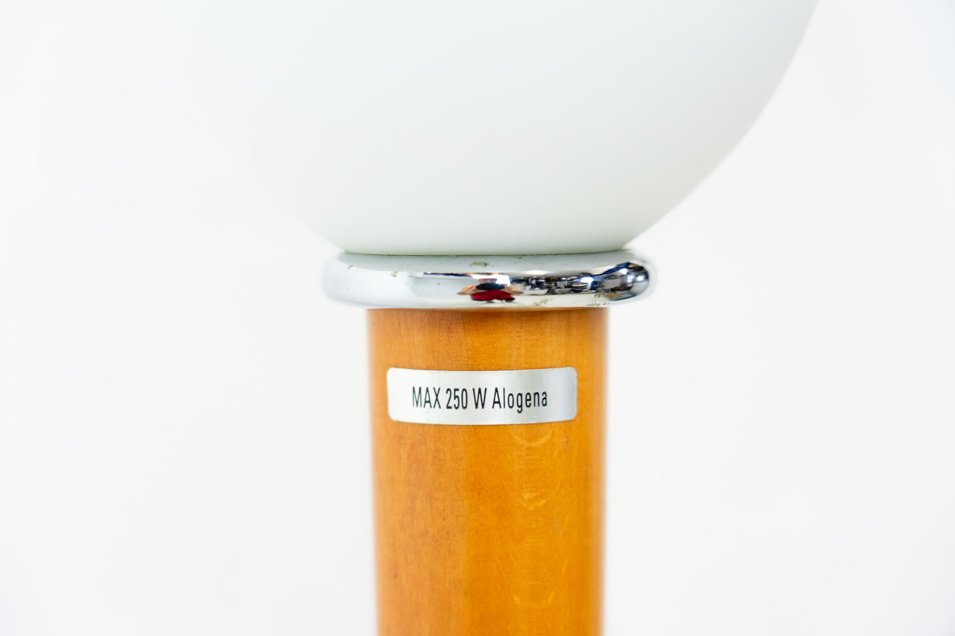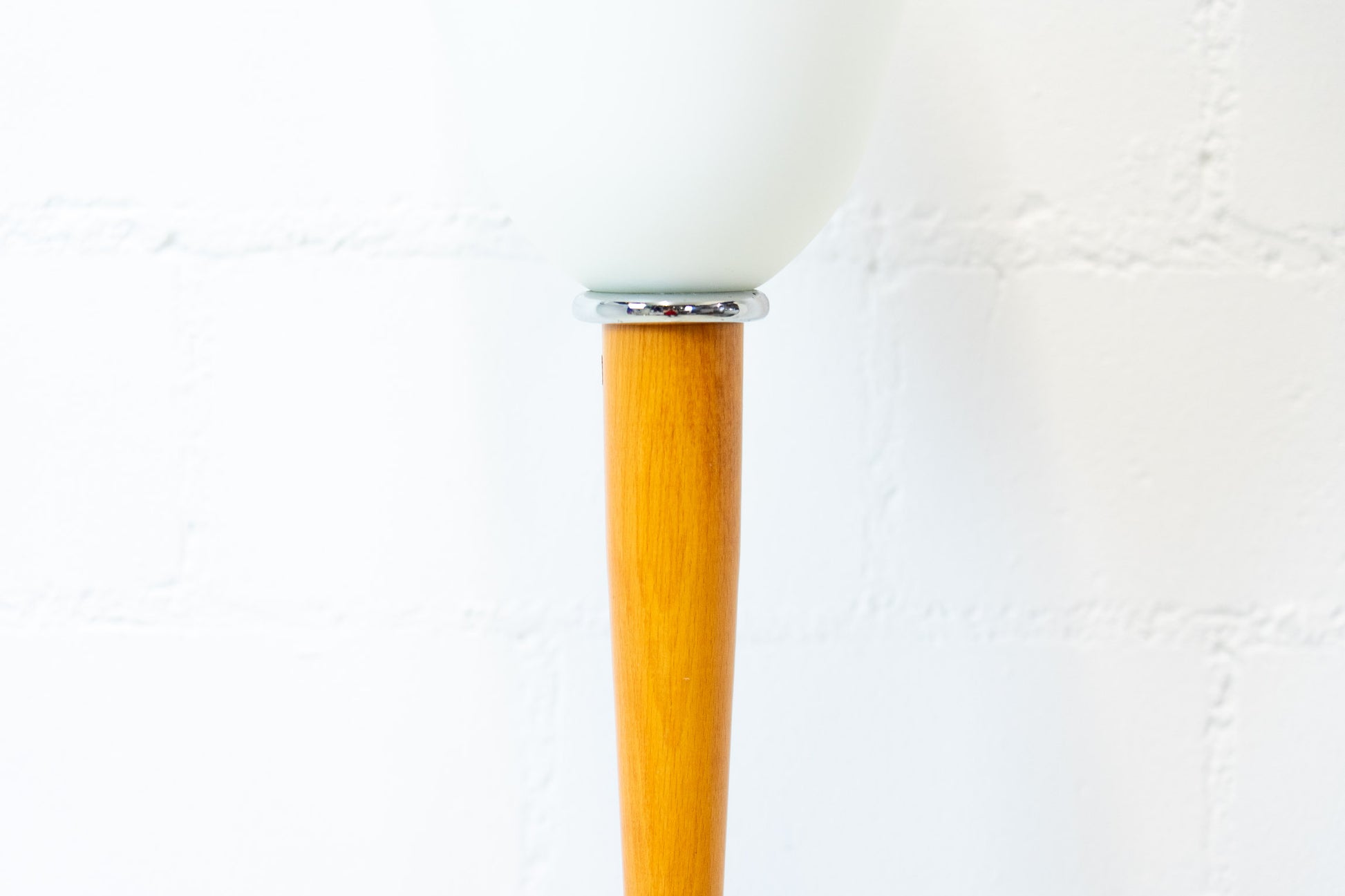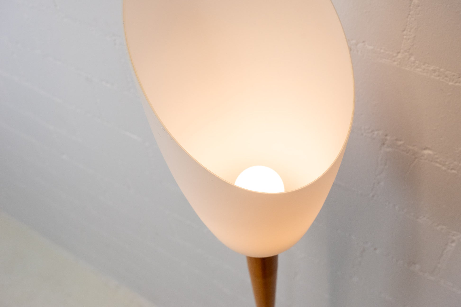 Die Lampe ist gut erhalten. Es hat leichte Gebrauchsspuren in Form von Kratzern und Abschürfungen. Sie ist aus eloxiertem Aluminium und Kirschholz. Der Schirm ist mundgeblasenem und satiniertem Glas. Die Leuchte ist dimmbar und das Leuchtmittel ist nicht inklusive.