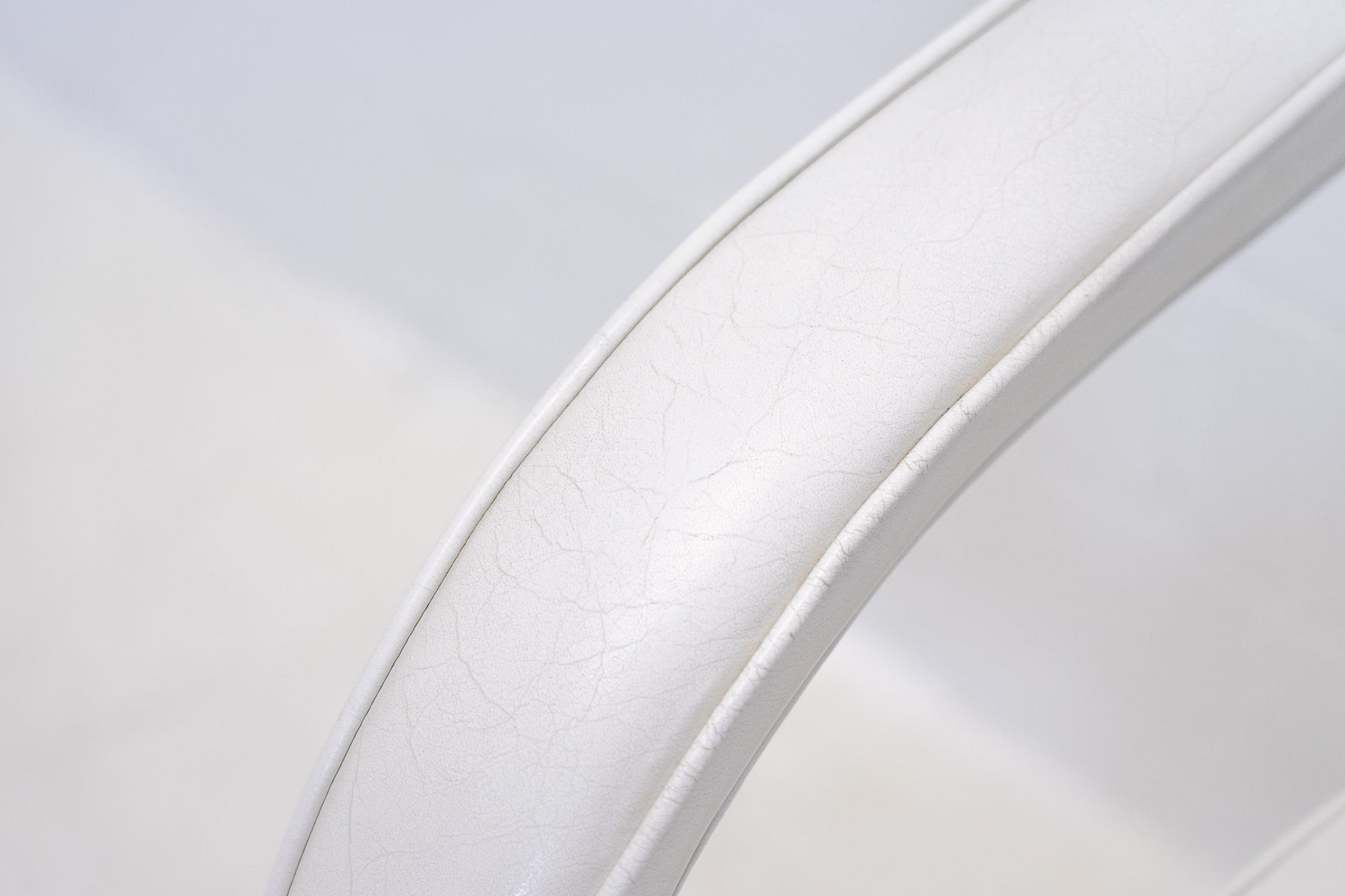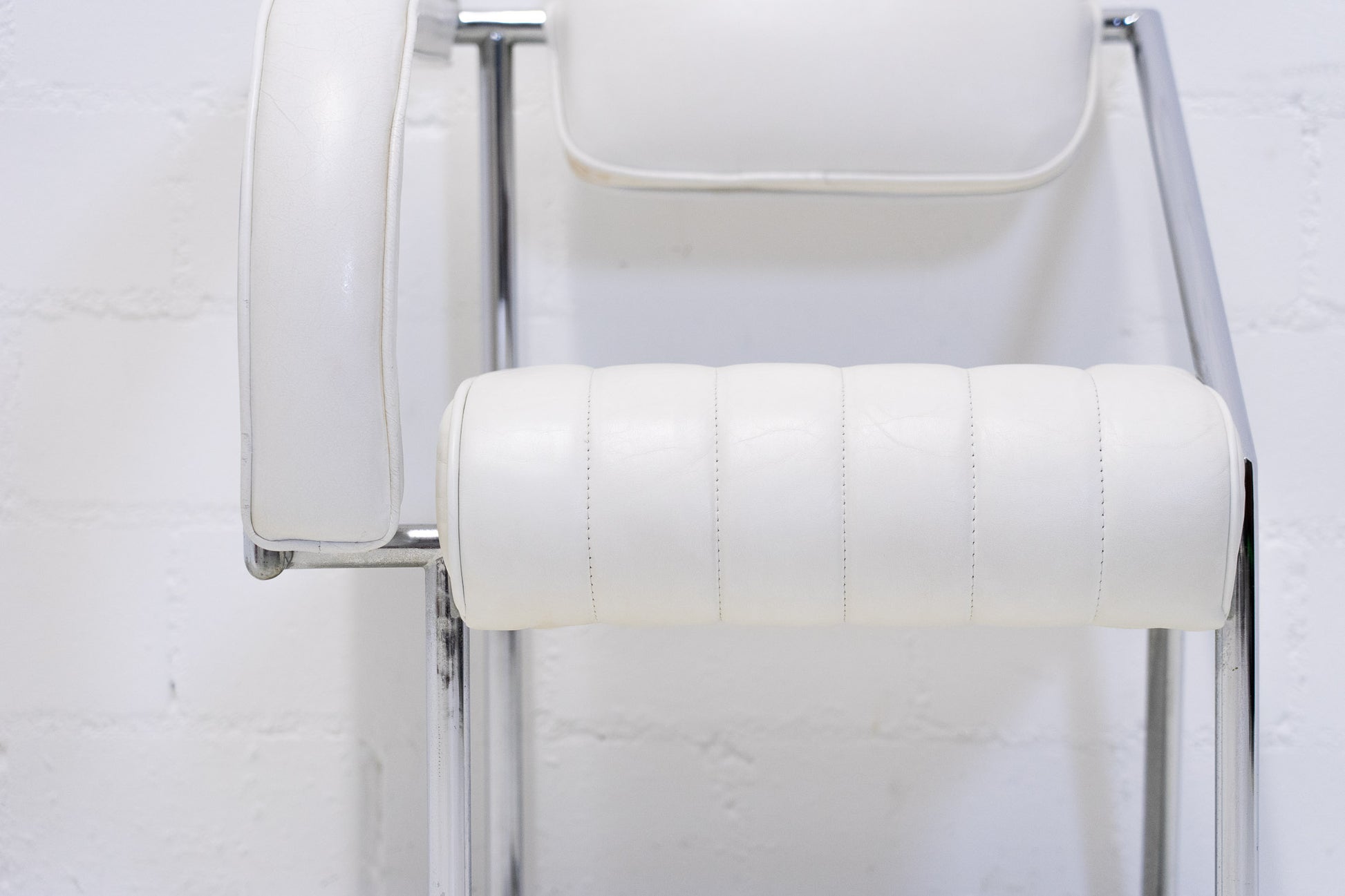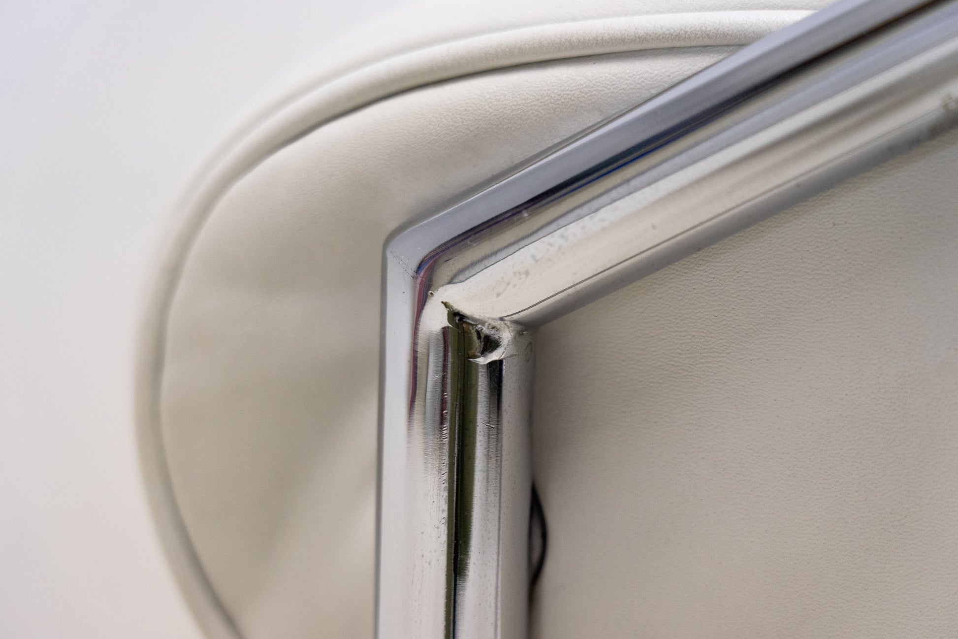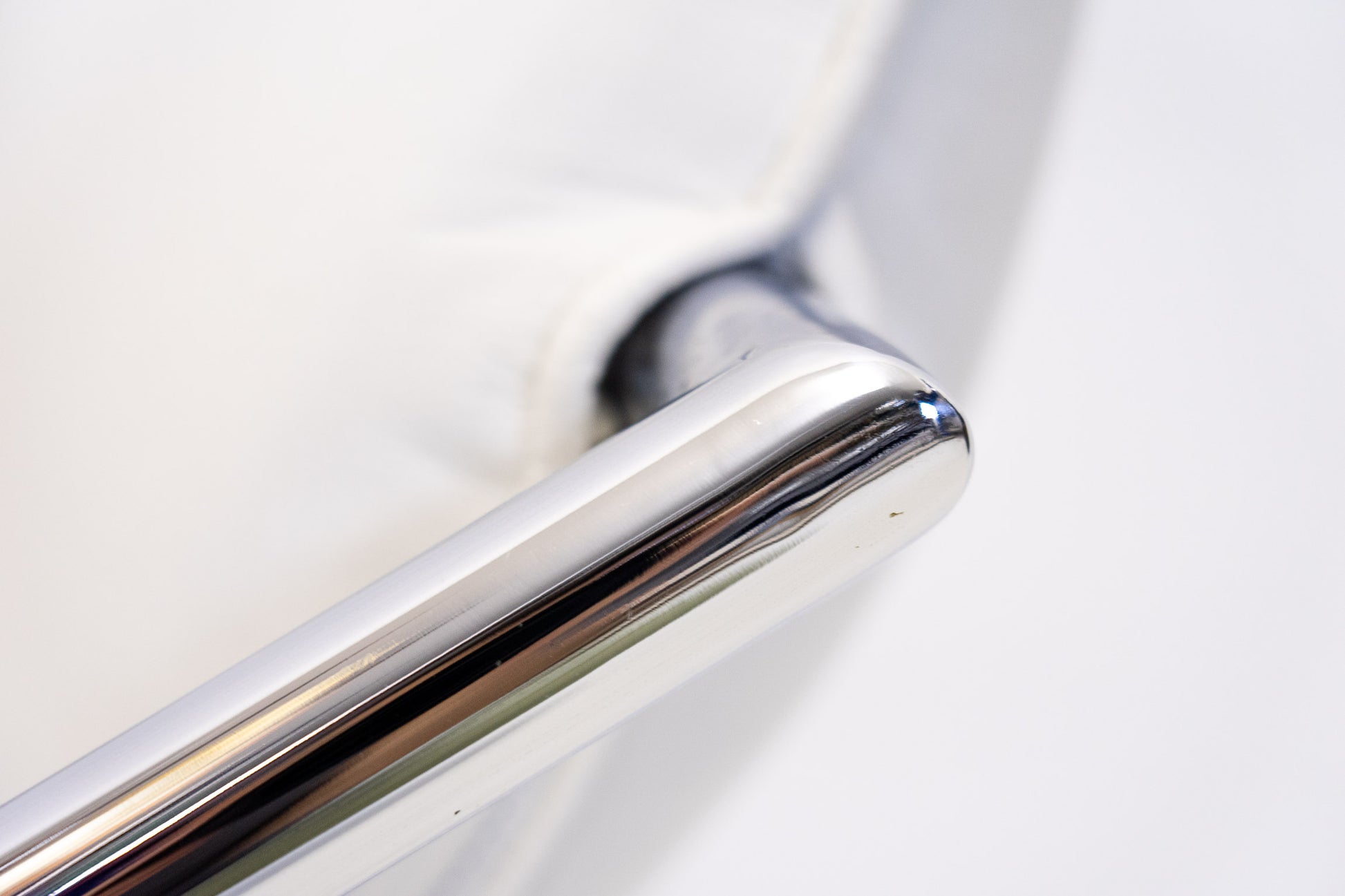 Der Sessel ist gut erhalten. Es hat dem Alter entsprechend leichte Gebrauchsspuren in Form von Abschürfungen, Kratzern und feinen brüchigen Stellen. Das Metall ist teilweise patiniert. Für ein Alter von ca. 50 Jahren ist der Sessel jedoch noch schön erhalten. Der Sitzkomfort ist sehr gut. Das Design stammt von Eileen Gray.