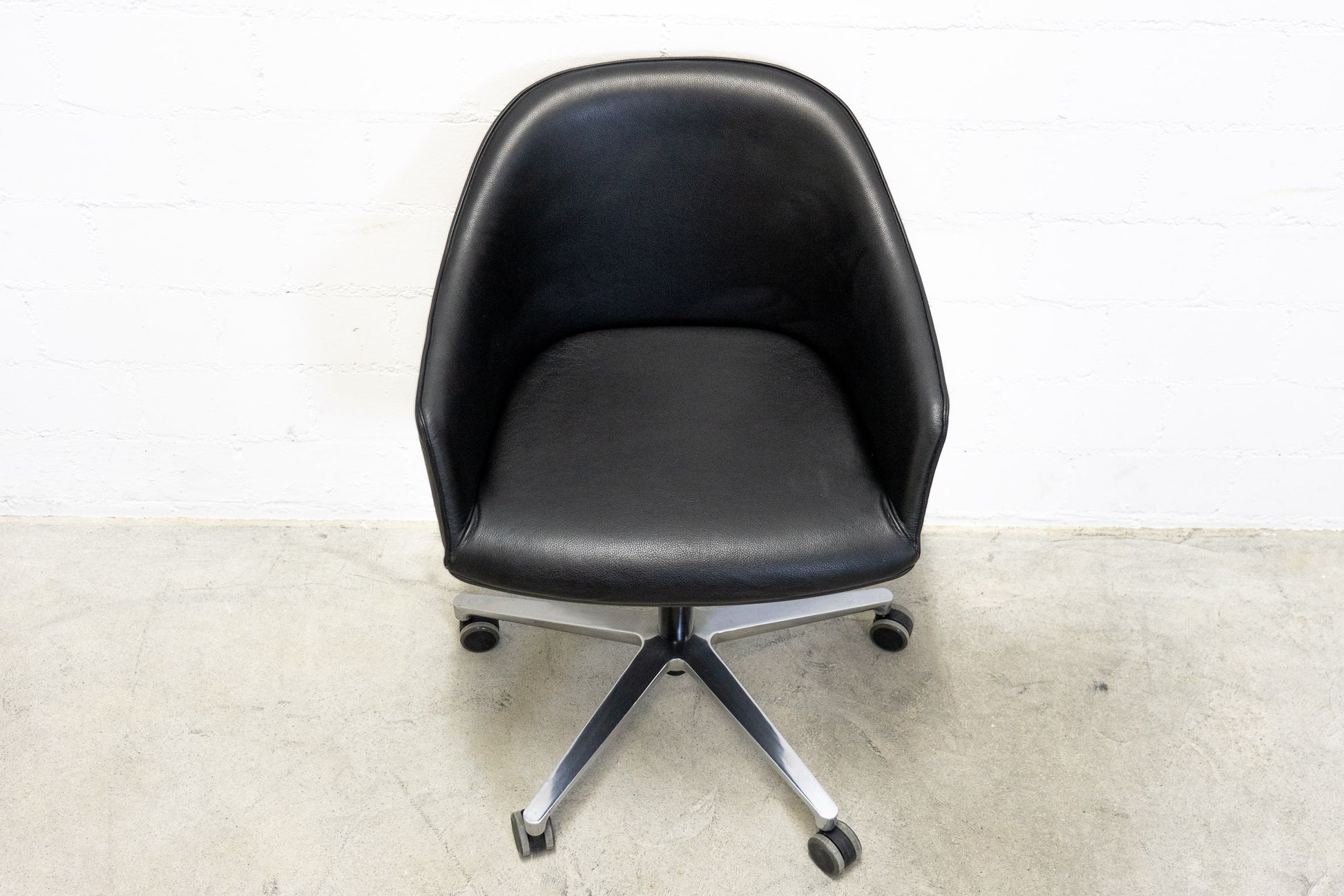 Der Stuhl ist sehr gut erhalten und sehr angenehm zum Sitzen. Es hat nur leichte Gebrauchsspuren in Form von Kratzern und Abschürfungen, die hauptsächlich am Gestell sind. Das Leder ist schön erhalten. Der Sitzkomfort ist nach wie vor super und der Stuhl ist drehbar und höhenverstellbar. Dieser Bürostuhl wurde von Ronan und Erwan Bourellec entworfen und wird von Vitra produziert.