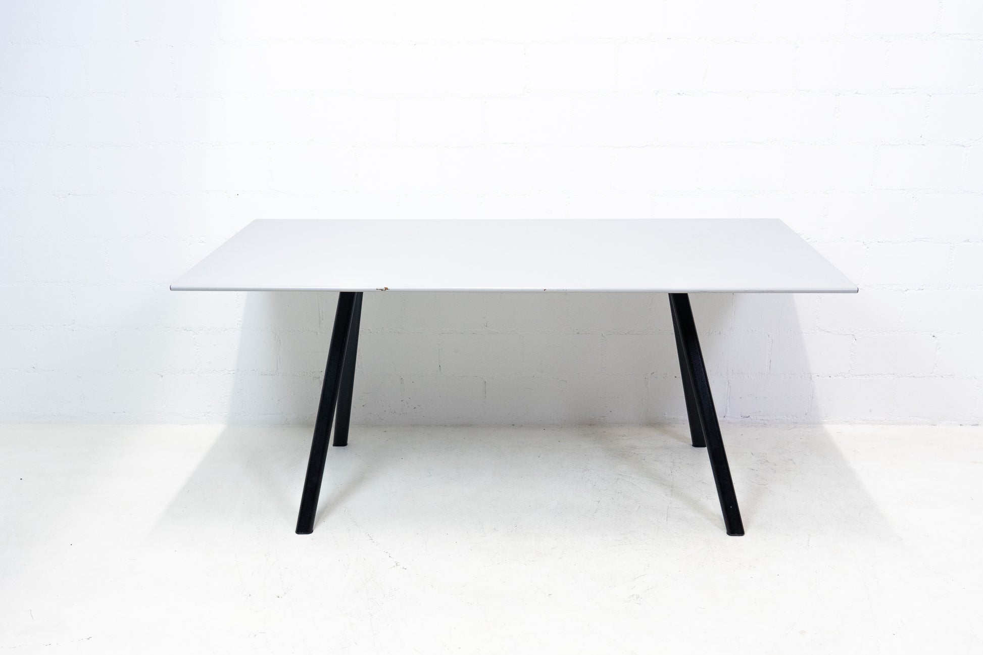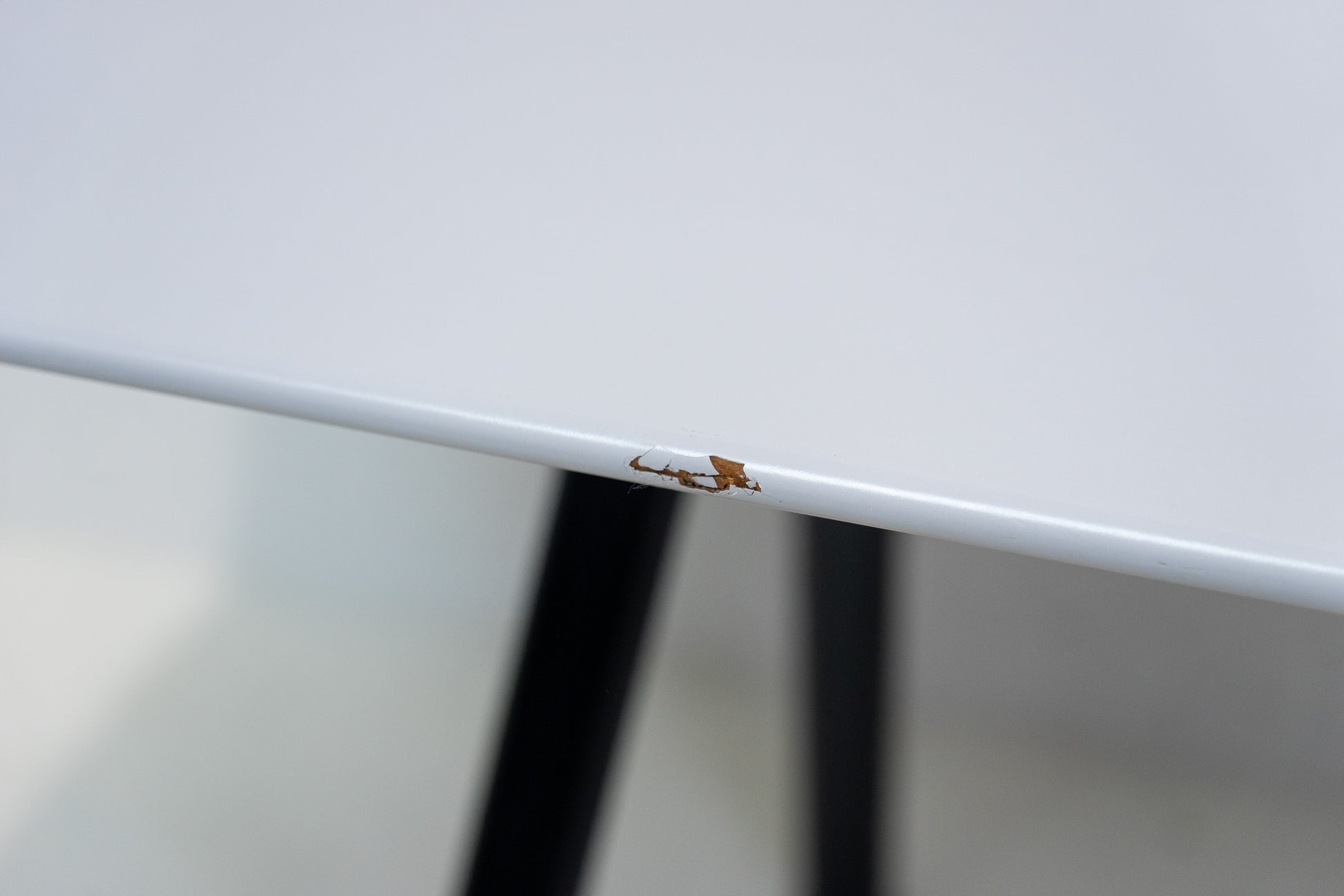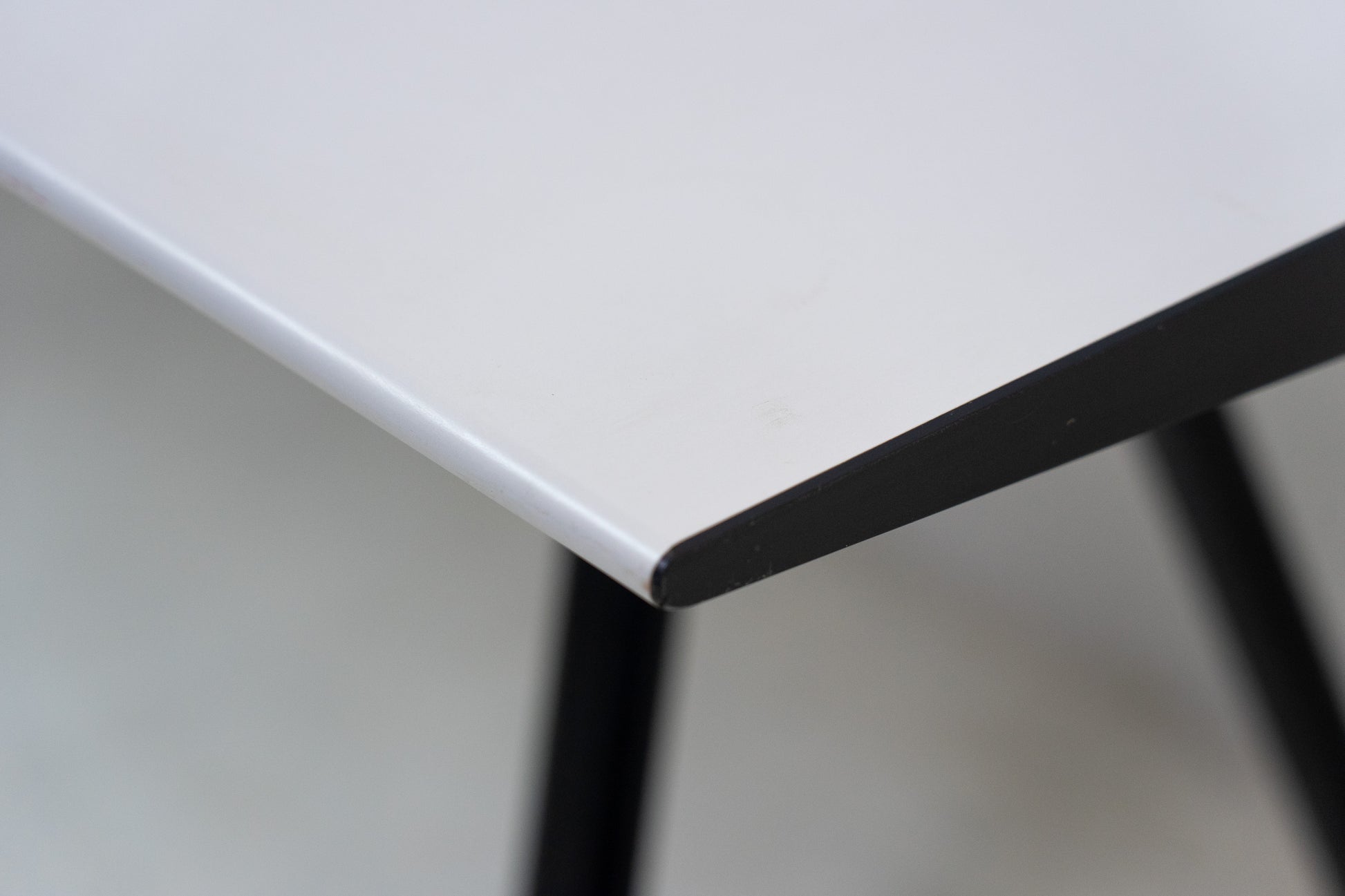 Der Tisch ist qualitativ hochwertig gebaut. Es hat stellenweise Gebrauchsspuren in Form von Abschürfungen, Kratzern und Verfärbungen. An einer Kante hat es eine Beschädigung. Wir haben davon Detailfotos gemacht. Ansonsten ist der Tisch noch gut erhalten. Das Design ist von Hans Eichenberger. Die Füsse sind demontierbar.